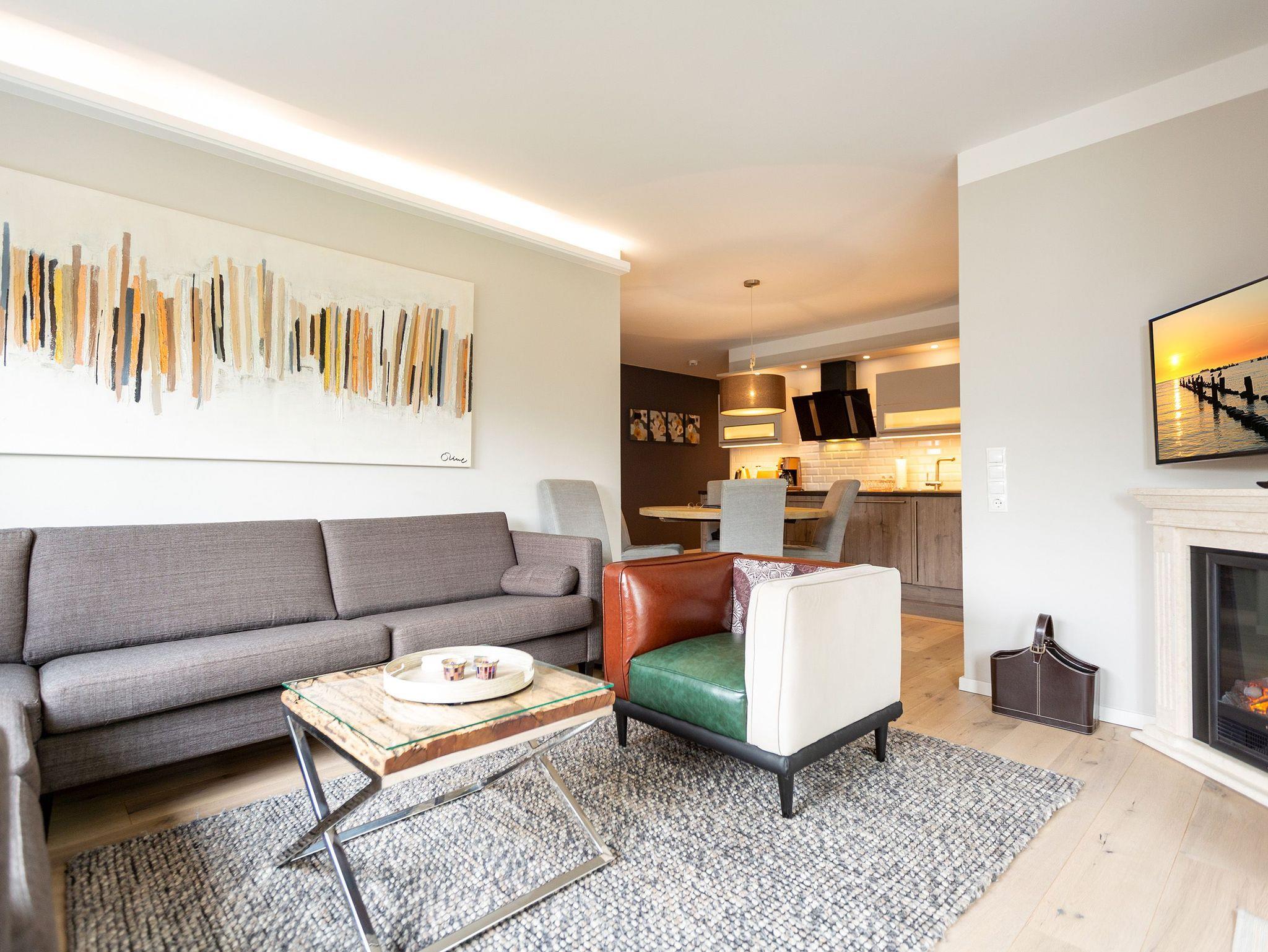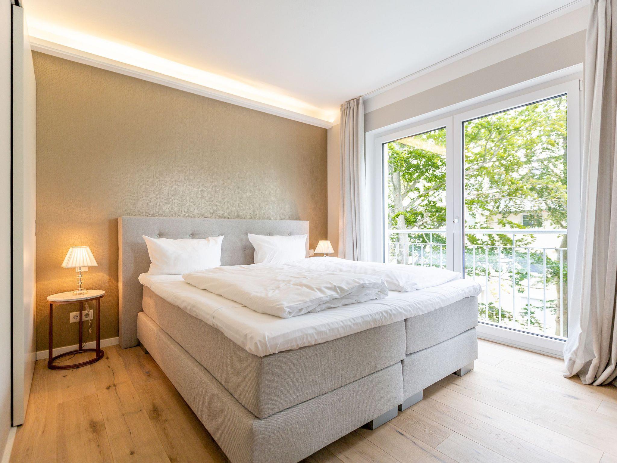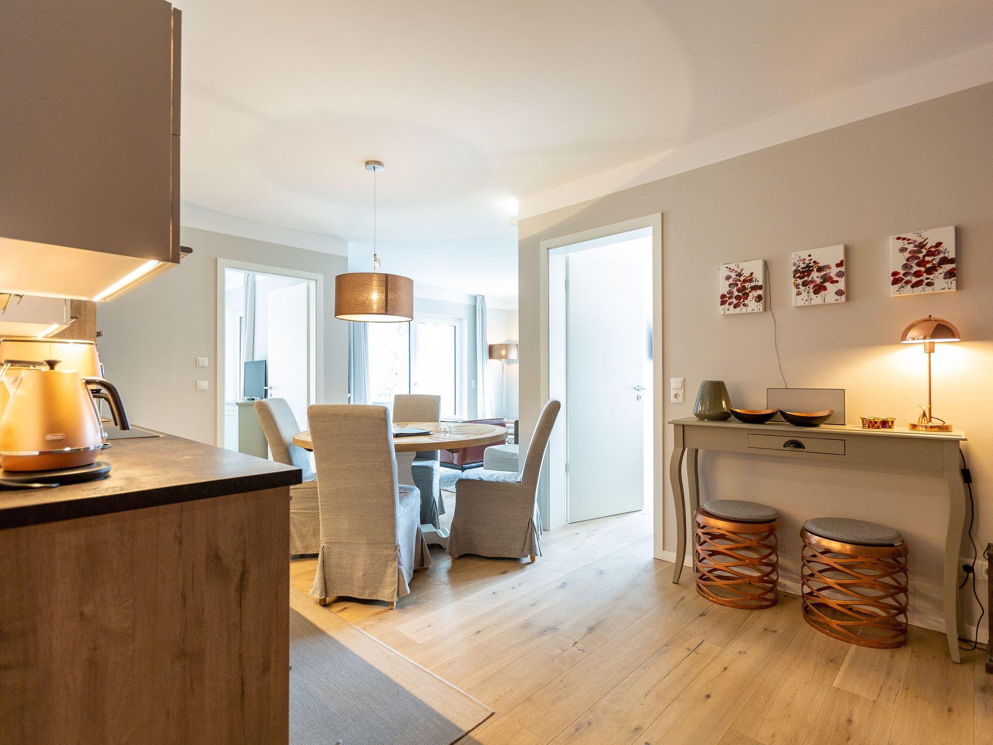 Sie lieben das Besondere? Sie schätzen Design und Geschmack? Willkommen im Appartement 17! Freuen Sie sich auf ein von Innenarchitektenhand designtes Wohnkonzept, dass überzeugt und begeistert. Geschmackvolles Design, wertige Stoffe und abgestimmte Farben sorgen für Hochwertigkeit, Stil und Behaglichkeit. Ein ideales Urlaubziel für bis zu 4 Personen. Schon beim Eintreten empfängt Sie der große, stylische Eingangsbereich. Zentrales Herz der Wohnung ist die moderne, komplett ausgestattete Küche mit tollem Essplatz, der nicht nur perfekt zum Dinieren, sondern auch ideal als lebendige Kommunikationsinsel dient. Der helle, lichtdurchflutete Wohnbereich ist loungig, cool und gemütlich zugleich. Auf Ihrer stylischen Sofainsel lässt es sich herrlich lümmeln und relaxen. Ein moderner Elektrokamin (mit Heizmöglichkeit) schafft per Knopfdruck eine kuschlige Wohlfühlatmosphäre. Auch die weitere technische Ausstattung des Appartements ist ebenfalls sehr überzeugend: insgesamt 3 Flat-TV's (Wohnzimmer sowie jedes Schlafzimmer) sowie Mini-Hifianlage mit iPod-Dock verstehen sich von selbst. Beide, sehr geschmackvoll gestaltete Schlafzimmer empfangen Sie mit komfortablen Doppelboxspringbetten (1,80m x 2,00m) und sorgen für entspannte Nächte, von einem haben Sie einen seitlichen Blick zur Ostsee. Die Betten sind bei Anreise bezogen und Handtücher liegen bereit (Erstausstattung). Das schicke Wellnessbad bietet neben der großen Dusche eine moderne Sauna, ein besonderes Highlight nicht nur in der Nebensaison. Der Südbalkon, selbstverständlich mit wertigen Gartenmöbel ausgestattet, bietet schöne Ausblicke auf die Umgebung der Maxim-Gorki-Straße. Auch die Ostsee schimmert durch die Kiefern der Dünen. Sie haben Ihr perfektes Design-Domizil ganz nahe am Meer gefunden! Ein PKW-Stellplatz steht in der Tiefgarage zur Verfügung (max. Einfahrtshöhe 1,85 m). Das WLAN-Netz ist kostenfrei nutzbar. Ihre Fahrräder können Sie gern im wohnungseigenen Kellerraum abstellen.