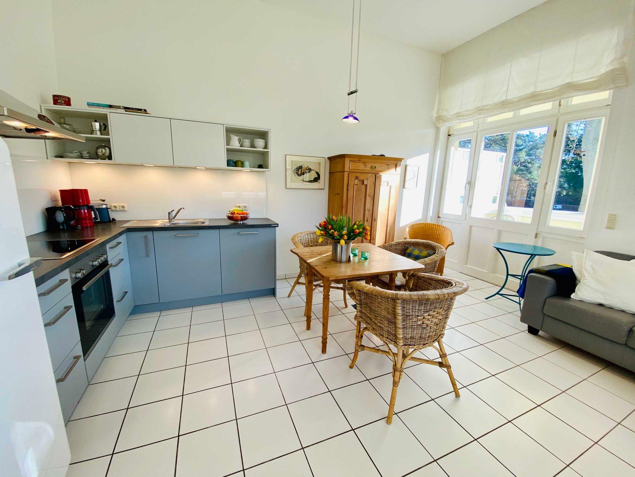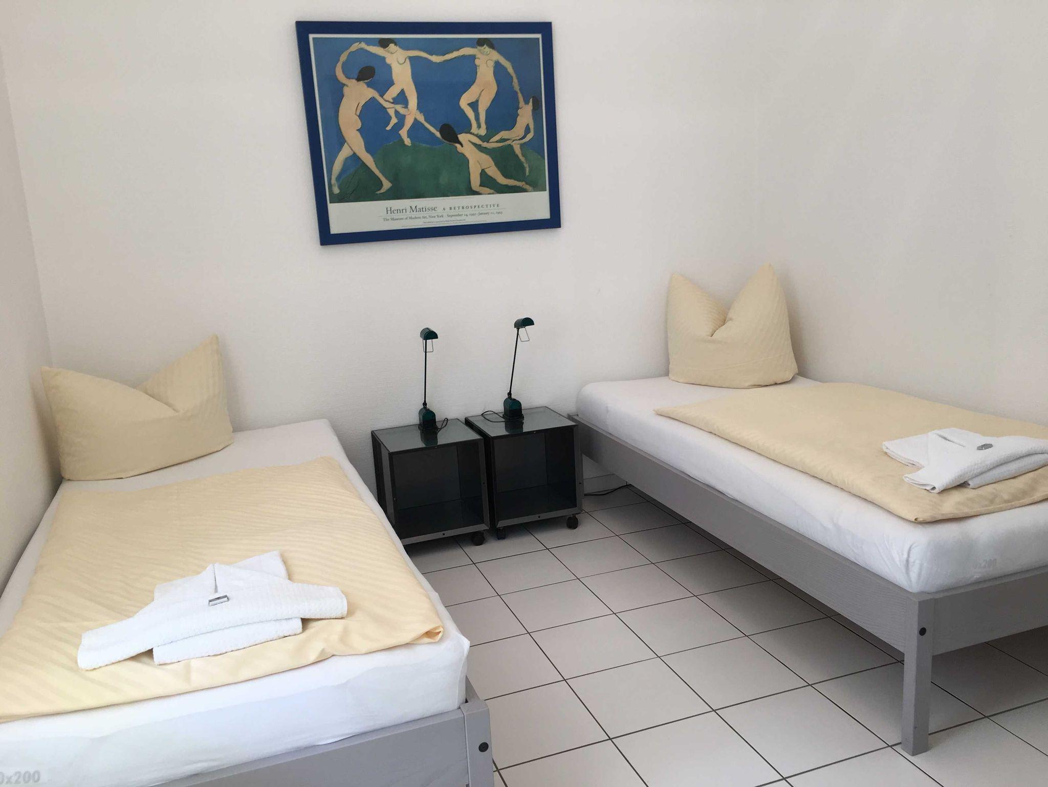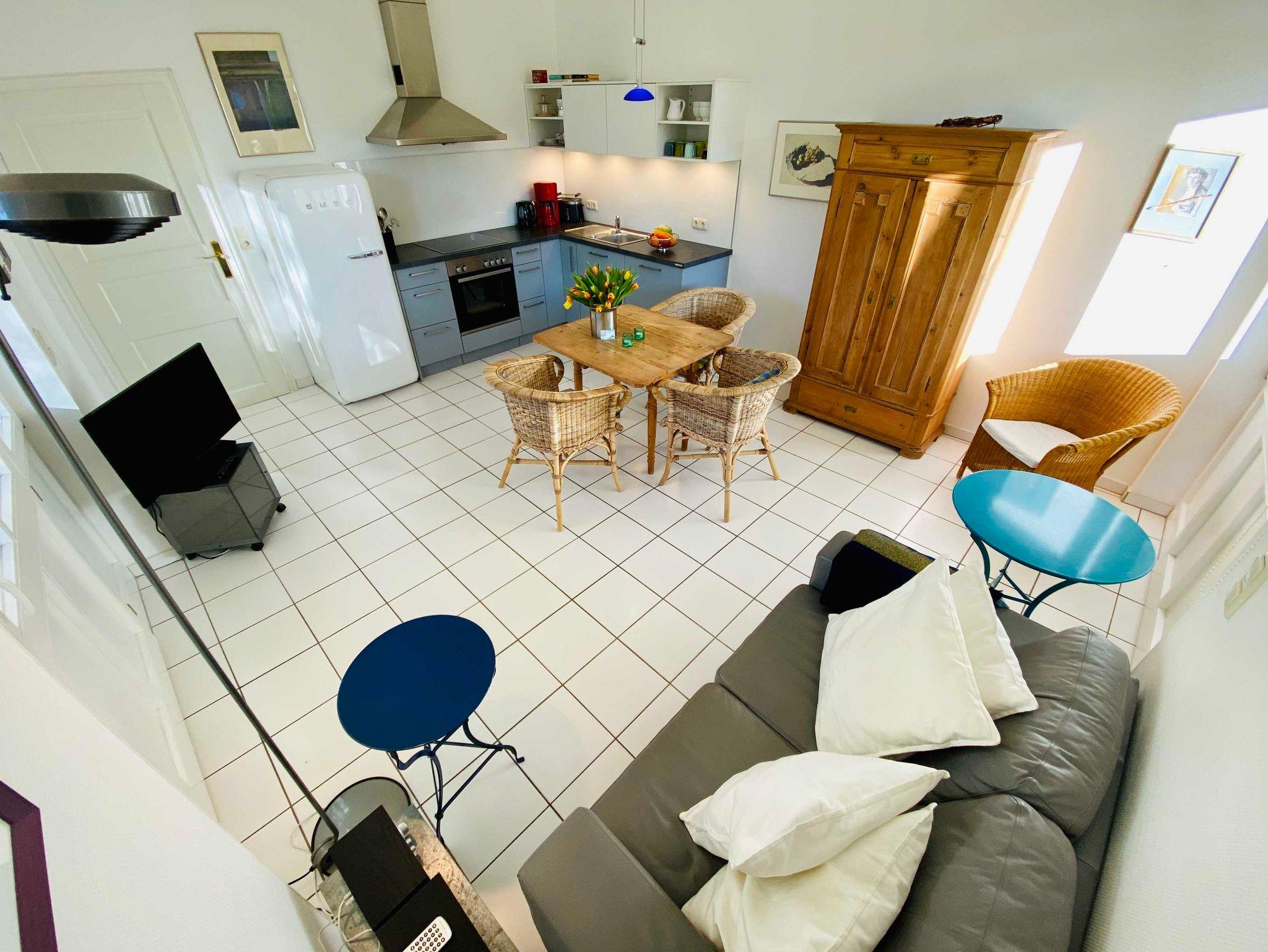 Die gemütliche 2-Raumwohnung besteht aus einem Wohn-Esszimmer mit einer 2er-Couch, TV, kleinem Esstisch und moderner Wohnküche. Das Schlafzimmer hat 2 Einzelbetten und einen kleinen Kleiderschrank.