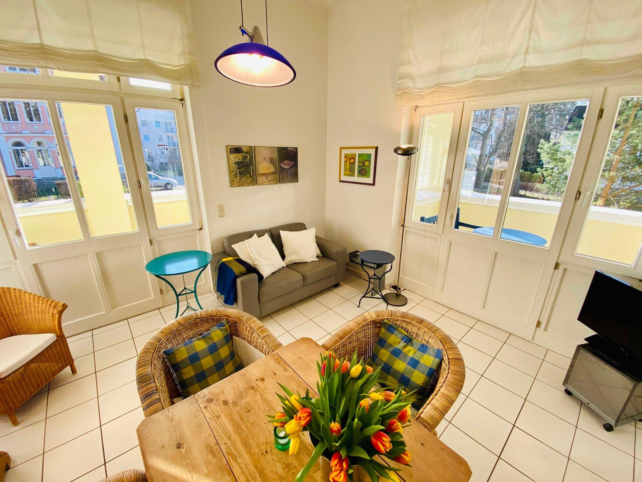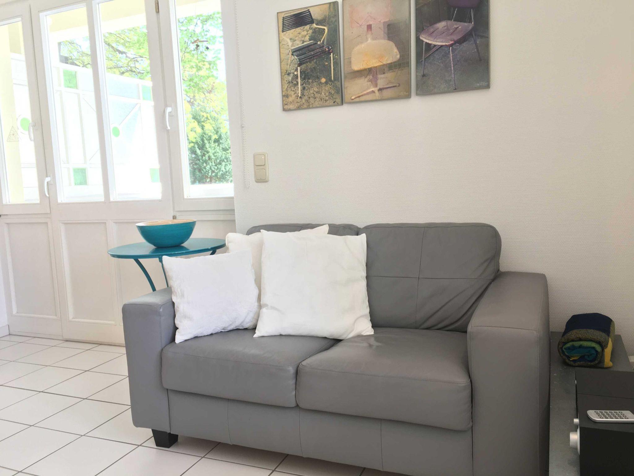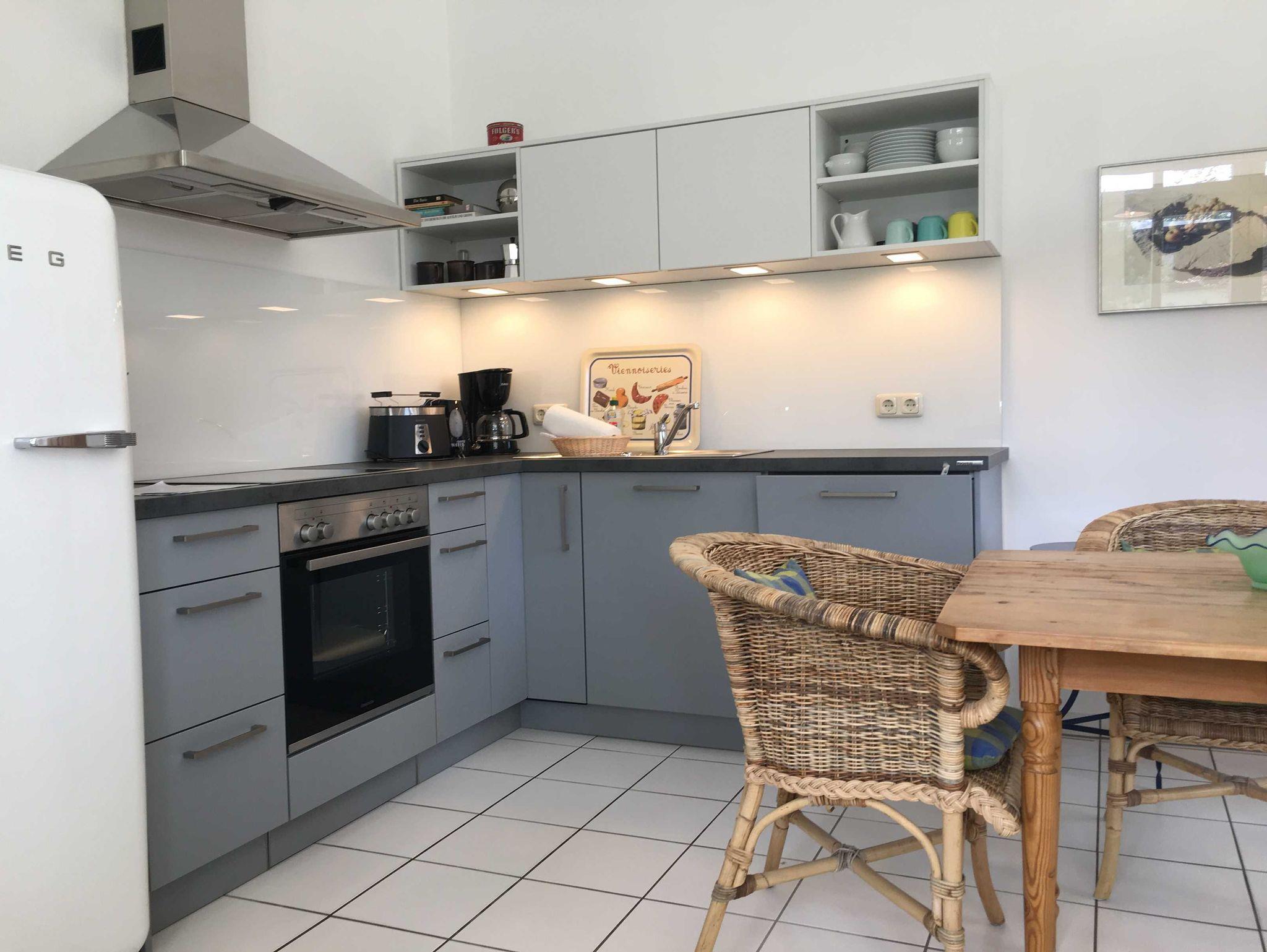 Die gemütliche 2-Raumwohnung besteht aus einem Wohn-Esszimmer mit einer 2er-Couch, TV, kleinem Esstisch und moderner Wohnküche. Das Schlafzimmer hat 2 Einzelbetten und einen kleinen Kleiderschrank.