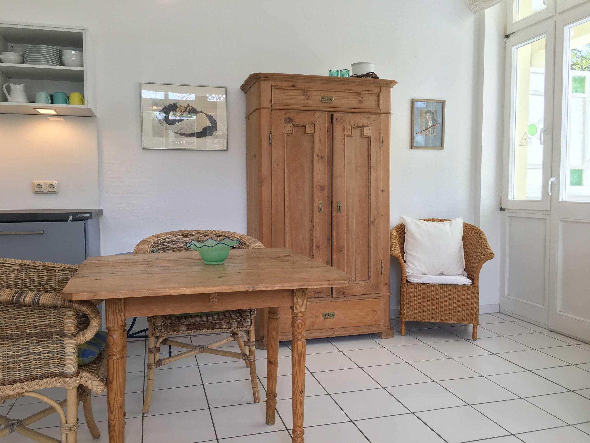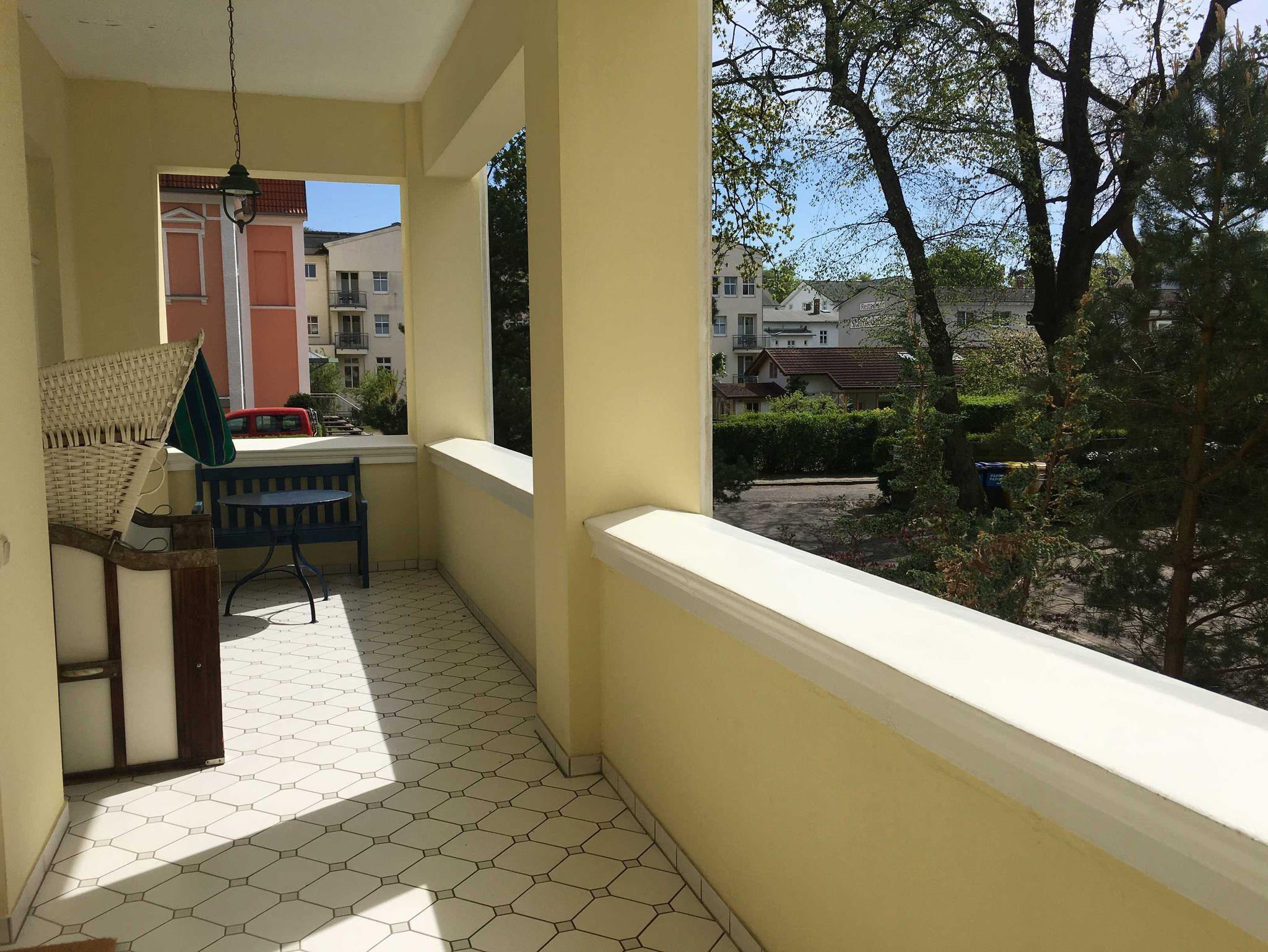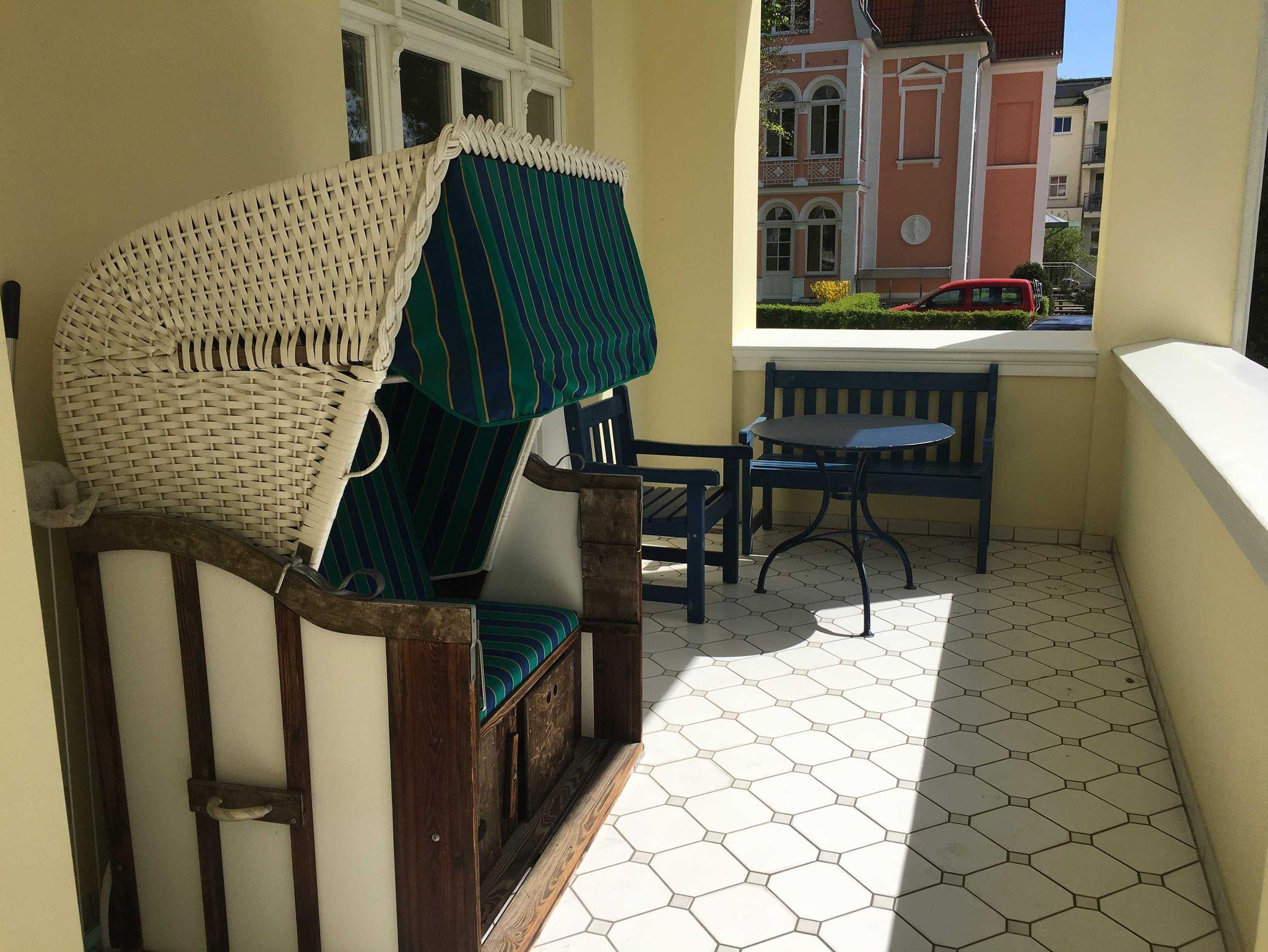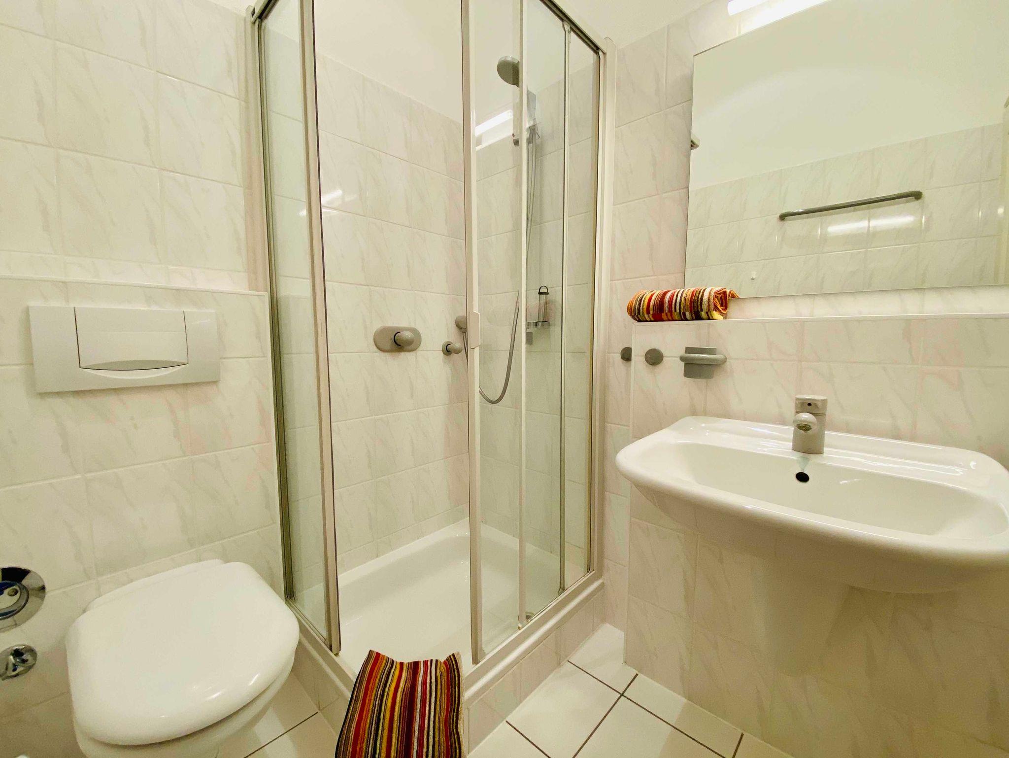 Zur Wohnung gehört ein kleines Bad mit Dusche. Die Wohnung ist mit mit 2 großen Balkonen, von denen 1 mit teilw. seitlichem Seeblick u. der Südbalkon mit eigenem Strandkorb ausgestattet.