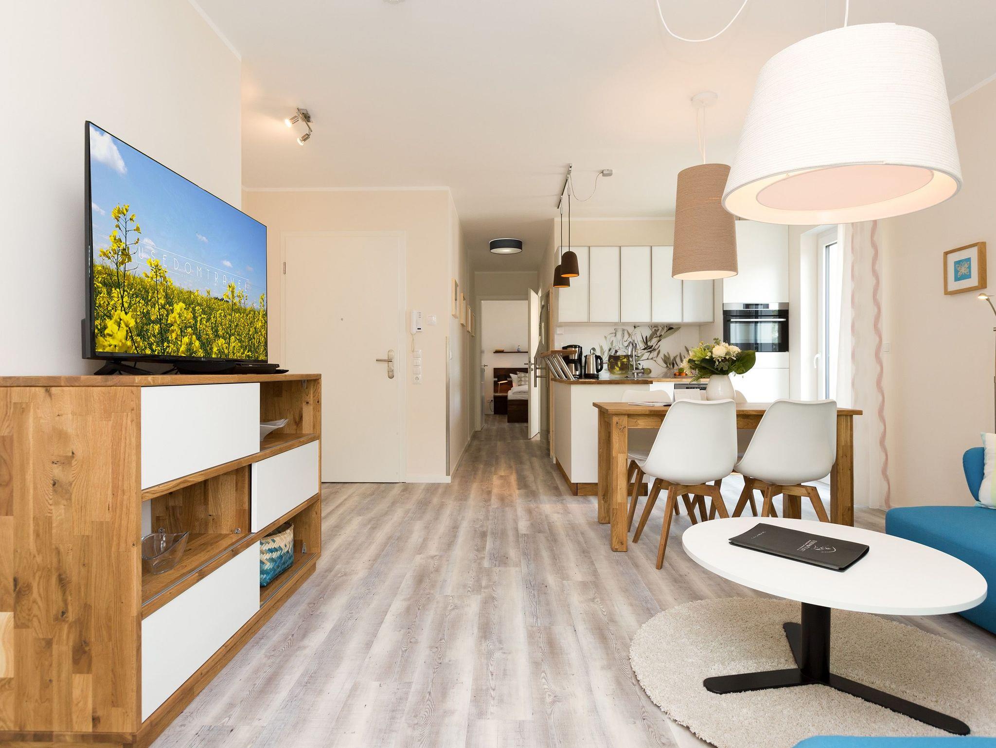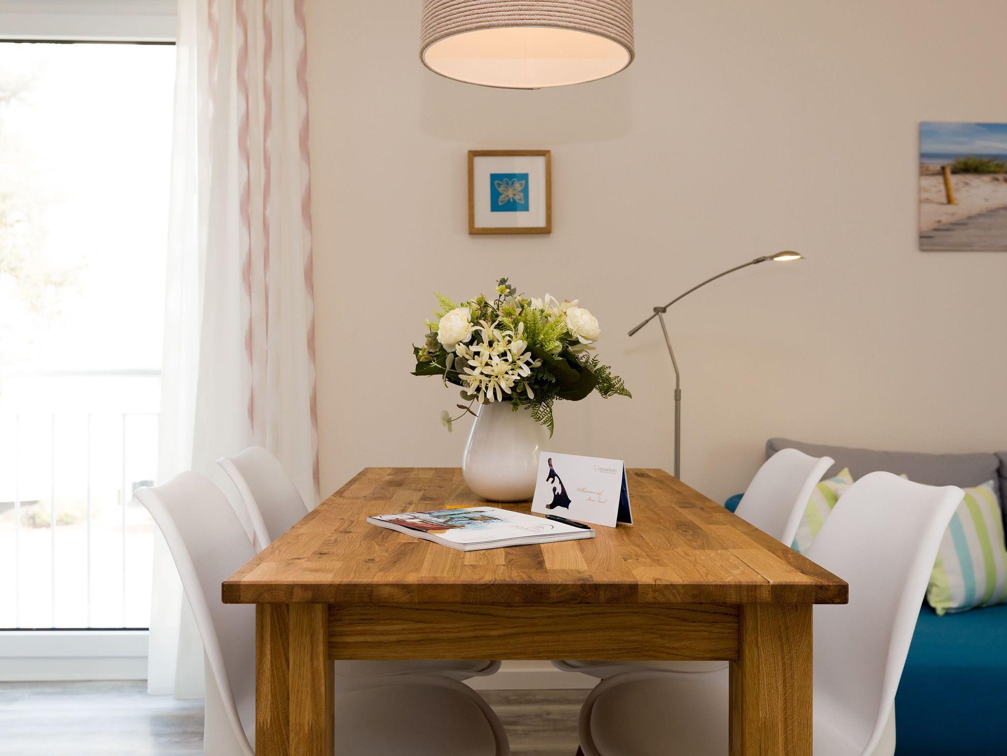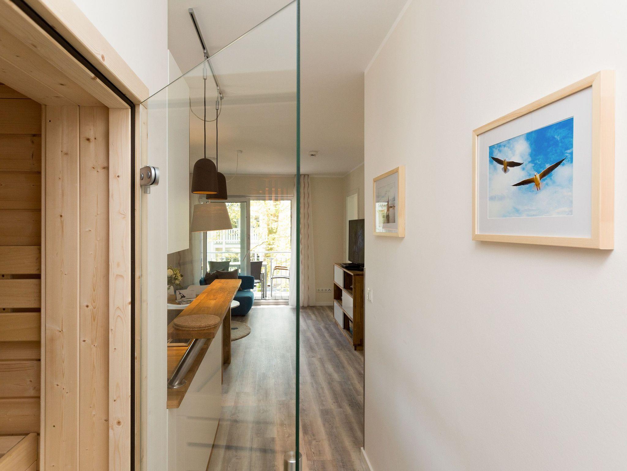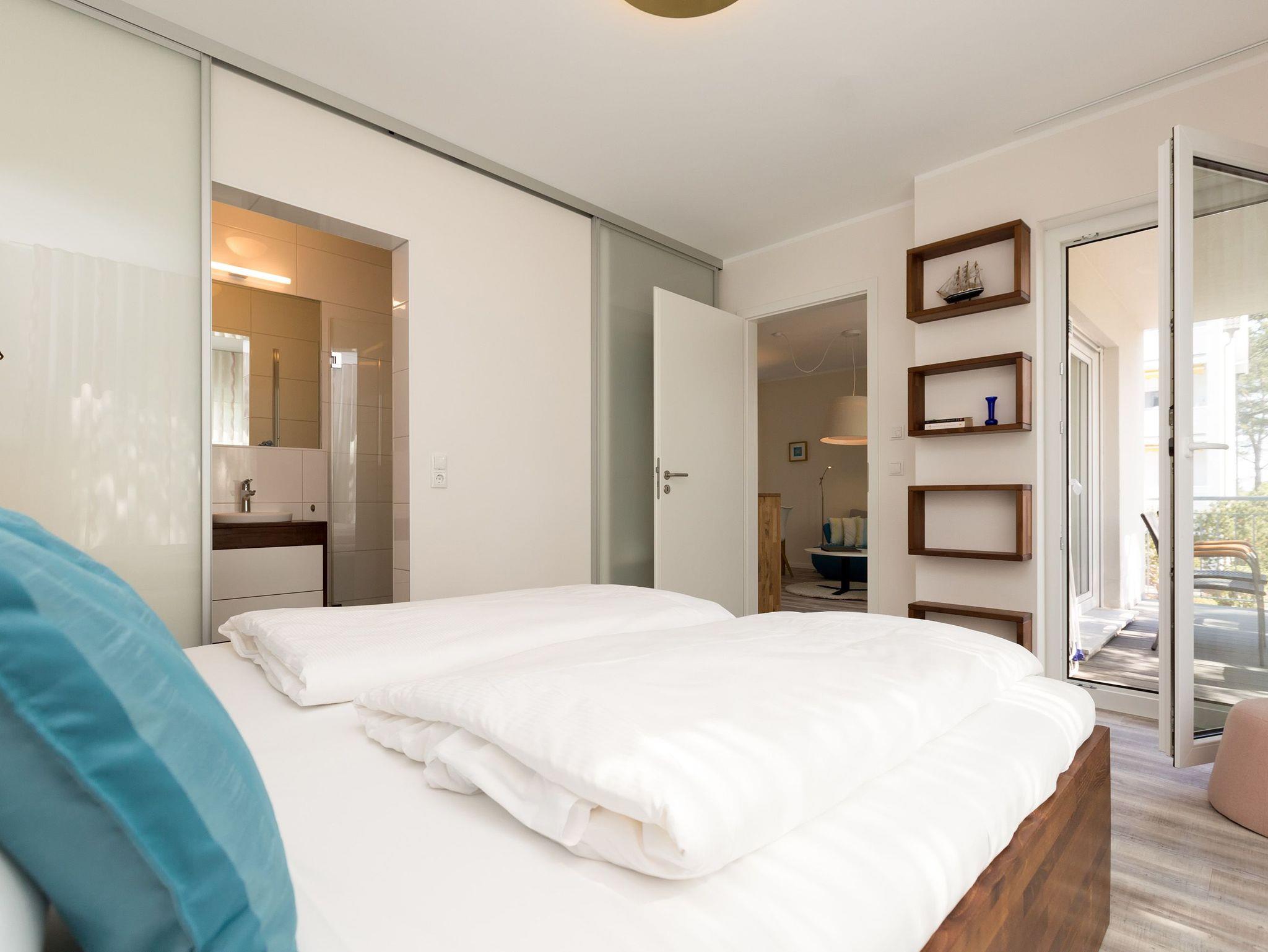 Urlaubsfeeling zum Wohlfühlen. Unsere neue 3-Raum-Ferienwohnung (62 qm) im 1.Obergeschoss der Dünenresidenz empfängt Sie mit hellen Farben und liebevollen Dekorationen. Wertige Einbauten aus Eiche [&] Akazie und eine gelungene Raumaufteilung schaffen hier ein schönes Urlaubziel für 4 Personen und ein Kleinkind bis 3 Jahre (als Aufbettung im Babyreisebett). Schon beim Eintreten offeriert sich der helle Wohnbereich, ausgestattet mit einer modernen Sitzgruppe und Flat-TV. Die angrenzende, offene Küche mit Essplatz fügt sich harmonisch ein und ist natürlich komplett ausgestattet. Zwei Schlafzimmer mit jeweils eigenem Bad bieten einen idealen Rückzugsort. Das erste Schlafzimmer verfügt über ein komfortables Doppelbett mit Bettkasten (1,80m x 2,00m) und Flat-TV, ein kleines Duschbad und Zugang zum Balkon. Das zweite Schlafzimmer wartet mit einem bequemen Doppelbett (1,60m x 2,00m) und Flat-TV auf, angrenzend gibt es hier ein Bad mit Dusche und WC. Klein aber fein, die wohnungseigene Sauna bietet nicht nur in der kalten Jahreszeit eine erholsame Abwechslung. Die Usedomer Sonne und das Meeresrauschen genießen Sie schon beim Frühstück auf dem Ostbalkon, ausgestattet mit Gartenmöbeln. Hier kann man bei ein bisschen Meerblick wunderbar Relaxen. Für Ihren Komfort sind die Betten bei der Anreise bezogen und Handtücher liegen bereit. Ein Pkw-Stellplatz steht in der Tiefgarage zur Verfügung (max. Einfahrtshöhe 1,85 m). Das Wlan-Netz kann kostenlos genutzt werden.
