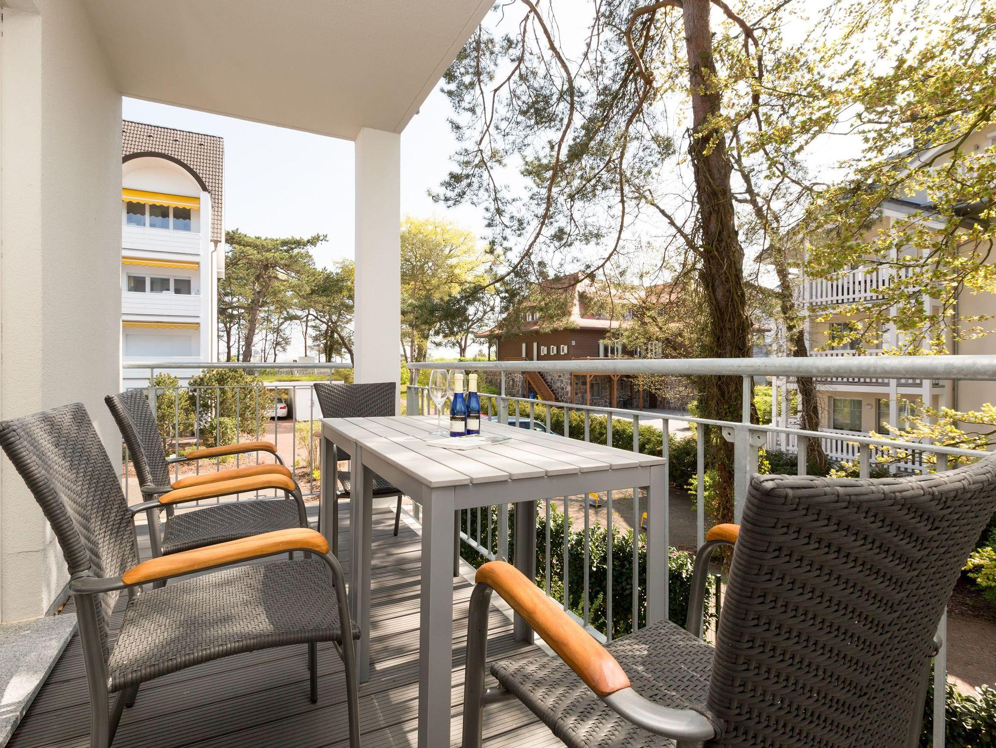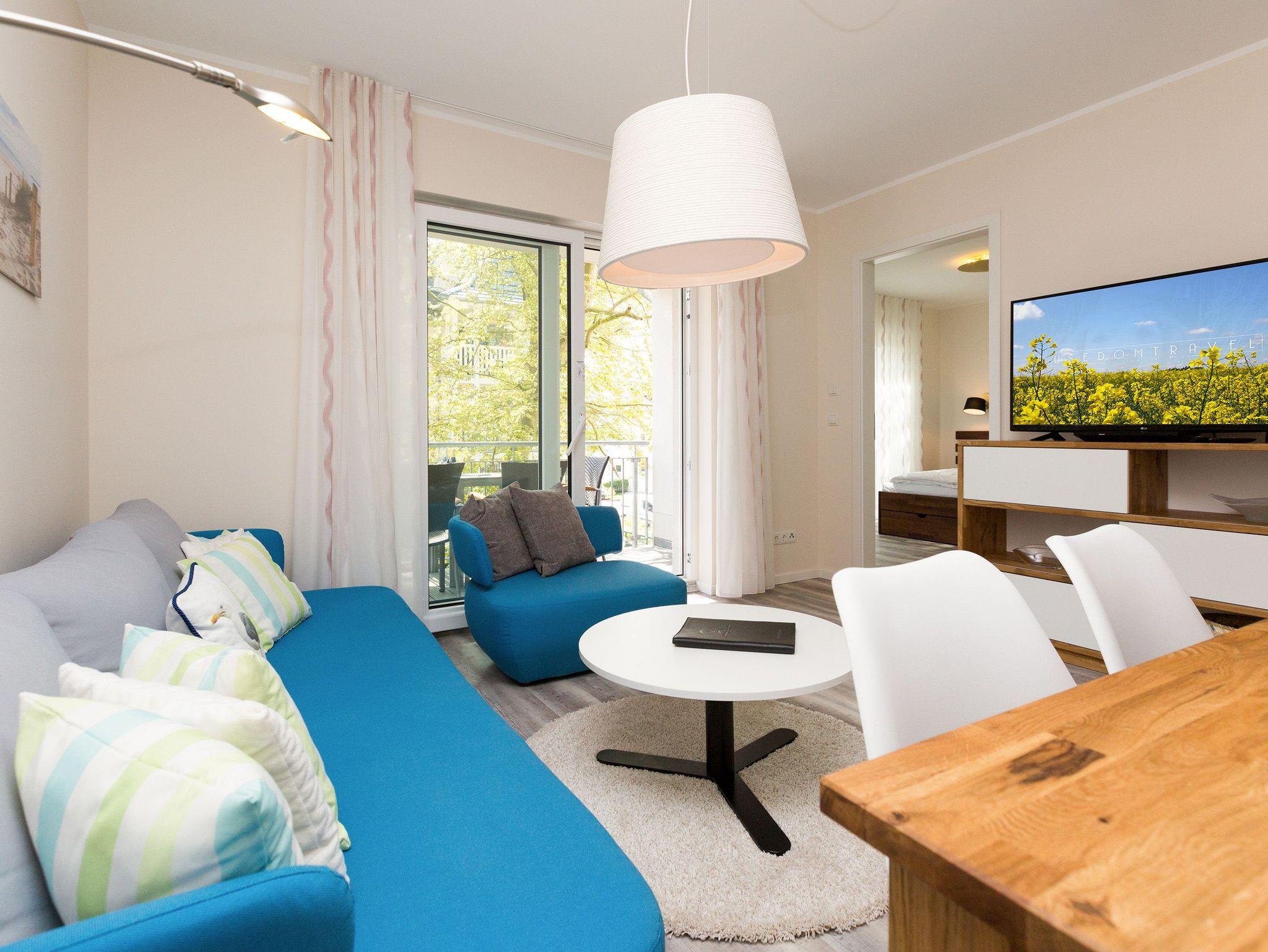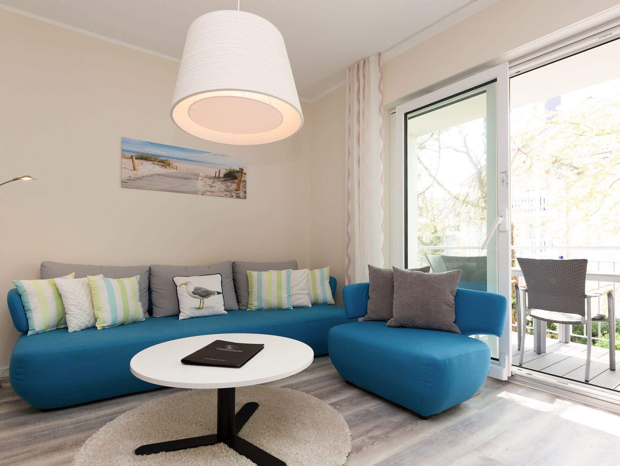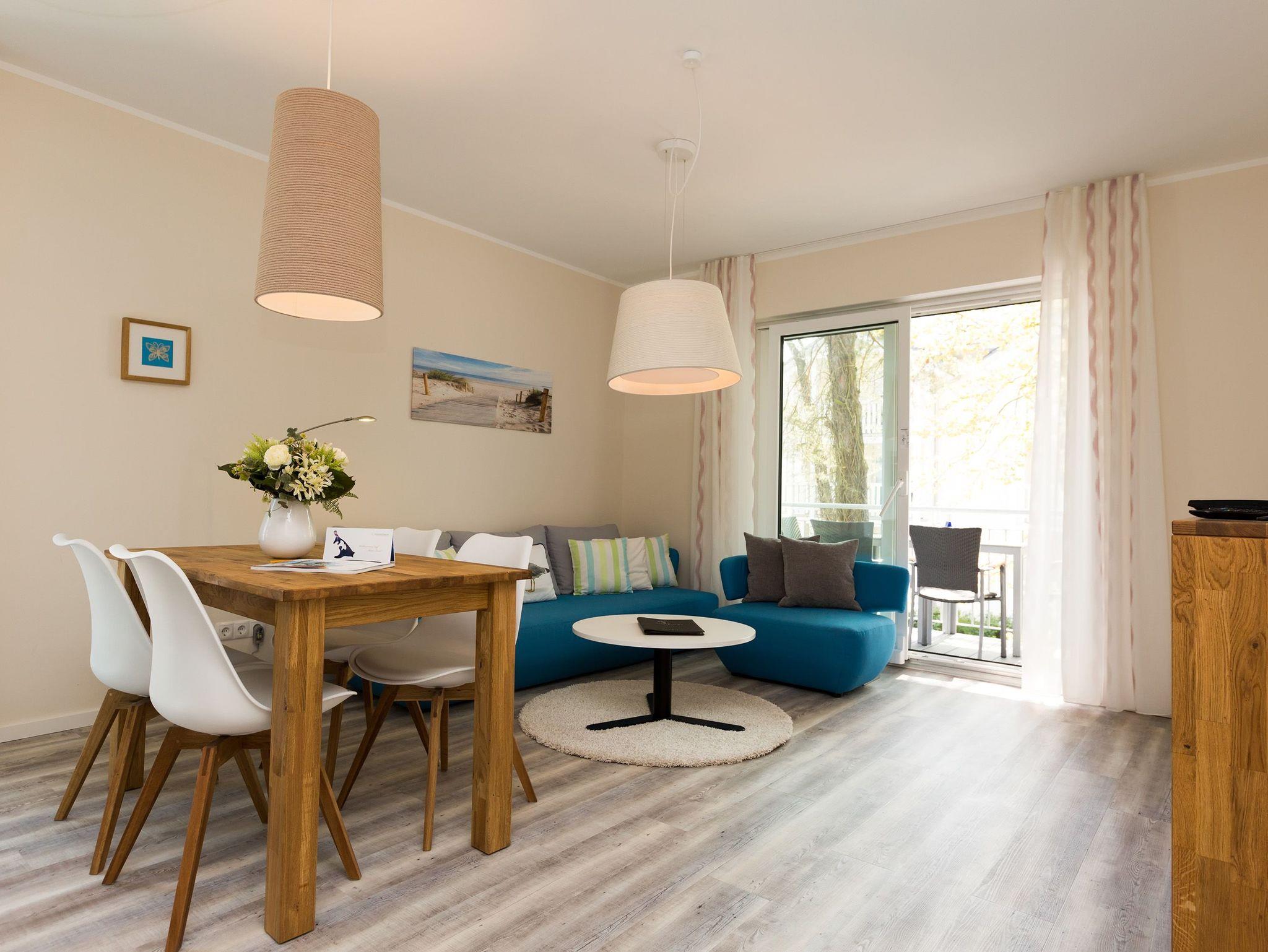 Urlaubsfeeling zum Wohlfühlen. Unsere neue 3-Raum-Ferienwohnung (62 qm) im 1.Obergeschoss der Dünenresidenz empfängt Sie mit hellen Farben und liebevollen Dekorationen. Wertige Einbauten aus Eiche [&] Akazie und eine gelungene Raumaufteilung schaffen hier ein schönes Urlaubziel für 4 Personen und ein Kleinkind bis 3 Jahre (als Aufbettung im Babyreisebett). Schon beim Eintreten offeriert sich der helle Wohnbereich, ausgestattet mit einer modernen Sitzgruppe und Flat-TV. Die angrenzende, offene Küche mit Essplatz fügt sich harmonisch ein und ist natürlich komplett ausgestattet. Zwei Schlafzimmer mit jeweils eigenem Bad bieten einen idealen Rückzugsort. Das erste Schlafzimmer verfügt über ein komfortables Doppelbett mit Bettkasten (1,80m x 2,00m) und Flat-TV, ein kleines Duschbad und Zugang zum Balkon. Das zweite Schlafzimmer wartet mit einem bequemen Doppelbett (1,60m x 2,00m) und Flat-TV auf, angrenzend gibt es hier ein Bad mit Dusche und WC. Klein aber fein, die wohnungseigene Sauna bietet nicht nur in der kalten Jahreszeit eine erholsame Abwechslung. Die Usedomer Sonne und das Meeresrauschen genießen Sie schon beim Frühstück auf dem Ostbalkon, ausgestattet mit Gartenmöbeln. Hier kann man bei ein bisschen Meerblick wunderbar Relaxen. Für Ihren Komfort sind die Betten bei der Anreise bezogen und Handtücher liegen bereit. Ein Pkw-Stellplatz steht in der Tiefgarage zur Verfügung (max. Einfahrtshöhe 1,85 m). Das Wlan-Netz kann kostenlos genutzt werden.