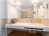 Ein Badezimmer in sanften Sandtönen mit einer geräumigen Regen-Dusche und einer Infrarotkabine für entspannende Momente sorgt für zusätzlichen Komfort. Moderne Annehmlichkeiten wie Bluetooth-Boxen, WLAN und ein privater Parkplatz auf dem Grundstück runden das Angebot ab.