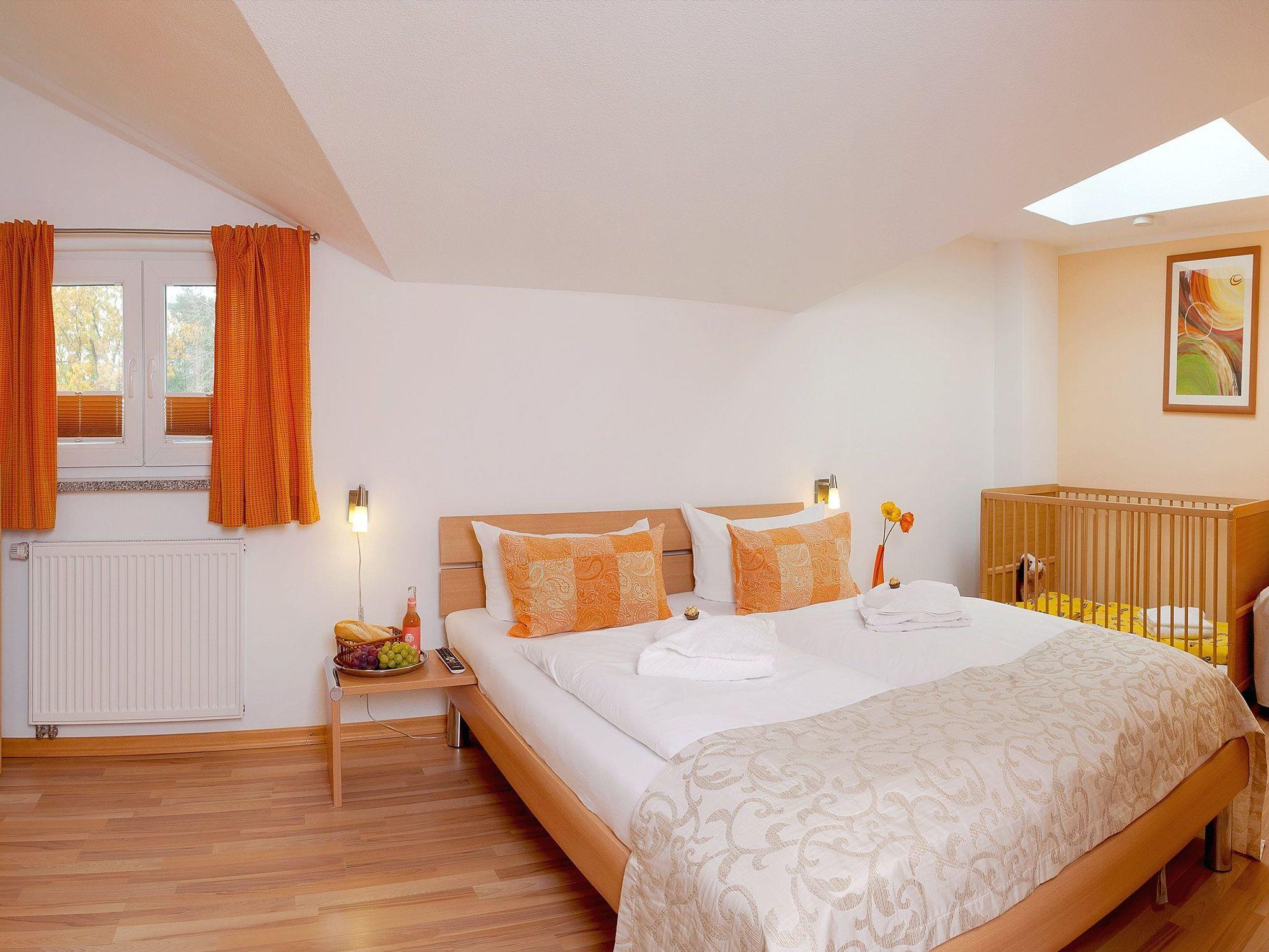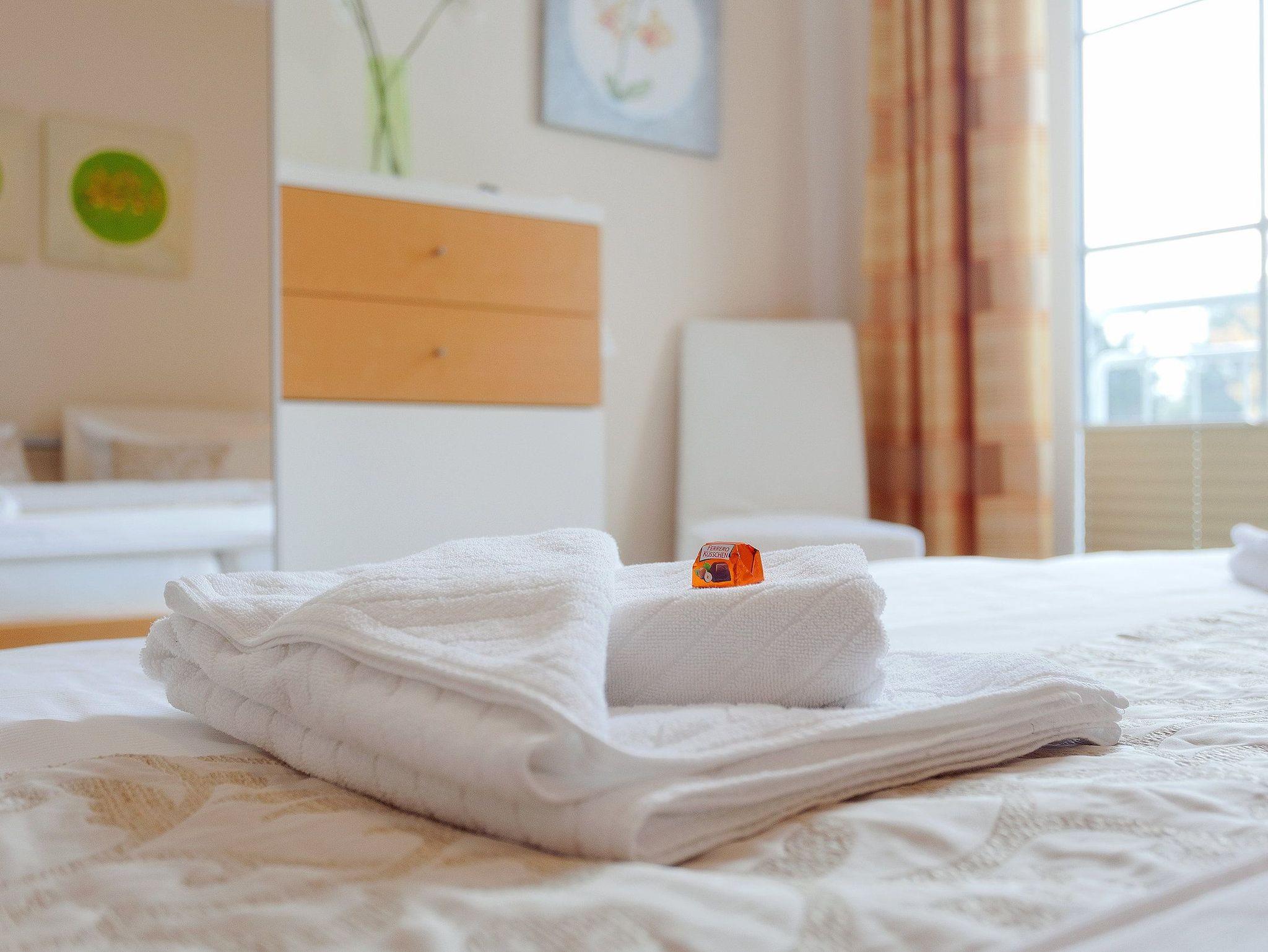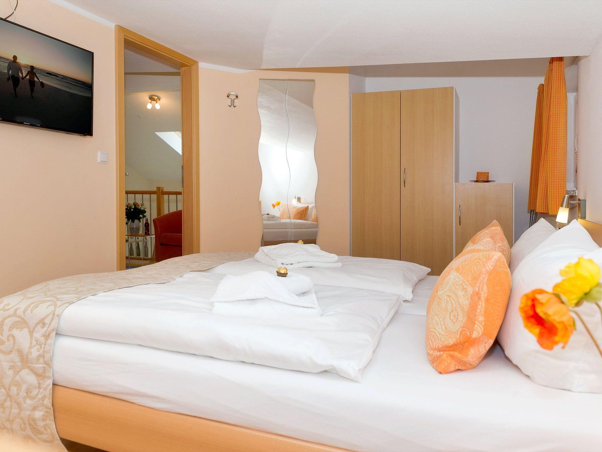 Damit Sie Ihre wohlverdiente Urlaubszeit bereits am Anreisetag in vollen Zügen genießen können, haben wir das Bett für Sie und das für Ihre lieben Mitreisenden bereits bezogen und ein Duschtuch sowie ein kleines Handtuch bereitgelegt. Das obere Badezimmer verfügt über Badewanne, WC und Haartrockner. Zu dem Appartement haben Sie über zwei Eingänge Zutritt: auf jeder Etage befindet sich ein Eingang. Für unsere kleineren Urlauber stehen ein Hochstuhl und ein Badhocker in jedem der Badezimmer mit zur Verfügung.