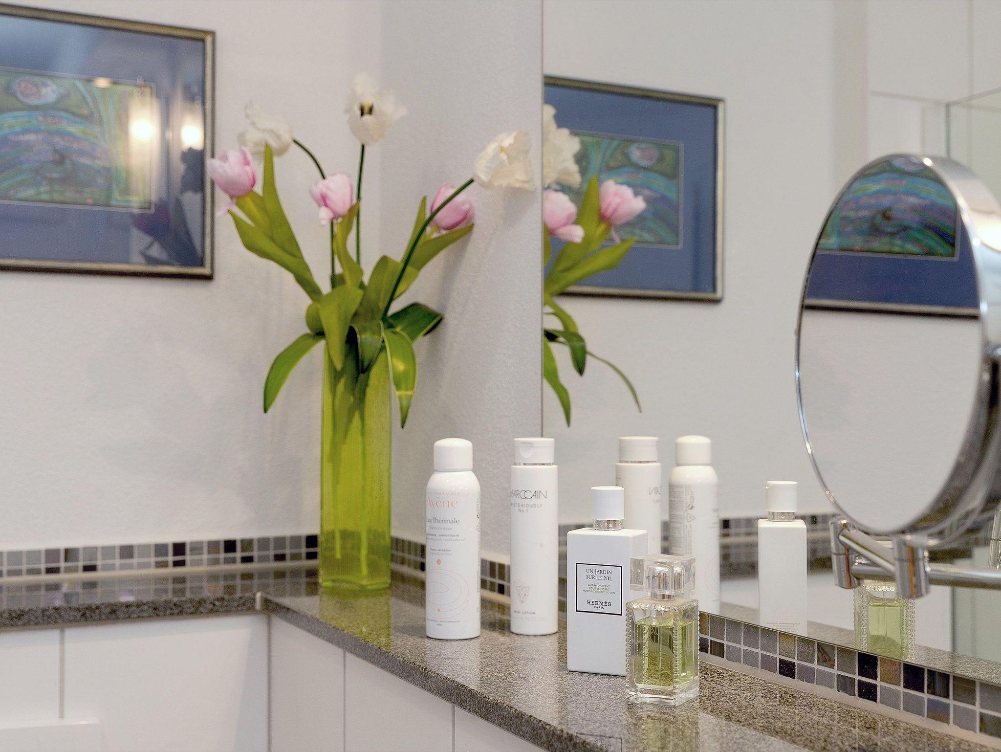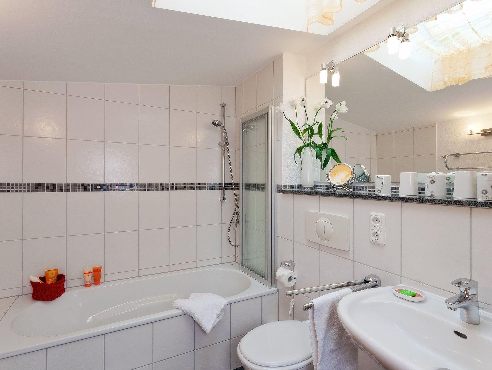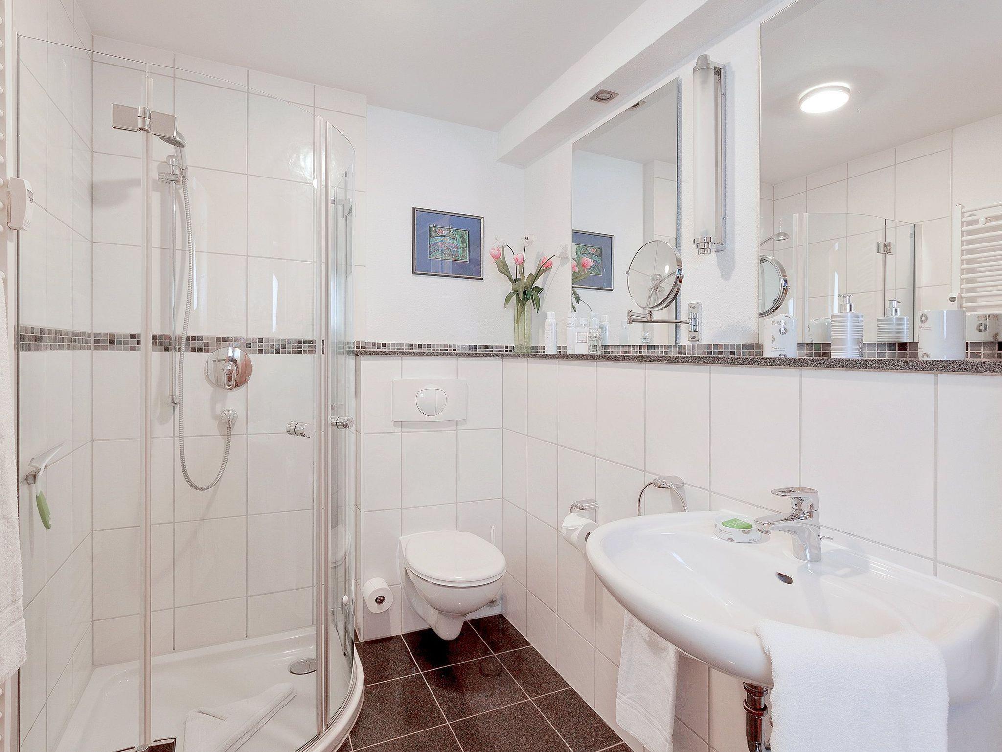 Damit Sie Ihre wohlverdiente Urlaubszeit bereits am Anreisetag in vollen Zügen genießen können, haben wir das Bett für Sie und das für Ihre lieben Mitreisenden bereits bezogen und ein Duschtuch sowie ein kleines Handtuch bereitgelegt. Das obere Badezimmer verfügt über Badewanne, WC und Haartrockner. Zu dem Appartement haben Sie über zwei Eingänge Zutritt: auf jeder Etage befindet sich ein Eingang. Für unsere kleineren Urlauber stehen ein Hochstuhl und ein Badhocker in jedem der Badezimmer mit zur Verfügung.