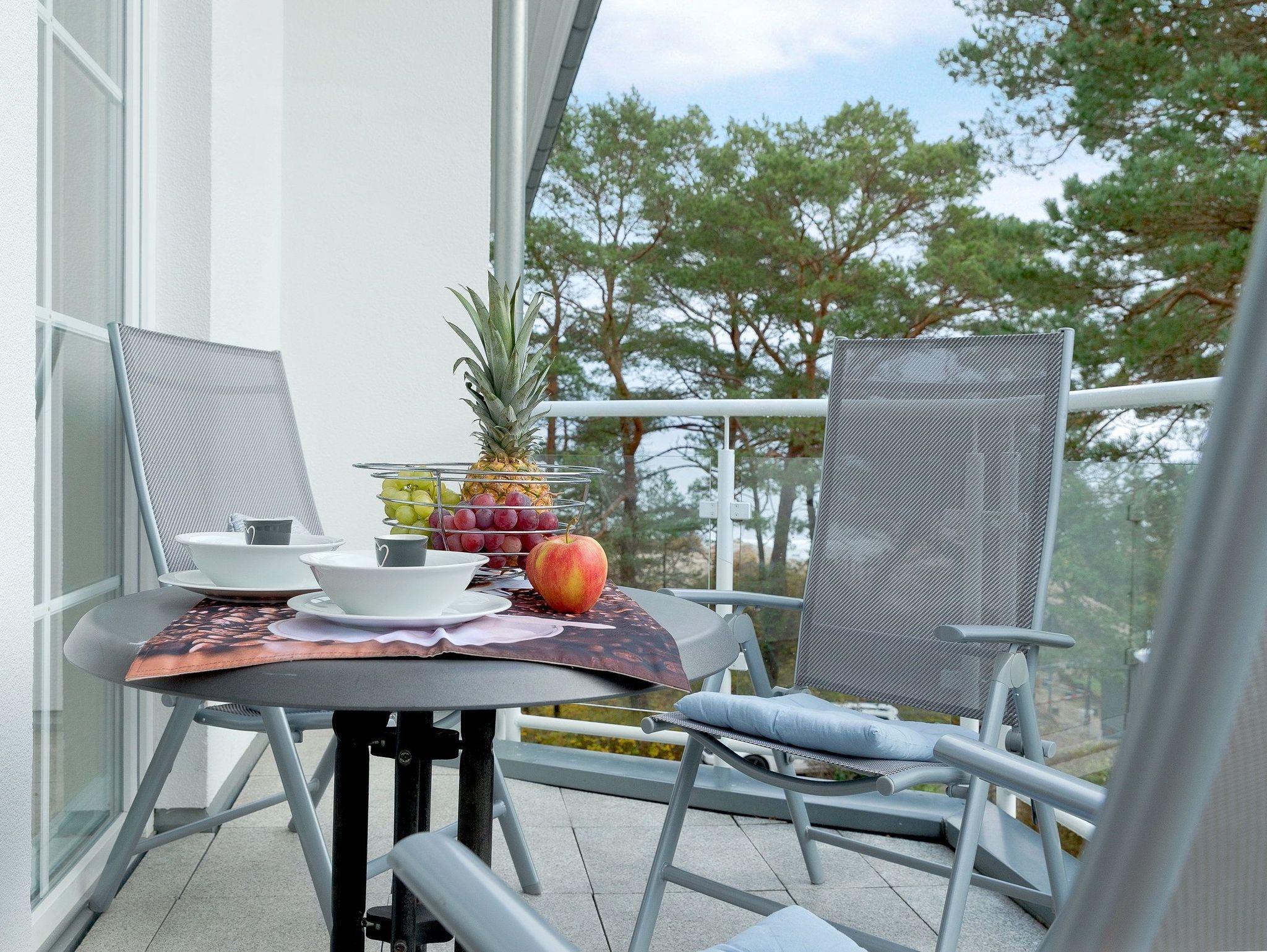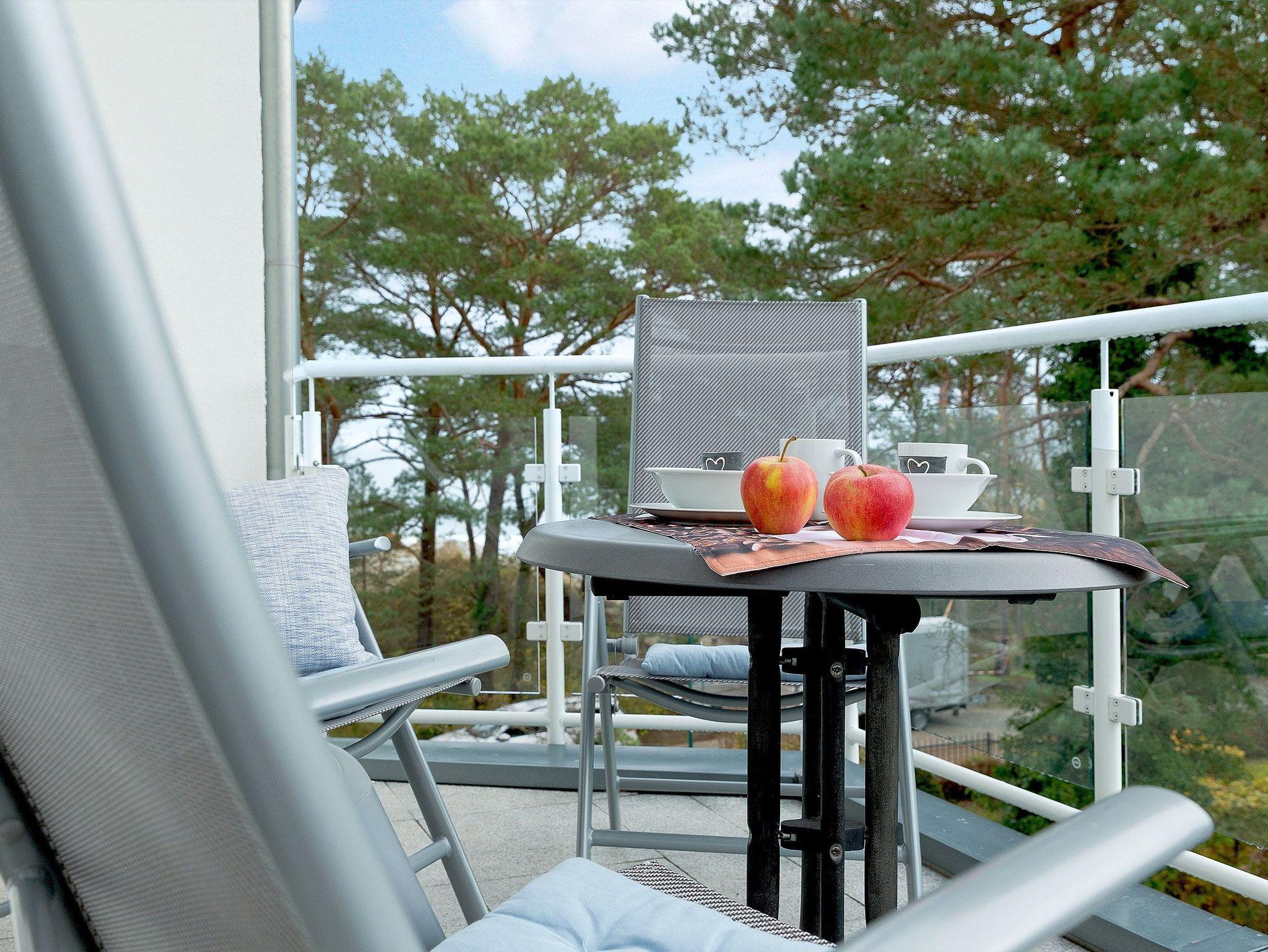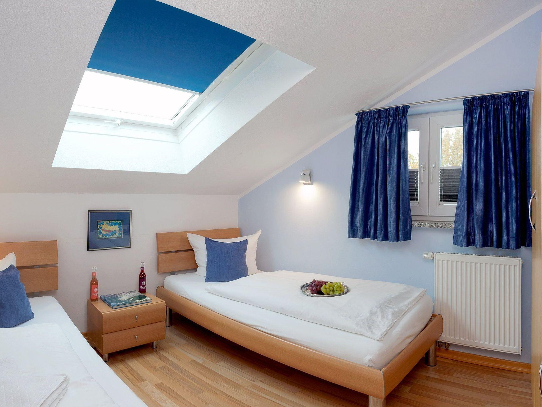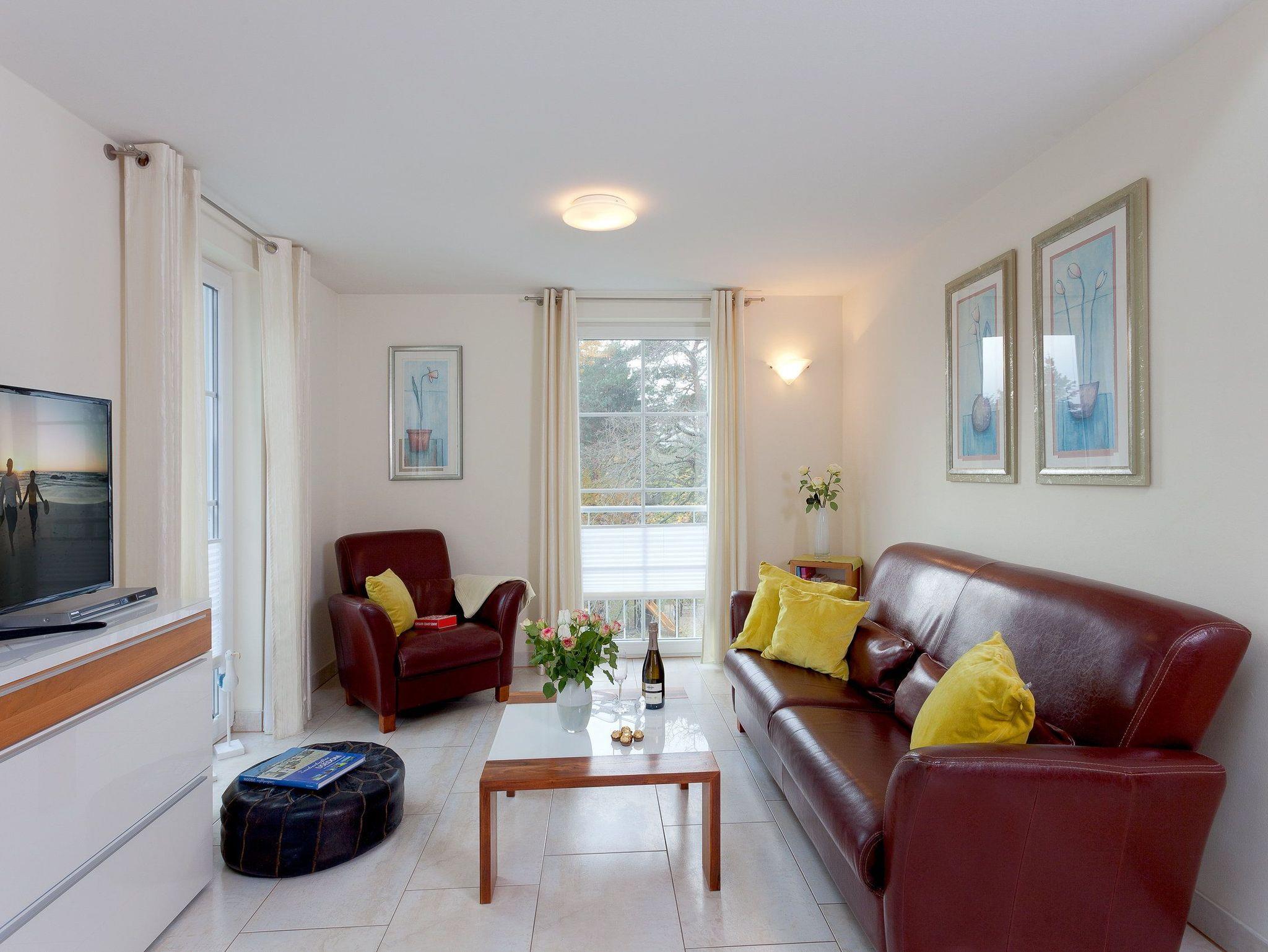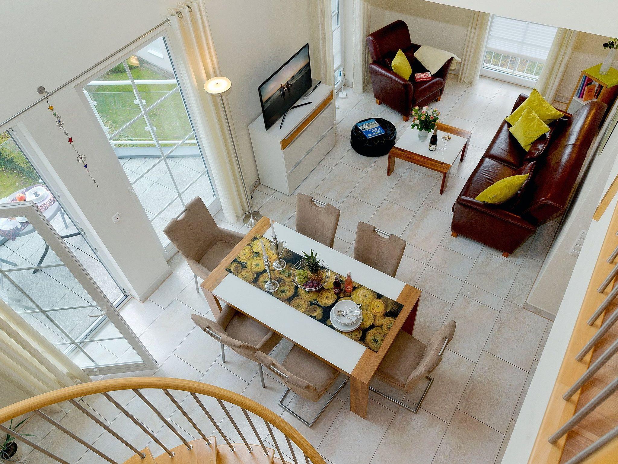 Die Fußböden des Appartements sind aus Naturstein und versprühen Dank Fußbodenheizung ein wohliges Gefühl. Vom Wohnbereich können Sie auf den Südostbalkon heraustreten und einen Hauch von Ostseeblick genießen.[nbsp] Über eine Wendeltreppe gelangen Sie in die obere Etage der Wohnung: von der Galerie haben Sie Zugang zu den beiden weiteren Schlafzimmern und dem zweiten Badezimmer. In dem zweiten Schlafzimmer des Appartements erwartet Sie ein komfortables Doppelbett (160x200 cm/ zwei getrennte Matratzen), ein Kinderbettchen (140x75 cm) und ein Flat TV, während in dem dritten Schlafzimmer zwei Einzelbetten (je 90x200 cm) und ein Flat TV zur erholsamen Nachtruhe einladen. Für die 5. und 6. Person berechnen wir einen Aufbettungszuschlag pro Tag - abhängig von der jeweiligen Saisonzeit.