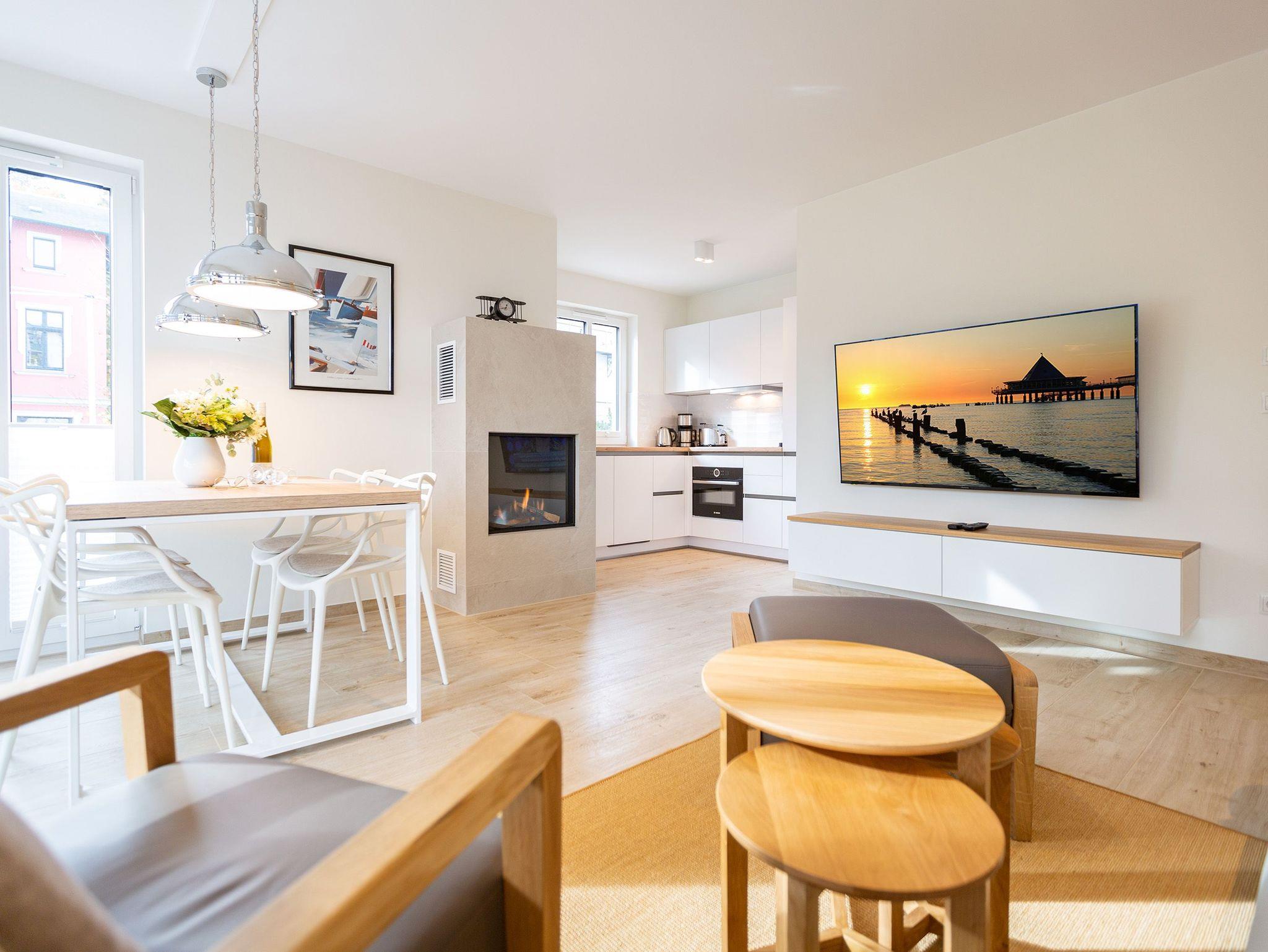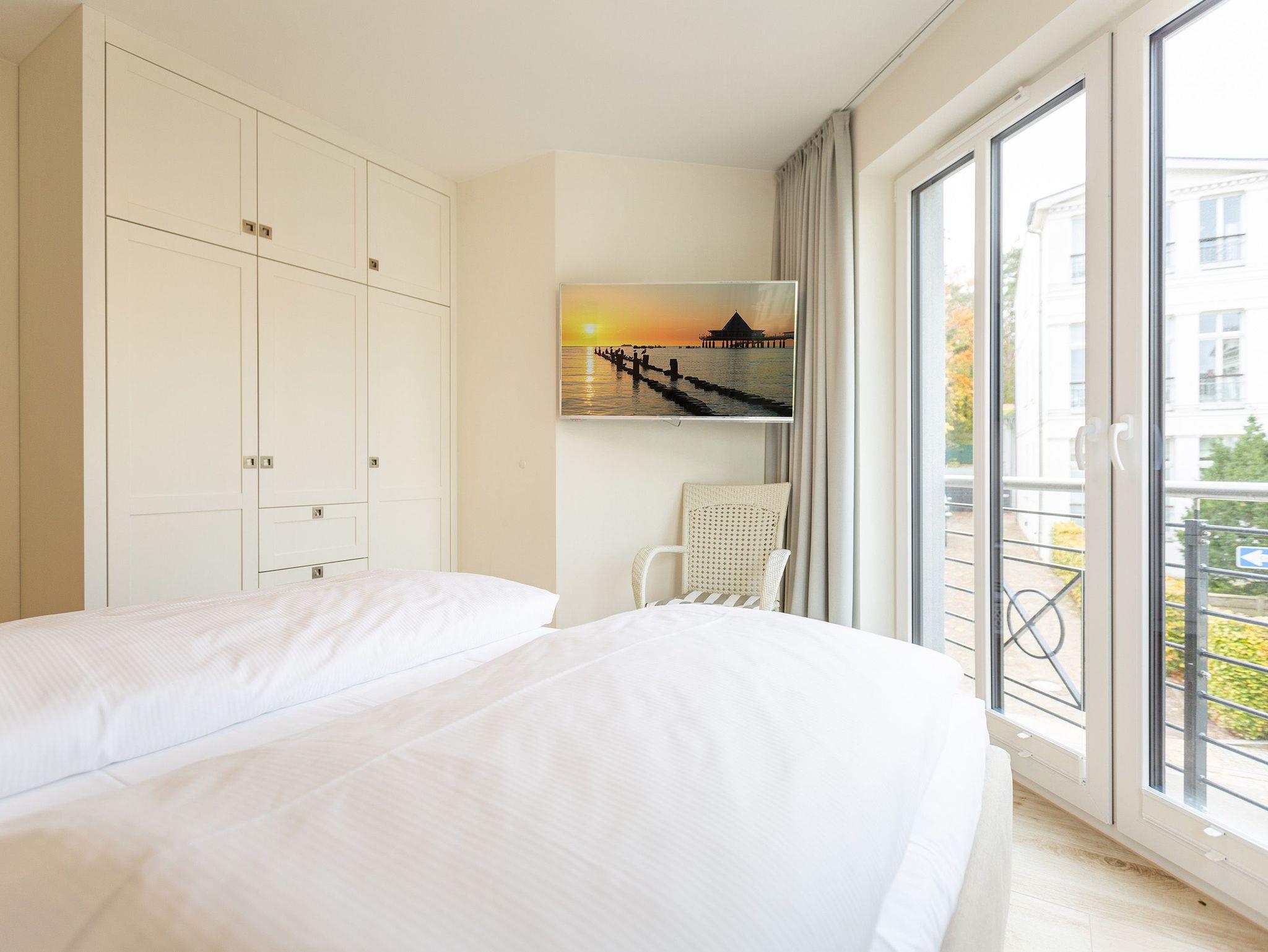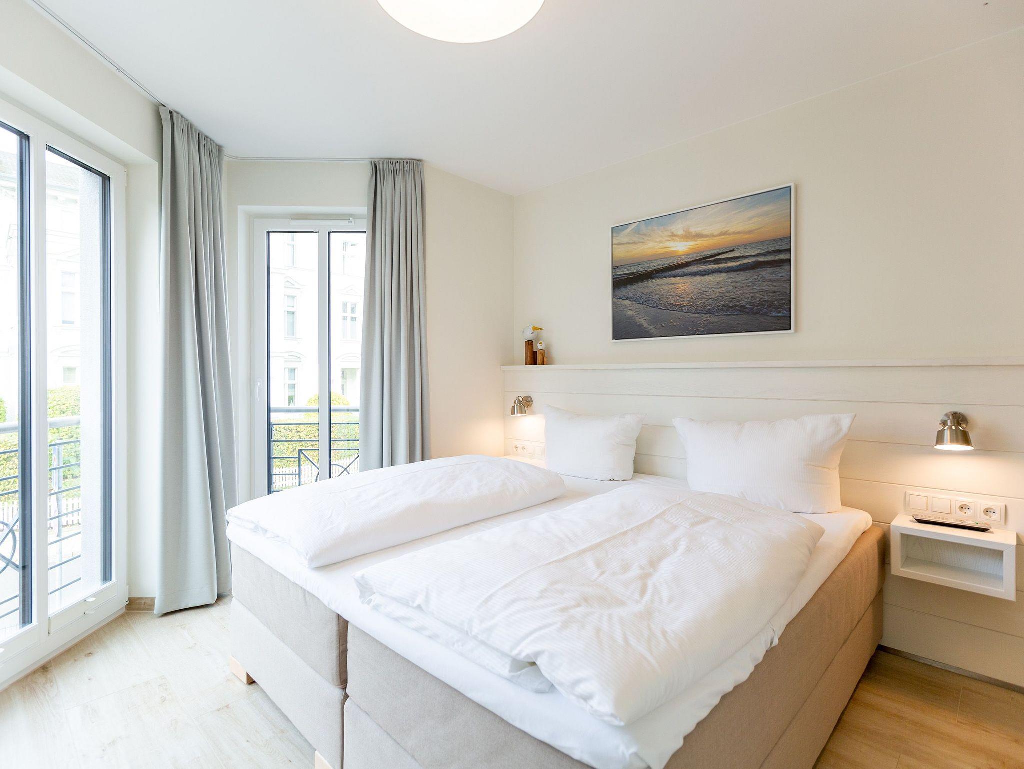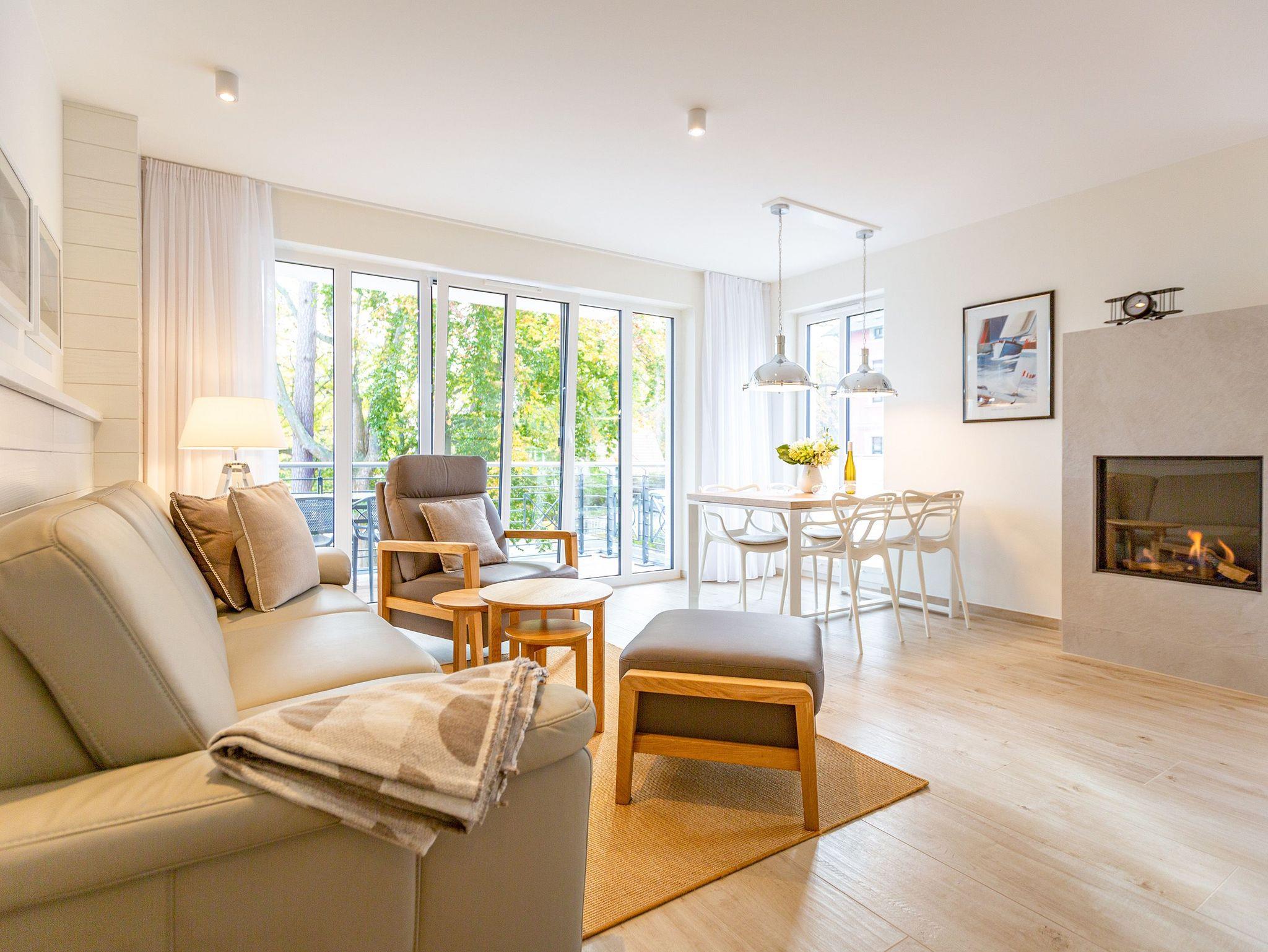 Ein außergewöhnliches und stylisches Ferien-Appartement wartet in der Nummer 4 nur darauf, Ihnen und Ihren bis zu drei weiteren Mitauszeitlern einen unvergesslichen und entspannten Ostseeurlaub zu bereiten. Die helle und großzügig geschnittene Drei-Raum-Wohnung im 1. Obergeschoss bietet auf 79 Quadratmetern allen nur denkbaren Wohnkomfort. Ein schönes, großes und gemütlich eingerichtetes Wohnzimmer mit einer vollausgestatteten und offenen Küche, zwei Schlafzimmer, zwei Bäder und vieles mehr. Ein sonniger Süd-Ost-Balkon (6,8 Quadratmeter) mit bequemen Balkonmöbeln lädt zum Essen an der frischen Ostseeluft und zum ausgiebigen Sonnenbaden ein. Denn hier haben Sie bis in den Nachmittag hinein Sonne. Das Wohnraum-Innere ist ebenso ansprechend und freundlich wie das Äußere. Eine große Sitzlandschaft mit Sofa, Sessel und Hocker bietet ausreichend Platz zum Relaxen bei einem spannenden Film auf dem großen 65 Zoll Flat-TV, beim Rundfunk hören vom bereitgestellten Radio oder beim Träumen vor den Flammen des Gas-Kamins. Zum Essen geht?s an den großzügigen Esstisch mit den bequemen Designer-Stühlen von Philippe Starck. Die zum Wohnzimmer hin offene Küche enthält alles Nötige zum Kochen, Backen, Sich-am-Herd-austoben. Eine Spülmaschine, ein Backofen mit integrierter Mikrowelle, ein Induktionsherd, ein Kühlschrank mit Gefrierfach sowie eine Kaffeemaschine und ein Toaster sind vorhanden. Auch erlesenes Geschirr finden Sie in den Schränken der Küchenzeile. Beide Schlafzimmer sind außergewöhnlich geschnitten und verfügen jeweils über ein Boxspring-Doppelbett (1,80 m x 2,00 m), einen Flat-TV und extra maßangefertigte Einbauschränke. Viel Platz also für Hose, Hemd und die Strandutensilien. Alle drei Räume sind durch die bodentiefen Fenster licht und hell und offerieren Ausblicke auf die wunderschönen Bädervillen ringsum. Es gibt zwei Bäder mit Dusche,[nbsp][nbsp]WC und WLAN-Radio, wovon eines ein Tageslichtbad ist. Das Masterbad beherbergt zudem eine kleine Finnische Sauna. Freuen Sie sich daher schon mal auf die kühleren Tage. Denn hier kommen Sie ordentlich ins Schwitzen. Im Hauswirtschaftsraum befindet sich ein Waschtrockner. Der Stellplatz Nr. 4 im Hof ist für Sie reserviert. Das WLAN können Sie kostenfrei nutzen. Bei Anreise liegen Handtücher für Sie bereit und die Betten sind bezogen.