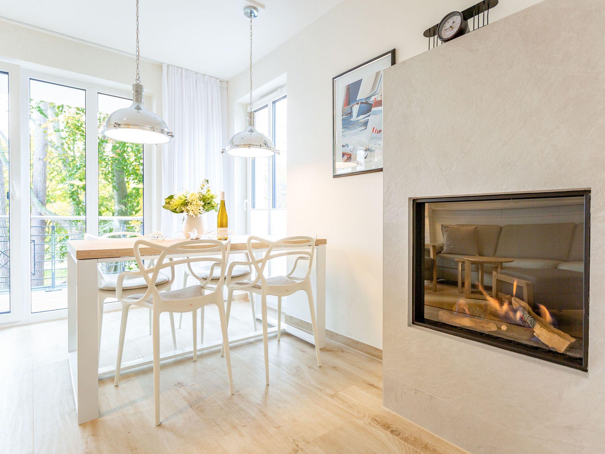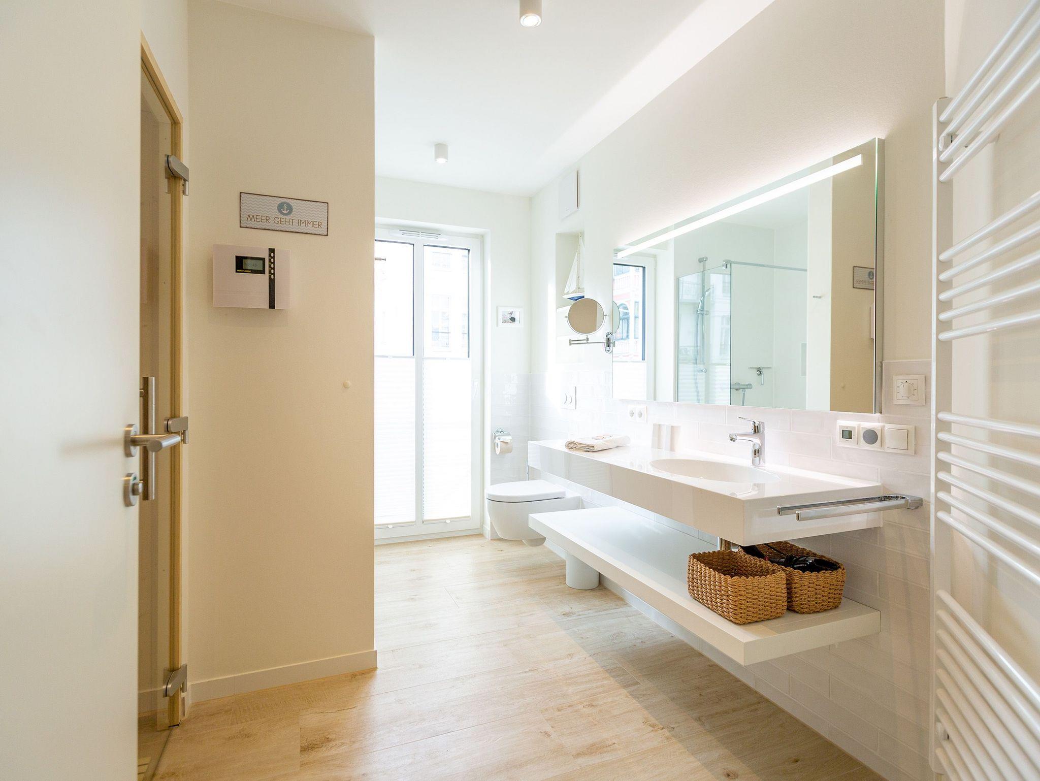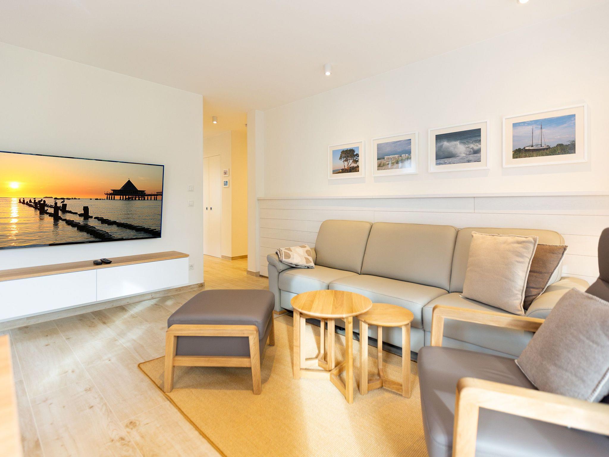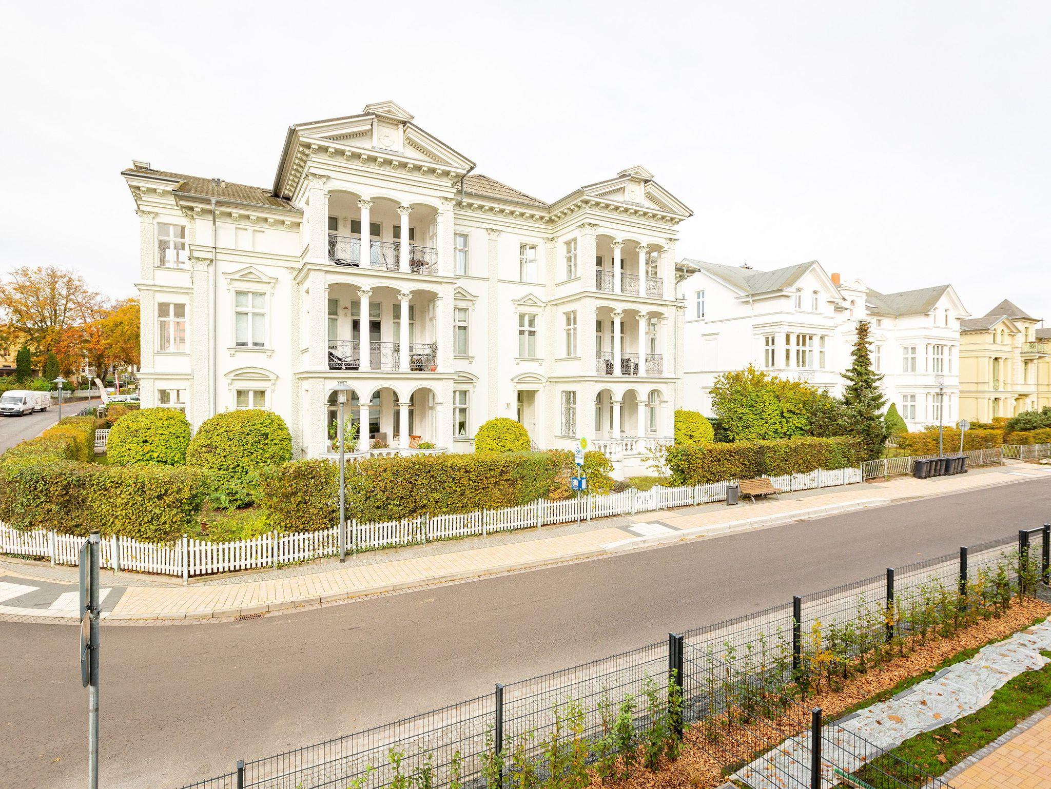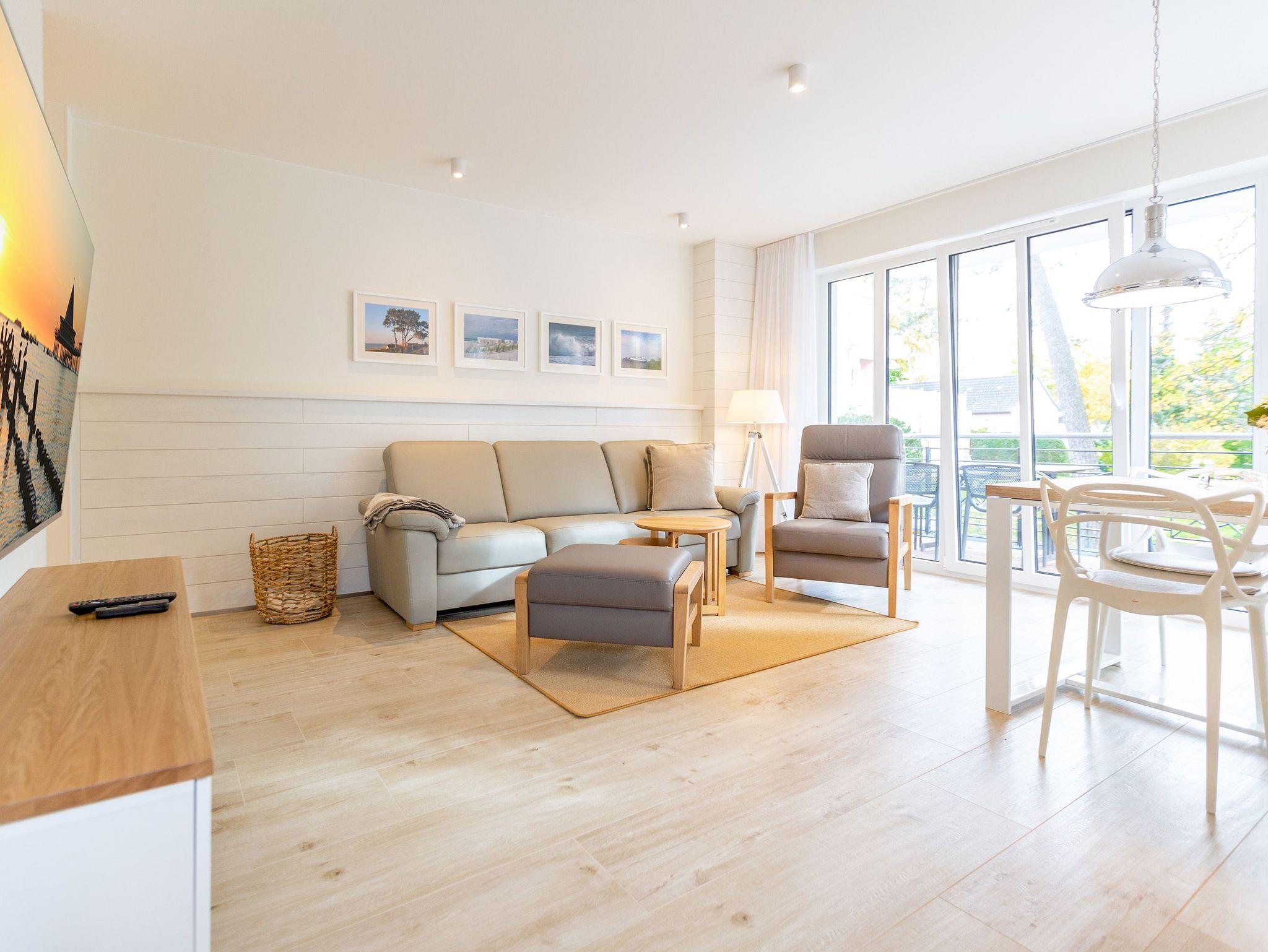 Ein außergewöhnliches und stylisches Ferien-Appartement wartet in der Nummer 4 nur darauf, Ihnen und Ihren bis zu drei weiteren Mitauszeitlern einen unvergesslichen und entspannten Ostseeurlaub zu bereiten. Die helle und großzügig geschnittene Drei-Raum-Wohnung im 1. Obergeschoss bietet auf 79 Quadratmetern allen nur denkbaren Wohnkomfort. Ein schönes, großes und gemütlich eingerichtetes Wohnzimmer mit einer vollausgestatteten und offenen Küche, zwei Schlafzimmer, zwei Bäder und vieles mehr. Ein sonniger Süd-Ost-Balkon (6,8 Quadratmeter) mit bequemen Balkonmöbeln lädt zum Essen an der frischen Ostseeluft und zum ausgiebigen Sonnenbaden ein. Denn hier haben Sie bis in den Nachmittag hinein Sonne. Das Wohnraum-Innere ist ebenso ansprechend und freundlich wie das Äußere. Eine große Sitzlandschaft mit Sofa, Sessel und Hocker bietet ausreichend Platz zum Relaxen bei einem spannenden Film auf dem großen 65 Zoll Flat-TV, beim Rundfunk hören vom bereitgestellten Radio oder beim Träumen vor den Flammen des Gas-Kamins. Zum Essen geht?s an den großzügigen Esstisch mit den bequemen Designer-Stühlen von Philippe Starck. Die zum Wohnzimmer hin offene Küche enthält alles Nötige zum Kochen, Backen, Sich-am-Herd-austoben. Eine Spülmaschine, ein Backofen mit integrierter Mikrowelle, ein Induktionsherd, ein Kühlschrank mit Gefrierfach sowie eine Kaffeemaschine und ein Toaster sind vorhanden. Auch erlesenes Geschirr finden Sie in den Schränken der Küchenzeile. Beide Schlafzimmer sind außergewöhnlich geschnitten und verfügen jeweils über ein Boxspring-Doppelbett (1,80 m x 2,00 m), einen Flat-TV und extra maßangefertigte Einbauschränke. Viel Platz also für Hose, Hemd und die Strandutensilien. Alle drei Räume sind durch die bodentiefen Fenster licht und hell und offerieren Ausblicke auf die wunderschönen Bädervillen ringsum. Es gibt zwei Bäder mit Dusche,[nbsp][nbsp]WC und WLAN-Radio, wovon eines ein Tageslichtbad ist. Das Masterbad beherbergt zudem eine kleine Finnische Sauna. Freuen Sie sich daher schon mal auf die kühleren Tage. Denn hier kommen Sie ordentlich ins Schwitzen. Im Hauswirtschaftsraum befindet sich ein Waschtrockner. Der Stellplatz Nr. 4 im Hof ist für Sie reserviert. Das WLAN können Sie kostenfrei nutzen. Bei Anreise liegen Handtücher für Sie bereit und die Betten sind bezogen.