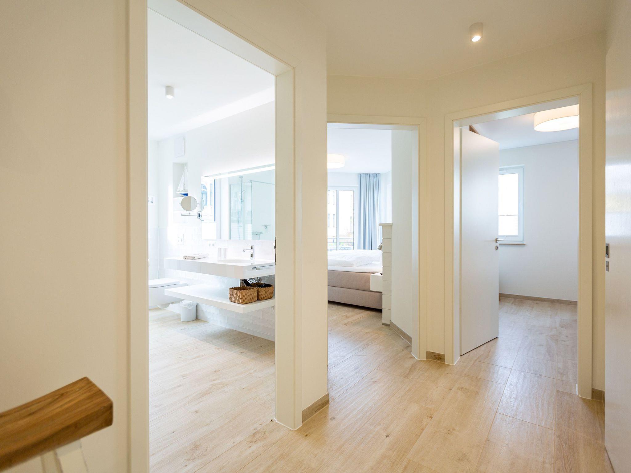 Neu gebaut, modern, exklusiv ? das ist das Quartier Eichenweg in Heringsdorf. Außergewöhnlich und ausgewählt eingerichtet und mit allem Wohnkomfort ausgestattet, den man sich für eine entspannte Urlaubsauszeit nur wünschen kann, entbehrt das wunderschöne Appartementhaus zudem nicht des Charmes der umliegenden Bädervillen. Die Ostsee in unmittelbarer Nähe, rauschen die Wellen bei Nordost bis in jedes Zimmer hinein. Die beste Untermalung für ein relaxtes Abschalten. Das stilvolle Äußere des Hauses, das sich angenehm in die benachbarten Villen einpasst, setzt sich im Inneren mit eleganten und schicken Urlaubsdomizilen fort. Jede Wohnung besitzt einen Balkon oder eine Terrasse. Die zumeist offenen Wohnküchen sind mit hochwertigen Markengeräten ausgestattet. Die Bäder verfügen über eine eigene kleine Sauna und für jedes Appartement ist auf dem Gelände ein Stellplatz reserviert. Alle oberen Wohnungen sind bequem mit dem Aufzug erreichbar.