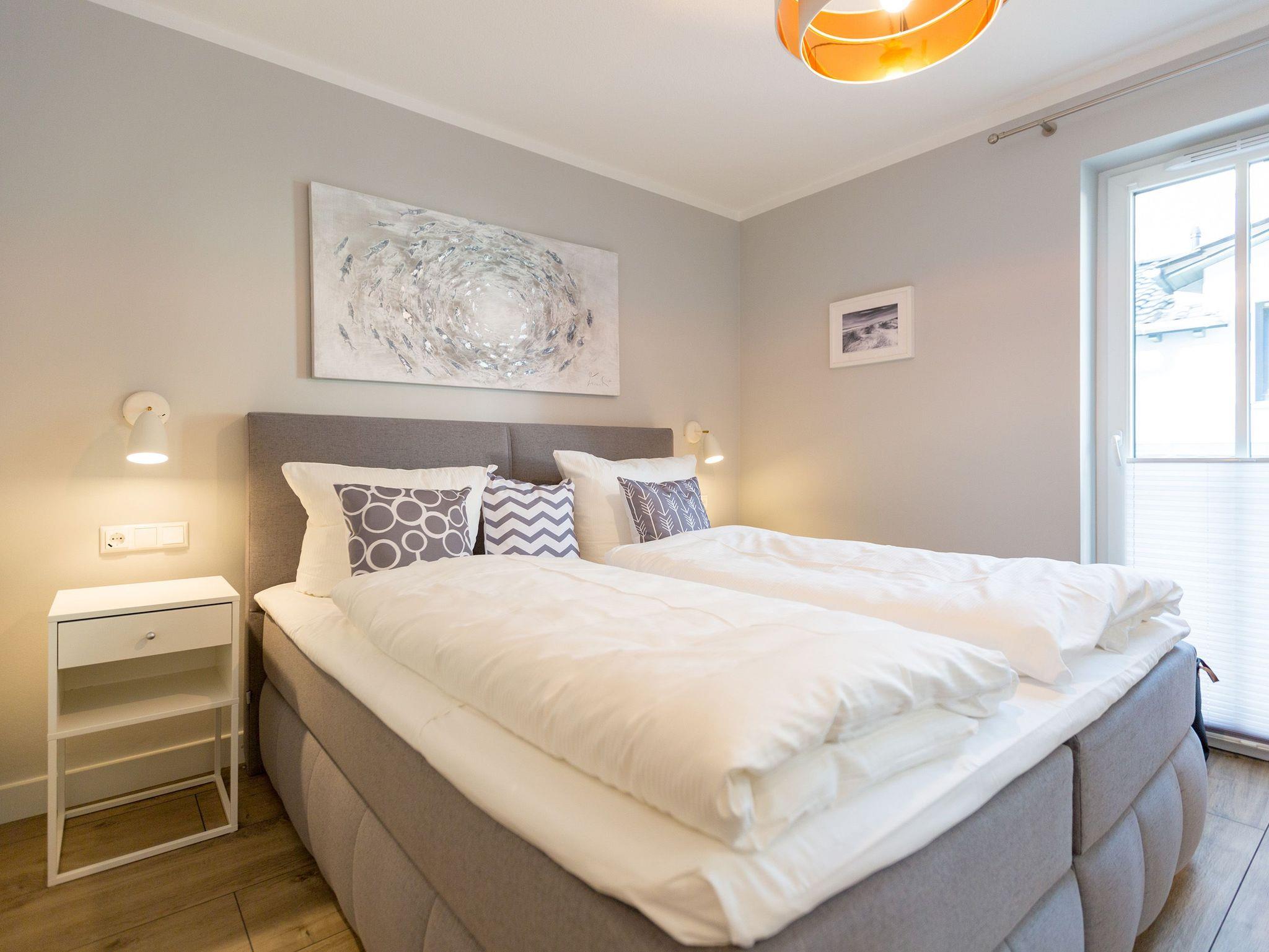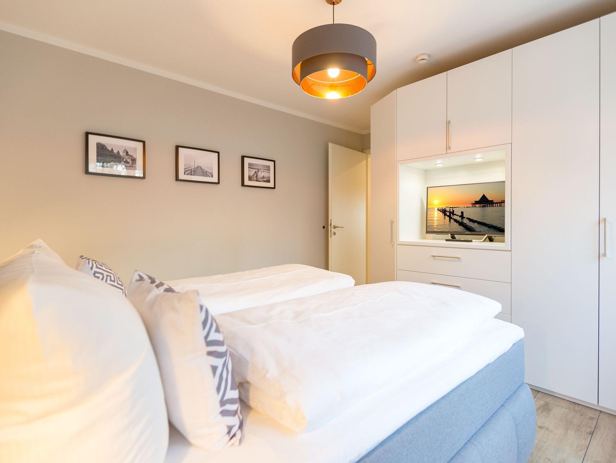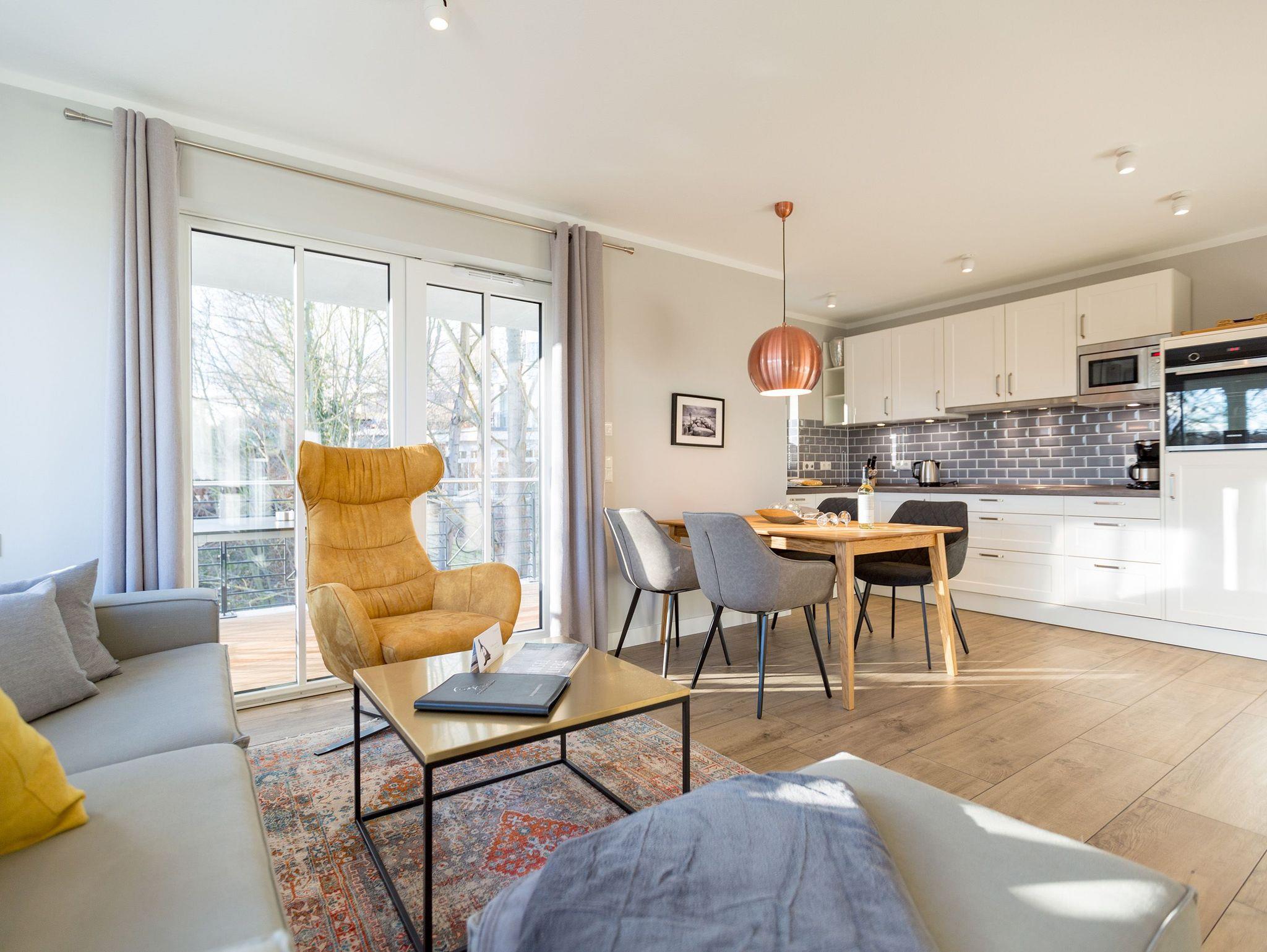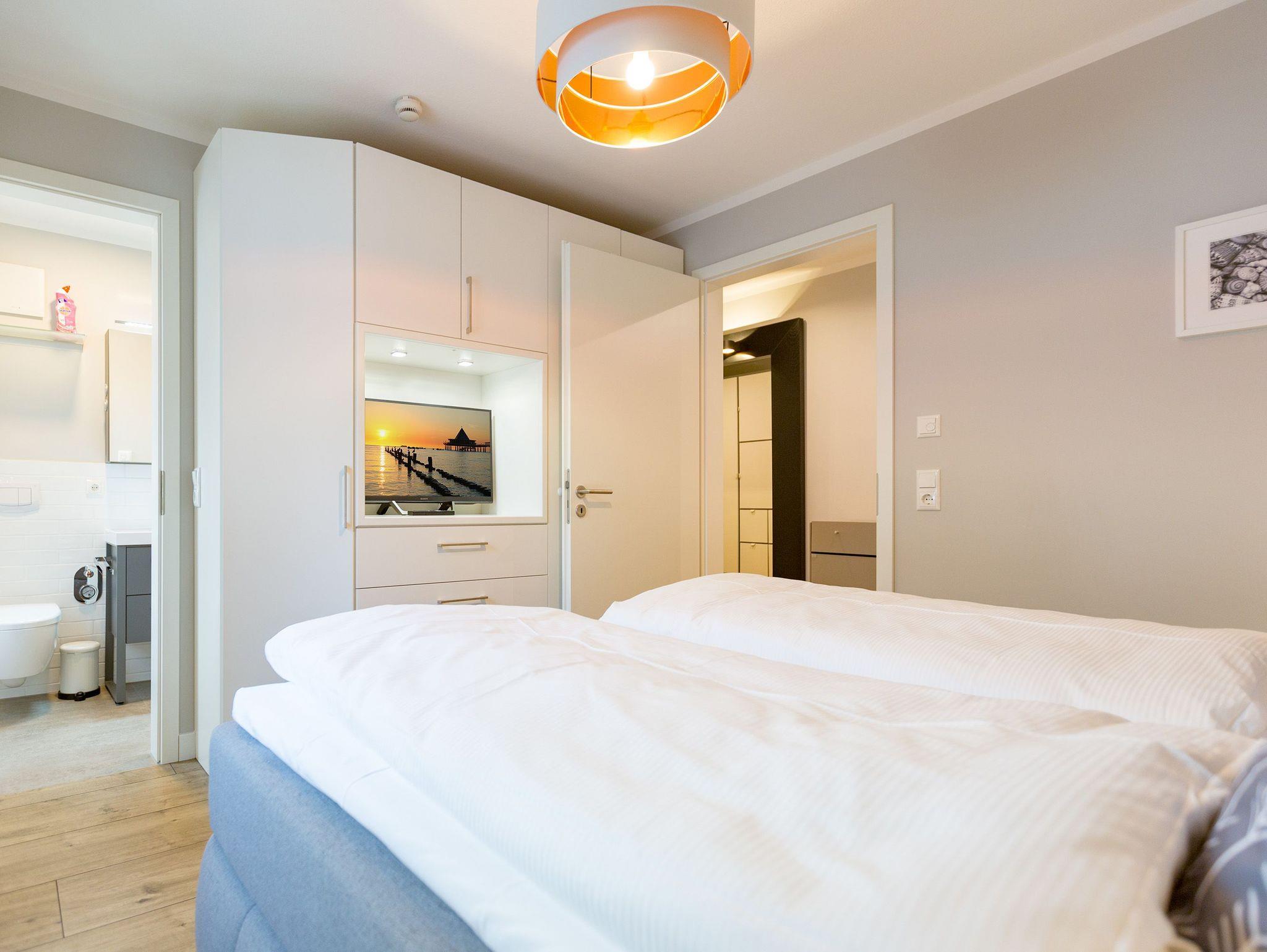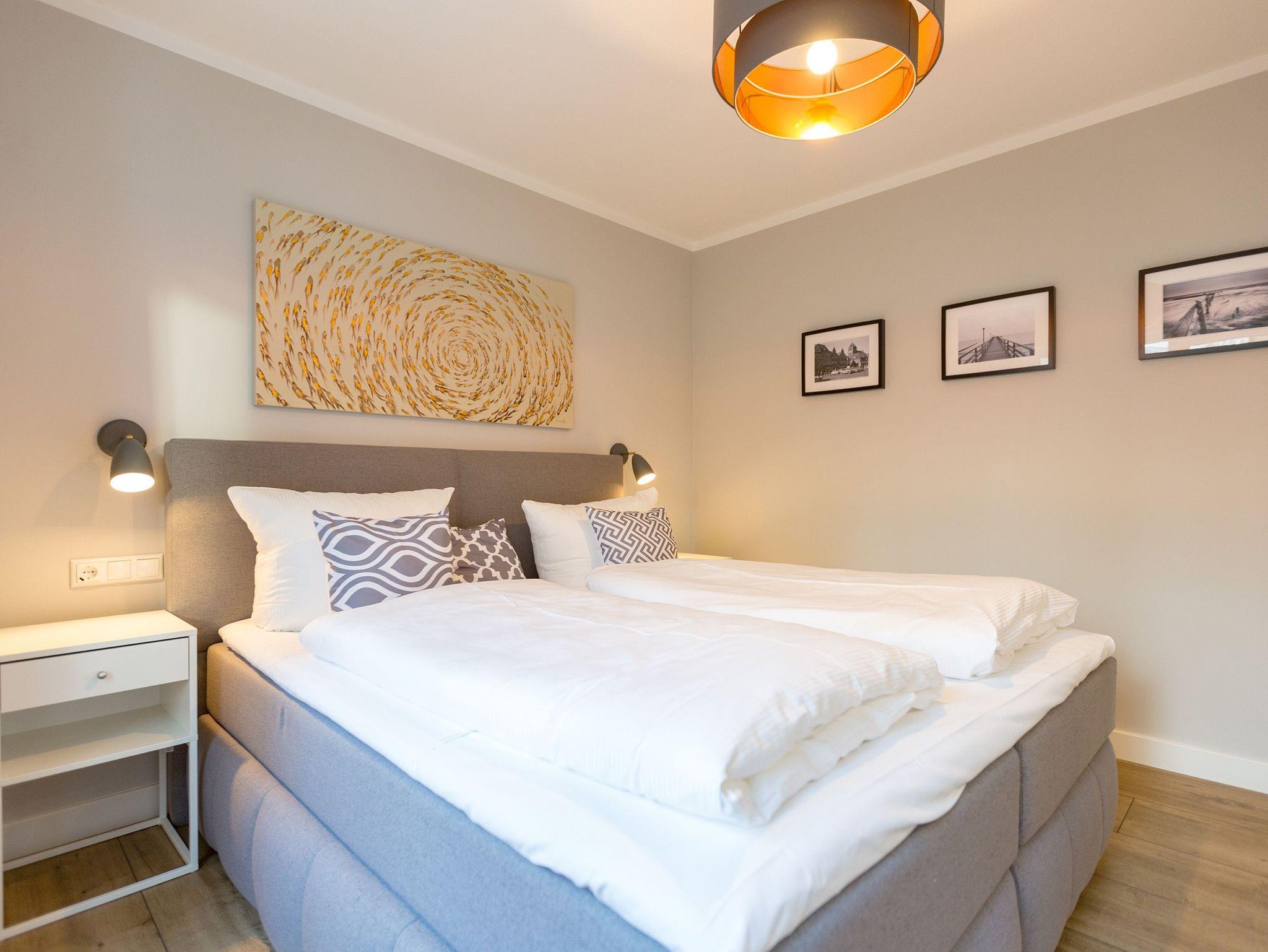 Ausgestattet mit zwei schönen Balkonen in Südost- und Südwest-Ausrichtung besticht das stylische Urlaubsappartement Nummer 4 im 1. Stock in seinen drei Zimmern mit viel Platz und einer hochwertigen, harmonisch aufeinander abgestimmten Einrichtung. Bis zu vier Personen und einem Kleinkind bis 3 Jahre (im Kinderreisebett) wird sie zum idealen Ausgangspunkt für eine entspannte Ostsee-Auszeit. Das Appartement ist dank seiner Ausrichtung von der Sonne verwöhnt. Hell und luftig wirken das Wohn-Esszimmer und die beiden Schlafzimmer. Warme Farbakzente bei den Accessoires und den Möbeln lockern die Atmosphäre auf. Unbedingt ausprobieren, sollten Sie die entspannende Wirkung des echten Kaminofens. Vom Sofa oder aus dem stylischen Ohrensessel haben Sie einen idealen Blick auf das Flammenspiel. Aber auch auf den großen Flat-TV. Über WLAN-Radio können Sie Ihre Lieblingsmusik laufen lassen. Ein schöner Holztisch und vier bequeme Sessel laden zu gemeinsamen Schlemmerstunden ein. In der zum Wohnzimmer offenen Küche finden Sie alles Nötige zum Kochen und für die Zubereitung der Mahlzeiten. Ob Geschirrspüler, Herd oder Kaffeemaschine ? alle Geräte sind modern und von namhaften Herstellern. In den Hängeschränken finden Sie ausgesuchtes Design-Geschirr. In den beiden Schlafzimmern warten zwei bequeme Boxspringdoppelbetten (1,80 m x 2,00 m) nur darauf, Ihnen auch des Nachts Vergnügen zu bereiten. Geräumige Schränke bieten viel Ablageflächen. Jedes Schlafzimmer ist mit einem Flat-TV ausgestattet. Freuen Sie sich auch auf die beiden Bäder. Denn sie liegen mit ihrer Metro-Fliesenoptik voll im Trend. Ausgestattet mit Dusche, Waschtisch und WC beherbergt das Masterbad zudem eine Waschmaschine und eine kleine Wohlfühloase: eine Finnische Sauna. Freuen Sie sich darauf, dort an kühlen Tagen ordentlich ins Schwitzen zu kommen. Handtücher liegen für Sie bereit. Und auch die Betten sind bereits bezogen. Ihr Auto können Sie in der Tiefgarage abstellen.
