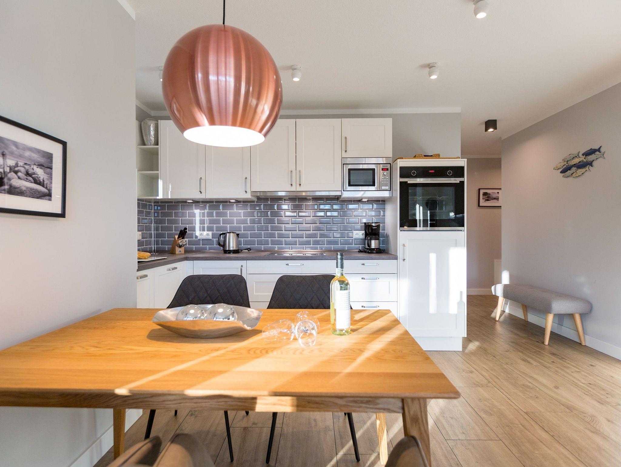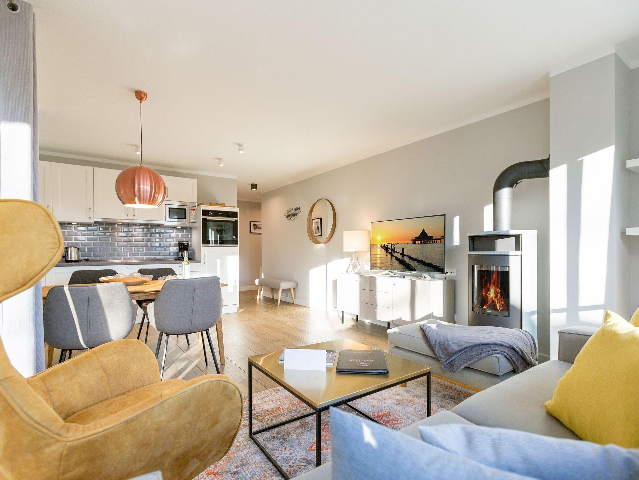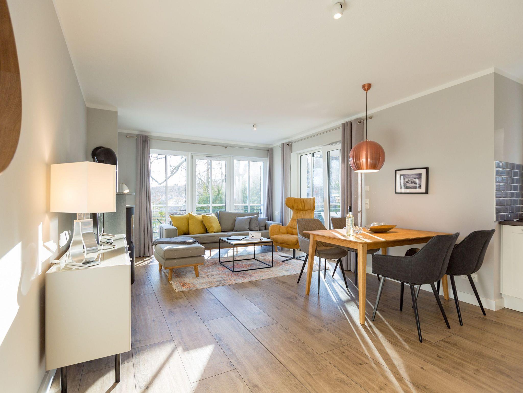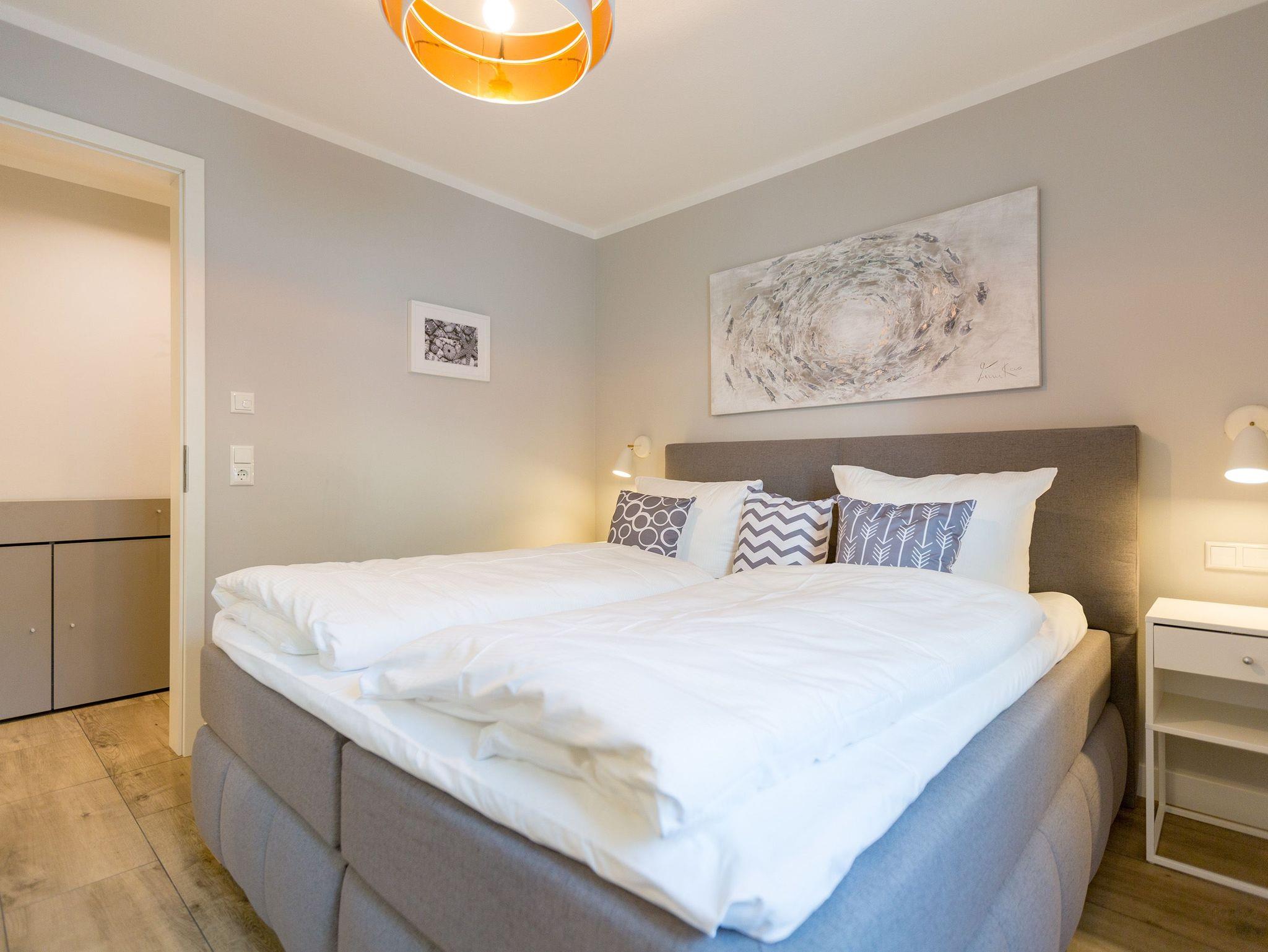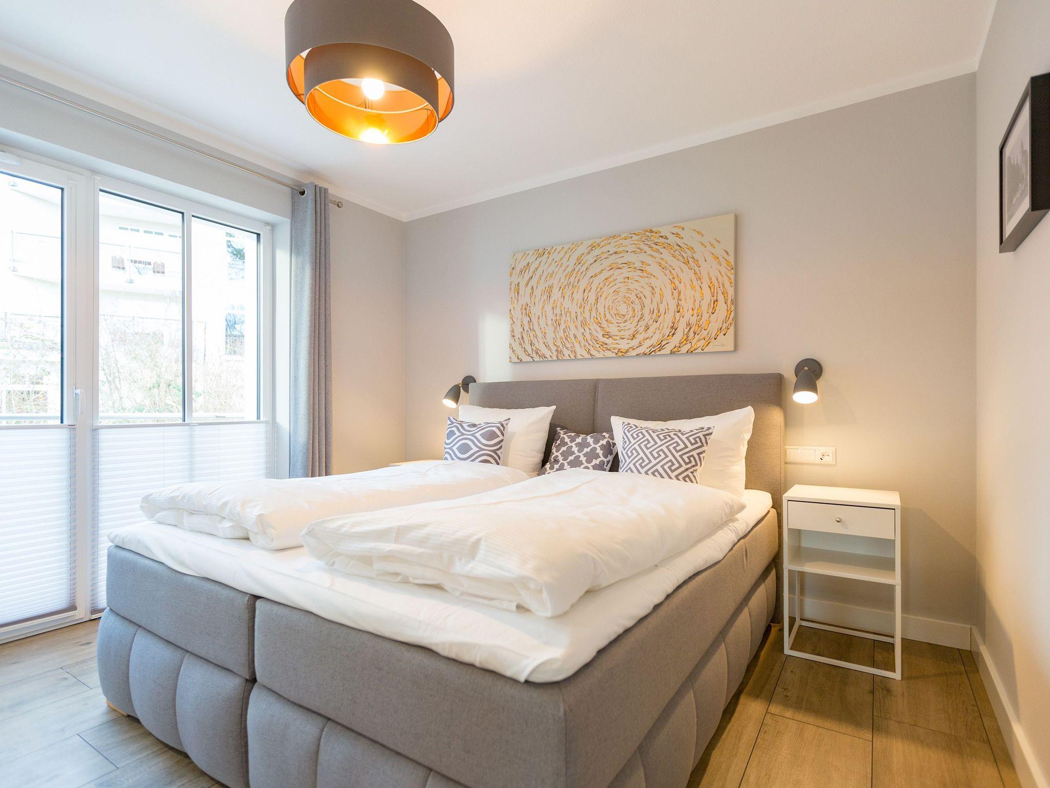 Ausgestattet mit zwei schönen Balkonen in Südost- und Südwest-Ausrichtung besticht das stylische Urlaubsappartement Nummer 4 im 1. Stock in seinen drei Zimmern mit viel Platz und einer hochwertigen, harmonisch aufeinander abgestimmten Einrichtung. Bis zu vier Personen und einem Kleinkind bis 3 Jahre (im Kinderreisebett) wird sie zum idealen Ausgangspunkt für eine entspannte Ostsee-Auszeit. Das Appartement ist dank seiner Ausrichtung von der Sonne verwöhnt. Hell und luftig wirken das Wohn-Esszimmer und die beiden Schlafzimmer. Warme Farbakzente bei den Accessoires und den Möbeln lockern die Atmosphäre auf. Unbedingt ausprobieren, sollten Sie die entspannende Wirkung des echten Kaminofens. Vom Sofa oder aus dem stylischen Ohrensessel haben Sie einen idealen Blick auf das Flammenspiel. Aber auch auf den großen Flat-TV. Über WLAN-Radio können Sie Ihre Lieblingsmusik laufen lassen. Ein schöner Holztisch und vier bequeme Sessel laden zu gemeinsamen Schlemmerstunden ein. In der zum Wohnzimmer offenen Küche finden Sie alles Nötige zum Kochen und für die Zubereitung der Mahlzeiten. Ob Geschirrspüler, Herd oder Kaffeemaschine ? alle Geräte sind modern und von namhaften Herstellern. In den Hängeschränken finden Sie ausgesuchtes Design-Geschirr. In den beiden Schlafzimmern warten zwei bequeme Boxspringdoppelbetten (1,80 m x 2,00 m) nur darauf, Ihnen auch des Nachts Vergnügen zu bereiten. Geräumige Schränke bieten viel Ablageflächen. Jedes Schlafzimmer ist mit einem Flat-TV ausgestattet. Freuen Sie sich auch auf die beiden Bäder. Denn sie liegen mit ihrer Metro-Fliesenoptik voll im Trend. Ausgestattet mit Dusche, Waschtisch und WC beherbergt das Masterbad zudem eine Waschmaschine und eine kleine Wohlfühloase: eine Finnische Sauna. Freuen Sie sich darauf, dort an kühlen Tagen ordentlich ins Schwitzen zu kommen. Handtücher liegen für Sie bereit. Und auch die Betten sind bereits bezogen. Ihr Auto können Sie in der Tiefgarage abstellen.