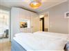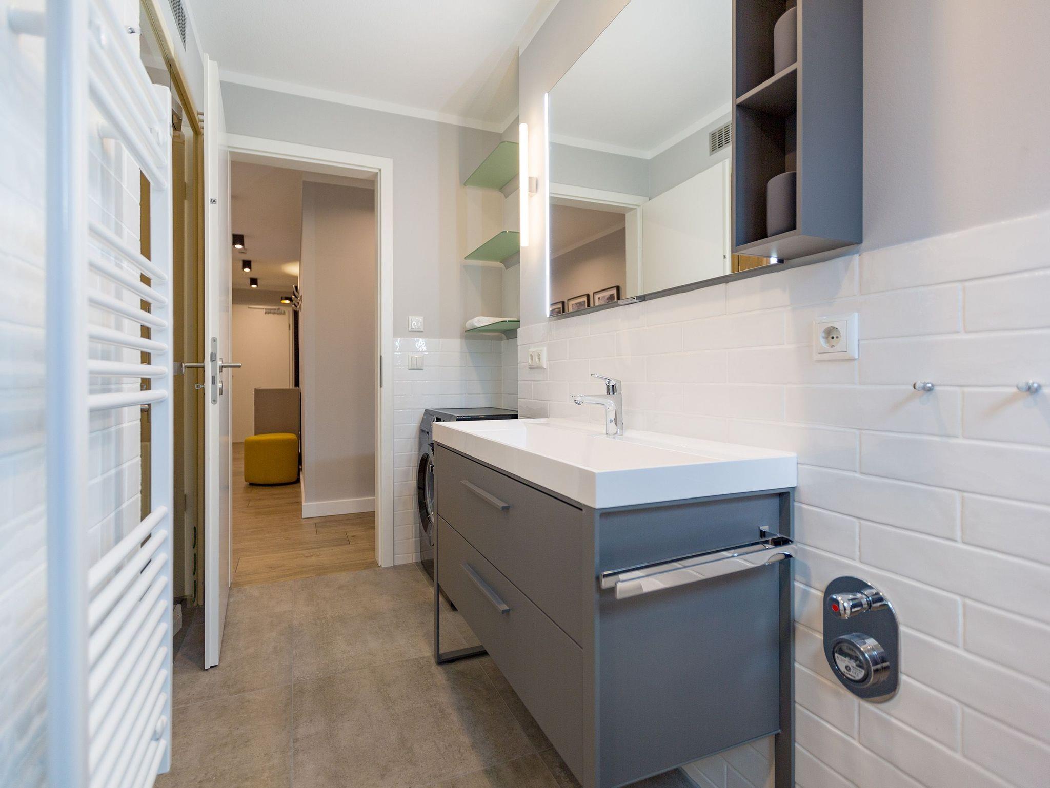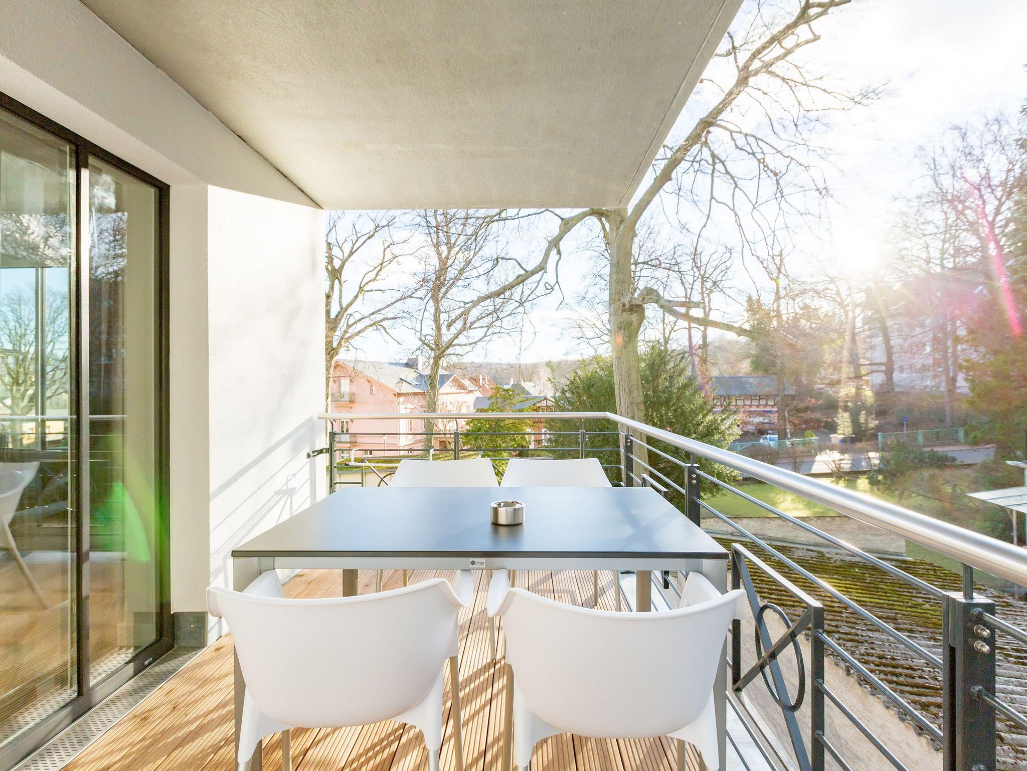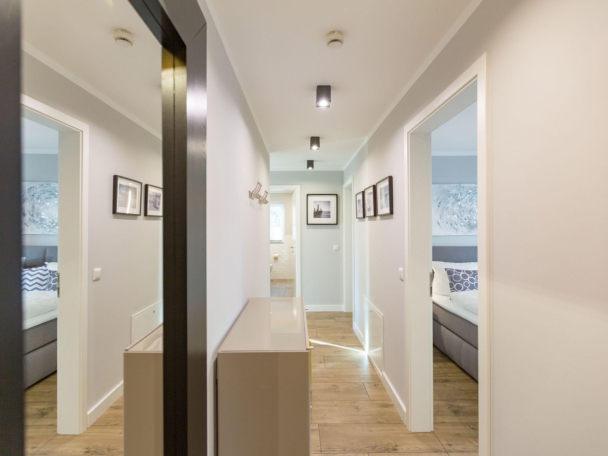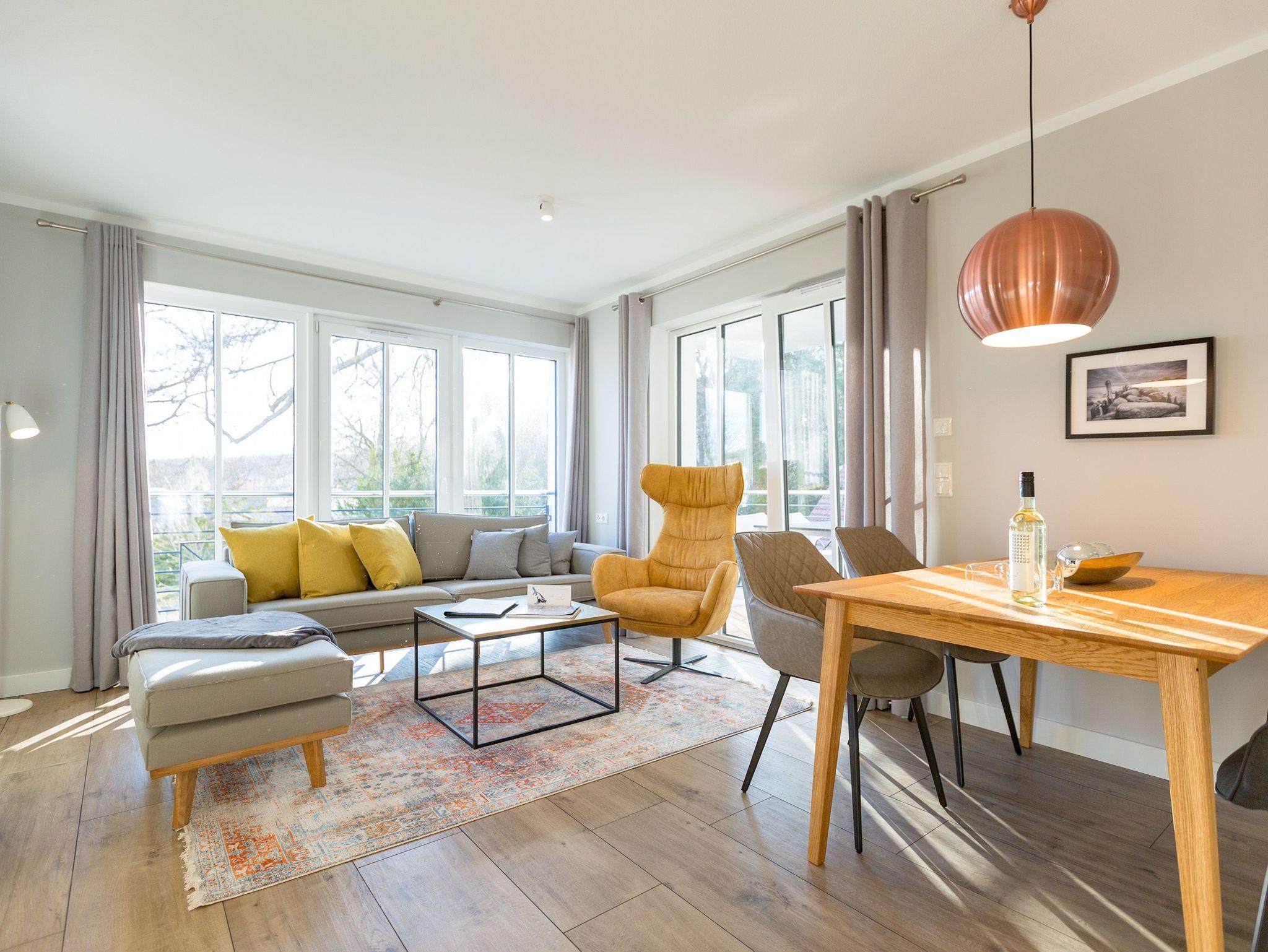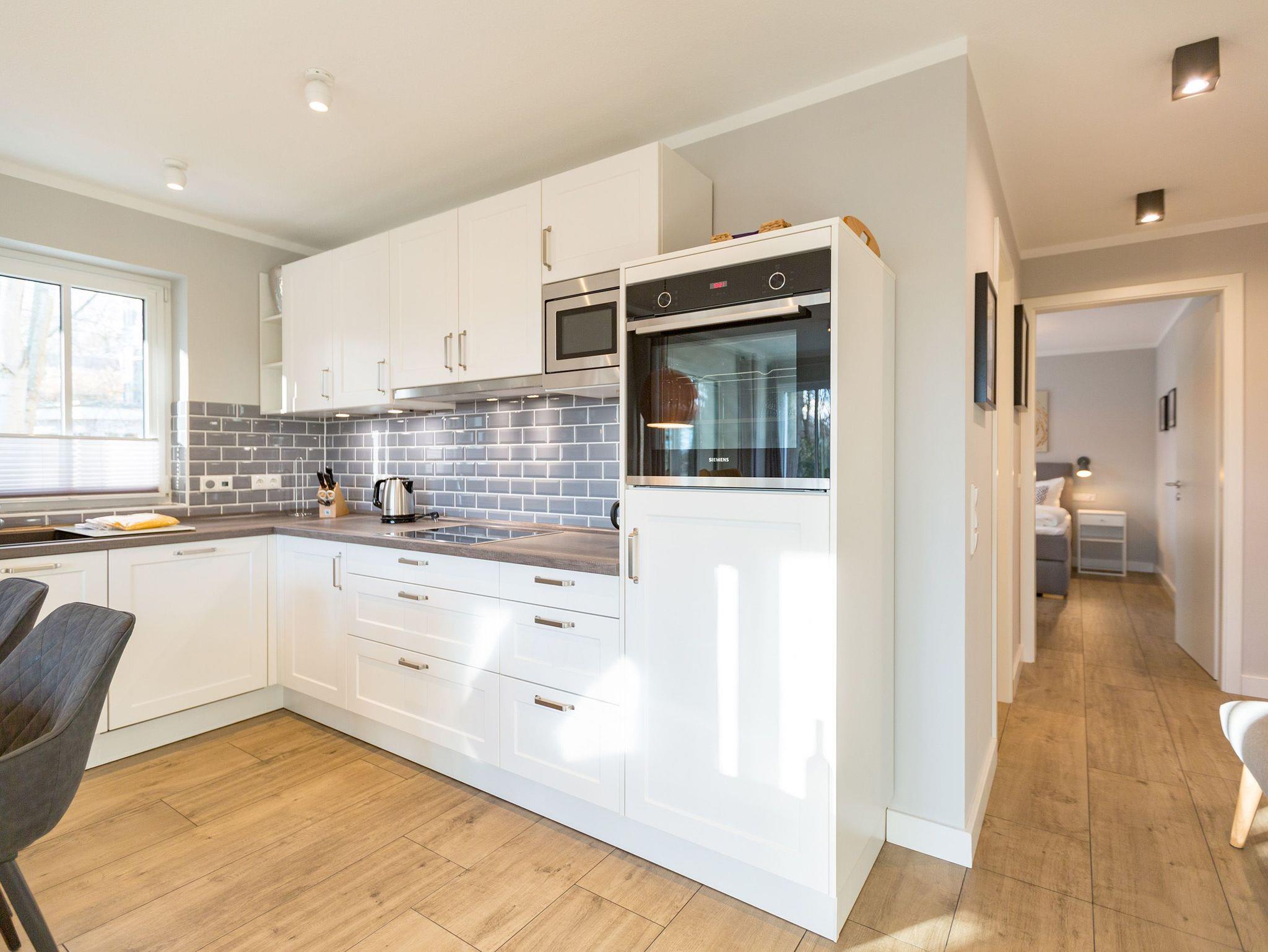 Ausgestattet mit zwei schönen Balkonen in Südost- und Südwest-Ausrichtung besticht das stylische Urlaubsappartement Nummer 4 im 1. Stock in seinen drei Zimmern mit viel Platz und einer hochwertigen, harmonisch aufeinander abgestimmten Einrichtung. Bis zu vier Personen und einem Kleinkind bis 3 Jahre (im Kinderreisebett) wird sie zum idealen Ausgangspunkt für eine entspannte Ostsee-Auszeit. Das Appartement ist dank seiner Ausrichtung von der Sonne verwöhnt. Hell und luftig wirken das Wohn-Esszimmer und die beiden Schlafzimmer. Warme Farbakzente bei den Accessoires und den Möbeln lockern die Atmosphäre auf. Unbedingt ausprobieren, sollten Sie die entspannende Wirkung des echten Kaminofens. Vom Sofa oder aus dem stylischen Ohrensessel haben Sie einen idealen Blick auf das Flammenspiel. Aber auch auf den großen Flat-TV. Über WLAN-Radio können Sie Ihre Lieblingsmusik laufen lassen. Ein schöner Holztisch und vier bequeme Sessel laden zu gemeinsamen Schlemmerstunden ein. In der zum Wohnzimmer offenen Küche finden Sie alles Nötige zum Kochen und für die Zubereitung der Mahlzeiten. Ob Geschirrspüler, Herd oder Kaffeemaschine ? alle Geräte sind modern und von namhaften Herstellern. In den Hängeschränken finden Sie ausgesuchtes Design-Geschirr. In den beiden Schlafzimmern warten zwei bequeme Boxspringdoppelbetten (1,80 m x 2,00 m) nur darauf, Ihnen auch des Nachts Vergnügen zu bereiten. Geräumige Schränke bieten viel Ablageflächen. Jedes Schlafzimmer ist mit einem Flat-TV ausgestattet. Freuen Sie sich auch auf die beiden Bäder. Denn sie liegen mit ihrer Metro-Fliesenoptik voll im Trend. Ausgestattet mit Dusche, Waschtisch und WC beherbergt das Masterbad zudem eine Waschmaschine und eine kleine Wohlfühloase: eine Finnische Sauna. Freuen Sie sich darauf, dort an kühlen Tagen ordentlich ins Schwitzen zu kommen. Handtücher liegen für Sie bereit. Und auch die Betten sind bereits bezogen. Ihr Auto können Sie in der Tiefgarage abstellen.