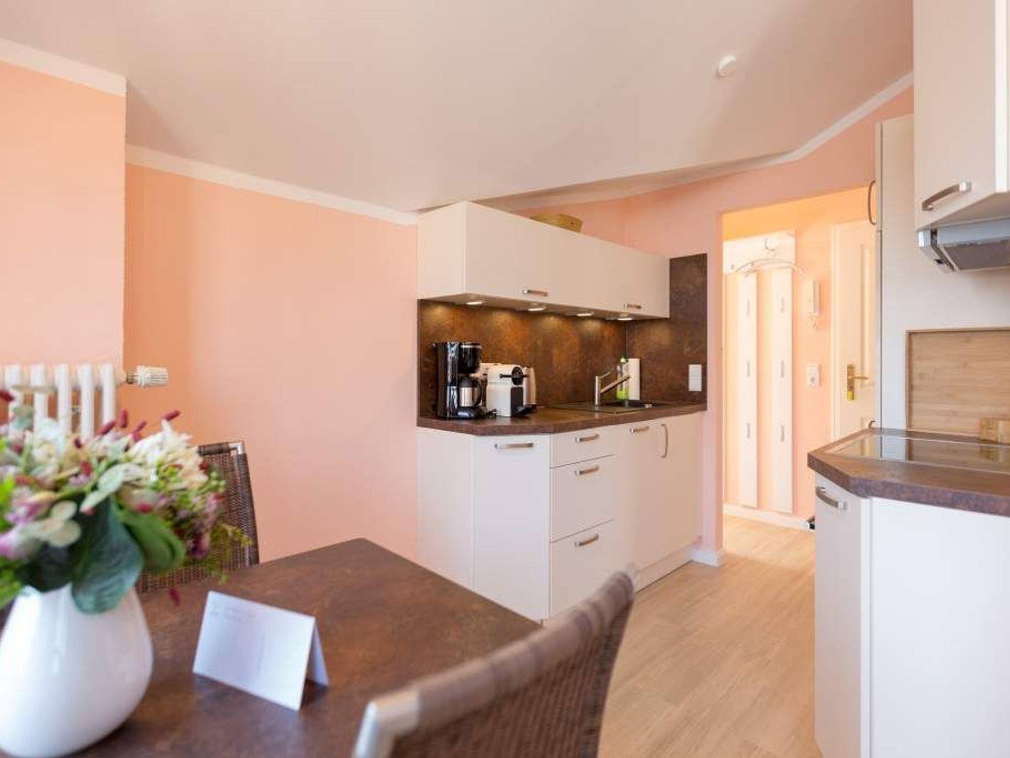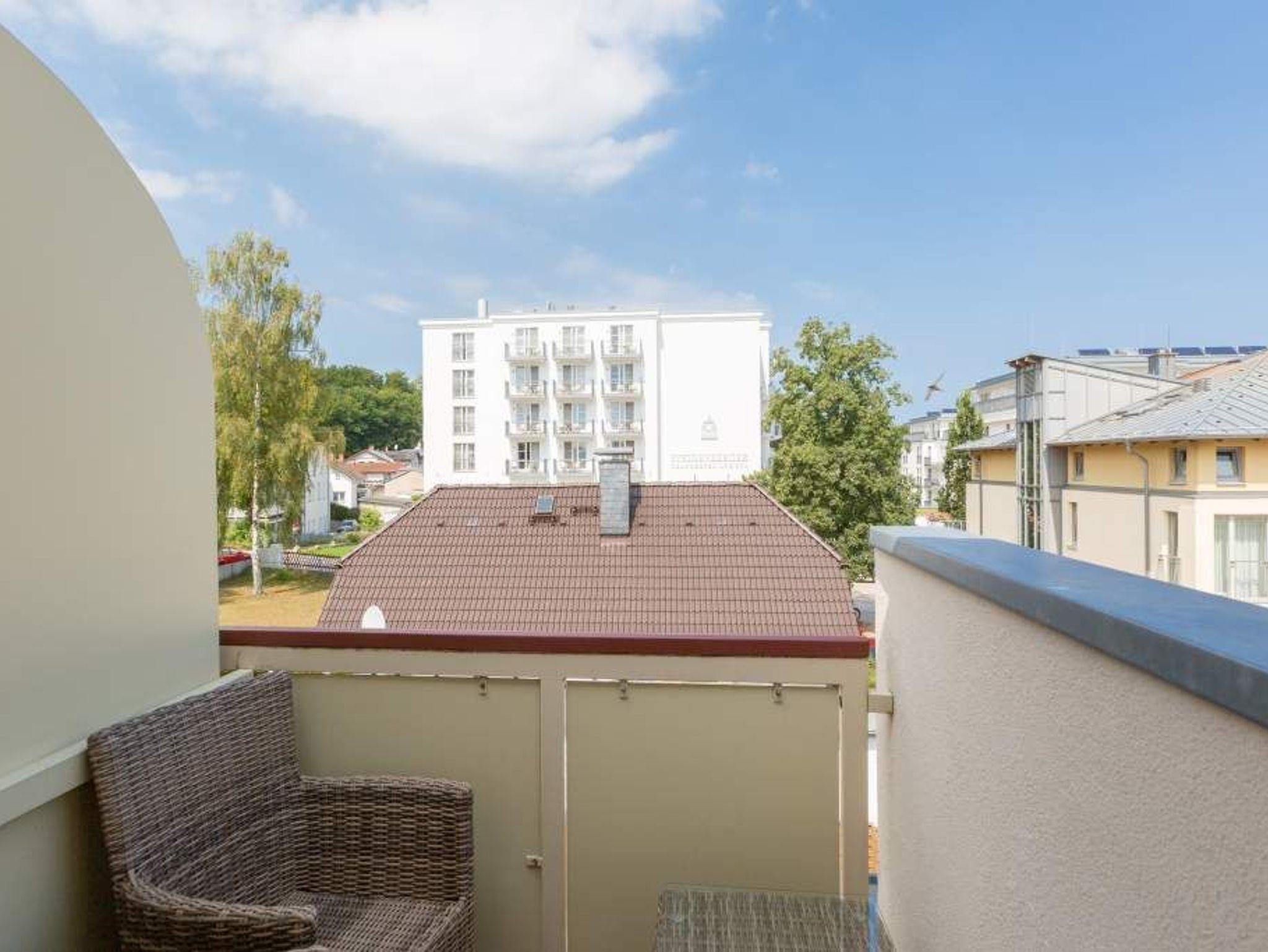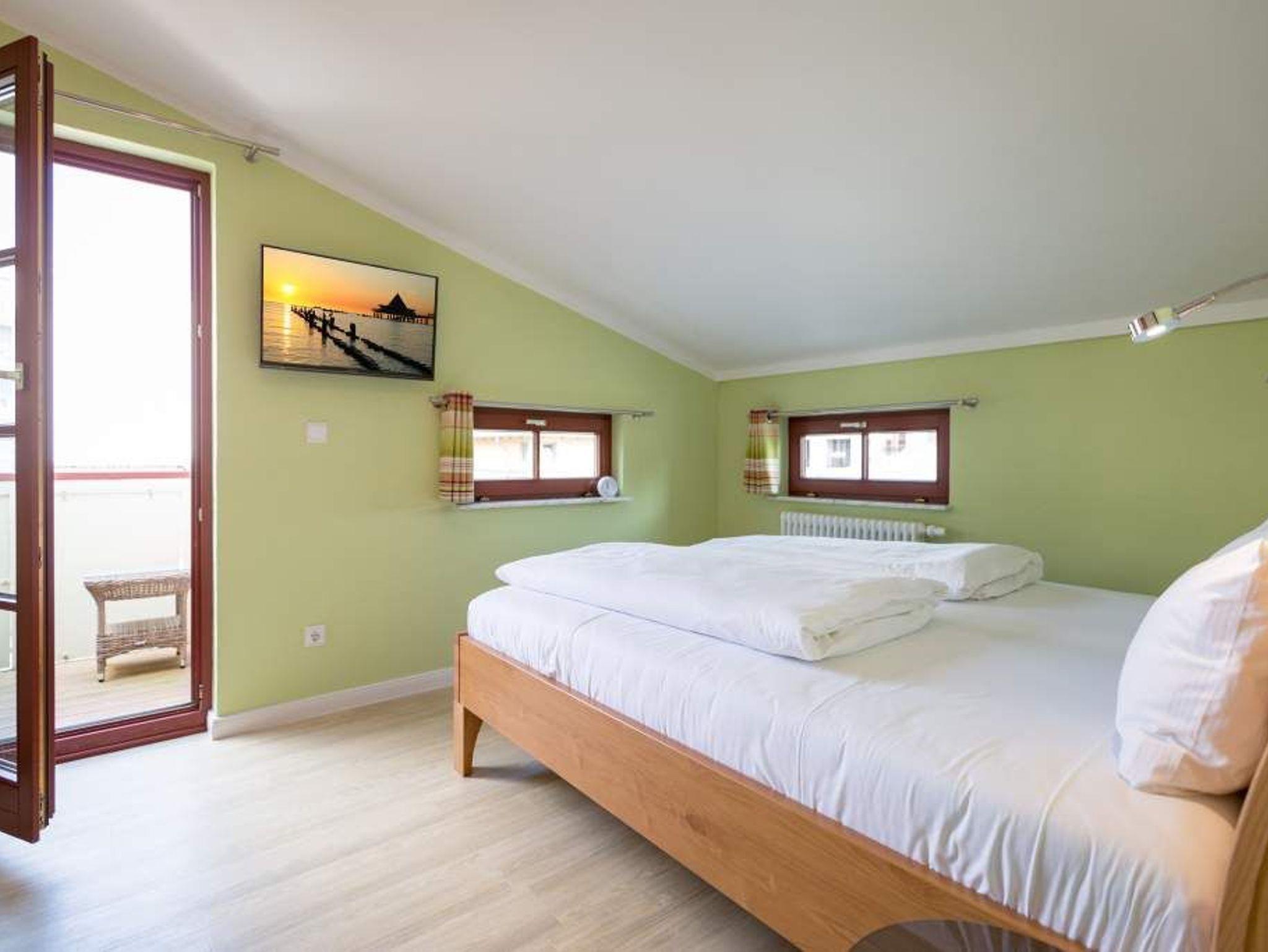 Diese stilvolle und elegante Ferienwohnung direkt unter dem Dach der Villa Damaris wartet gleich mit drei Balkonen auf. Und sie alle geben einen Blick auf die mit viel Grün und wunderschönen alten Bädervillen versehene Umgebung frei. Hier können Sie schon morgens Sonne tanken und die salzige Ostseeluft tief in sich einatmen. Das kleine, urgemütliche Urlaubsreich unter Dachschrägen bietet auf seinen 60 Quadratmetern Platz für bis zu vier Personen und ein Kleinkind (im Kinderreisebett). Das offene Wohn-Esszimmer ist großzügig geschnitten und durch die große Fensterfront, die hinaus auf einen der drei Balkone führt, wunderbar luftig und hell. Ein harmonisches Farbkonzept und eine stilvolle Einrichtung sorgen für eine entspannte Urlaubsatmosphäre. Auf der roten Sofalandschaft erhält der Begriff Behaglichkeit eine neue Bedeutung. Denn sie eignet sich ideal zum Runterkommen und Entspannen. Das Zimmer verfügt über einen großen Flat-TV. Am schönen Essplatz lässt es sich ausgiebig schlemmen, spielen oder plaudern. Für die Zubereitung der Speisen findet sich alles Notwendige in der offenen und voll ausgestatteten Küche. Jedes der beiden Schlafzimmer verfügt über ein bequemes Doppelbett, einen geräumigen Kleiderschrank und einen eigenen kleinen Balkon. Eines der beiden Zimmer hat auch einen Flat-TV. Im Bad stehen Ihnen ein Waschtisch und ein WC zur Verfügung. Die ebenerdige Regendusche ist so groß, dass Sie darin bequem zu Zweit Duschspaß haben können. In der Wohnung gibt es WLAN, das Sie kostenfrei nutzen dürfen. Damit der Urlaub rundum sorgenfrei ist, haben wir die Betten bei Ihrer Ankunft schon bezogen und Handtücher liegen bereit. Am haus befindet sich zudem ein Pkw-Stellplatz.