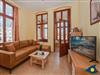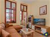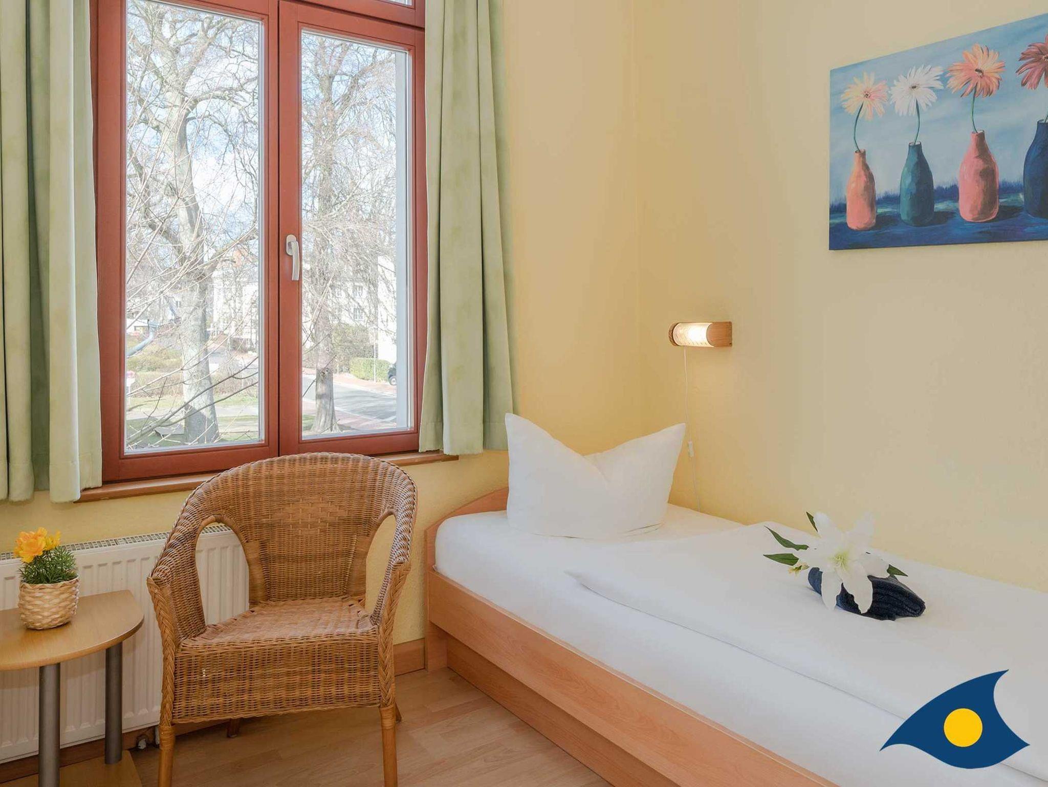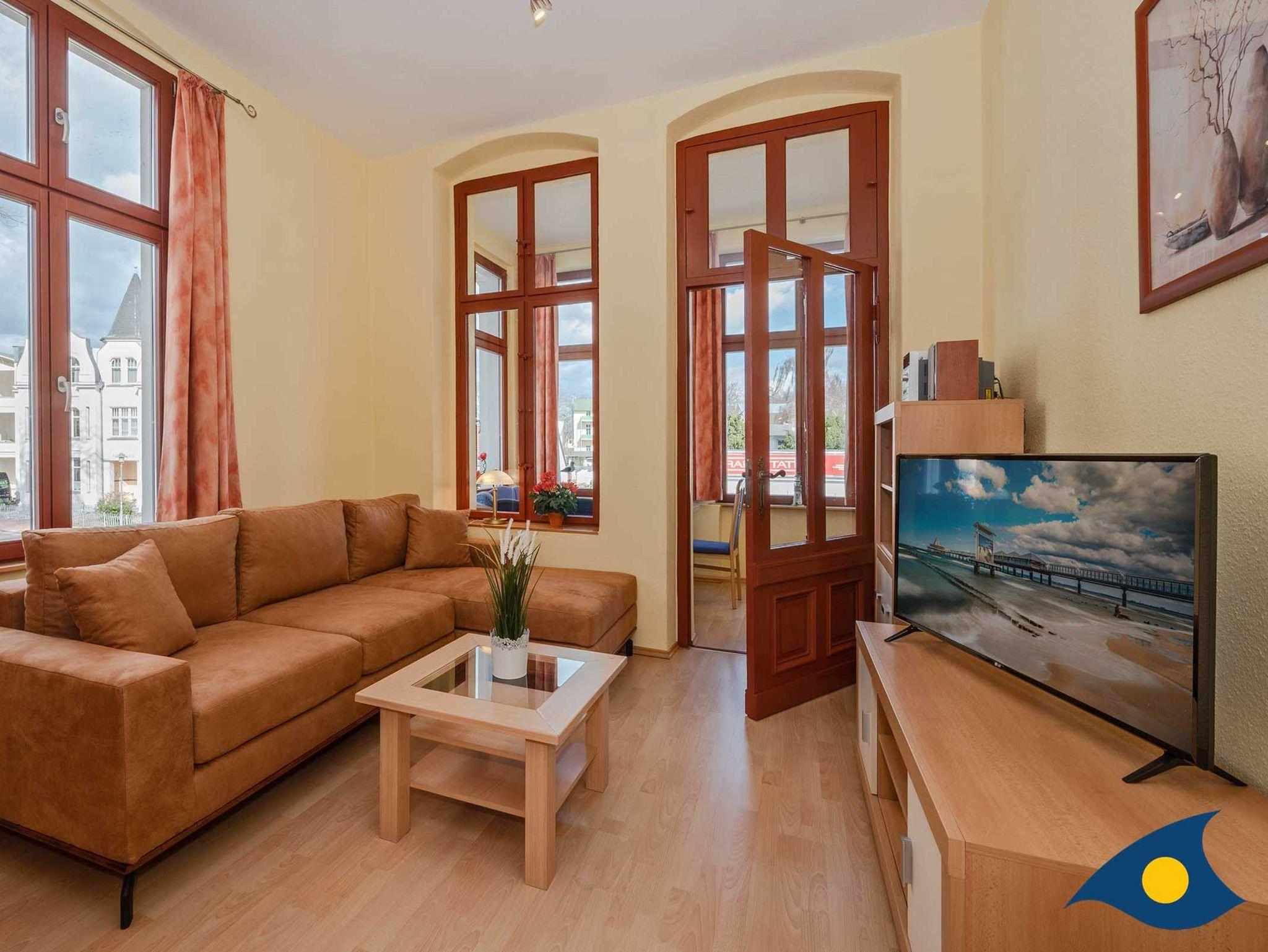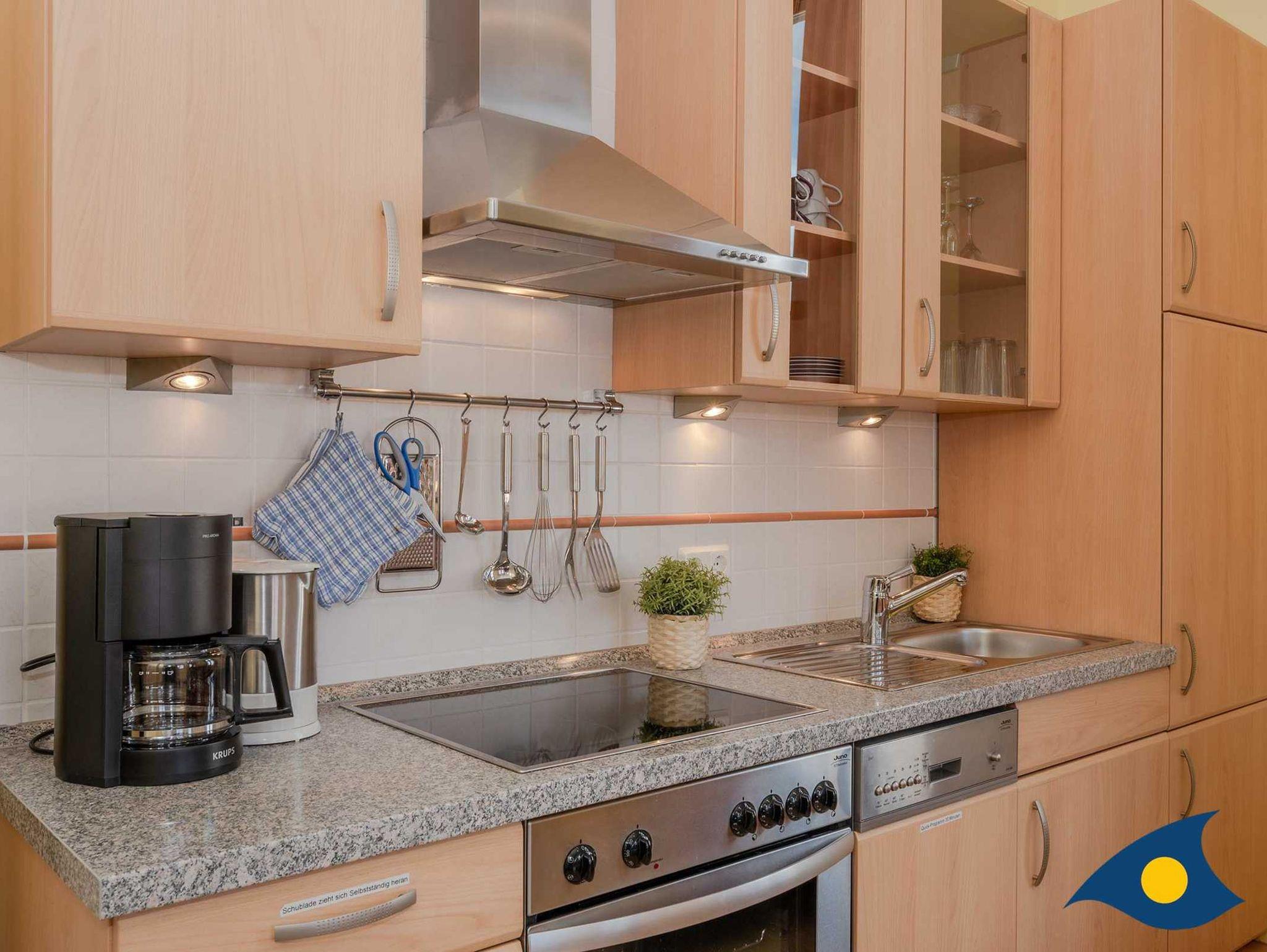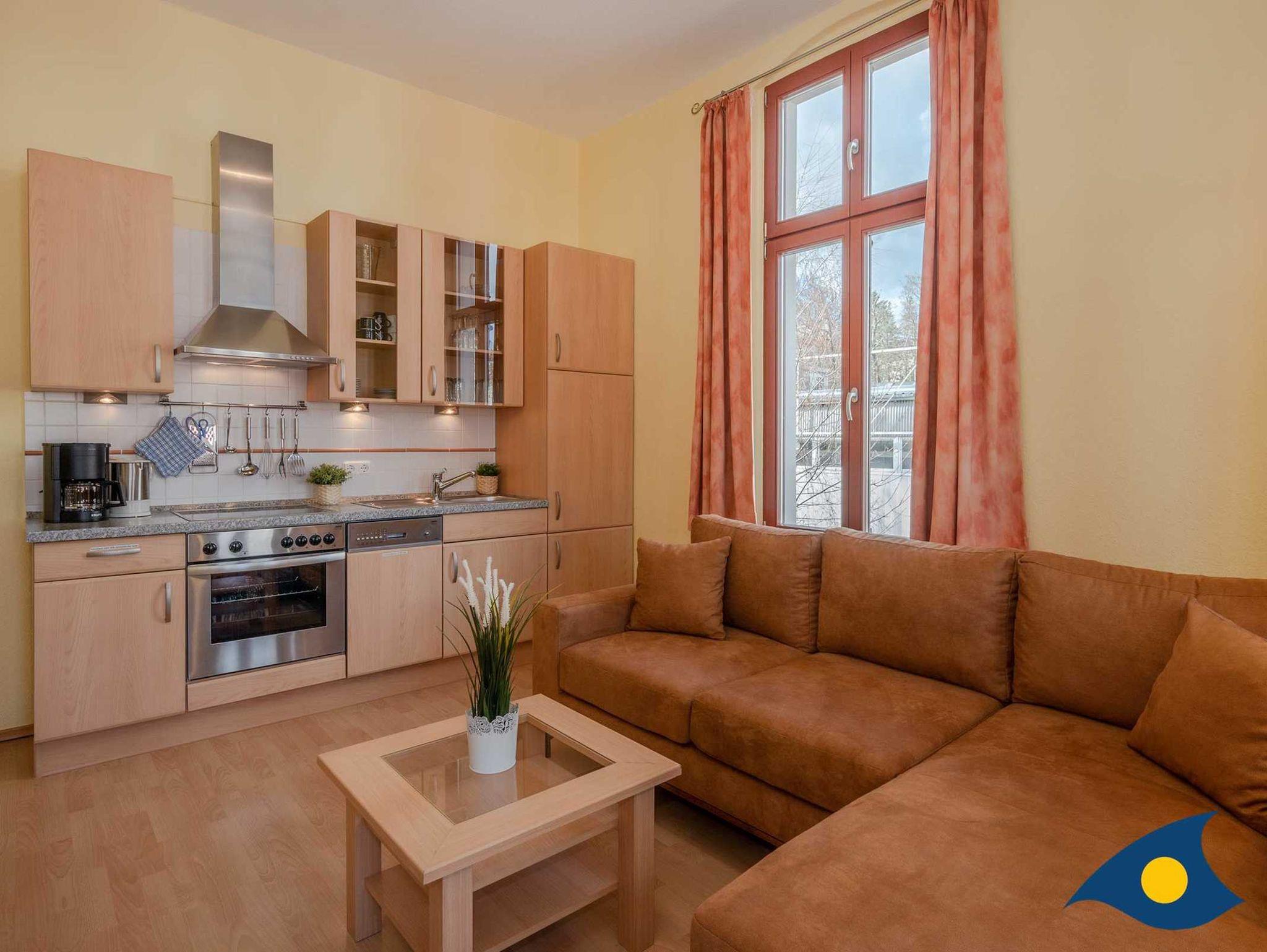 Das gemütliche 3-Raum-Appartement in der 1. Etage des Hauses bietet Ihnen alles, was Sie für einen erholsamen Urlaub mit bis zu 4 Personen benötigen. Das Wohnzimmer verfügt über ein gemütliches Sofa und lädt zum gemeinsamen Relaxen ein. Die Küchenzeile ist im Wohnbereich integriert und stellt für Sie eine Spülmaschine, einen Backofen und einen Kühlschrank mit Gefrierfach bereit.