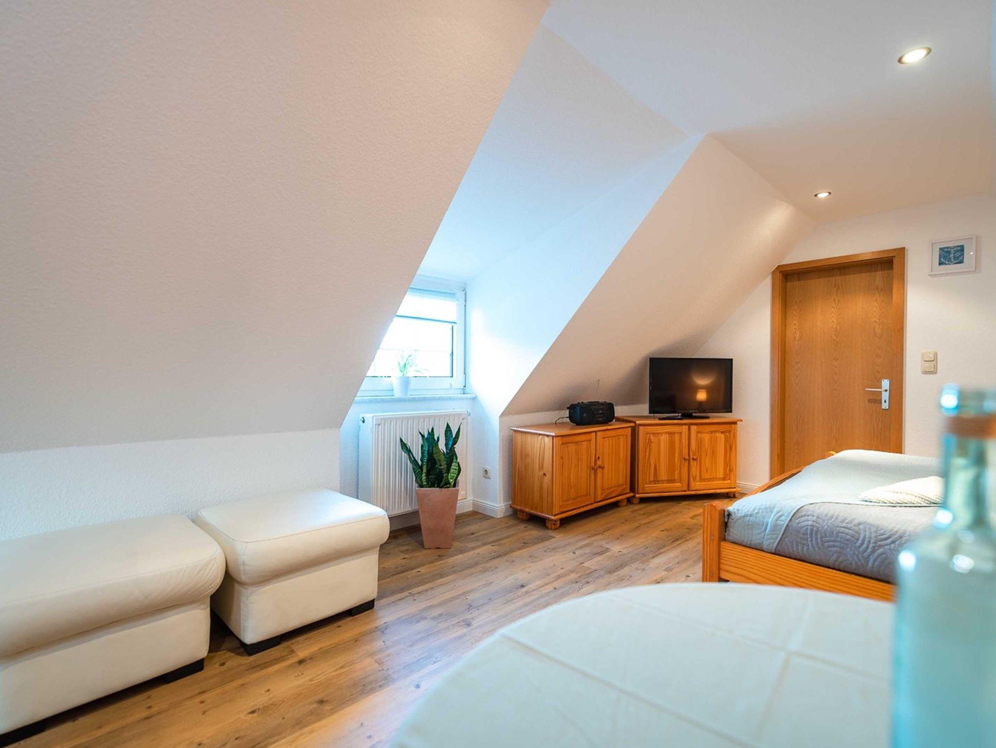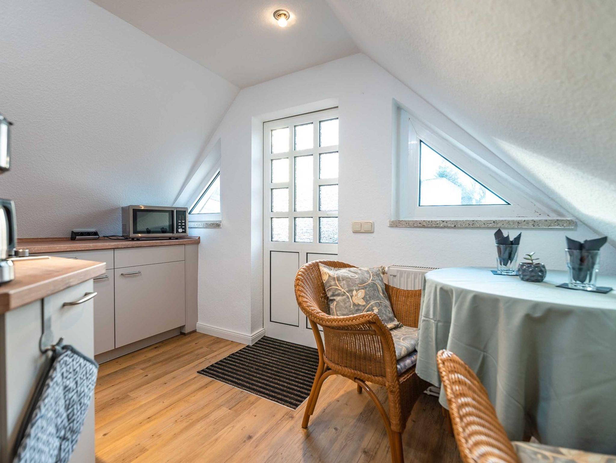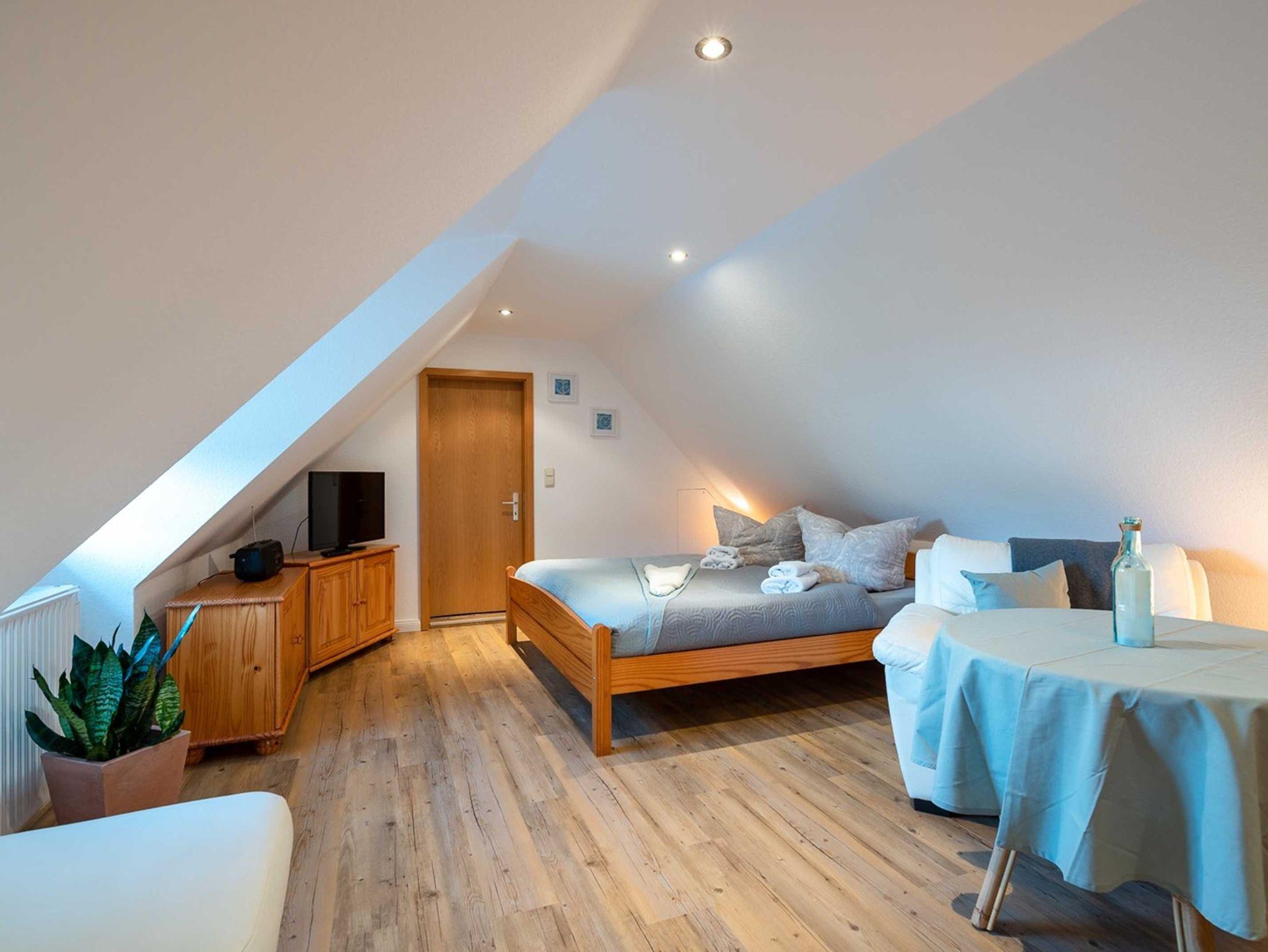 Die 28 qm große Ein-Raum-Ferienwohung befindet sich im ersten Oberschoss und verfügt über einen großen möblierten Balkon. Die Wohnung ist mit einer Pantry-Küche mit zwei Herdplatten, Mikrowelle und Kühlschrank und einem kleinen Essplatz sowie ein kombiniertes Wohn- und Schlafzimmer mit Doppelbett, gemütlicher Sitzecke, TV und Kleiderschrank ausgestattet. Bad mit Dusche und WC. Die Wohnung ist für drei Personen (maximal zwei Erwachsene und ein kleines Kind) geeignet. Ein Kinderreisebett kann auf Wunsch zur Verfügung gestellt werden.