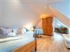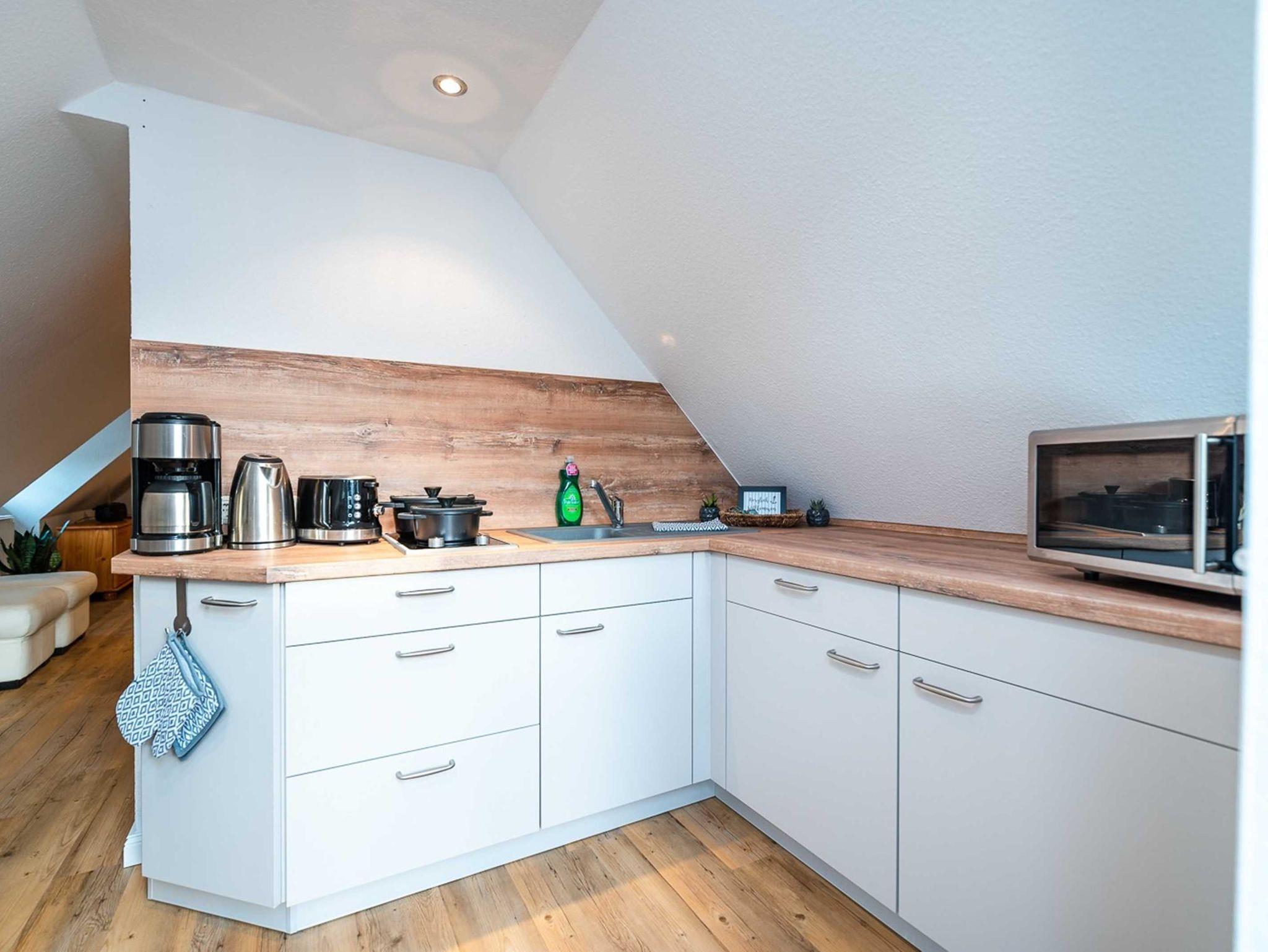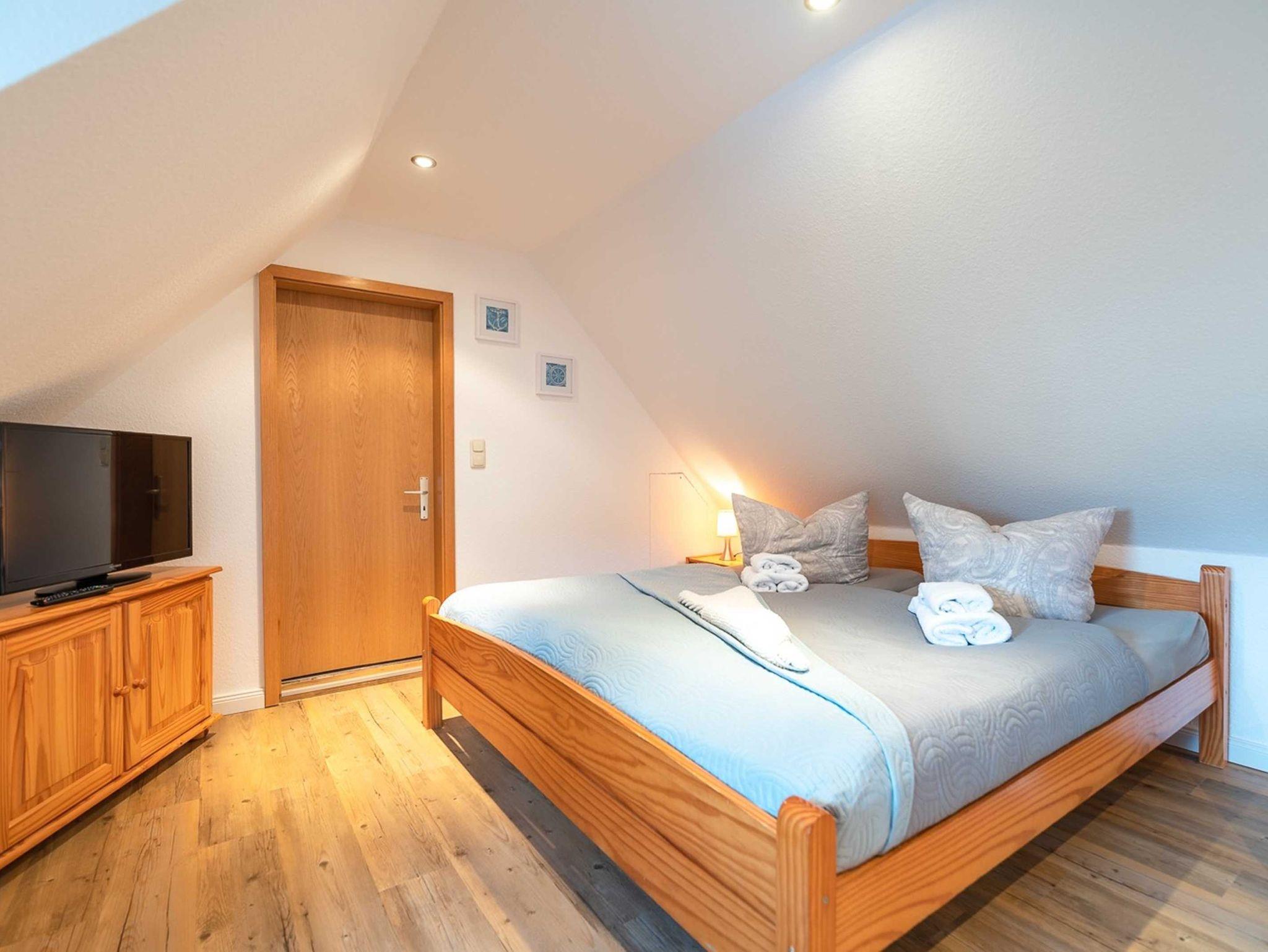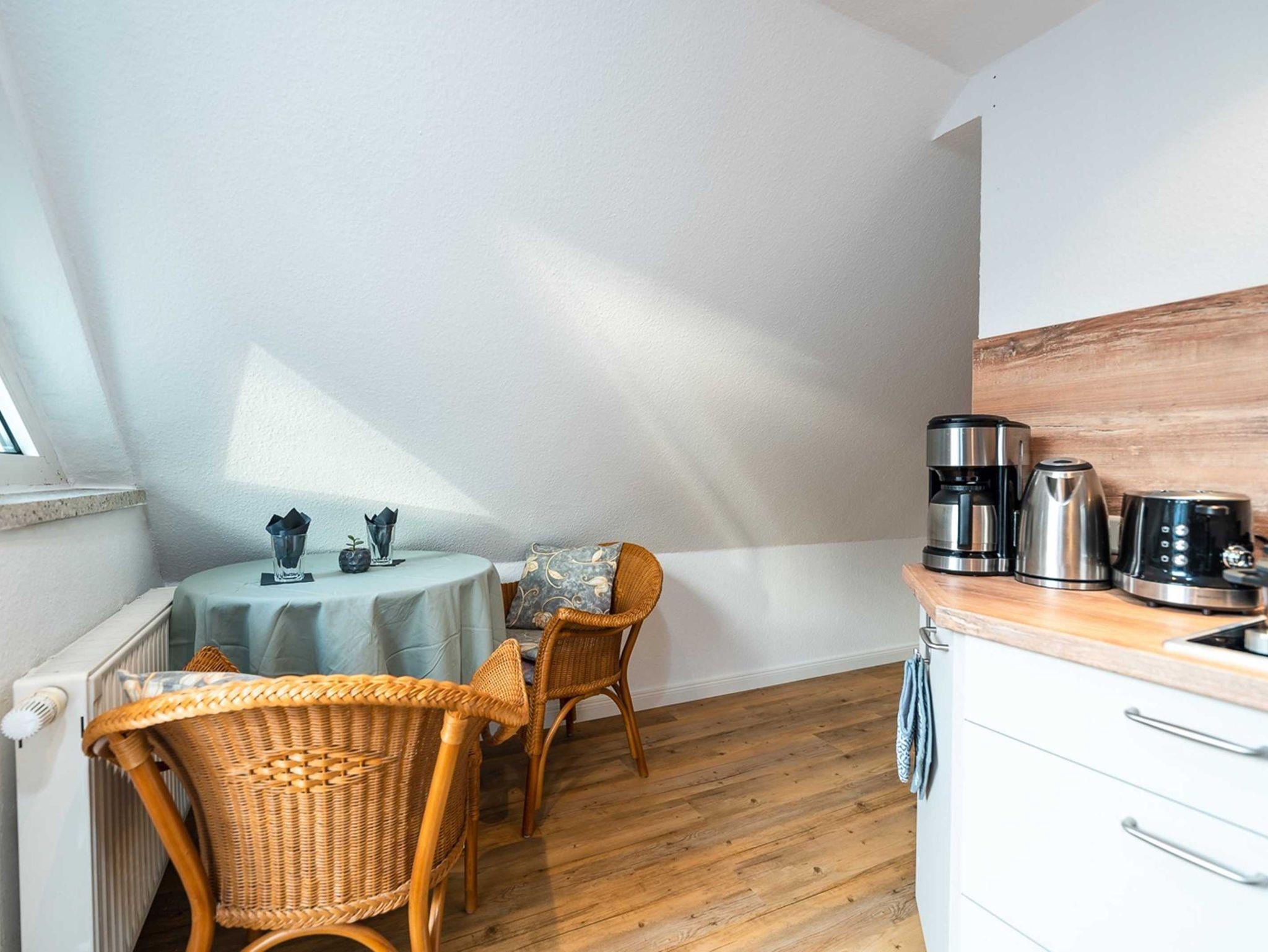 Die 28 qm große Ein-Raum-Ferienwohung befindet sich im ersten Oberschoss und verfügt über einen großen möblierten Balkon. Die Wohnung ist mit einer Pantry-Küche mit zwei Herdplatten, Mikrowelle und Kühlschrank und einem kleinen Essplatz sowie ein kombiniertes Wohn- und Schlafzimmer mit Doppelbett, gemütlicher Sitzecke, TV und Kleiderschrank ausgestattet. Bad mit Dusche und WC. Die Wohnung ist für drei Personen (maximal zwei Erwachsene und ein kleines Kind) geeignet. Ein Kinderreisebett kann auf Wunsch zur Verfügung gestellt werden.