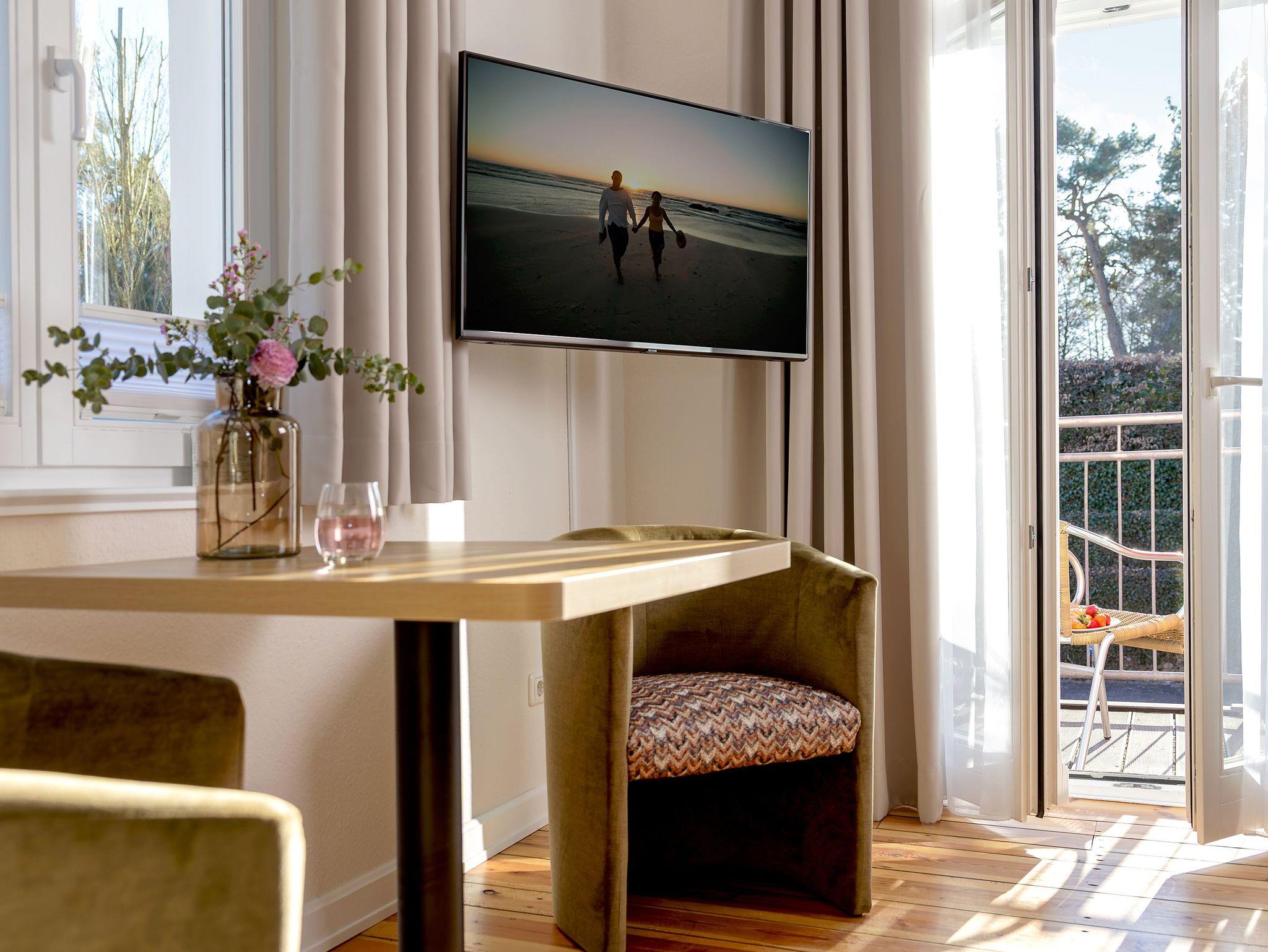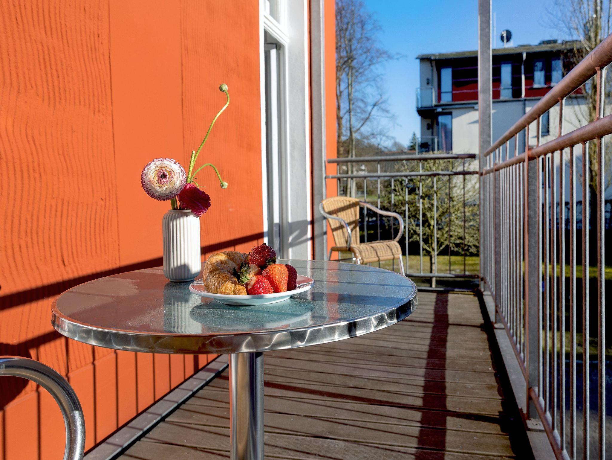 Von Wohnzimmer oder Schlafzimmer aus gelangen Sie beidseitig auf Ihren möblierten Balkon in Südausrichtung. Hier können Sie den Morgen entspannt beginnen oder den Urlaubstag gemütlich im Freien ausklingen lassen.
