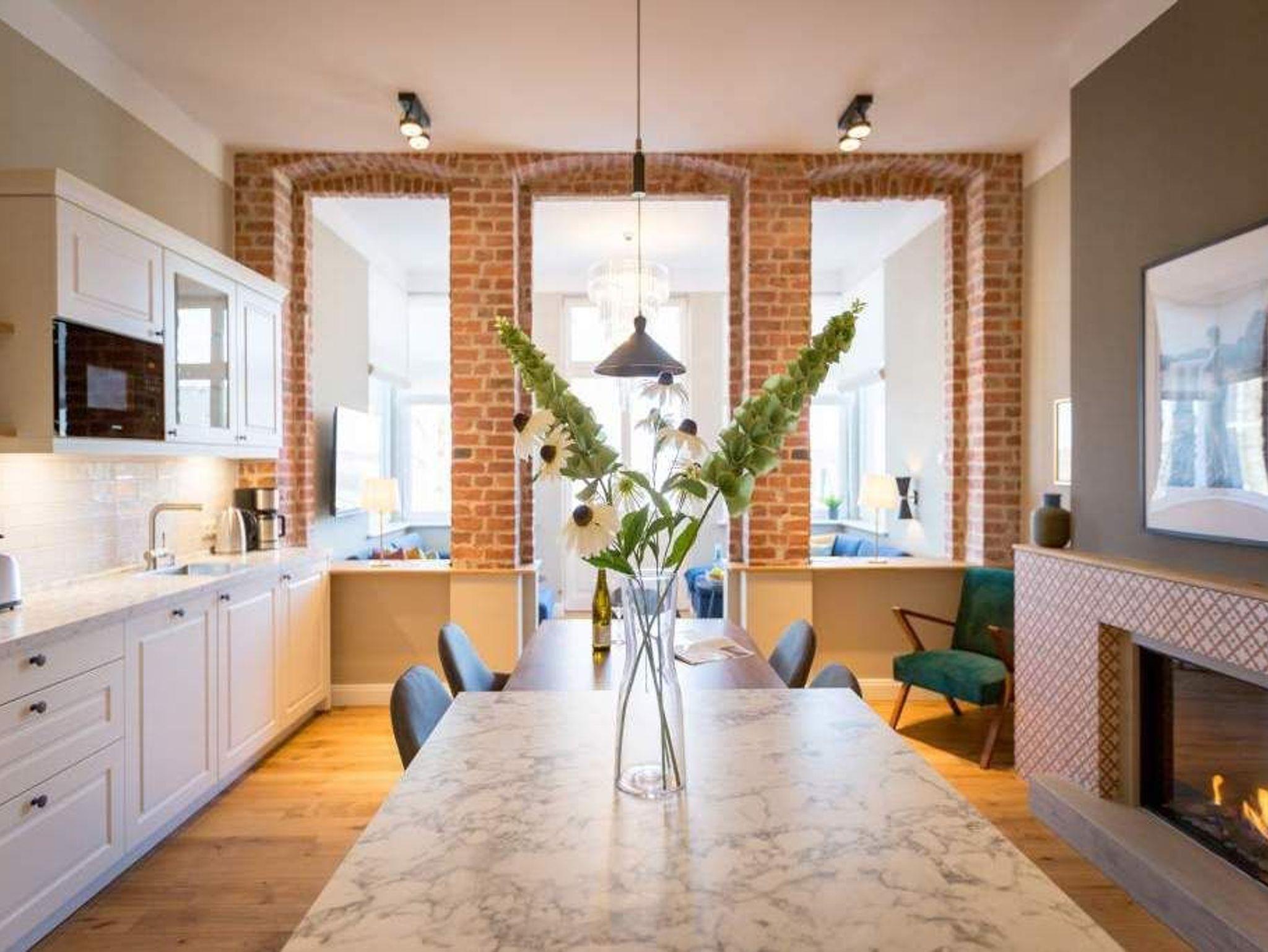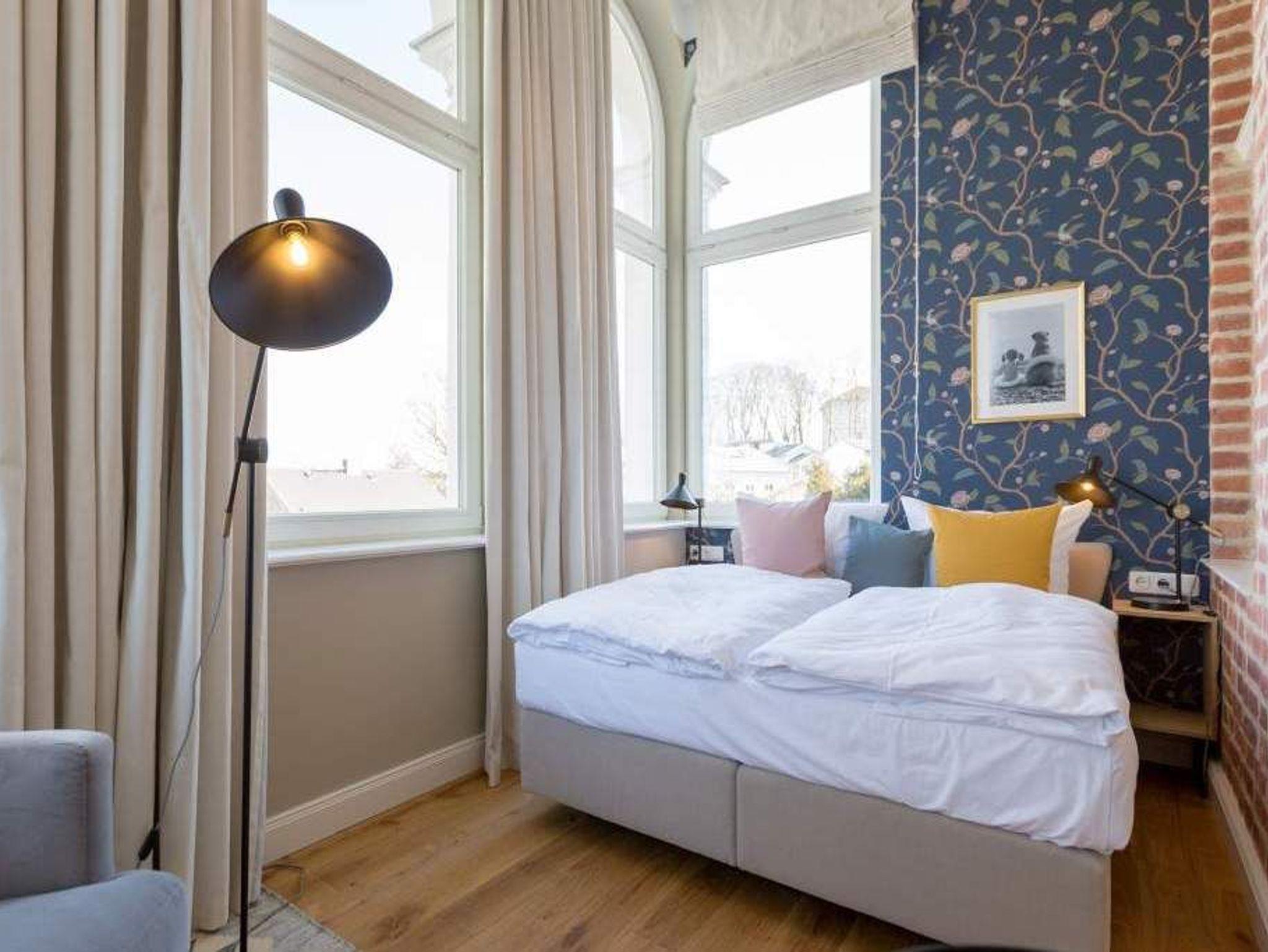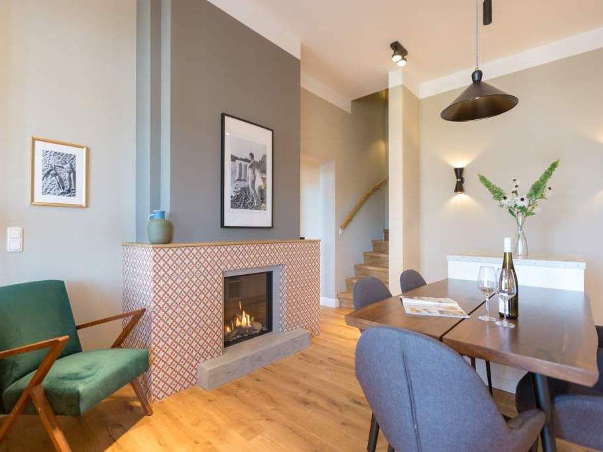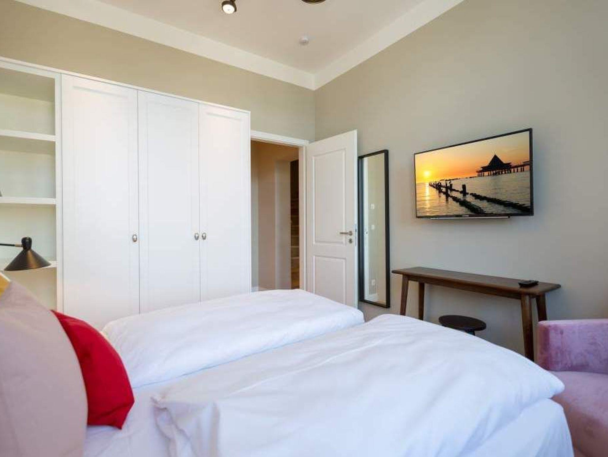 Exklusiv, außergewöhnlich, luxuriös und alles andere als 0815 ? sucht man nach Beschreibungen für diesen Urlaubswohntraum, wären diese wohl die angemessensten. Urlaub der Extra-Klasse auf zwei Etagen erwartet Sie im Appartement Nummer 1 der Villa Bellevue. Im Erdgeschoss und in der Belle Etage der wunderschön sanierten Bädervilla atmen Sie das Flair der mondänen Kaiserzeit und die Leichtigkeit und Noblesse modernen Innendesigns gleichermaßen. Auf den großzügigen 100 Quadratmetern können vier Erwachsene und zwei Kinder bis drei Jahre (im Kinderreisebett) gemeinsam eine unvergesslich schöne Zeit verbringen. Das geräumige Wohn-Esszimmer, dessen Bereiche durch die freigelegte Backsteinwand der ehemaligen Veranda voneinander getrennt sind, lädt zum Entspannen, Beisammensein und Dinieren ein. Auf zwei großen Wohnlandschaften können Sie zur Ruhe kommen. Der 42-Zoll-Flat TV ist der ideale Entertainer. Von der Veranda aus haben Sie zudem Zugang zum Garten und zur Terrasse mit Tisch und sechs Stühlen. Das Interieur der Wohnung ist vom Feinsten. Edle skandinavische Design-Klassiker verleihen diesem Urlaubsdomizil Extravaganz und einen stylischen Charakter. Der mit wunderschönen Fliesen gerahmte Gas-Kamin im Esszimmer ist ein echter Hingucker und sorgt an stürmischen Abenden für viel Gemütlichkeit. Da bleibt man gern länger am großen Echtholztisch sitzen, plaudert und genießt die Zeit. Die offene Küche mit hochwertigen Geräten und einem kleinen Kühlschrank ist mit ausgesuchtem ASA-Geschirr ausgestattet. Auf dieser Etage gibt es mit wunderschöner Designtapete dekoriert bereits das erste Schlafzimmer. Ausgestattet mit einem komfortablen Boxspringdoppelbett (1,80 m x 2,00 m) verspricht es auch nachts jede Menge Vergnügen. Das dazu gehörige Badezimmer bietet viel Platz zum Duschen und Frischmachen. Der Clou des Urlaubsparadieses empfängt den Auszeithungrigen jedoch in der 1. Etage. Hier avanciert das ballsaalgroße Badezimmer zum Highlight der Belle Etage. Die freistehende Badewanne verführt geradezu zum Loslassen und Weggleiten in duftende Schaumträume. Eine Panorama-Sauna bringt Wellness-Fans ordentlich ins Schwitzen. Und das alles ist nebst Waschtisch, Dusche und geräumigem Kleiderschrank eingebettet in edles Fliesendesign. Dem Badezimmer angeschlossen ist eine Schlafveranda. Ein wunderbarer Kontrast bildet die edle Tapete, die hier auf die unverputzte Brickwall der alten Bädervilla trifft. Wer sich hier bettet, fühlt sich in eine andere Welt versetzt. Auch auf dieser Etage empfängt den Gast ein Boxspringdoppelbett (1,60 m x 2,00 m). Wohlfühlen steht in diesem Appartement an erster Stelle. Dafür sind die Betten bei Ihrer Anreise bereits bezogen und Handtücher liegen bereit. Ihr Auto können Sie auf dem zum Haus gehörenden Stellplatz parken.