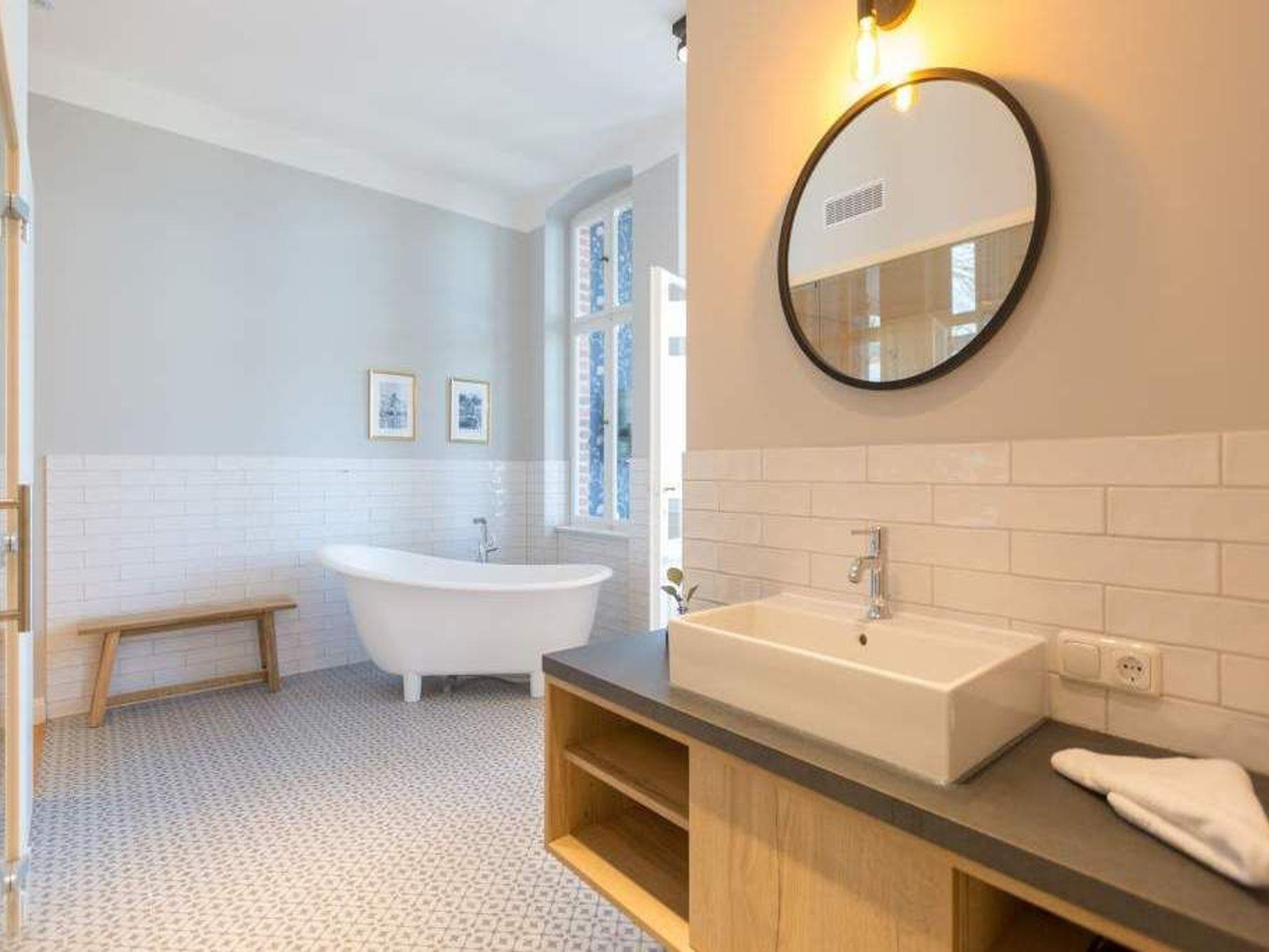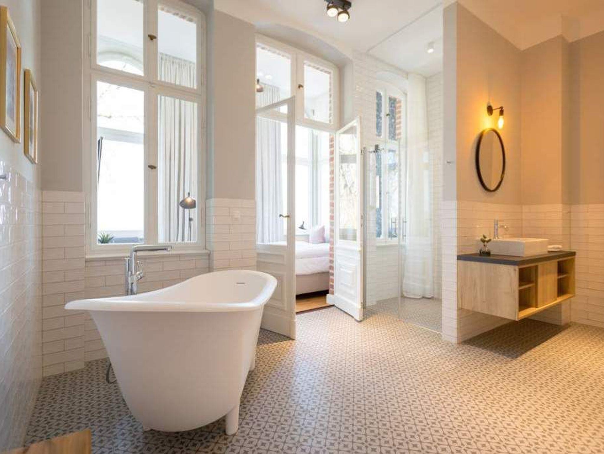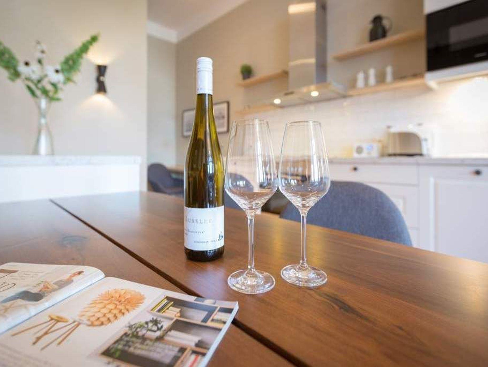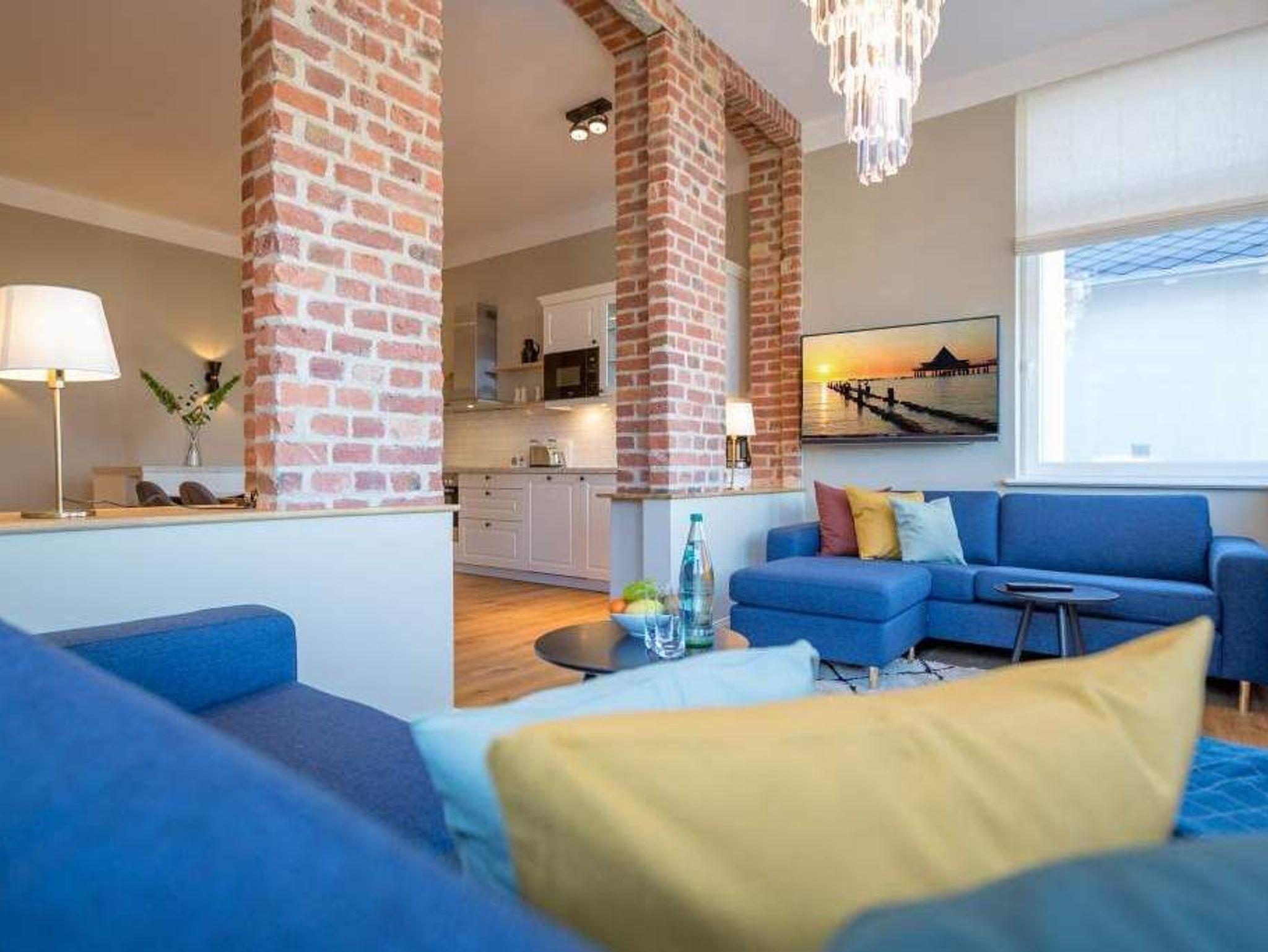 Exklusiv, außergewöhnlich, luxuriös und alles andere als 0815 ? sucht man nach Beschreibungen für diesen Urlaubswohntraum, wären diese wohl die angemessensten. Urlaub der Extra-Klasse auf zwei Etagen erwartet Sie im Appartement Nummer 1 der Villa Bellevue. Im Erdgeschoss und in der Belle Etage der wunderschön sanierten Bädervilla atmen Sie das Flair der mondänen Kaiserzeit und die Leichtigkeit und Noblesse modernen Innendesigns gleichermaßen. Auf den großzügigen 100 Quadratmetern können vier Erwachsene und zwei Kinder bis drei Jahre (im Kinderreisebett) gemeinsam eine unvergesslich schöne Zeit verbringen. Das geräumige Wohn-Esszimmer, dessen Bereiche durch die freigelegte Backsteinwand der ehemaligen Veranda voneinander getrennt sind, lädt zum Entspannen, Beisammensein und Dinieren ein. Auf zwei großen Wohnlandschaften können Sie zur Ruhe kommen. Der 42-Zoll-Flat TV ist der ideale Entertainer. Von der Veranda aus haben Sie zudem Zugang zum Garten und zur Terrasse mit Tisch und sechs Stühlen. Das Interieur der Wohnung ist vom Feinsten. Edle skandinavische Design-Klassiker verleihen diesem Urlaubsdomizil Extravaganz und einen stylischen Charakter. Der mit wunderschönen Fliesen gerahmte Gas-Kamin im Esszimmer ist ein echter Hingucker und sorgt an stürmischen Abenden für viel Gemütlichkeit. Da bleibt man gern länger am großen Echtholztisch sitzen, plaudert und genießt die Zeit. Die offene Küche mit hochwertigen Geräten und einem kleinen Kühlschrank ist mit ausgesuchtem ASA-Geschirr ausgestattet. Auf dieser Etage gibt es mit wunderschöner Designtapete dekoriert bereits das erste Schlafzimmer. Ausgestattet mit einem komfortablen Boxspringdoppelbett (1,80 m x 2,00 m) verspricht es auch nachts jede Menge Vergnügen. Das dazu gehörige Badezimmer bietet viel Platz zum Duschen und Frischmachen. Der Clou des Urlaubsparadieses empfängt den Auszeithungrigen jedoch in der 1. Etage. Hier avanciert das ballsaalgroße Badezimmer zum Highlight der Belle Etage. Die freistehende Badewanne verführt geradezu zum Loslassen und Weggleiten in duftende Schaumträume. Eine Panorama-Sauna bringt Wellness-Fans ordentlich ins Schwitzen. Und das alles ist nebst Waschtisch, Dusche und geräumigem Kleiderschrank eingebettet in edles Fliesendesign. Dem Badezimmer angeschlossen ist eine Schlafveranda. Ein wunderbarer Kontrast bildet die edle Tapete, die hier auf die unverputzte Brickwall der alten Bädervilla trifft. Wer sich hier bettet, fühlt sich in eine andere Welt versetzt. Auch auf dieser Etage empfängt den Gast ein Boxspringdoppelbett (1,60 m x 2,00 m). Wohlfühlen steht in diesem Appartement an erster Stelle. Dafür sind die Betten bei Ihrer Anreise bereits bezogen und Handtücher liegen bereit. Ihr Auto können Sie auf dem zum Haus gehörenden Stellplatz parken.