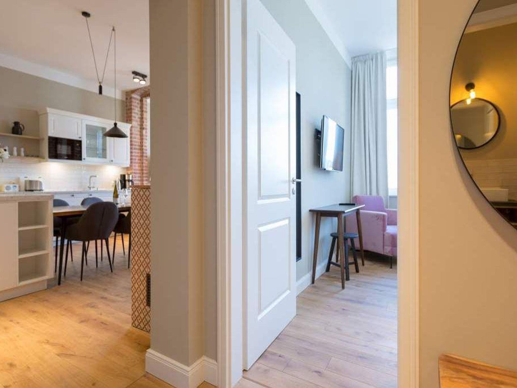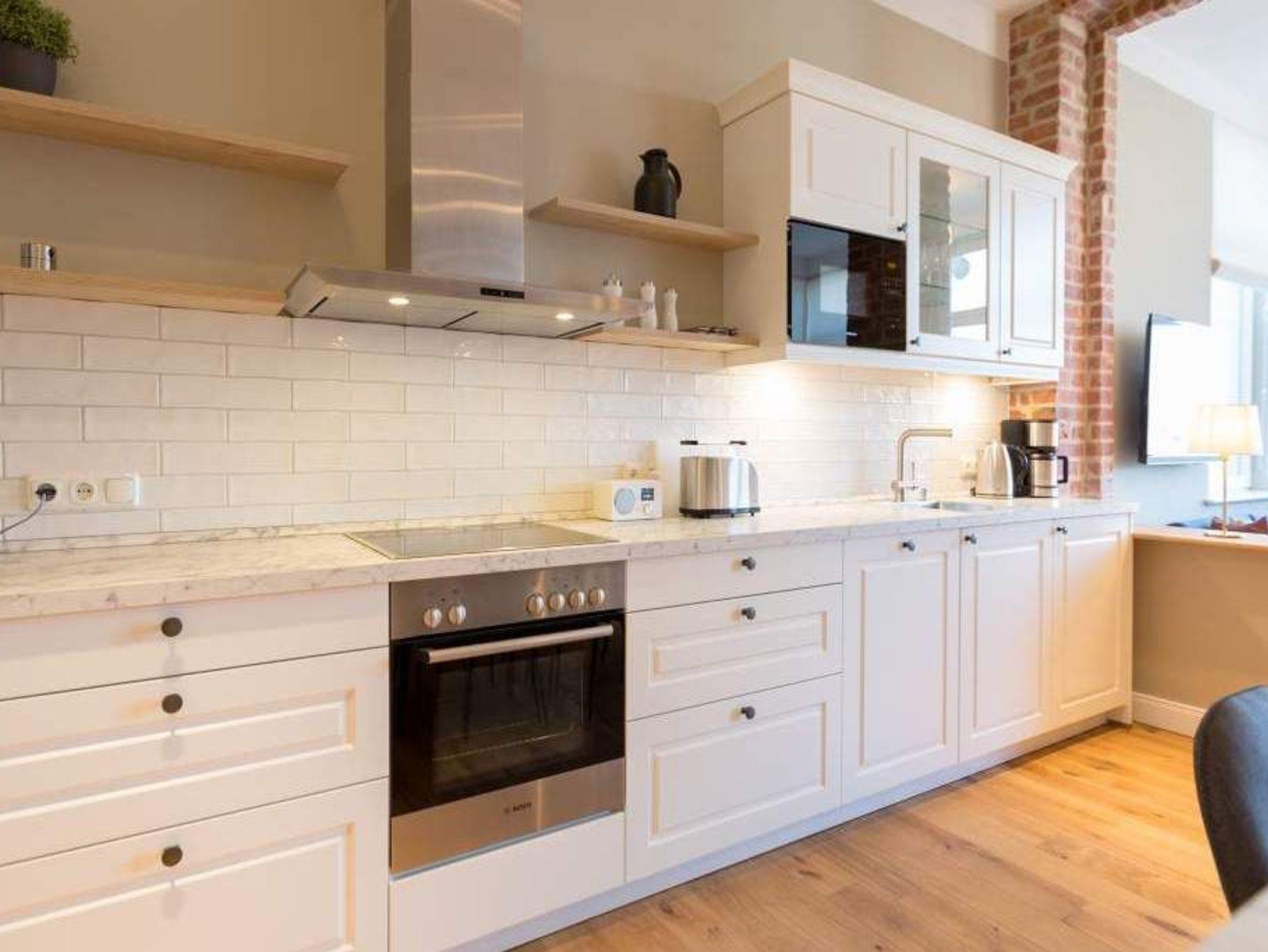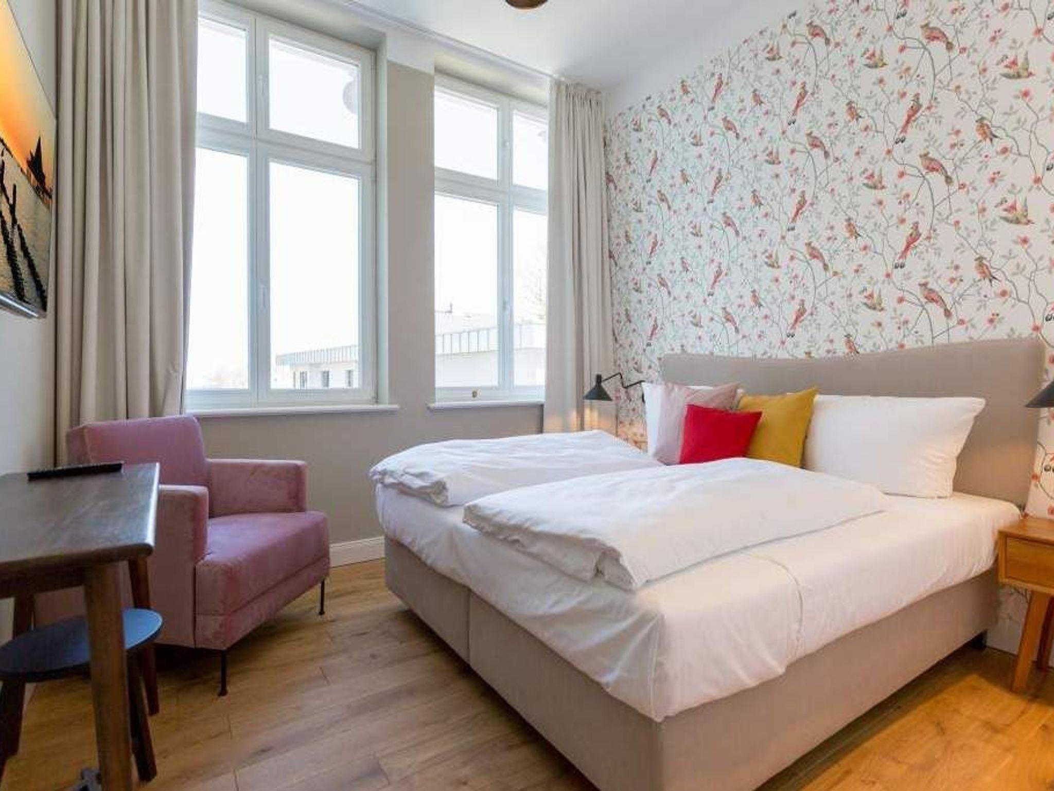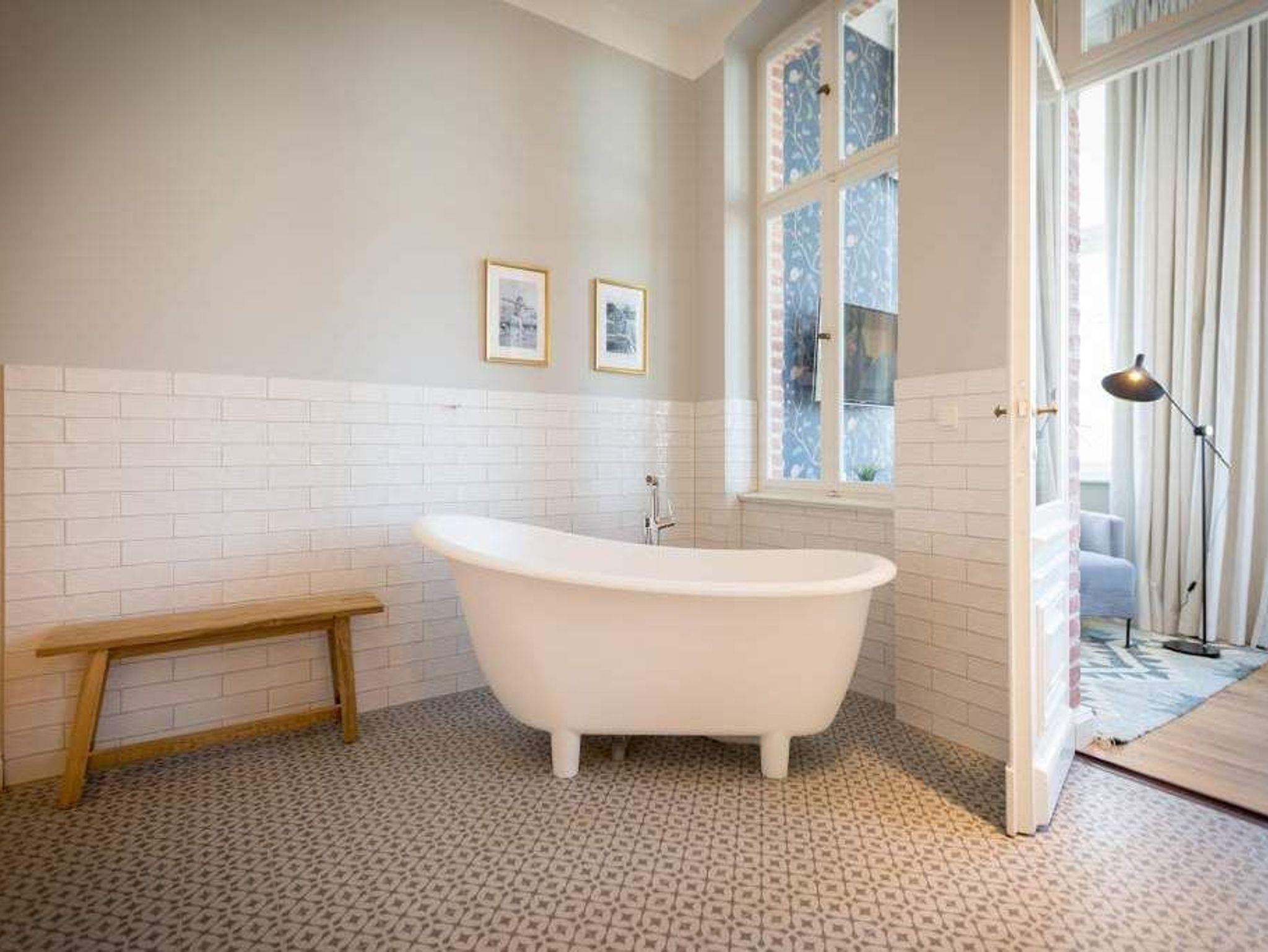Exklusiv, außergewöhnlich, luxuriös und alles andere als 0815 ? sucht man nach Beschreibungen für diesen Urlaubswohntraum, wären diese wohl die angemessensten. Urlaub der Extra-Klasse auf zwei Etagen erwartet Sie im Appartement Nummer 1 der Villa Bellevue. Im Erdgeschoss und in der Belle Etage der wunderschön sanierten Bädervilla atmen Sie das Flair der mondänen Kaiserzeit und die Leichtigkeit und Noblesse modernen Innendesigns gleichermaßen. Auf den großzügigen 100 Quadratmetern können vier Erwachsene und zwei Kinder bis drei Jahre (im Kinderreisebett) gemeinsam eine unvergesslich schöne Zeit verbringen. Das geräumige Wohn-Esszimmer, dessen Bereiche durch die freigelegte Backsteinwand der ehemaligen Veranda voneinander getrennt sind, lädt zum Entspannen, Beisammensein und Dinieren ein. Auf zwei großen Wohnlandschaften können Sie zur Ruhe kommen. Der 42-Zoll-Flat TV ist der ideale Entertainer. Von der Veranda aus haben Sie zudem Zugang zum Garten und zur Terrasse mit Tisch und sechs Stühlen. Das Interieur der Wohnung ist vom Feinsten. Edle skandinavische Design-Klassiker verleihen diesem Urlaubsdomizil Extravaganz und einen stylischen Charakter. Der mit wunderschönen Fliesen gerahmte Gas-Kamin im Esszimmer ist ein echter Hingucker und sorgt an stürmischen Abenden für viel Gemütlichkeit. Da bleibt man gern länger am großen Echtholztisch sitzen, plaudert und genießt die Zeit. Die offene Küche mit hochwertigen Geräten und einem kleinen Kühlschrank ist mit ausgesuchtem ASA-Geschirr ausgestattet. Auf dieser Etage gibt es mit wunderschöner Designtapete dekoriert bereits das erste Schlafzimmer. Ausgestattet mit einem komfortablen Boxspringdoppelbett (1,80 m x 2,00 m) verspricht es auch nachts jede Menge Vergnügen. Das dazu gehörige Badezimmer bietet viel Platz zum Duschen und Frischmachen. Der Clou des Urlaubsparadieses empfängt den Auszeithungrigen jedoch in der 1. Etage. Hier avanciert das ballsaalgroße Badezimmer zum Highlight der Belle Etage. Die freistehende Badewanne verführt geradezu zum Loslassen und Weggleiten in duftende Schaumträume. Eine Panorama-Sauna bringt Wellness-Fans ordentlich ins Schwitzen. Und das alles ist nebst Waschtisch, Dusche und geräumigem Kleiderschrank eingebettet in edles Fliesendesign. Dem Badezimmer angeschlossen ist eine Schlafveranda. Ein wunderbarer Kontrast bildet die edle Tapete, die hier auf die unverputzte Brickwall der alten Bädervilla trifft. Wer sich hier bettet, fühlt sich in eine andere Welt versetzt. Auch auf dieser Etage empfängt den Gast ein Boxspringdoppelbett (1,60 m x 2,00 m). Wohlfühlen steht in diesem Appartement an erster Stelle. Dafür sind die Betten bei Ihrer Anreise bereits bezogen und Handtücher liegen bereit. Ihr Auto können Sie auf dem zum Haus gehörenden Stellplatz parken.