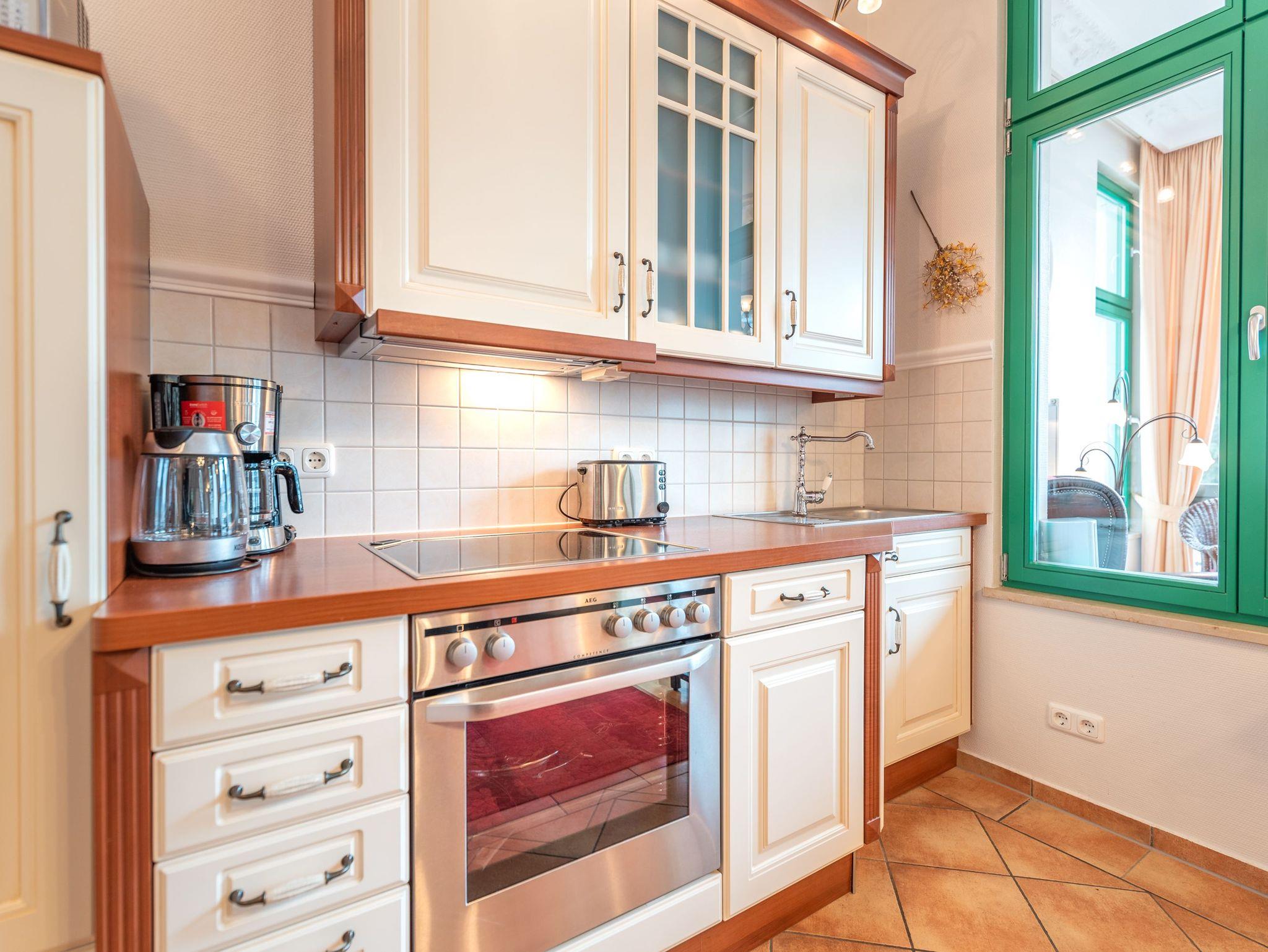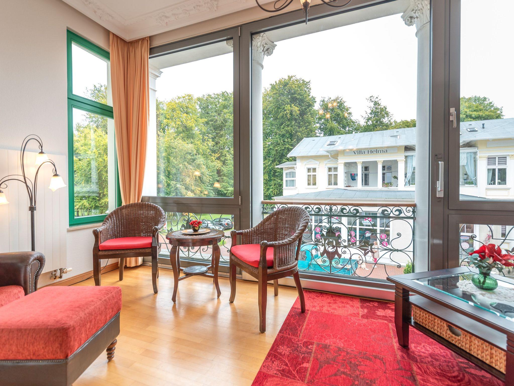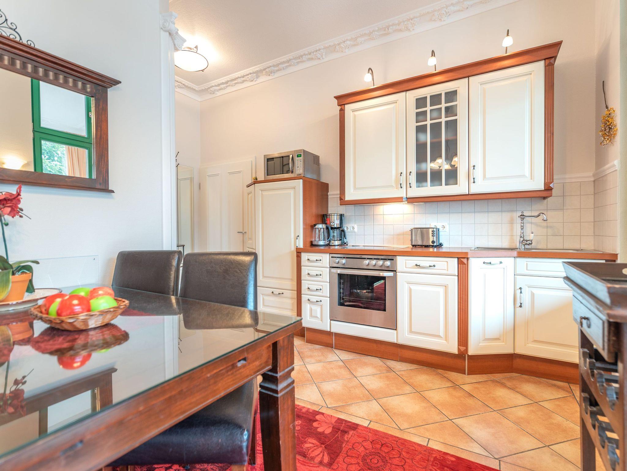 Die Wohnung ist komplett ausgestattet und überzeugt mit einem geschmackvoll gestalteten Küchen- und Essbereich. In der verglasten Loggia laden eine gemütliche Sitzgruppe und eine Leseecke zum Entspannen ein. Für Unterhaltung sorgt ein moderner Flachbild-TV ? noch schöner ist es jedoch, im komfortablen Lehnsessel bei einem Glas Wein den Blick über die umliegende Bäderarchitektur schweifen zu lassen. Für unsere kleinen Gäste können auf Wunsch ein Kinderreisebett und ein Kinderhochstuhl kostenfrei bereitgestellt werden.