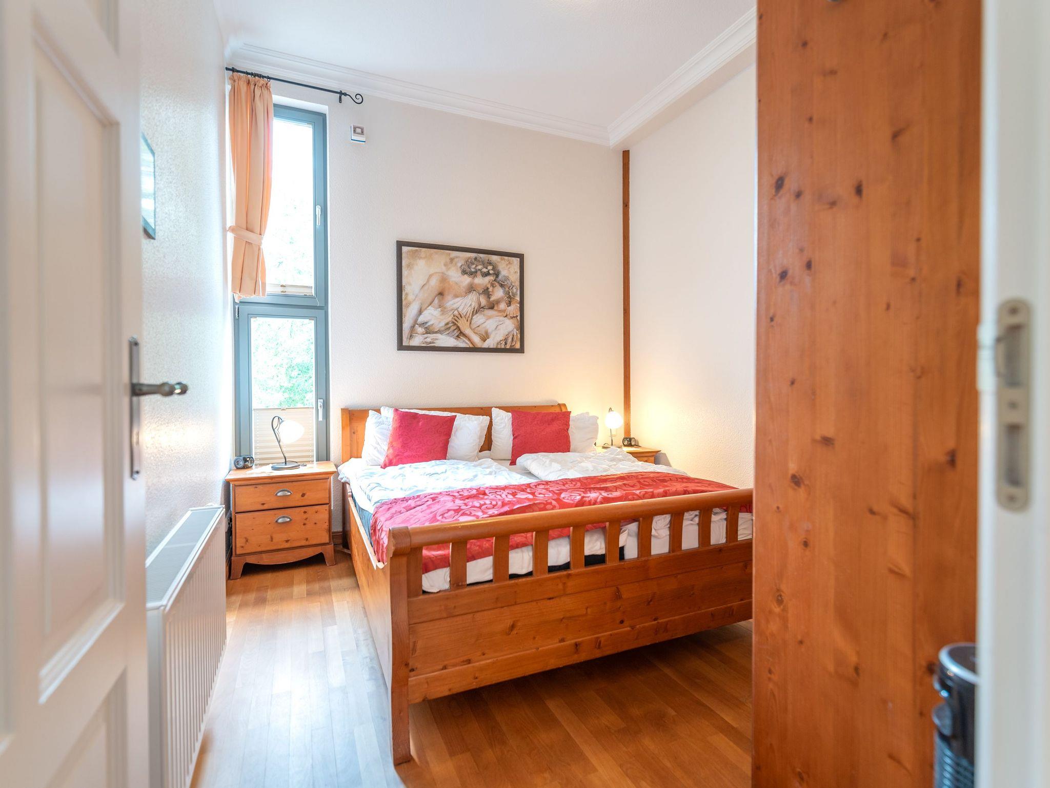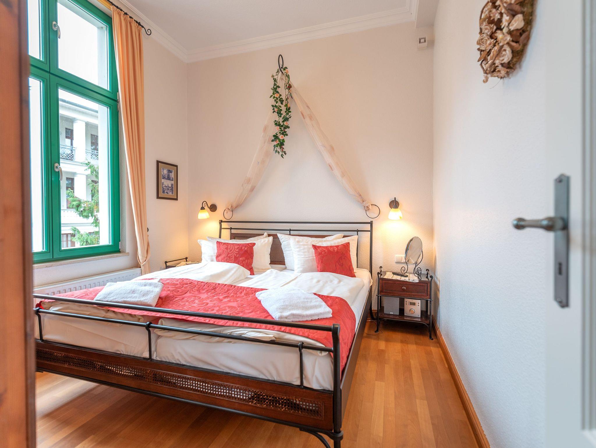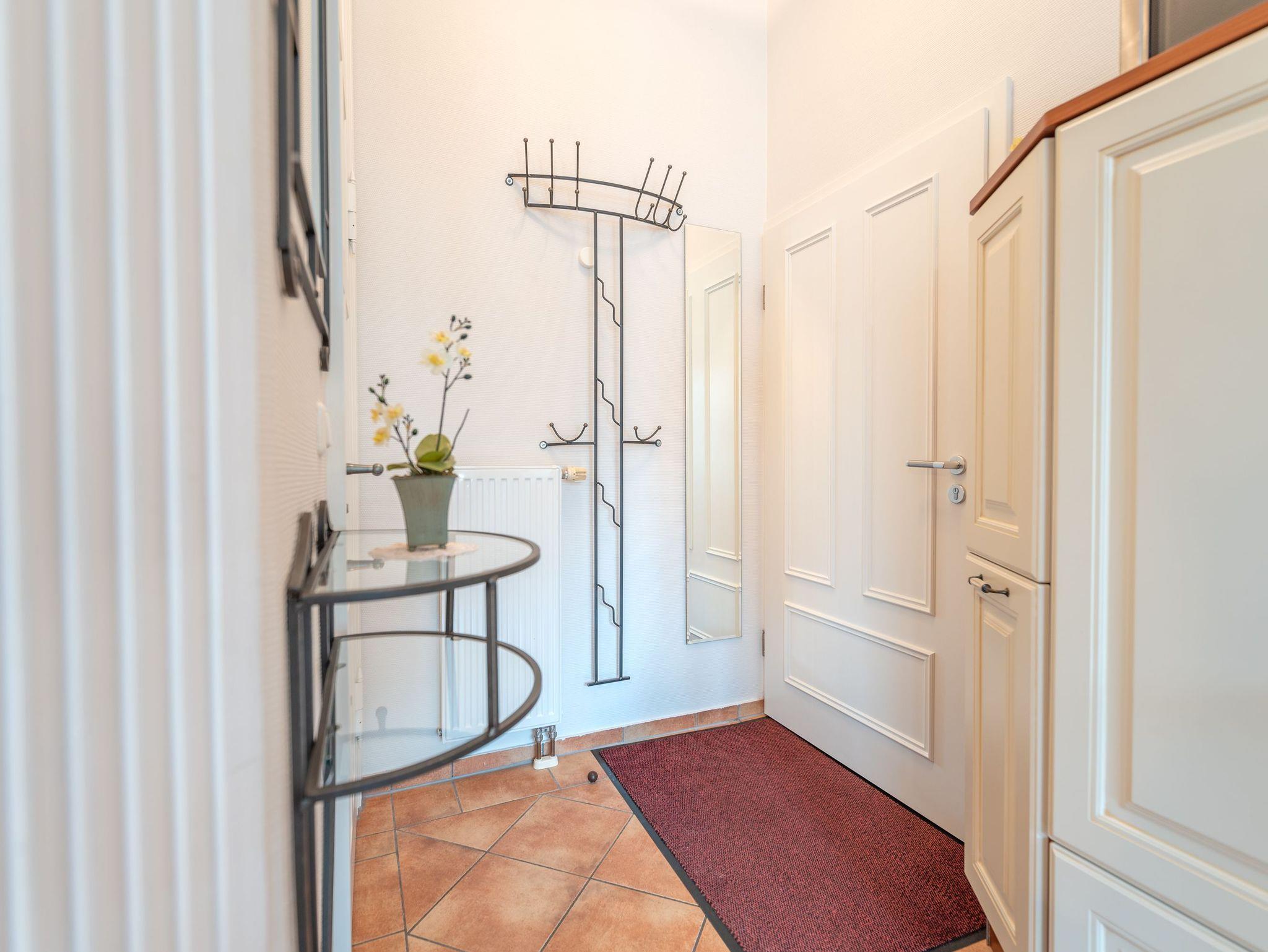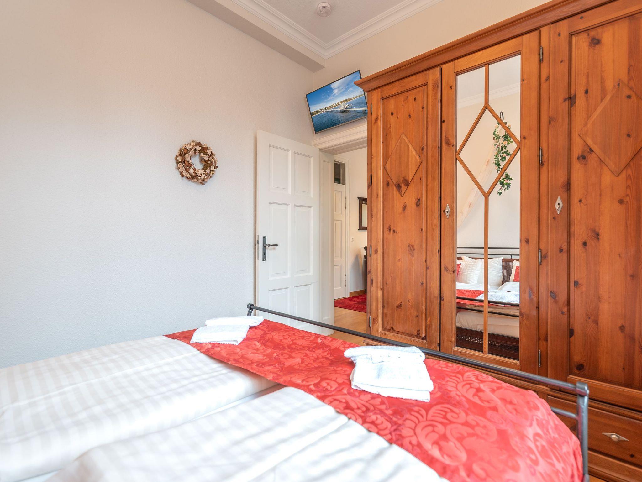 Die Wohnung ist komplett ausgestattet und überzeugt mit einem geschmackvoll gestalteten Küchen- und Essbereich. In der verglasten Loggia laden eine gemütliche Sitzgruppe und eine Leseecke zum Entspannen ein. Für Unterhaltung sorgt ein moderner Flachbild-TV ? noch schöner ist es jedoch, im komfortablen Lehnsessel bei einem Glas Wein den Blick über die umliegende Bäderarchitektur schweifen zu lassen. Für unsere kleinen Gäste können auf Wunsch ein Kinderreisebett und ein Kinderhochstuhl kostenfrei bereitgestellt werden.