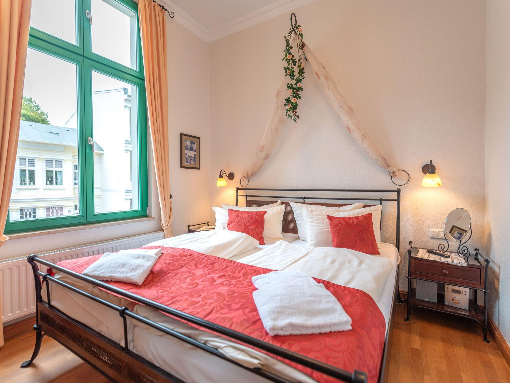 Die Villa Perkunos erstrahlt im Glanz alter Bäderstilzeiten und verbindet historischen Charme mit modernem Komfort. Die strandnahe und dennoch zentrale Lage in Heringsdorf macht die Unterkunft zu einem idealen Domizil für jeden Usedomurlauber. Die 3-Raum-Ferienwohnung Nr. 11 befindet sich in der Bel Etage des Hauses, dem früher bevorzugten Geschoss für Adlige oder Großbürger. Auf ca. 58 m² bietet sie Platz für bis zu 5 Personen. Ein überdachter PKW-Stellplatz, WLAN sowie Waschmaschine und Trockner (gegen Gebühr) stehen zur Verfügung. Das Grundstück ist umzäunt und durch ein elektrisches Tor gesichert, und Fahrräder können in der sicheren Abstellmöglichkeit im Keller untergebracht werden.