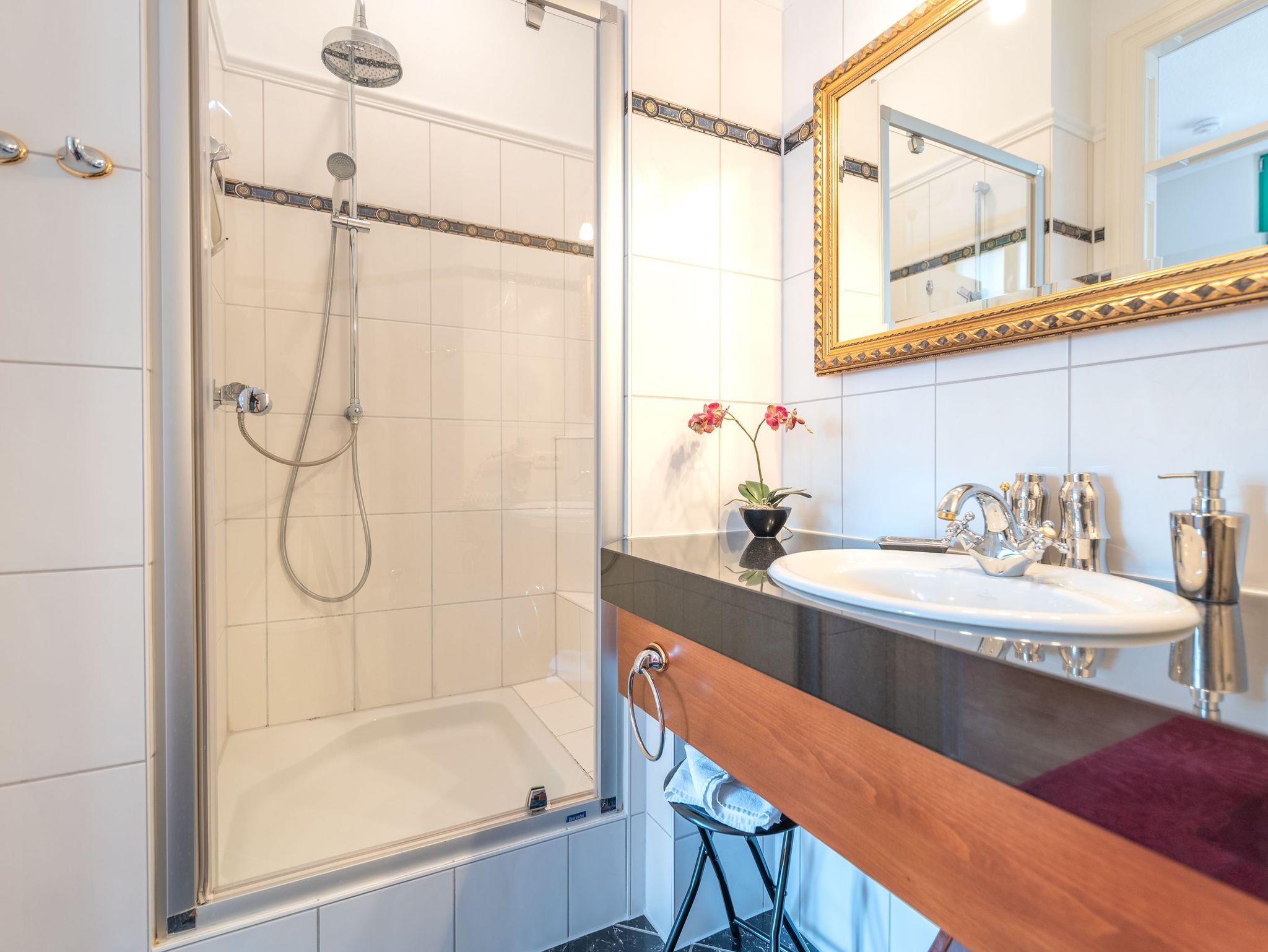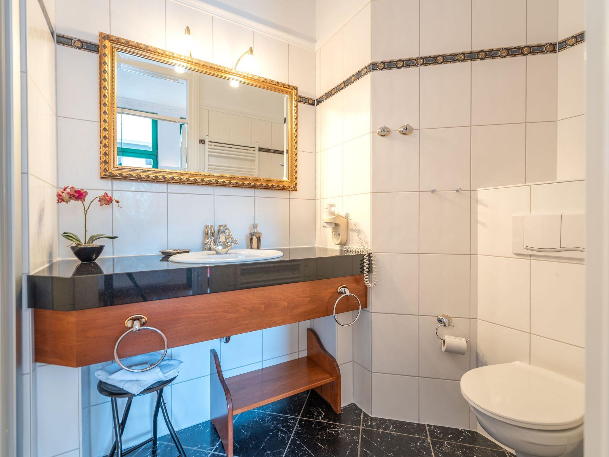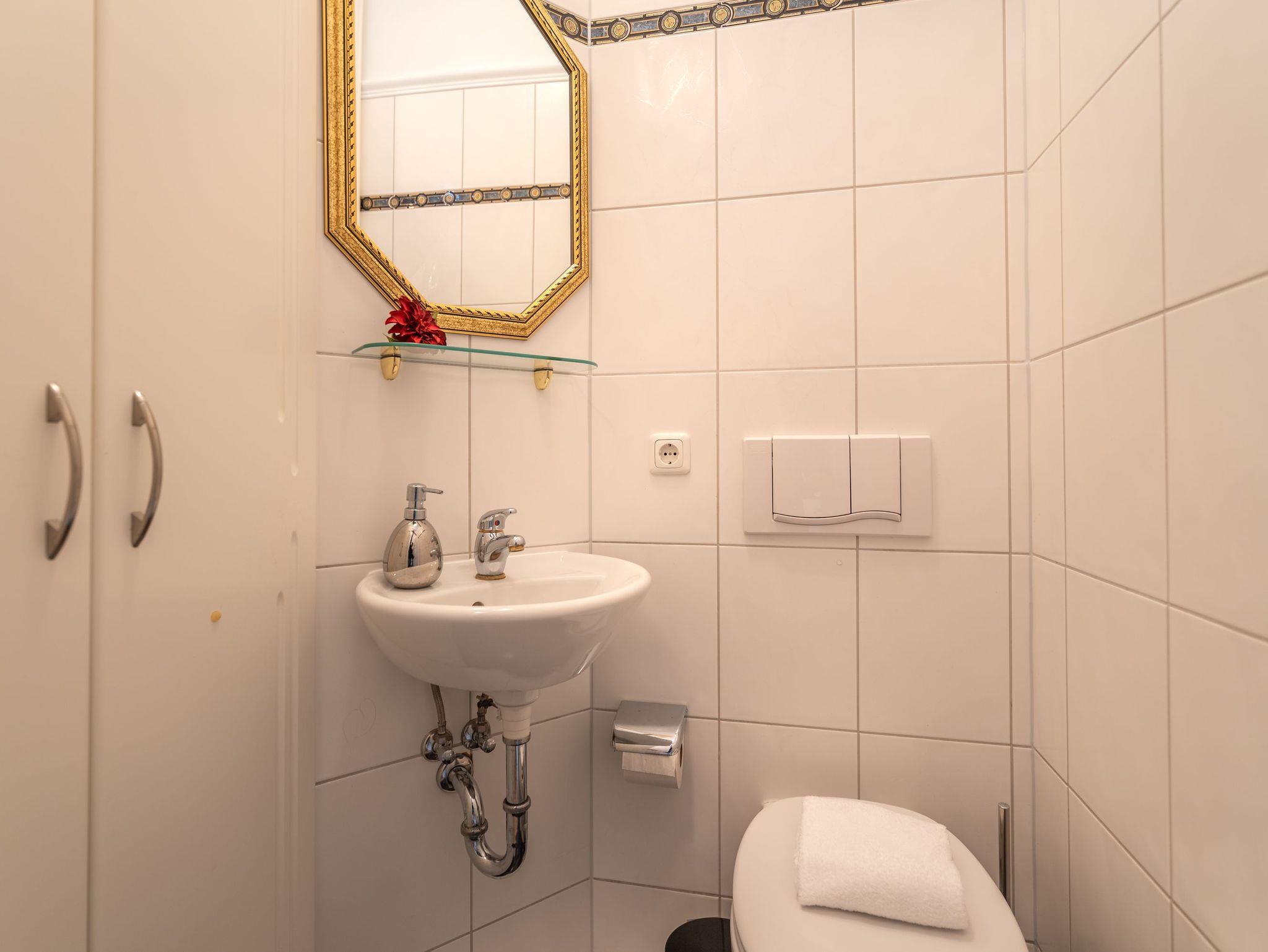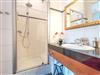 Das Badezimmer ist stilvoll ausgestattet mit Dusche, WC, Waschbecken, Fußbodenerwärmung und Handtuchheizkörper. Praktisch bei voller Belegung: ein zusätzliches Gäste-WC sorgt für mehr Komfort.