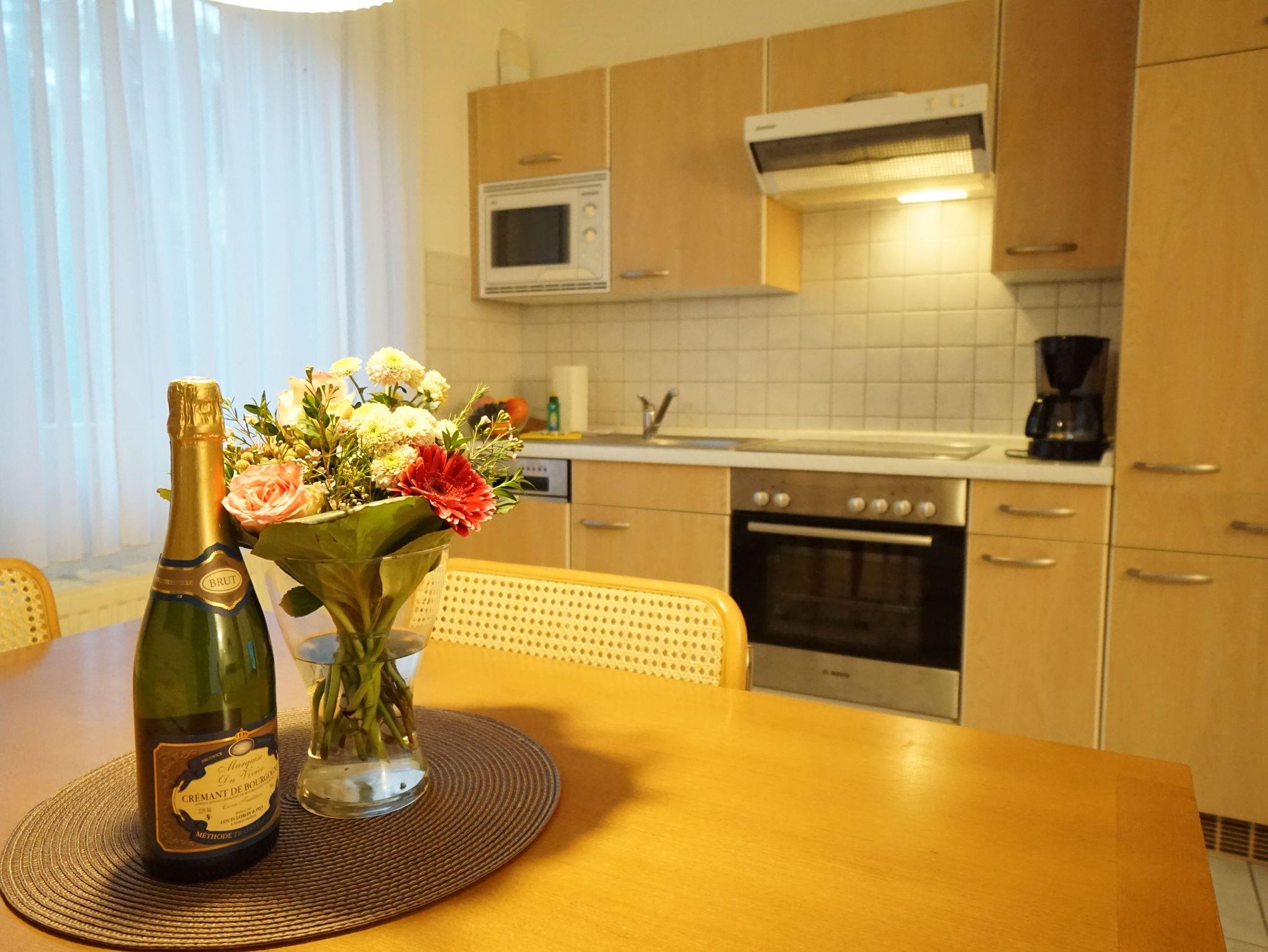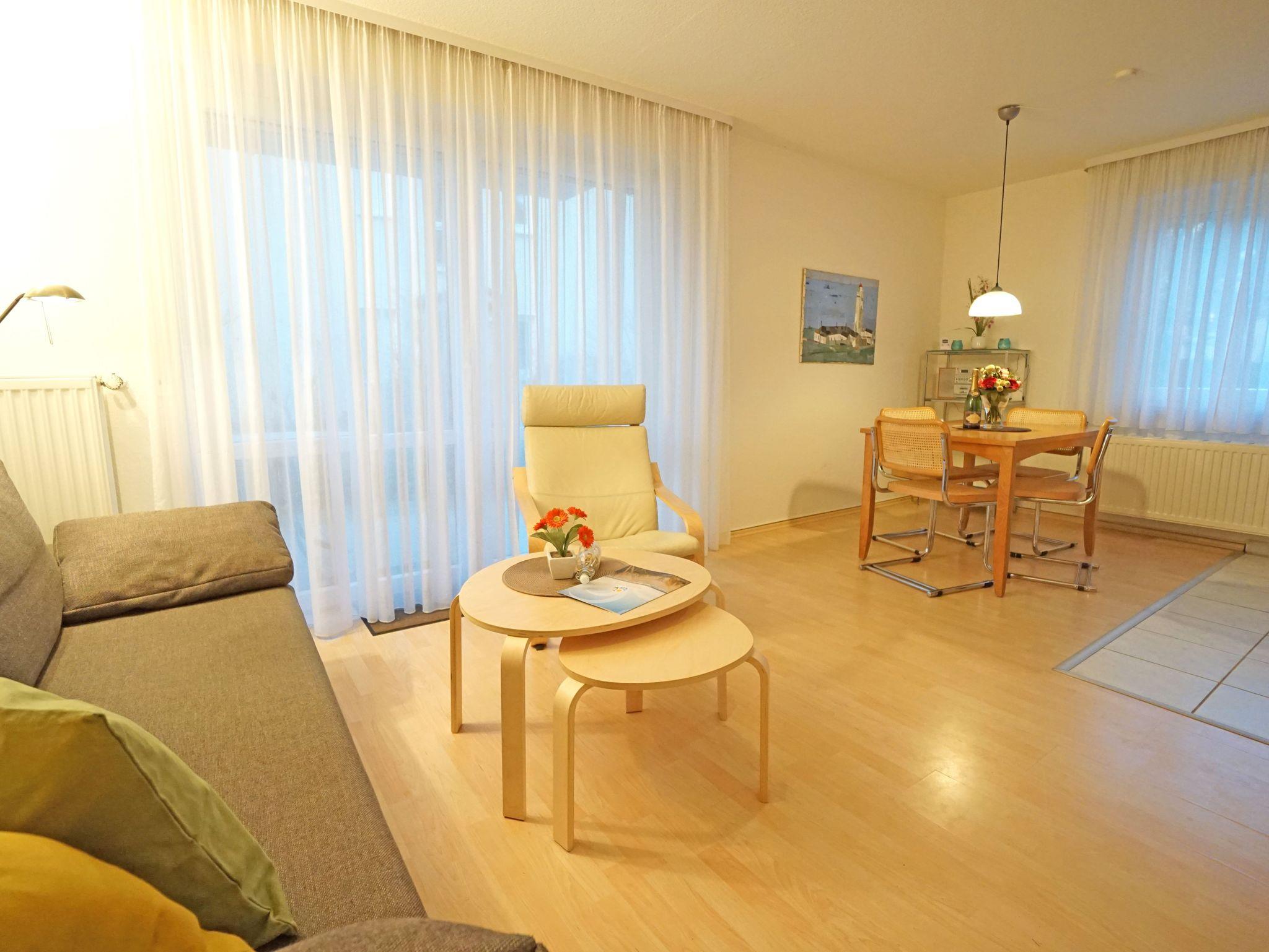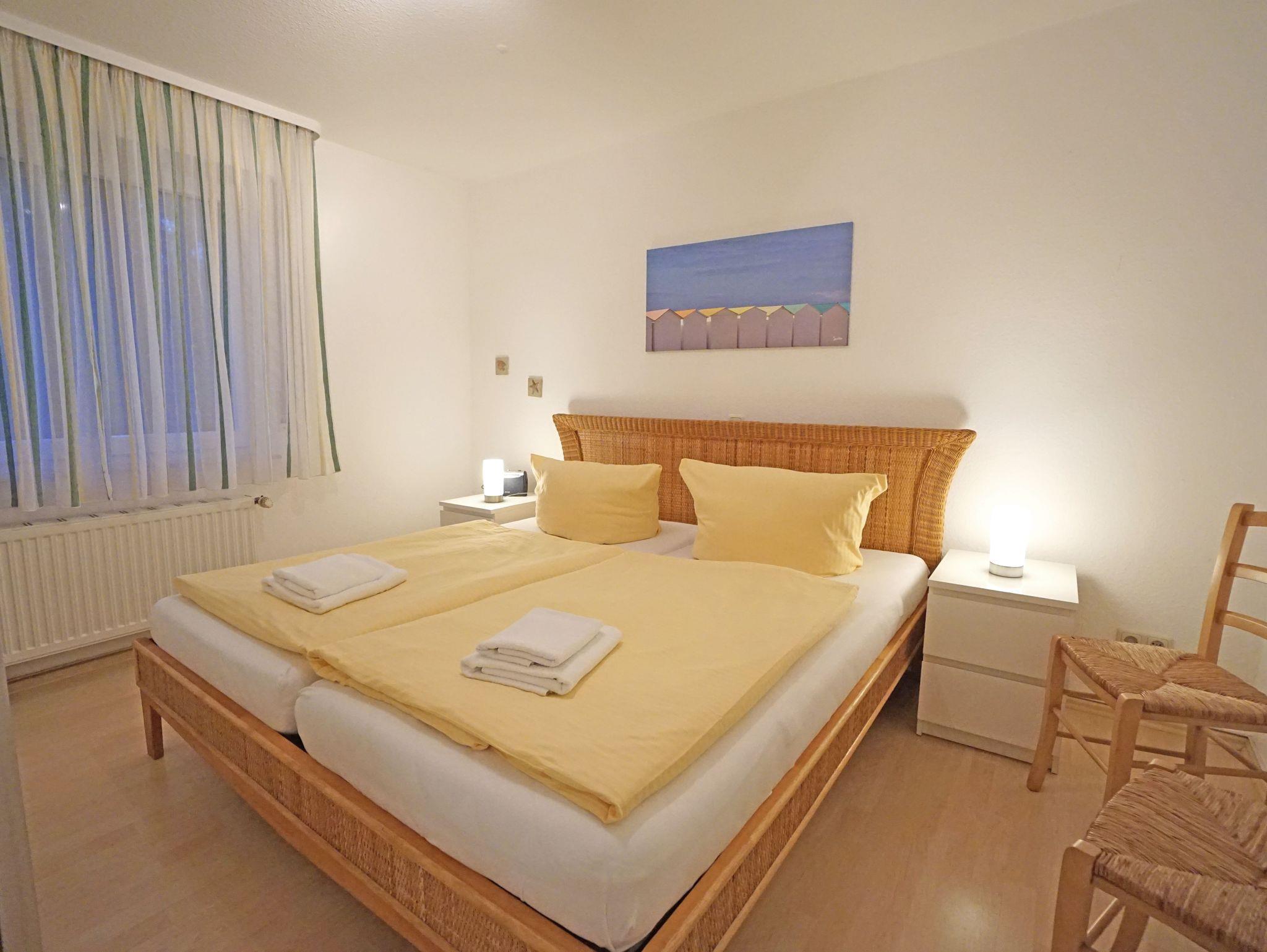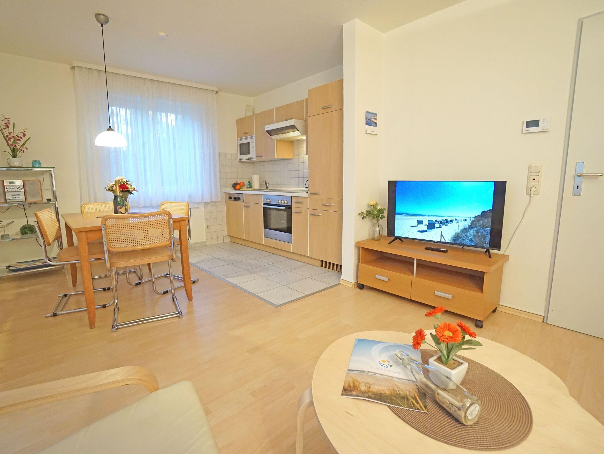 Die Zweizimmerwohnung ist ca. 50 m² groß. Bad mit Dusche und WC. Im Wohnzimmer eine komplett eingerichtete Küchenzeile mit Mikrowelle, Geschirrspüler usw. Wohnzimmer: Esstisch für 4 Personen, Schlafsofa, Kabel-TV, Radio mit CD und Kassette. Schlafzimmer: Doppelbett (180 x 200 cm), Radio. Terrasse mit Zugang zur angrenzenden Liegewiese. Liegestühle und Gartenmöbel vorhanden. Ein kostenloses WLAN-Netzwerk steht Ihnen zur Verfügung.