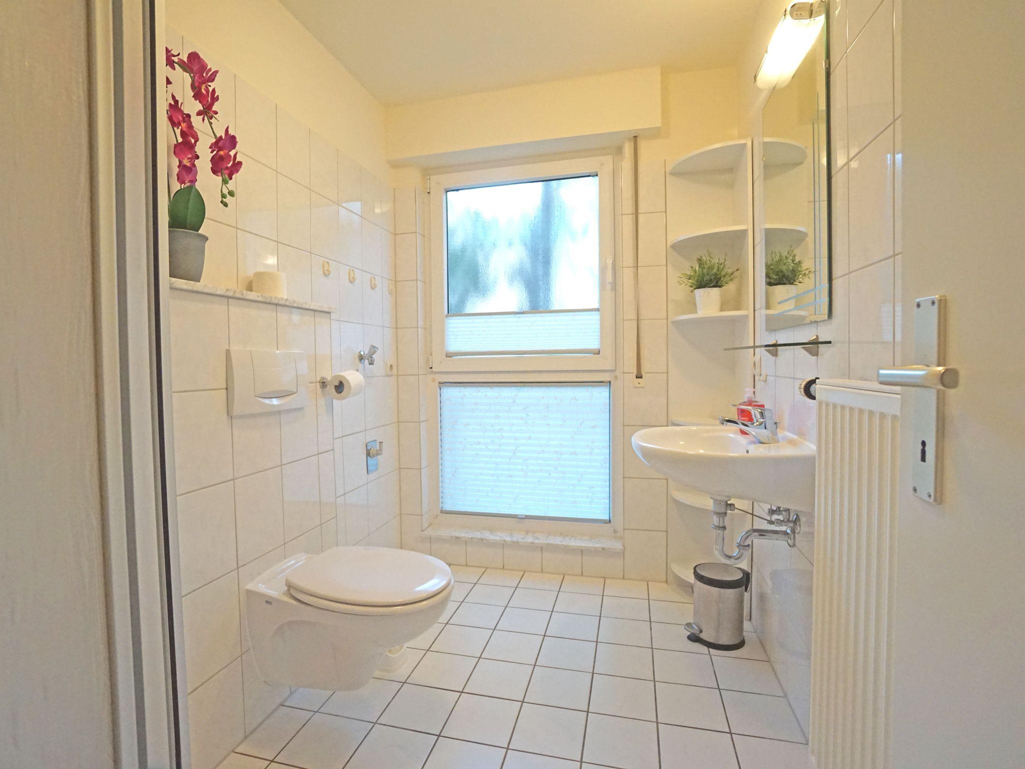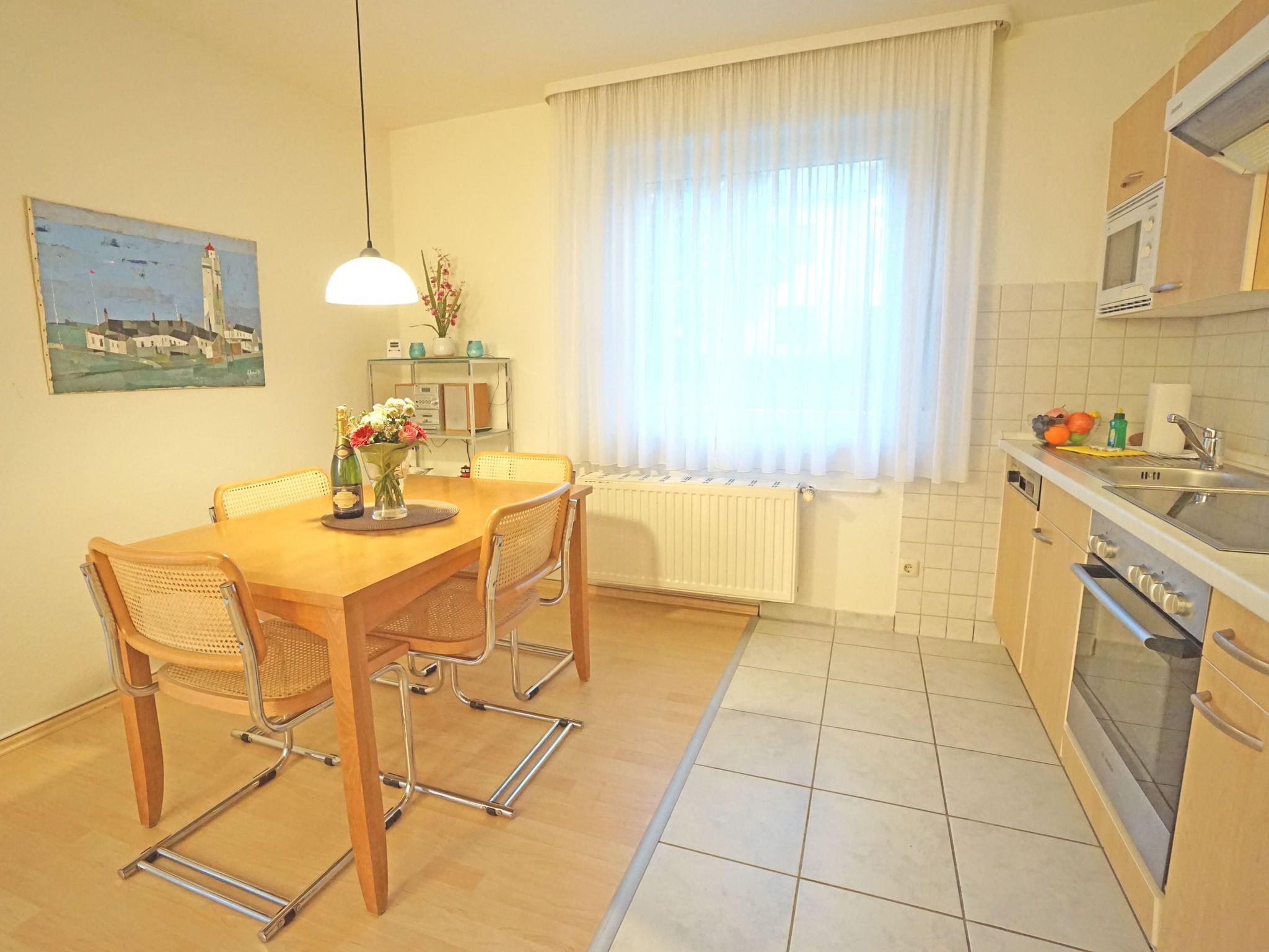 Die Zweizimmerwohnung ist ca. 50 m² groß. Bad mit Dusche und WC. Im Wohnzimmer eine komplett eingerichtete Küchenzeile mit Mikrowelle, Geschirrspüler usw. Wohnzimmer: Esstisch für 4 Personen, Schlafsofa, Kabel-TV, Radio mit CD und Kassette. Schlafzimmer: Doppelbett (180 x 200 cm), Radio, alle Räume mit Laminat bzw. Fliesen. Terrasse mit Zugang zur angrenzenden Liegewiese. Liegestühle und Gartenmöbel vorhanden. Ein kostenloses WLAN-Netzwerk steht Ihnen zur Verfügung.