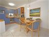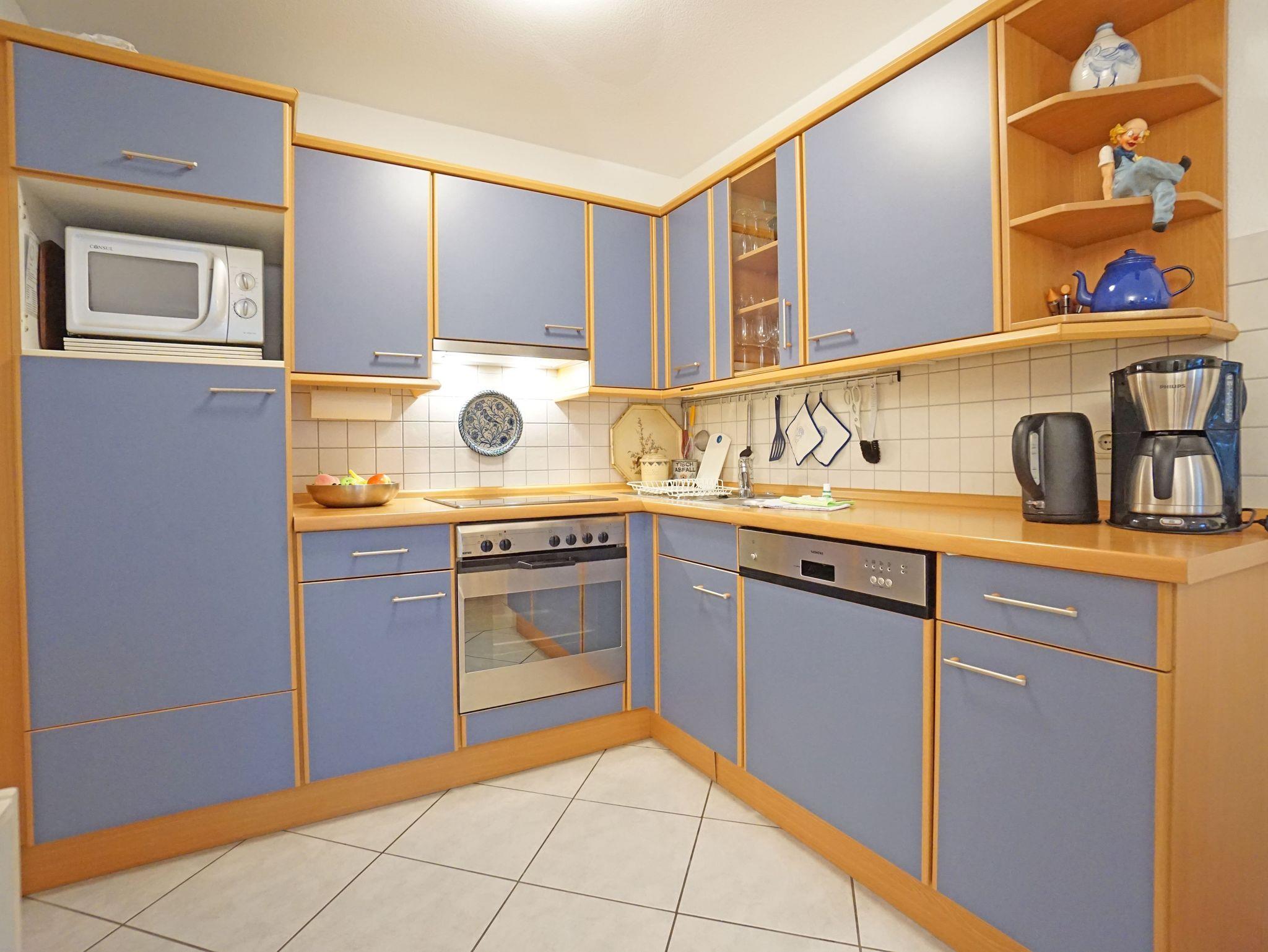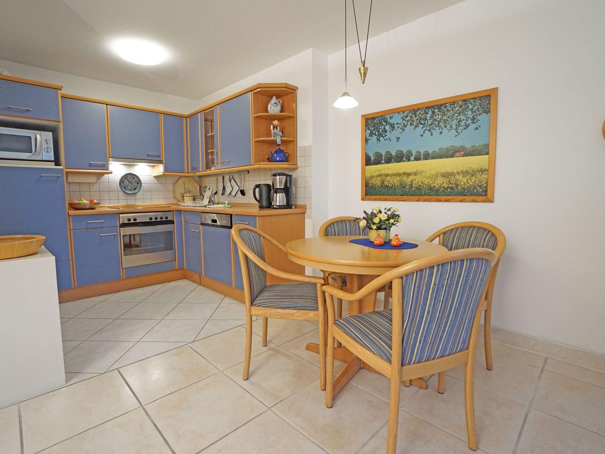 Die Küchenzeile mit E-Herd, Geschirrspüler und Kühlschrank ist komplett ausgestattet und auch ein Esstisch ist vorhanden. Ein großzügiger Balkon mit Blick in Richtung Promenade rundet diese schöne Ferienwohnung ab.