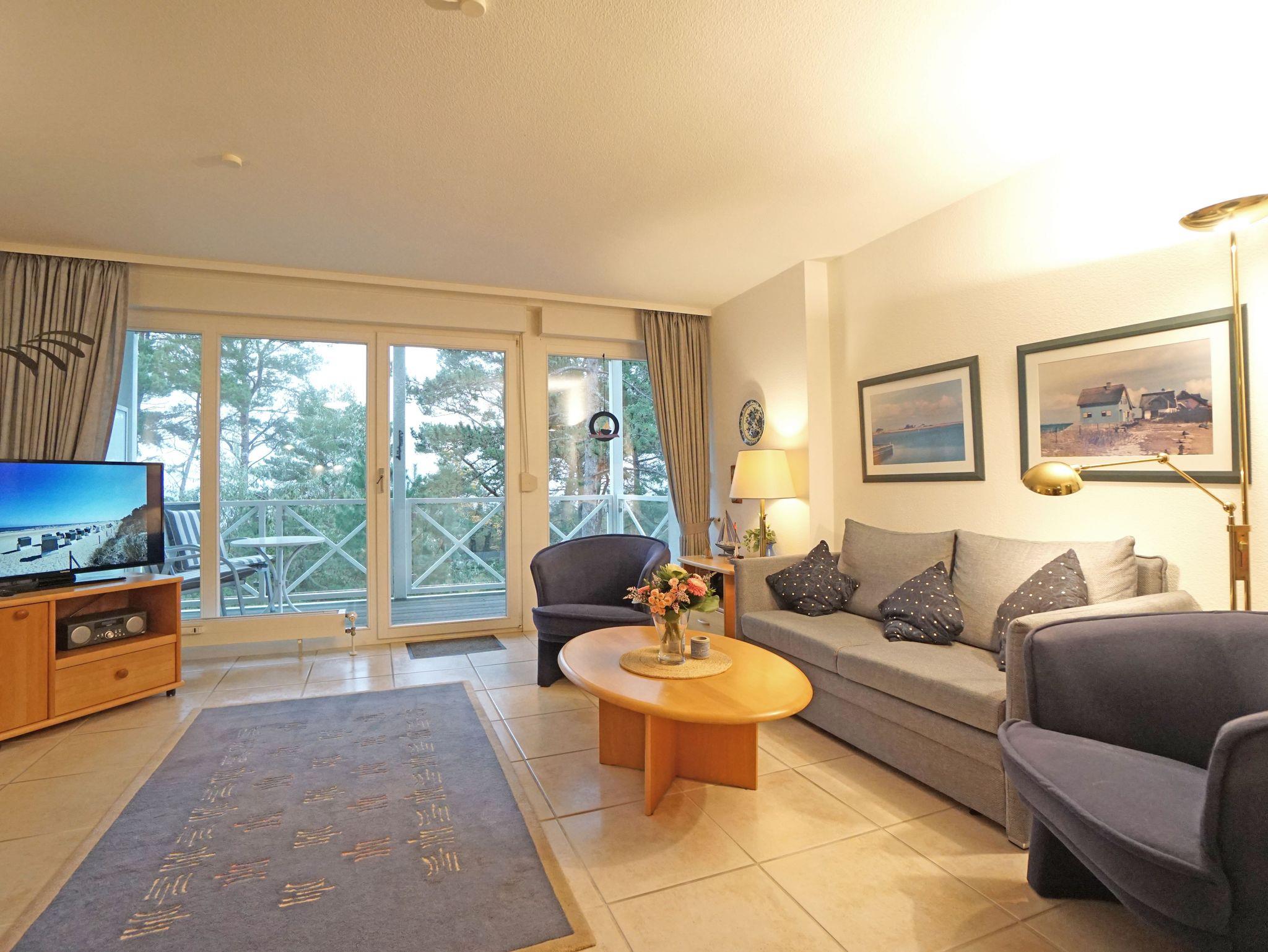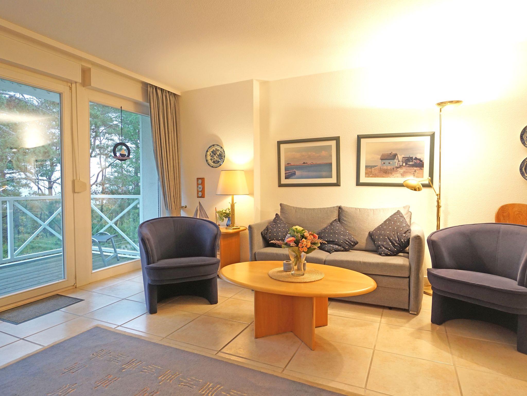 Die 59 m² große Nichtraucher-Ferienwohnung befindet sich im 2. Obergeschoss und ist ideal für 2 Personen. Die Couch im Wohnbereich ist eine komfortable Schlafcouch. Im Wohnraum befindet sich ein Flachbildfernseher. Im Schlafzimmer sorgt das bequeme Doppelbett mit 2 Einzelmatratzen für einen erholsamen Schlaf. Vom Balkon genießt man den Blick auf die Promenade und die Ostsee.