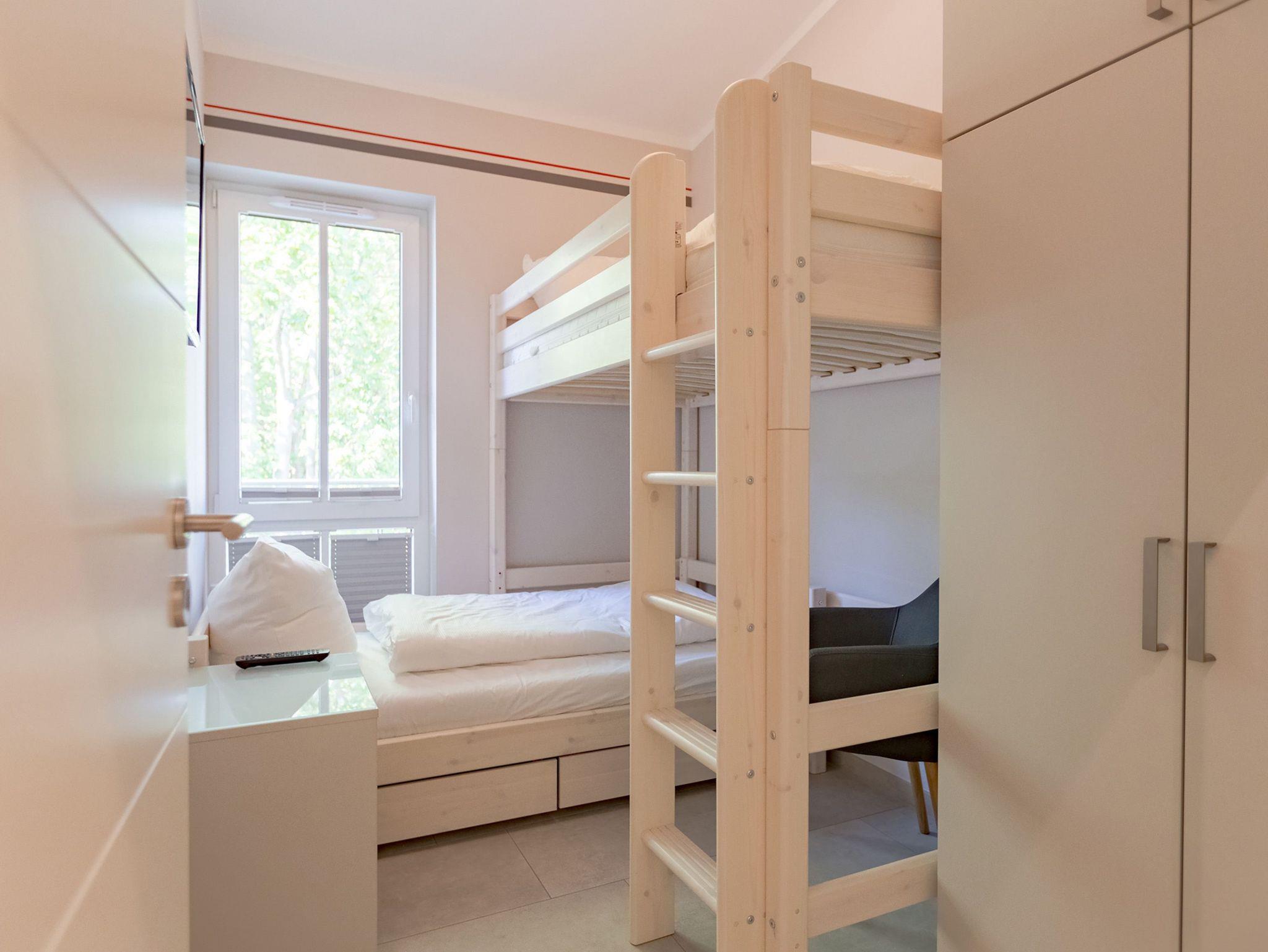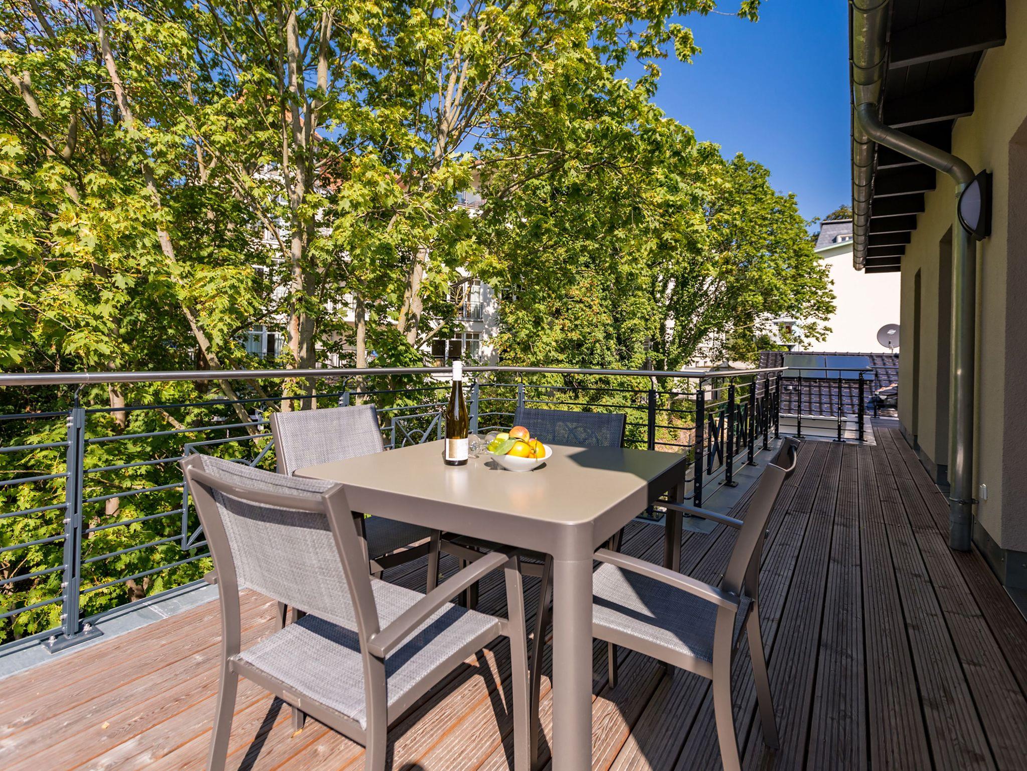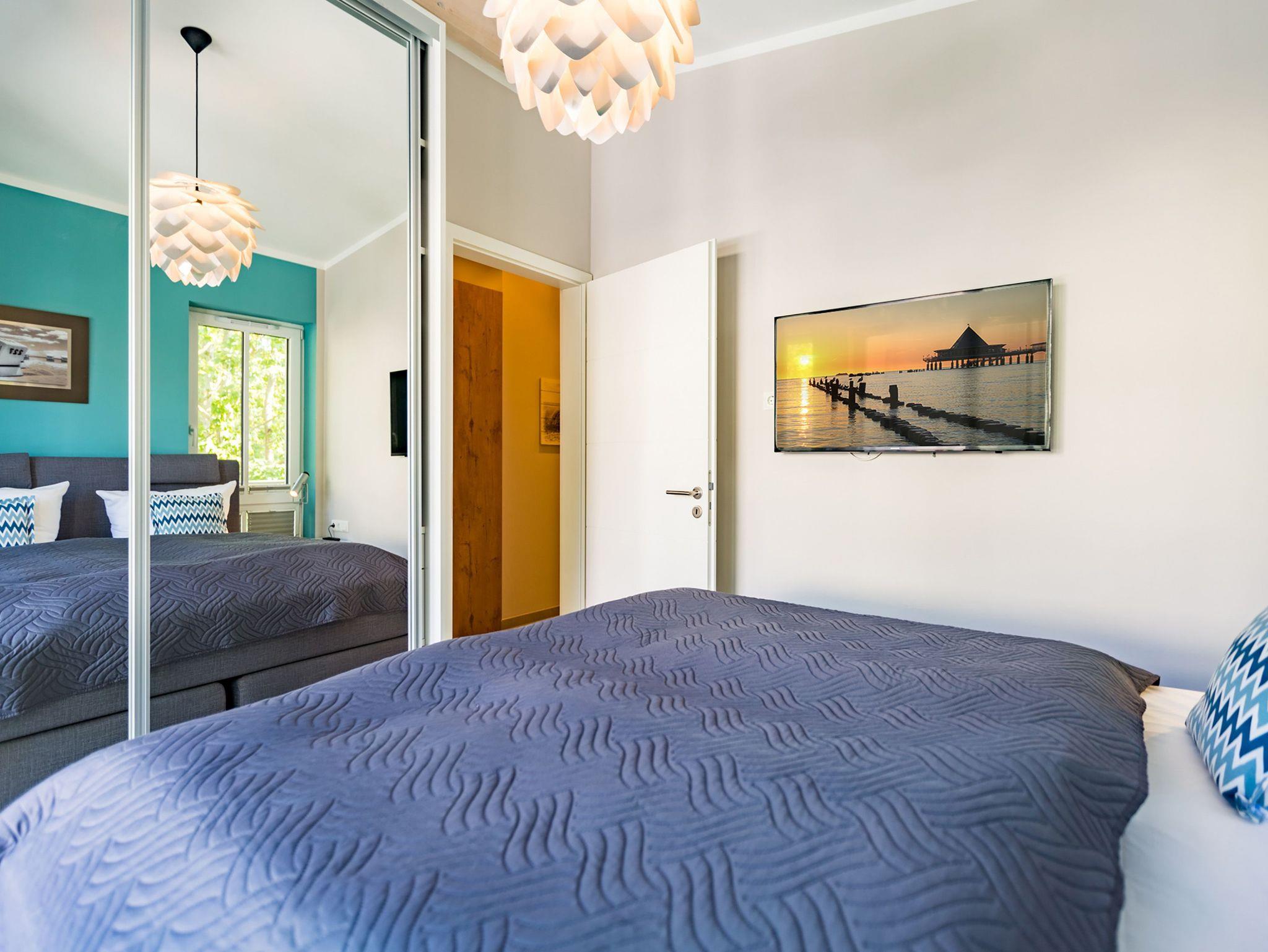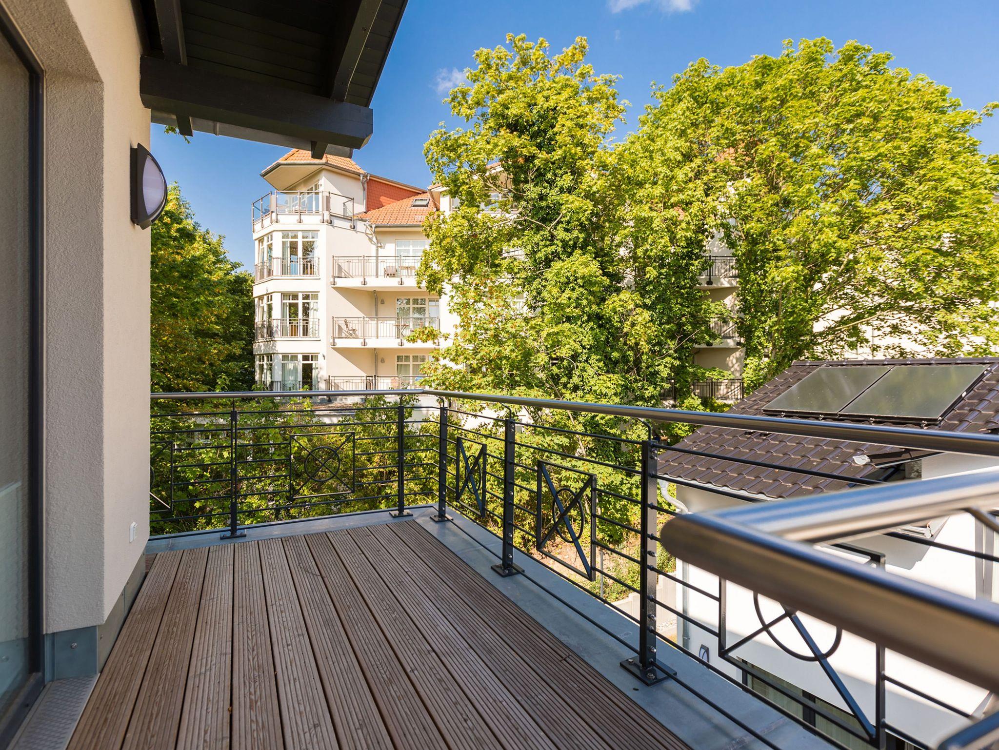 Ideal für Familien macht das 74 Quadratmeter große Appartement direkt unter dem Dach die gemeinsame Auszeit an der Ostsee zu einem unvergesslichen Urlaubserlebnis. Bis zu drei Erwachsenen und einem Kind bis 15 Jahre bietet es ausreichend Platz, den Stress und die Hektik des Alltags einfach mal loszulassen und sich fallenzulassen ins süße Nichtstun in einer angenehmen und entspannenden Atmosphäre. Die drei Räume sind stilvoll und stylisch modern eingerichtet. Es ist alles zu finden, was man sich für einen Urlaub nur wünscht. Inklusive großer Sonnenterrasse. Die ist mit ihren 58 Quadratmetern und der Ausrichtung nach Süd-Ost und Süd-West ein absoluter Traum für Sonnenanbeter. Das Wohn-Esszimmer ist geräumig und strahlt durch den hohen offenen Dachstuhl eine luftig leichte Atmosphäre aus. Ob Kaminofen, Flat-TV, gemütliches Schlafsofa oder bequemer Sessel ? Wohnkomfort der Extra-Klasse erwartet Sie. Zum Wohnzimmer gehören eine offene Küche und ein schöner Essplatz, an dem die ganze Familie Platz findet. Die Küche ist zudem mit hochwertigen Geräten wie einem Induktionsherd oder einer Geschirrspülmaschine und edlem Geschirr voll ausgestattet. Zwei Schlafzimmer wollen erholungshungrige Auszeitler mit schönen Träumen verwöhnen. Ein Schlafzimmer beherbergt ein komfortables Boxspringdoppelbett (1,80 m x 2,00 m), einen Flat-TV und einen großen Schrank für die Urlaubsgarderobe. Das zweite Schlafzimmer verfügt über ein Hochbett (1x 0,90m x 1,90m sowie 1x 0,90m 2,00m), hat ebenfalls einen Flat-TV und einen Schrank und ist mit einem kleinen Schreibtisch eingerichtet. Da schreiben sich die Urlaubsgrüße gleich noch einmal so schön. Das Tageslichtbad hat eine geräumige Regendusche, einen Waschtisch, ein WC und einen Wasch-Trockner. An kühlen Tagen und Abenden wird dieser Raum garantiert Ihr Lieblingsraum werden. Denn er besitzt eine eigene, kleine Finnische Sauna. Das verspricht kuschelige Entspannung. Das Appartement verfügt außerdem über ein separates Gäste-WC. Für einen rundum entspannten Urlaub sind die Betten bei der Ankunft bezogen und Handtücher liegen für Sie bereit. In der Tiefgarage ist ein Stellplatz reserviert.