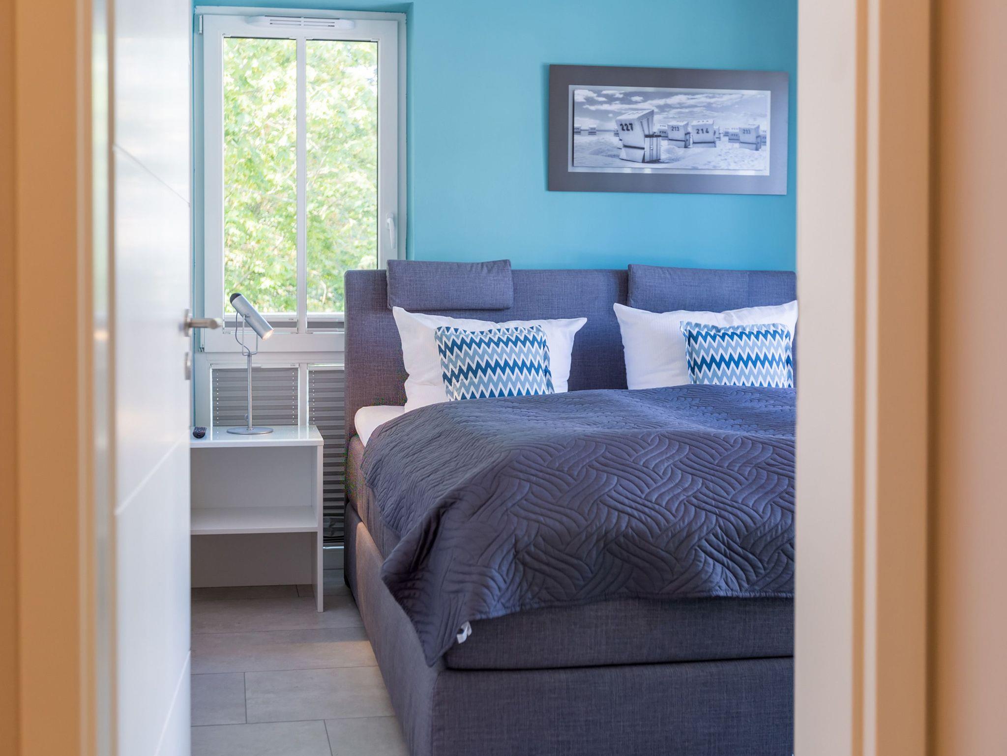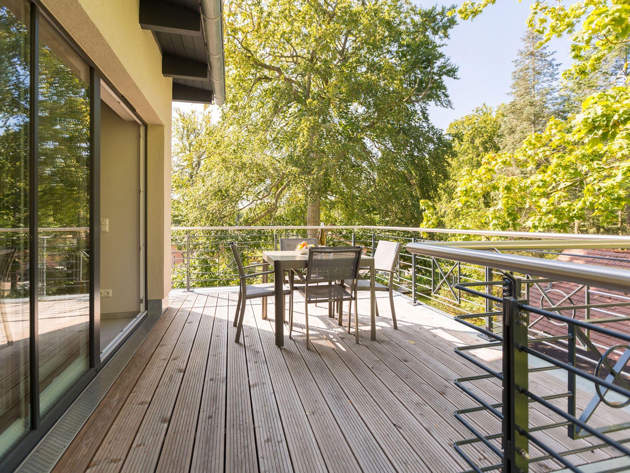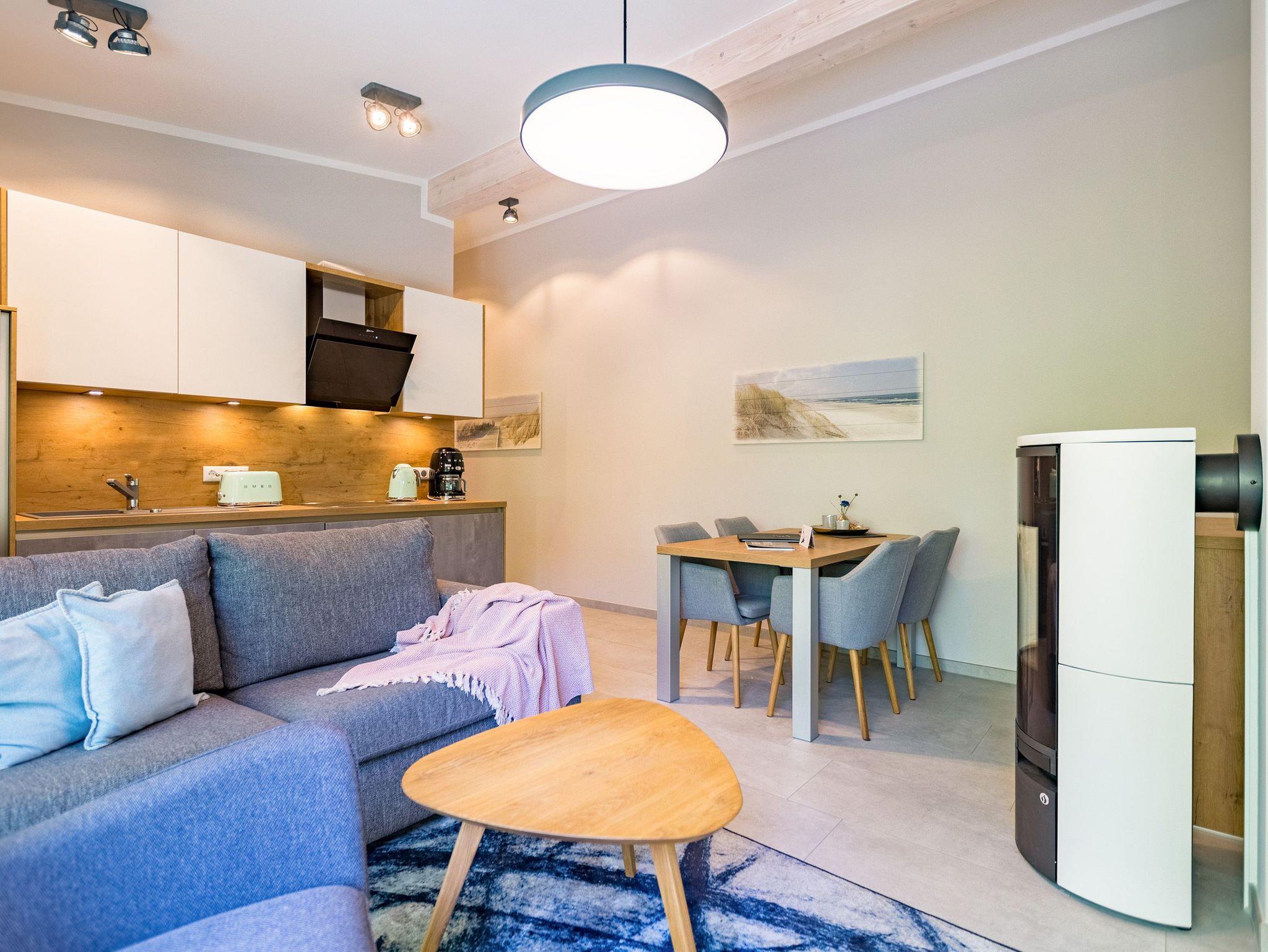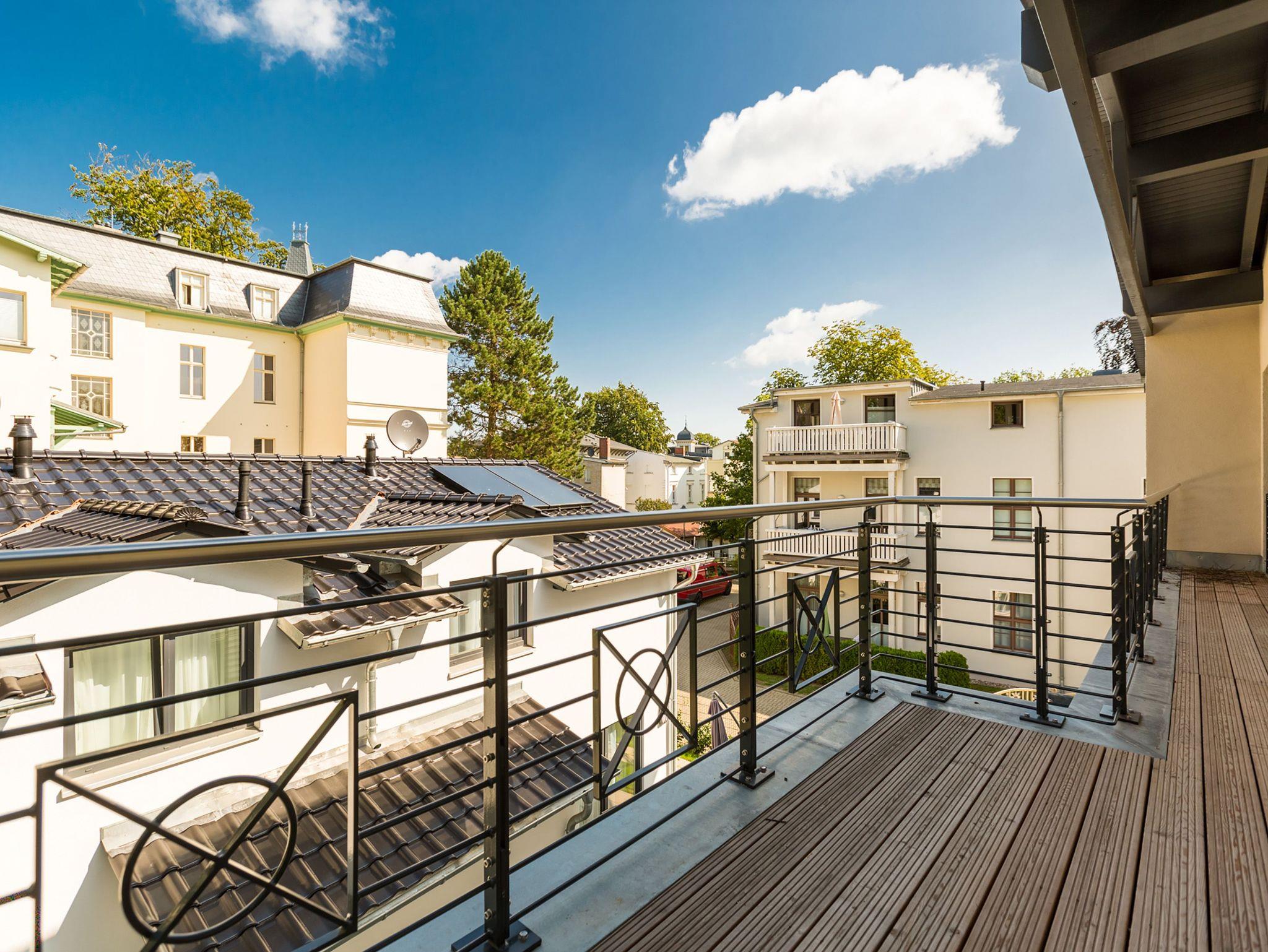 Ideal für Familien macht das 74 Quadratmeter große Appartement direkt unter dem Dach die gemeinsame Auszeit an der Ostsee zu einem unvergesslichen Urlaubserlebnis. Bis zu drei Erwachsenen und einem Kind bis 15 Jahre bietet es ausreichend Platz, den Stress und die Hektik des Alltags einfach mal loszulassen und sich fallenzulassen ins süße Nichtstun in einer angenehmen und entspannenden Atmosphäre. Die drei Räume sind stilvoll und stylisch modern eingerichtet. Es ist alles zu finden, was man sich für einen Urlaub nur wünscht. Inklusive großer Sonnenterrasse. Die ist mit ihren 58 Quadratmetern und der Ausrichtung nach Süd-Ost und Süd-West ein absoluter Traum für Sonnenanbeter. Das Wohn-Esszimmer ist geräumig und strahlt durch den hohen offenen Dachstuhl eine luftig leichte Atmosphäre aus. Ob Kaminofen, Flat-TV, gemütliches Schlafsofa oder bequemer Sessel ? Wohnkomfort der Extra-Klasse erwartet Sie. Zum Wohnzimmer gehören eine offene Küche und ein schöner Essplatz, an dem die ganze Familie Platz findet. Die Küche ist zudem mit hochwertigen Geräten wie einem Induktionsherd oder einer Geschirrspülmaschine und edlem Geschirr voll ausgestattet. Zwei Schlafzimmer wollen erholungshungrige Auszeitler mit schönen Träumen verwöhnen. Ein Schlafzimmer beherbergt ein komfortables Boxspringdoppelbett (1,80 m x 2,00 m), einen Flat-TV und einen großen Schrank für die Urlaubsgarderobe. Das zweite Schlafzimmer verfügt über ein Hochbett (1x 0,90m x 1,90m sowie 1x 0,90m 2,00m), hat ebenfalls einen Flat-TV und einen Schrank und ist mit einem kleinen Schreibtisch eingerichtet. Da schreiben sich die Urlaubsgrüße gleich noch einmal so schön. Das Tageslichtbad hat eine geräumige Regendusche, einen Waschtisch, ein WC und einen Wasch-Trockner. An kühlen Tagen und Abenden wird dieser Raum garantiert Ihr Lieblingsraum werden. Denn er besitzt eine eigene, kleine Finnische Sauna. Das verspricht kuschelige Entspannung. Das Appartement verfügt außerdem über ein separates Gäste-WC. Für einen rundum entspannten Urlaub sind die Betten bei der Ankunft bezogen und Handtücher liegen für Sie bereit. In der Tiefgarage ist ein Stellplatz reserviert.