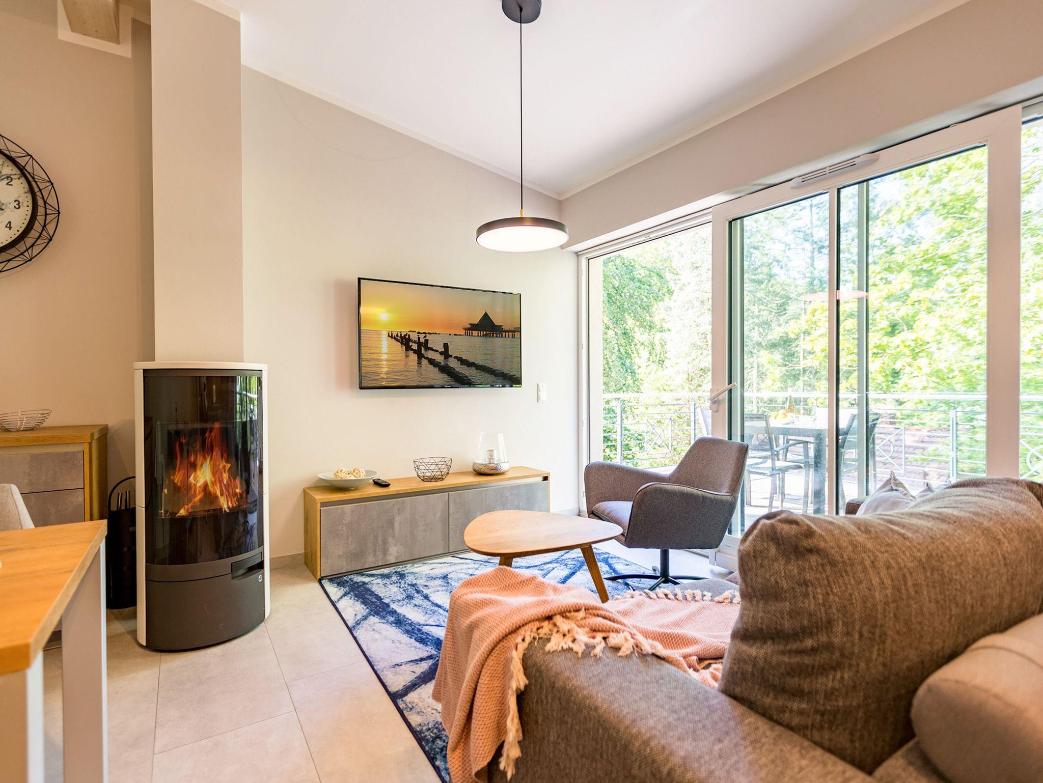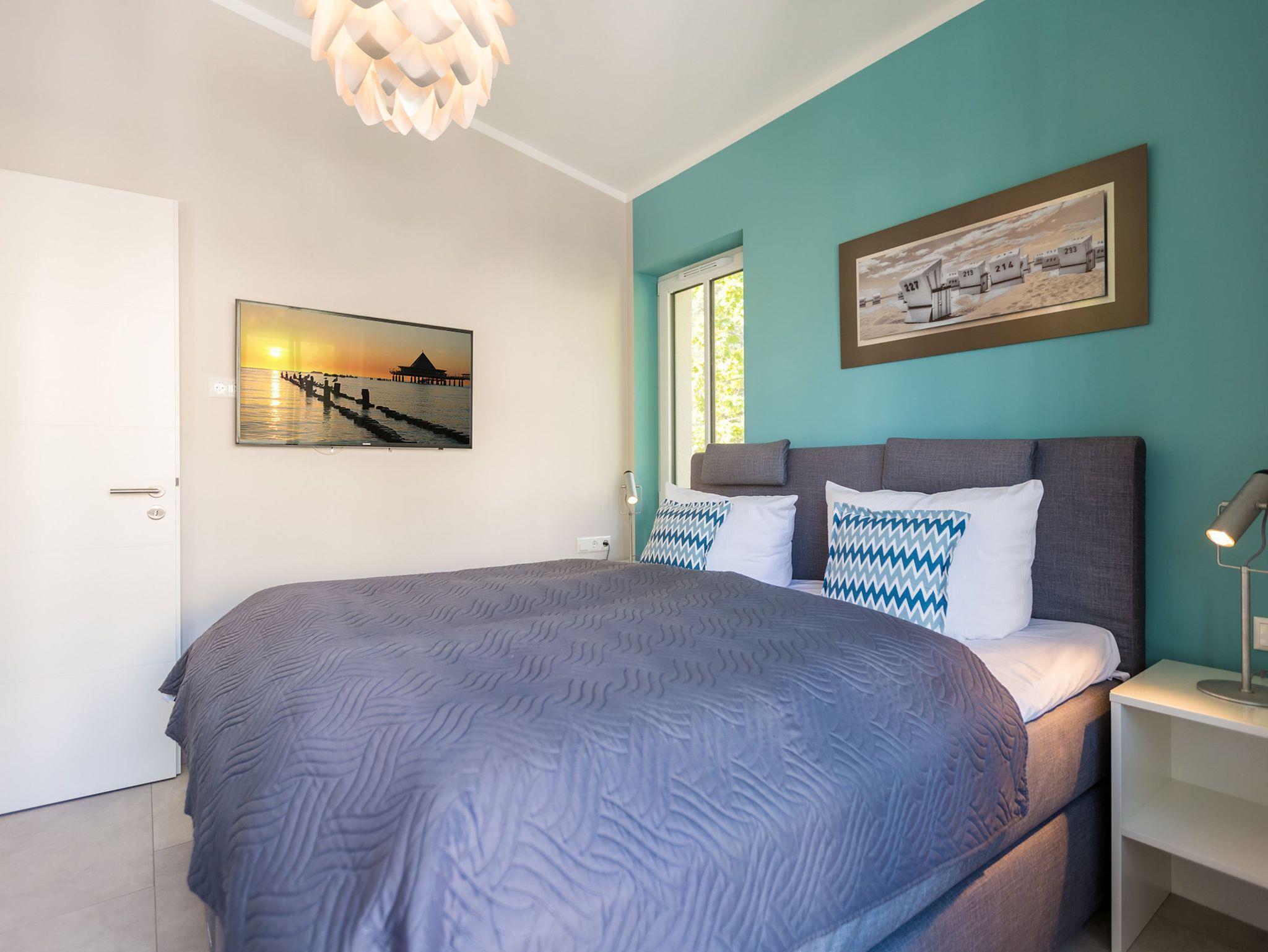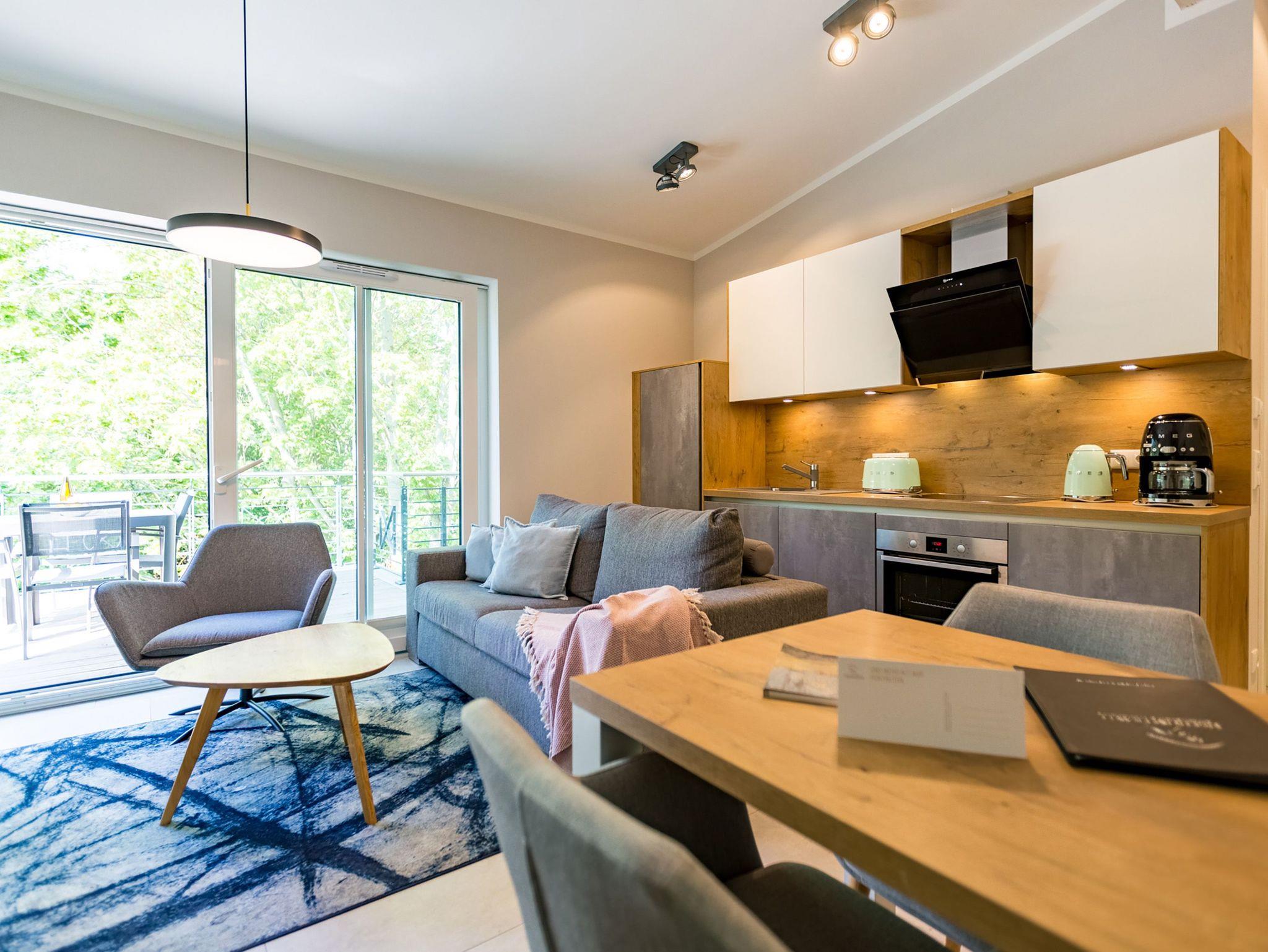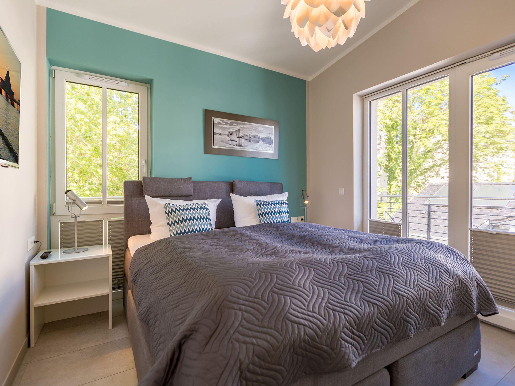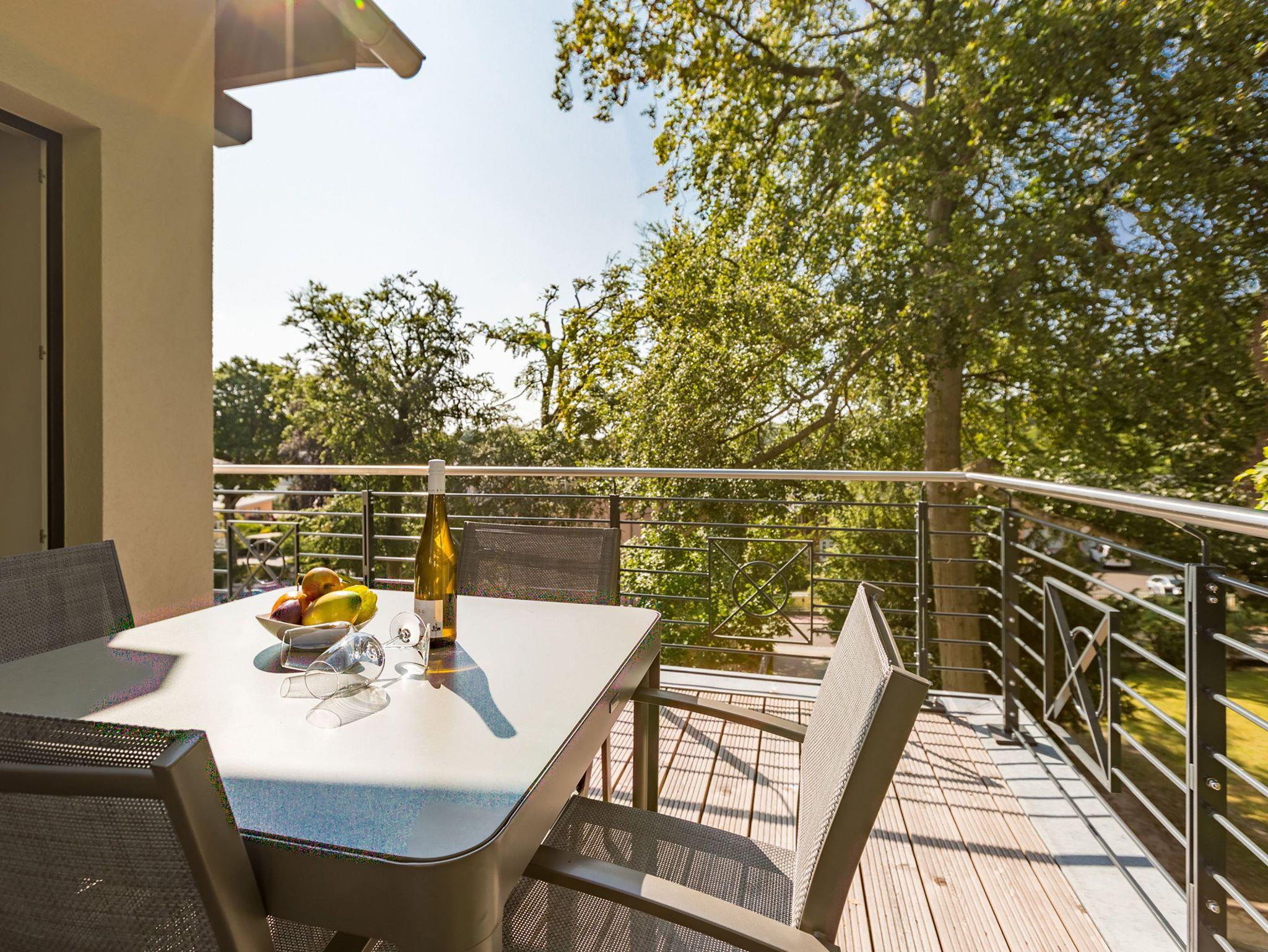 Ideal für Familien macht das 74 Quadratmeter große Appartement direkt unter dem Dach die gemeinsame Auszeit an der Ostsee zu einem unvergesslichen Urlaubserlebnis. Bis zu drei Erwachsenen und einem Kind bis 15 Jahre bietet es ausreichend Platz, den Stress und die Hektik des Alltags einfach mal loszulassen und sich fallenzulassen ins süße Nichtstun in einer angenehmen und entspannenden Atmosphäre. Die drei Räume sind stilvoll und stylisch modern eingerichtet. Es ist alles zu finden, was man sich für einen Urlaub nur wünscht. Inklusive großer Sonnenterrasse. Die ist mit ihren 58 Quadratmetern und der Ausrichtung nach Süd-Ost und Süd-West ein absoluter Traum für Sonnenanbeter. Das Wohn-Esszimmer ist geräumig und strahlt durch den hohen offenen Dachstuhl eine luftig leichte Atmosphäre aus. Ob Kaminofen, Flat-TV, gemütliches Schlafsofa oder bequemer Sessel ? Wohnkomfort der Extra-Klasse erwartet Sie. Zum Wohnzimmer gehören eine offene Küche und ein schöner Essplatz, an dem die ganze Familie Platz findet. Die Küche ist zudem mit hochwertigen Geräten wie einem Induktionsherd oder einer Geschirrspülmaschine und edlem Geschirr voll ausgestattet. Zwei Schlafzimmer wollen erholungshungrige Auszeitler mit schönen Träumen verwöhnen. Ein Schlafzimmer beherbergt ein komfortables Boxspringdoppelbett (1,80 m x 2,00 m), einen Flat-TV und einen großen Schrank für die Urlaubsgarderobe. Das zweite Schlafzimmer verfügt über ein Hochbett (1x 0,90m x 1,90m sowie 1x 0,90m 2,00m), hat ebenfalls einen Flat-TV und einen Schrank und ist mit einem kleinen Schreibtisch eingerichtet. Da schreiben sich die Urlaubsgrüße gleich noch einmal so schön. Das Tageslichtbad hat eine geräumige Regendusche, einen Waschtisch, ein WC und einen Wasch-Trockner. An kühlen Tagen und Abenden wird dieser Raum garantiert Ihr Lieblingsraum werden. Denn er besitzt eine eigene, kleine Finnische Sauna. Das verspricht kuschelige Entspannung. Das Appartement verfügt außerdem über ein separates Gäste-WC. Für einen rundum entspannten Urlaub sind die Betten bei der Ankunft bezogen und Handtücher liegen für Sie bereit. In der Tiefgarage ist ein Stellplatz reserviert.