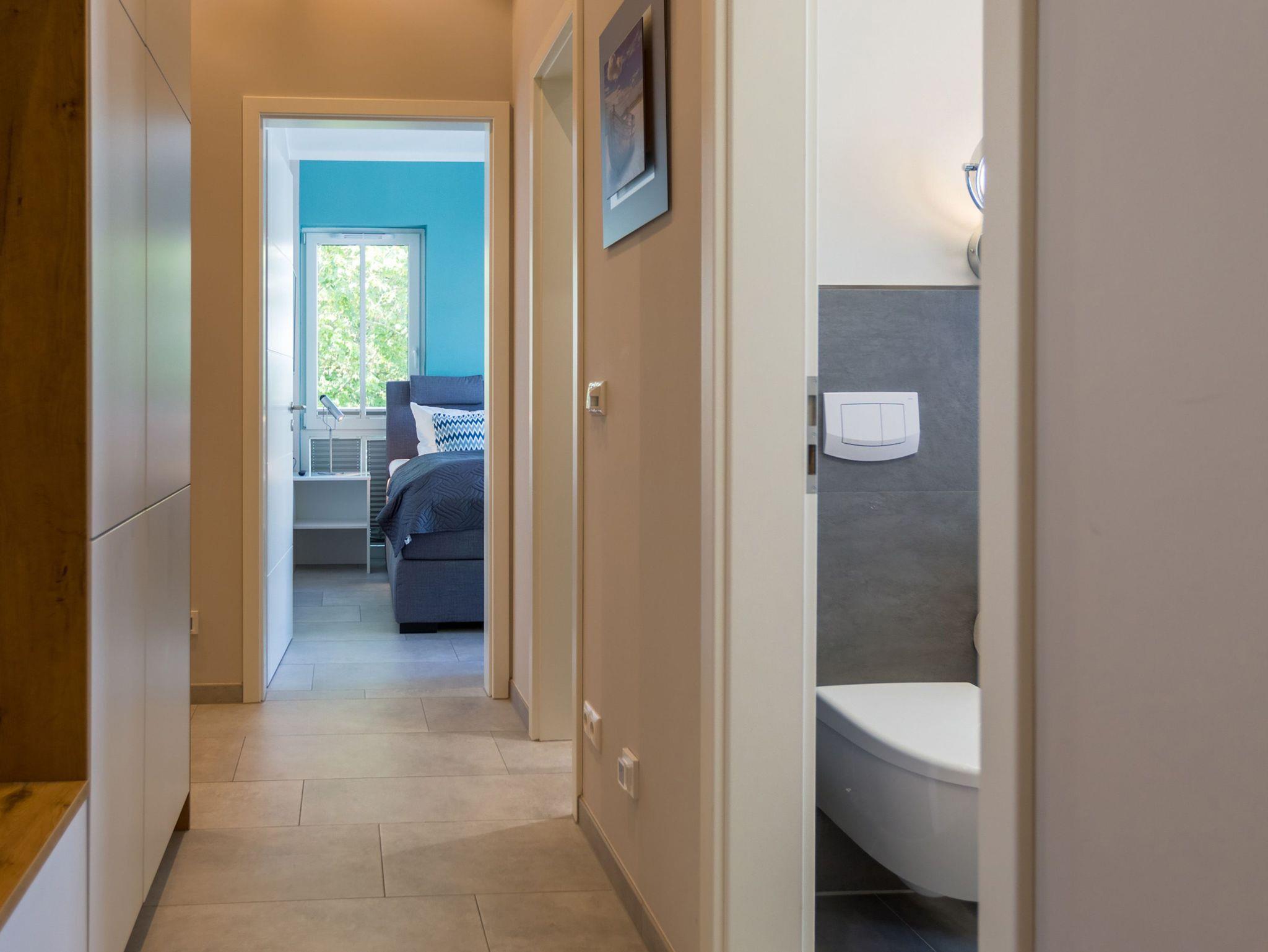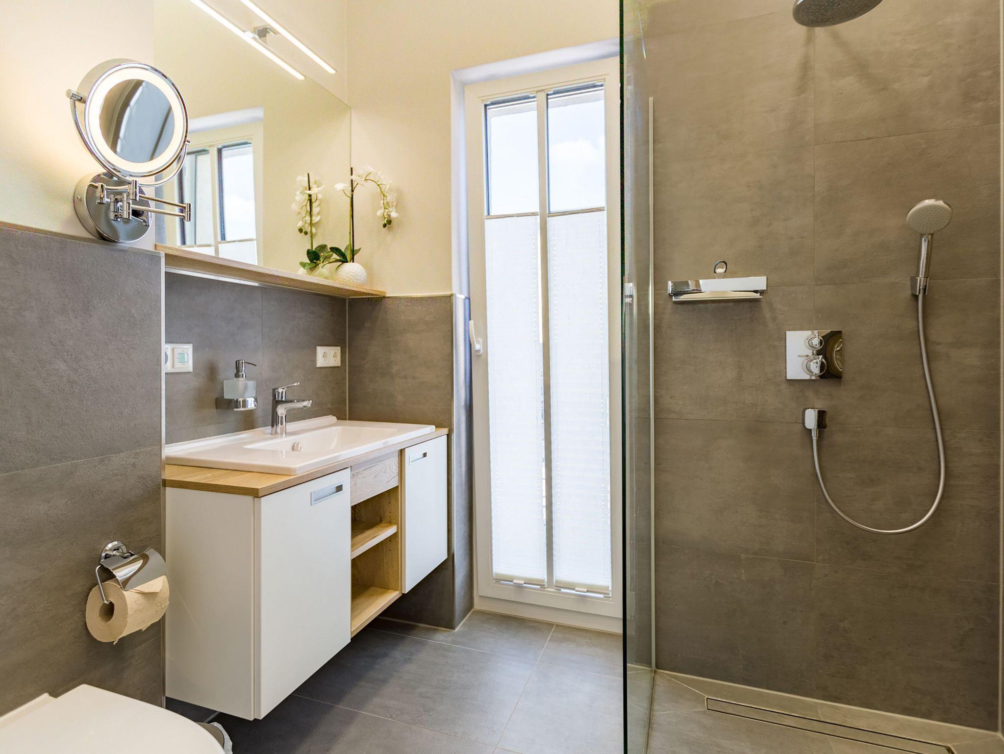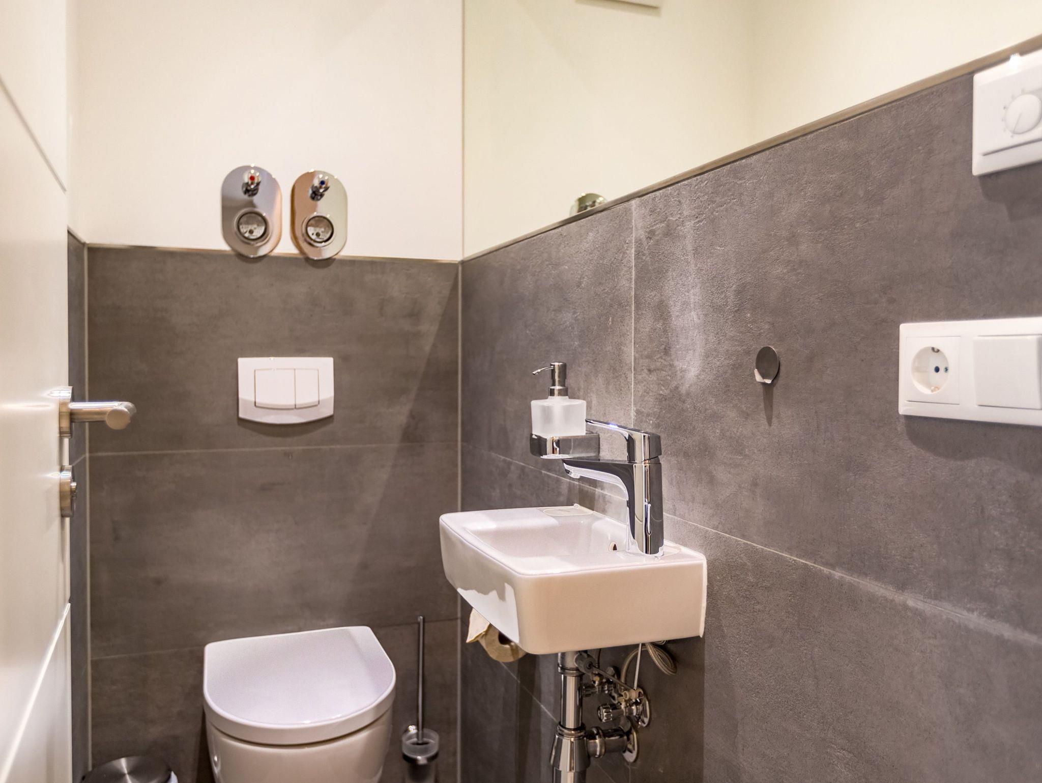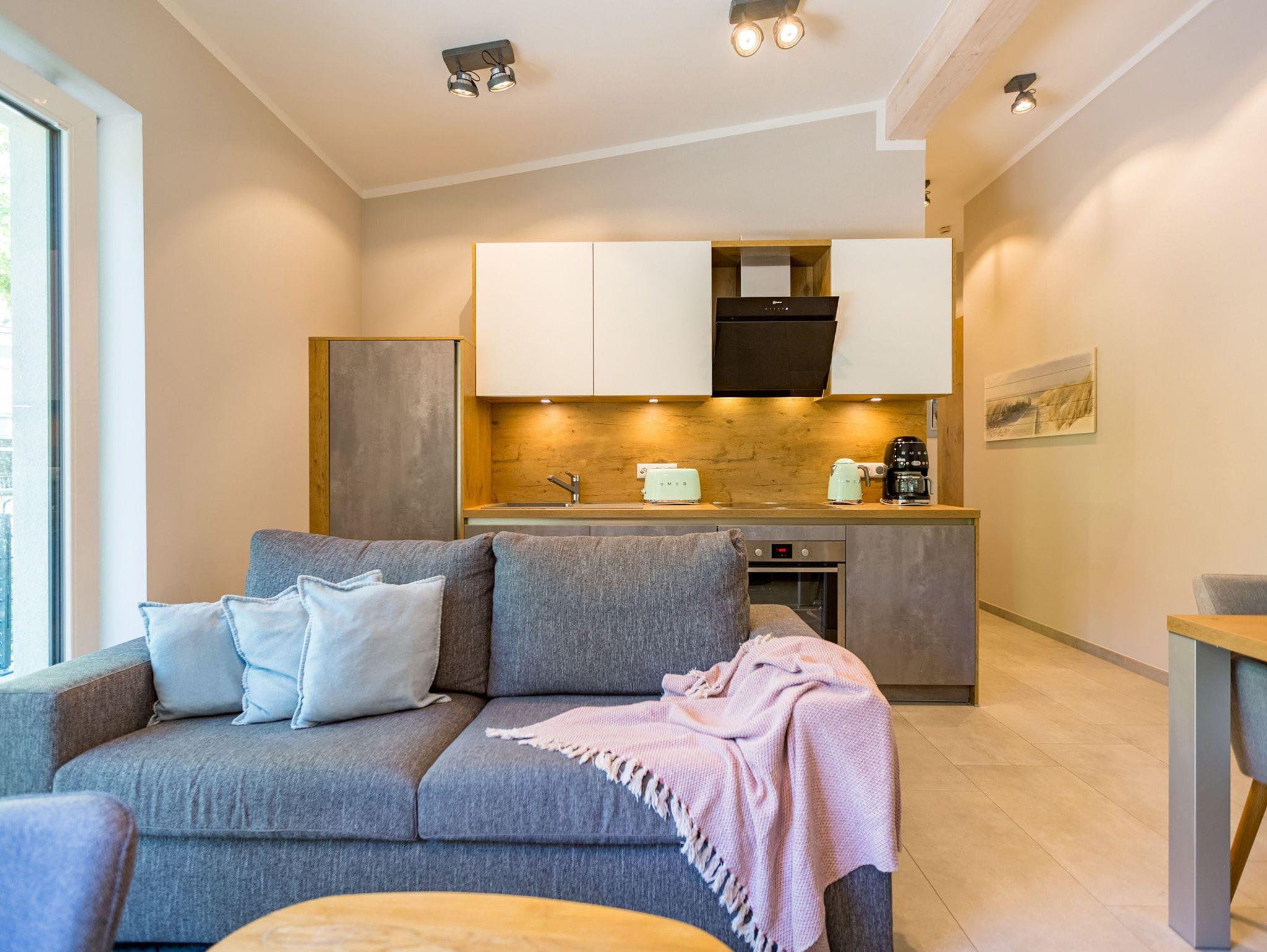 Ideal für Familien macht das 74 Quadratmeter große Appartement direkt unter dem Dach die gemeinsame Auszeit an der Ostsee zu einem unvergesslichen Urlaubserlebnis. Bis zu drei Erwachsenen und einem Kind bis 15 Jahre bietet es ausreichend Platz, den Stress und die Hektik des Alltags einfach mal loszulassen und sich fallenzulassen ins süße Nichtstun in einer angenehmen und entspannenden Atmosphäre. Die drei Räume sind stilvoll und stylisch modern eingerichtet. Es ist alles zu finden, was man sich für einen Urlaub nur wünscht. Inklusive großer Sonnenterrasse. Die ist mit ihren 58 Quadratmetern und der Ausrichtung nach Süd-Ost und Süd-West ein absoluter Traum für Sonnenanbeter. Das Wohn-Esszimmer ist geräumig und strahlt durch den hohen offenen Dachstuhl eine luftig leichte Atmosphäre aus. Ob Kaminofen, Flat-TV, gemütliches Schlafsofa oder bequemer Sessel ? Wohnkomfort der Extra-Klasse erwartet Sie. Zum Wohnzimmer gehören eine offene Küche und ein schöner Essplatz, an dem die ganze Familie Platz findet. Die Küche ist zudem mit hochwertigen Geräten wie einem Induktionsherd oder einer Geschirrspülmaschine und edlem Geschirr voll ausgestattet. Zwei Schlafzimmer wollen erholungshungrige Auszeitler mit schönen Träumen verwöhnen. Ein Schlafzimmer beherbergt ein komfortables Boxspringdoppelbett (1,80 m x 2,00 m), einen Flat-TV und einen großen Schrank für die Urlaubsgarderobe. Das zweite Schlafzimmer verfügt über ein Hochbett (1x 0,90m x 1,90m sowie 1x 0,90m 2,00m), hat ebenfalls einen Flat-TV und einen Schrank und ist mit einem kleinen Schreibtisch eingerichtet. Da schreiben sich die Urlaubsgrüße gleich noch einmal so schön. Das Tageslichtbad hat eine geräumige Regendusche, einen Waschtisch, ein WC und einen Wasch-Trockner. An kühlen Tagen und Abenden wird dieser Raum garantiert Ihr Lieblingsraum werden. Denn er besitzt eine eigene, kleine Finnische Sauna. Das verspricht kuschelige Entspannung. Das Appartement verfügt außerdem über ein separates Gäste-WC. Für einen rundum entspannten Urlaub sind die Betten bei der Ankunft bezogen und Handtücher liegen für Sie bereit. In der Tiefgarage ist ein Stellplatz reserviert.