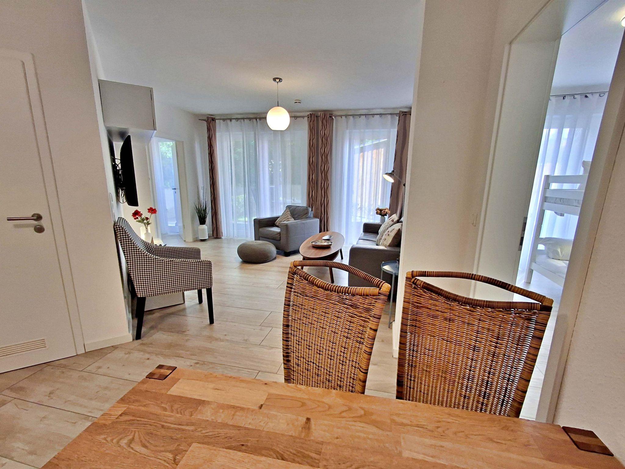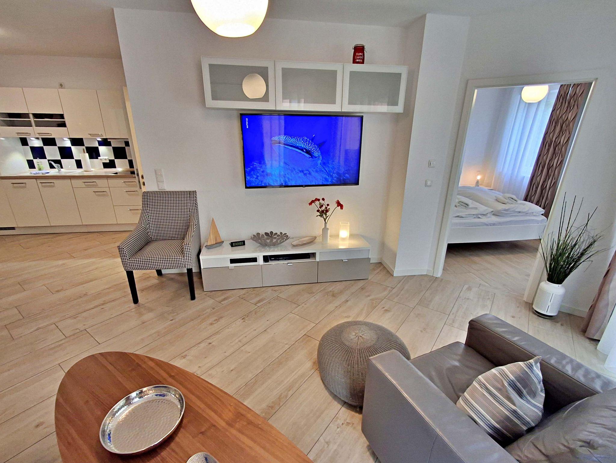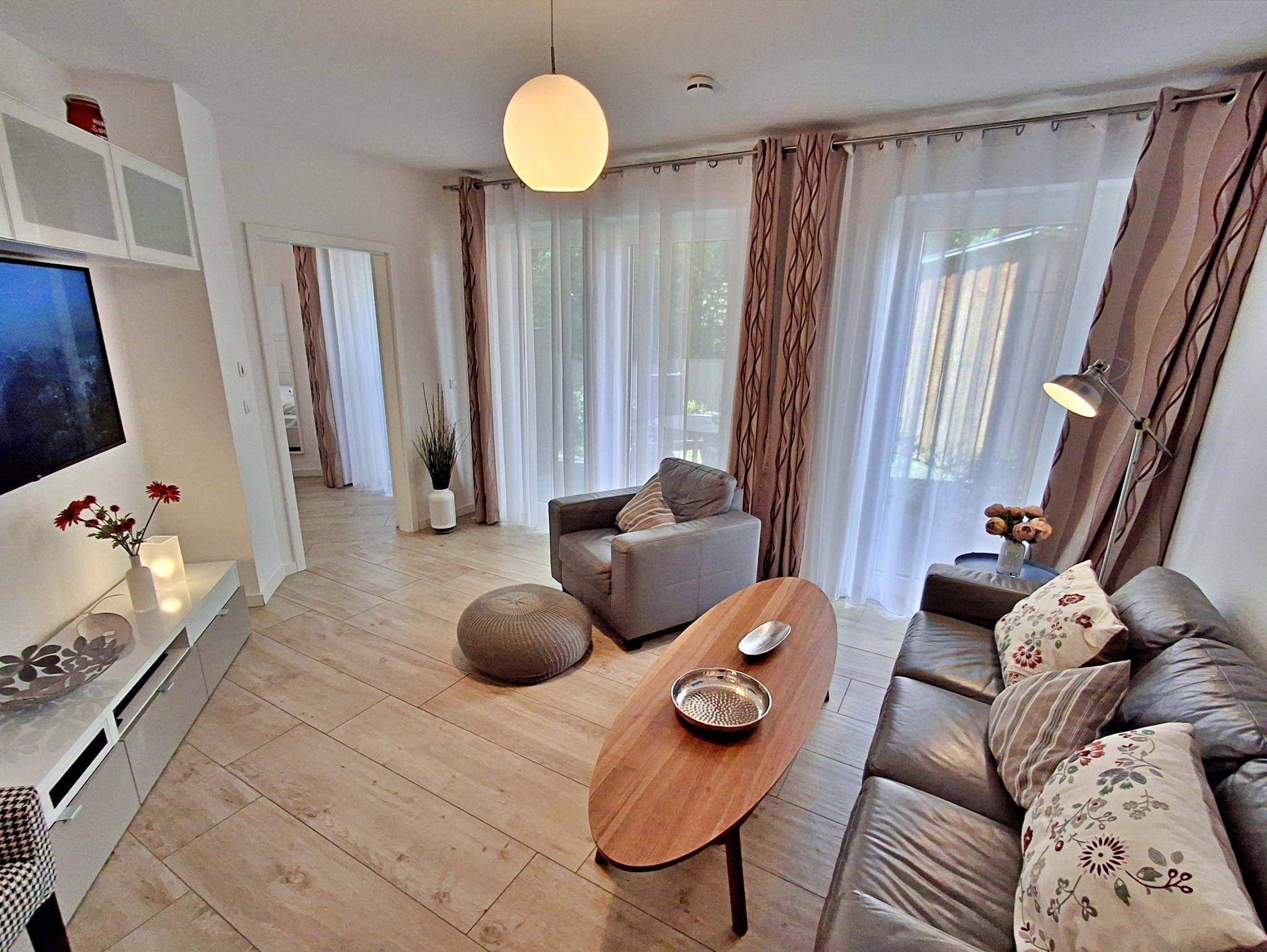 Diese gemütliche Unterkunft im Erdgeschoss bietet auf großzügigen 54 m² ausreichend Platz für bis zu 4 Personen - ideal für eine Familie mit 2 Erwachsenen und 2 Kindern. Im einladenden Wohn- und Essbereich finden Sie eine bequeme Couch, einen Sessel und einen großen Flachbild-TV (55 Zoll), der für entspannte Abende sorgt. Die offene Küche ist komplett ausgestattet und lässt keine Wünsche offen: sie verfügt über ein Induktionskochfeld, Mikrowelle, Heißluftofen, Kühlschrank und Geschirrspüler. Der Essplatz mit 4 Stühlen lädt zu gemeinsamen Mahlzeiten ein. Das erste Schlafzimmer ist mit einem gemütlichen Doppelbett (1,60 x 2 m) ausgestattet, während das zweite Schlafzimmer ein Etagenbett (jeweils 0,90 x 2 m), einen Sekretär und einen weiteren Flachbild-TV bietet. Das moderne Bad verfügt über eine ebenerdige Dusche/WC, eine Handtuchheizung, einen Waschtisch mit Spiegelschrank und einen Fön.