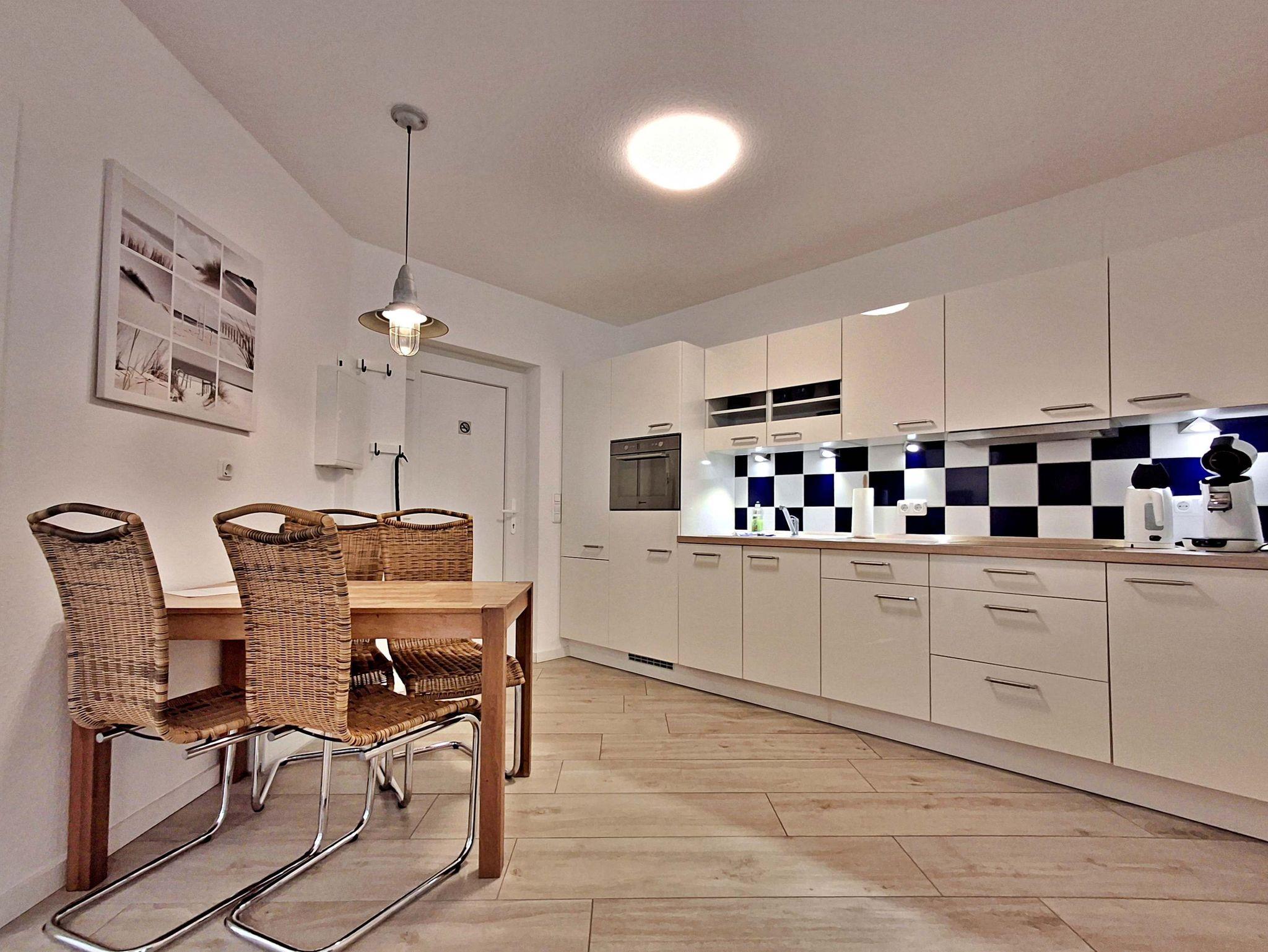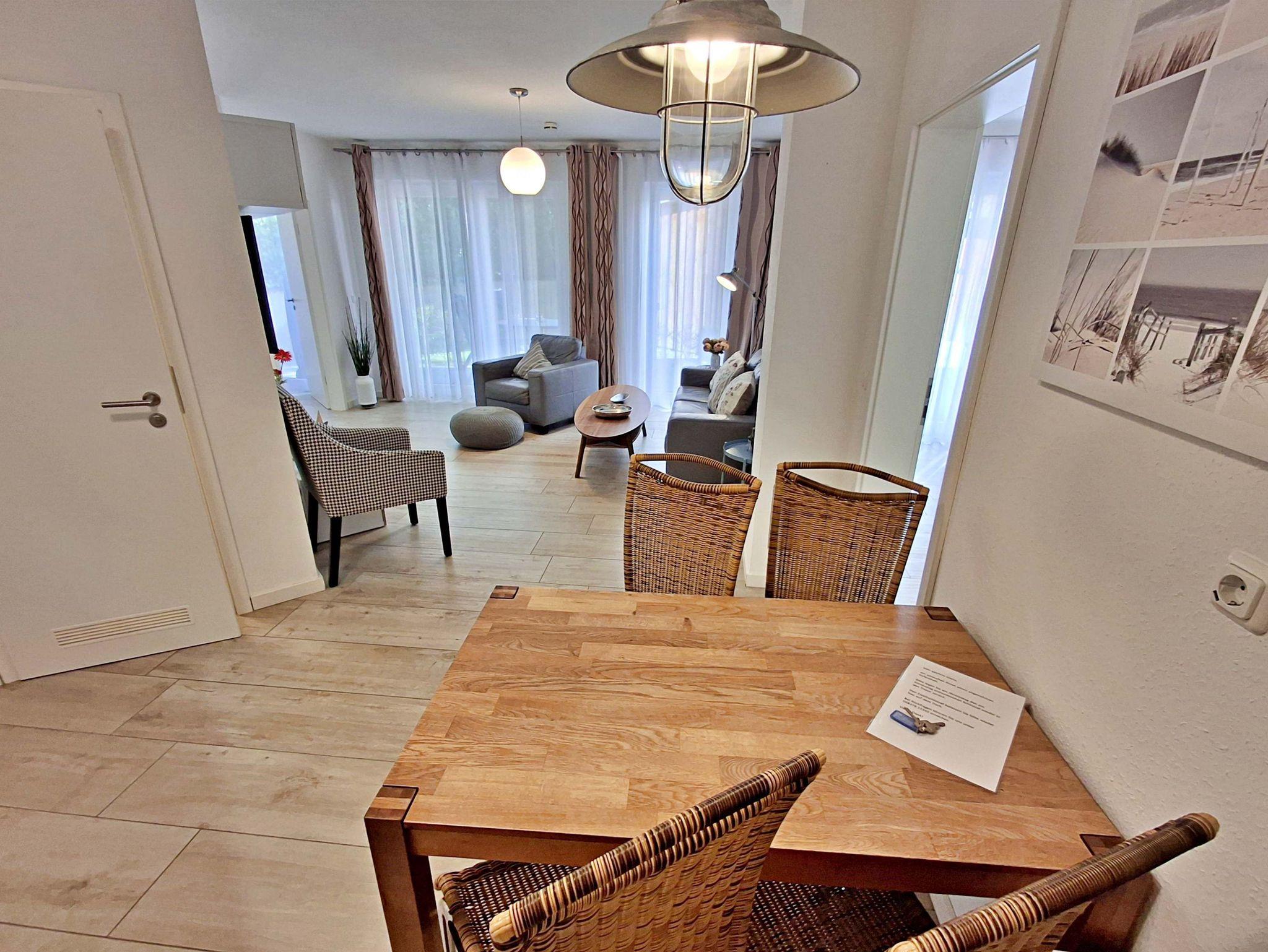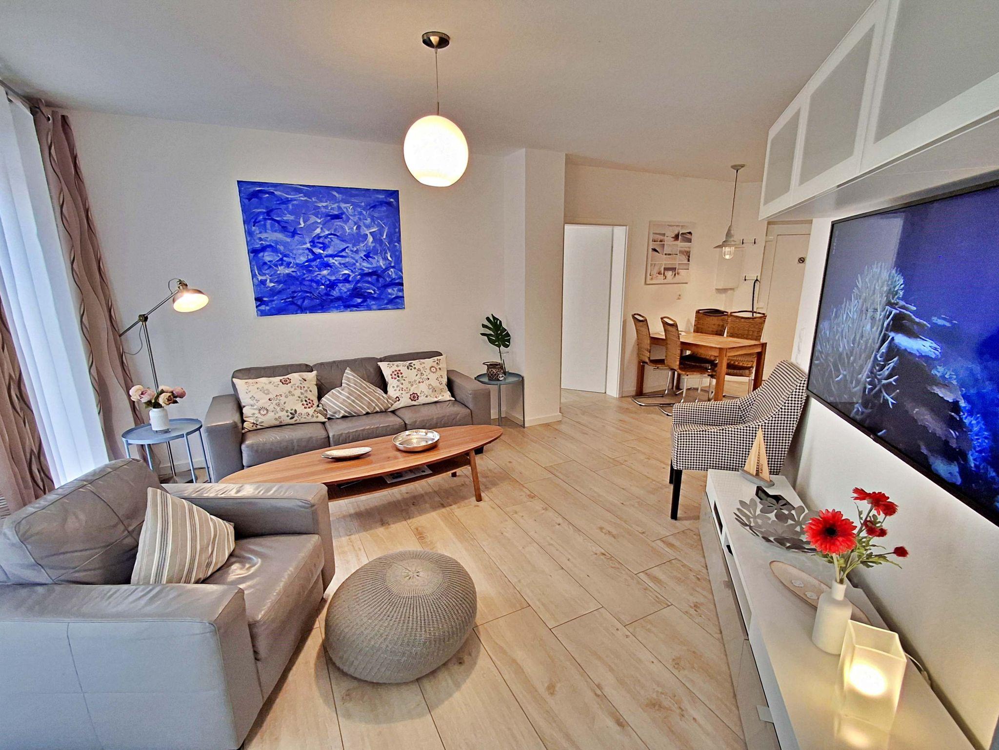 Diese gemütliche Unterkunft im Erdgeschoss bietet auf großzügigen 54 m² ausreichend Platz für bis zu 4 Personen - ideal für eine Familie mit 2 Erwachsenen und 2 Kindern. Im einladenden Wohn- und Essbereich finden Sie eine bequeme Couch, einen Sessel und einen großen Flachbild-TV (55 Zoll), der für entspannte Abende sorgt. Die offene Küche ist komplett ausgestattet und lässt keine Wünsche offen: sie verfügt über ein Induktionskochfeld, Mikrowelle, Heißluftofen, Kühlschrank und Geschirrspüler. Der Essplatz mit 4 Stühlen lädt zu gemeinsamen Mahlzeiten ein. Das erste Schlafzimmer ist mit einem gemütlichen Doppelbett (1,60 x 2 m) ausgestattet, während das zweite Schlafzimmer ein Etagenbett (jeweils 0,90 x 2 m), einen Sekretär und einen weiteren Flachbild-TV bietet. Das moderne Bad verfügt über eine ebenerdige Dusche/WC, eine Handtuchheizung, einen Waschtisch mit Spiegelschrank und einen Fön.