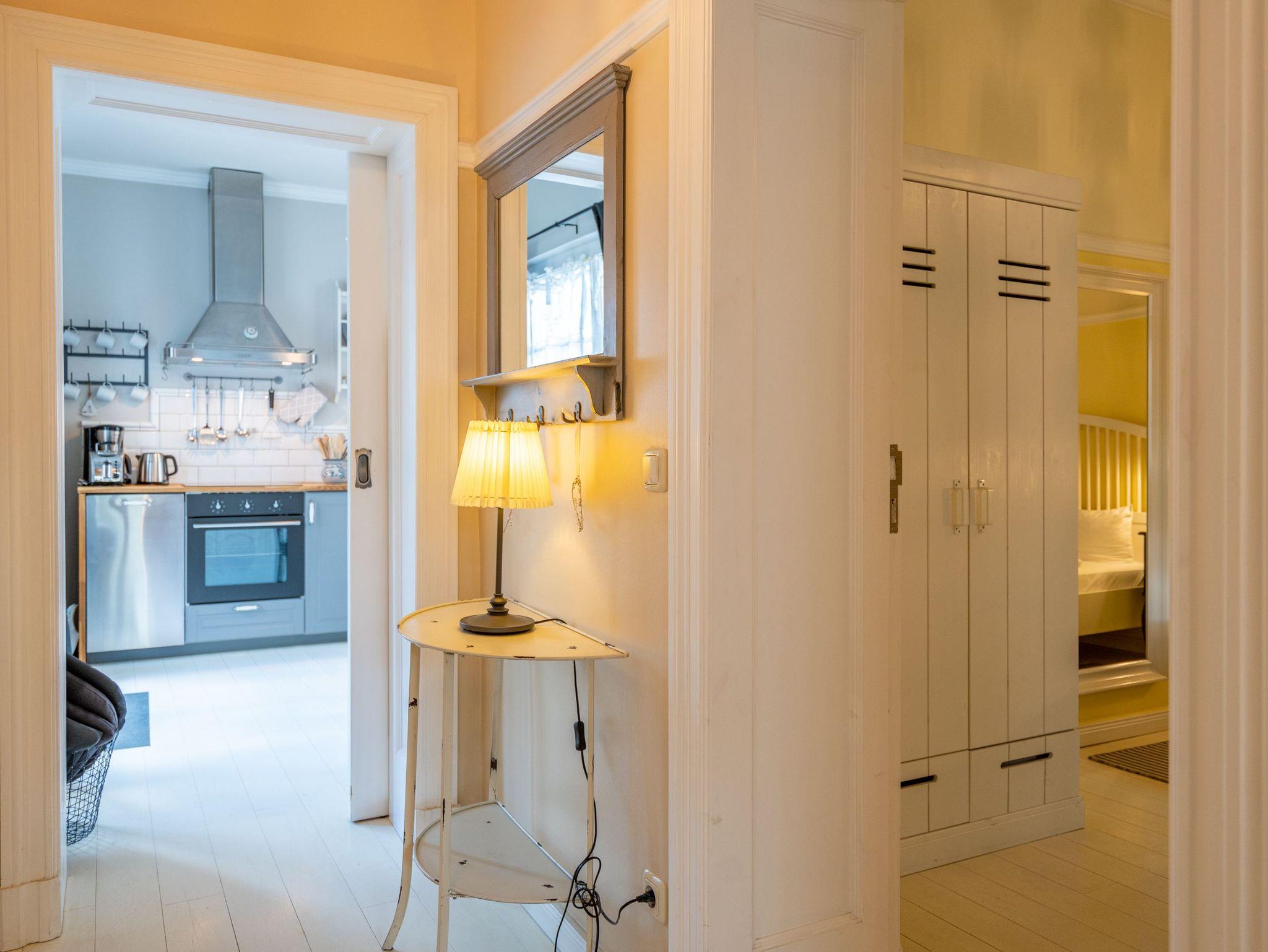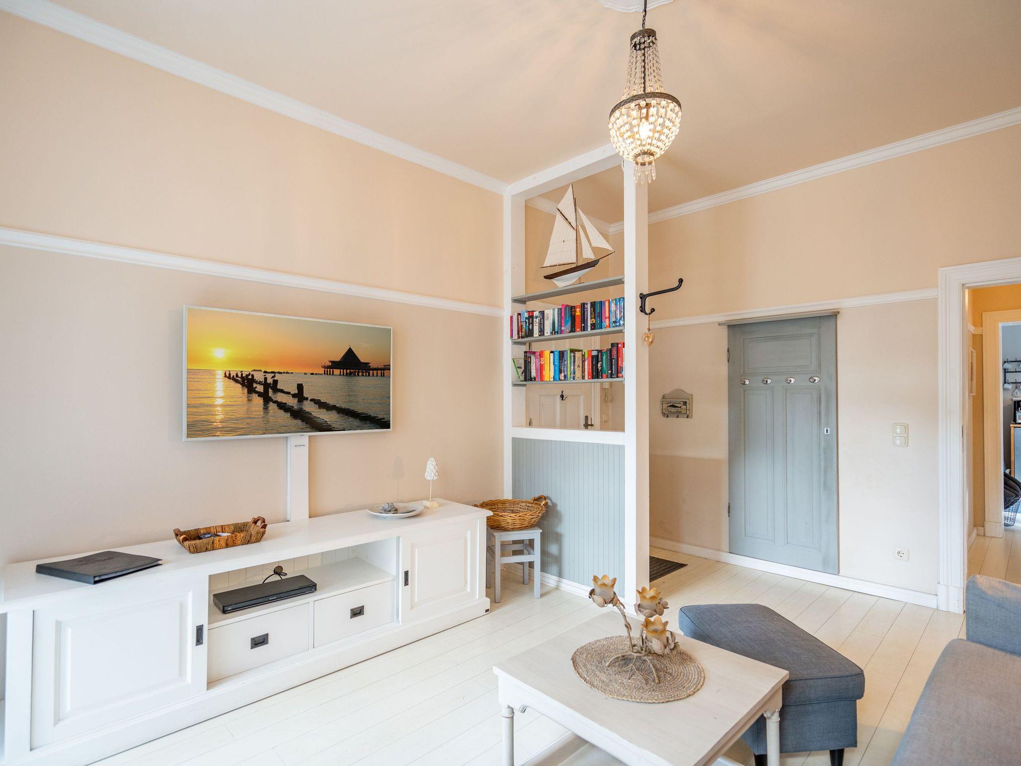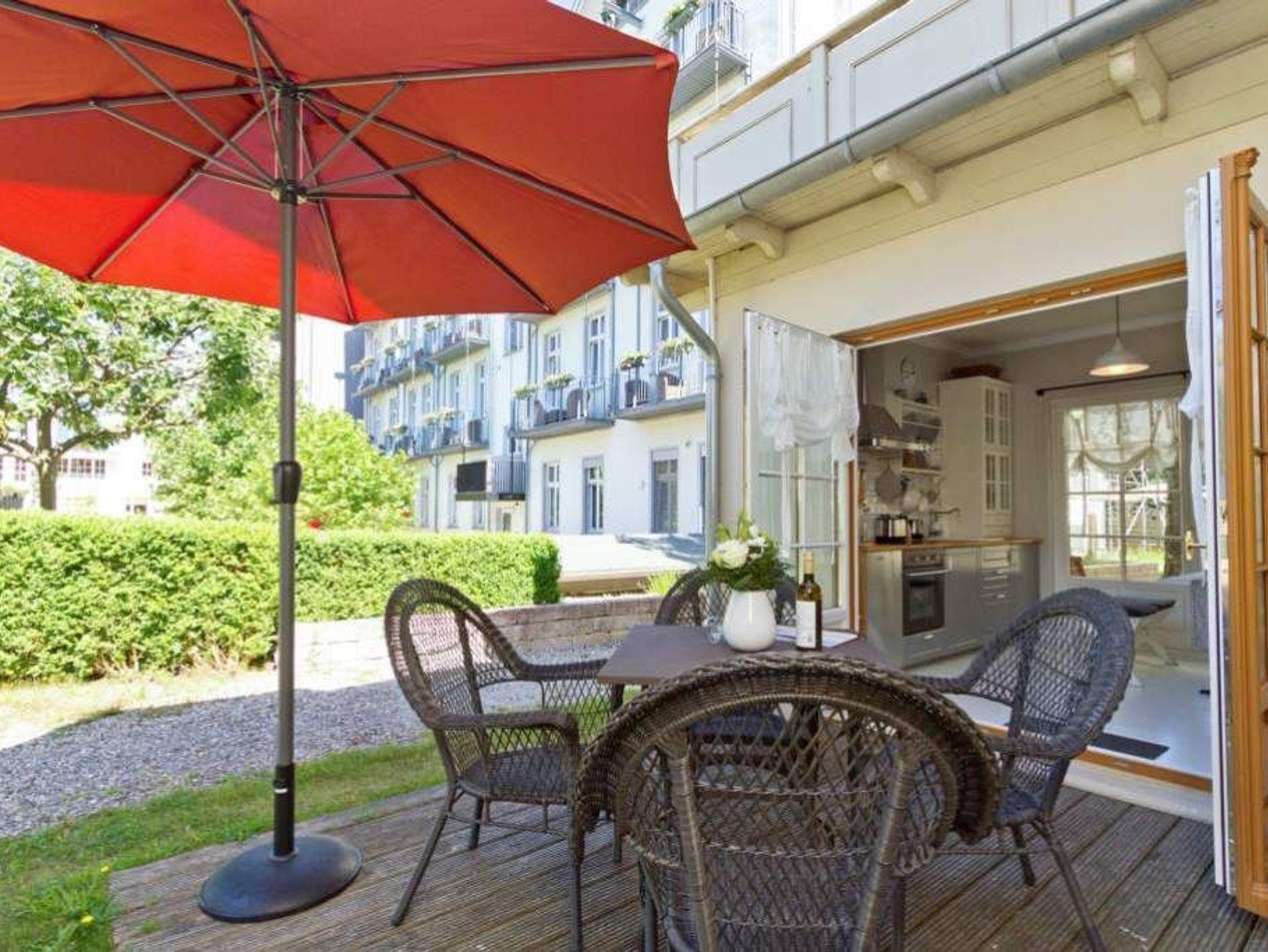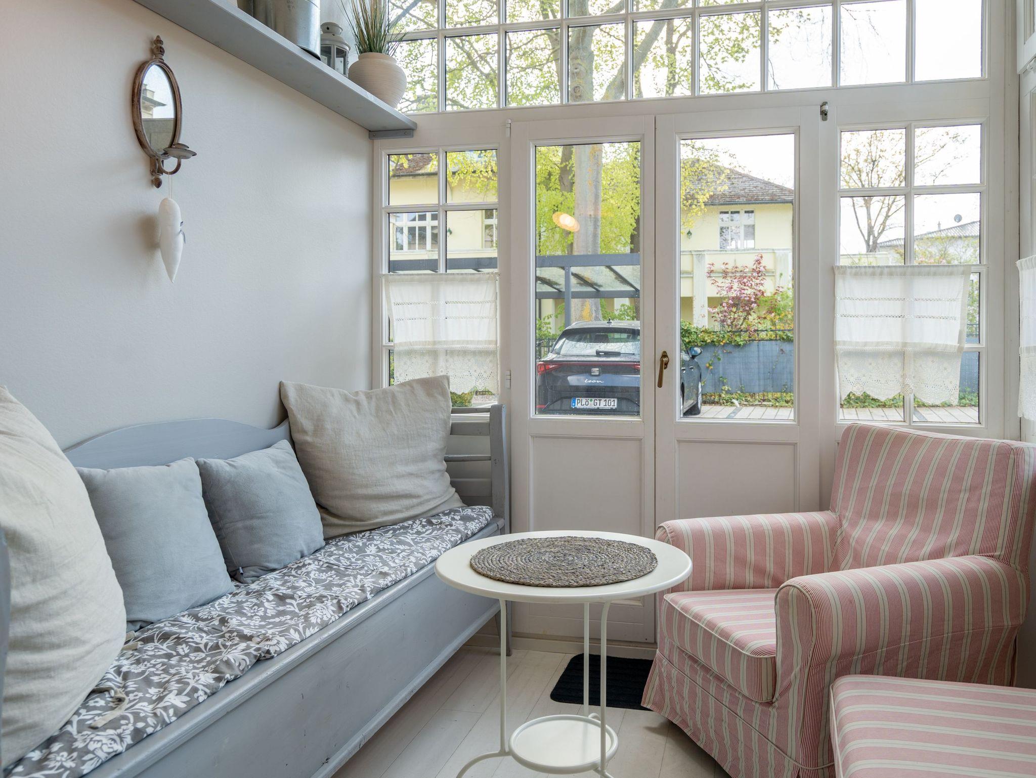Leichtigkeit, Esprit und Charme versprüht unser neues Urlaubsdomizil im Erdgeschoss der Villa Saphira. Ob sie zu zweit oder mit kleiner Familie reisen (2 Erwachsene und 1 Kind bis 5 Jahre), diese 2-Raum-Ferienwohnung ( 59 qm) versprüht sogleich Urlaubsfreude. Helle Farben, ein weißer Holzfußboden und wunderbar kombinierte Möbel verleihen dem Appartement ein ganz besonderes Flair. Der hübsche Wohnbereich ist mit bequemer Sitzgruppe und Flat-TV ausgestattet, die seitliche kleine Veranda mit Bank und Tisch lädt zum Verweilen ein. Das Schlafzimmer mit Doppelbett (1,60m x 2,00m) bietet außerdem eine Schlafmöglichkeit durch ein zusätzliches Juniorbett (0,70m x 1,60m). Die Küche mit angrenzender Terrasse (mit Gartenmöbeln ausgestattet und zur Südseite gelegen) findet in der zweiten Veranda Platz. Luftig und hell mit einer schönen Essgruppe gestaltet, lädt sie ein, ganz entspannt in den Tag zu starten und dabei den Blick auf die Heringsdorfer Promenade zu genießen. Die Wohnung wird komplettiert mit einem Wellnessbad mit einer Finnischen Sauna, Dusche, WC und Waschbecken. Ein Pkw-Stellplatz befindet sich direkt am Haus. Auf Nachfrage ist es möglich ein 2. Kind ( bis 2 Jahre im Kinderreisebett) mitzubringen. Bei Ihrer Anreise sind die Betten bezogen und Handtücher liegen bereit (als Erstausstattung). Das WLAN-Netz im Haus kann kostenfrei genutzt werden. Für den Tag am Meer steht Ihnen von Mitte Mai bis September (je nach Witterung) ein Strandkorb am Strand zur Verfügung. Sie planen einen größeren Familienausflug - dann lässt sich diese Wohnung super mit der Wohnung 07 ( im Obergeschoss) kombinieren. Beide Appartements befinden sich in einem Haus und sind über den selben Haupteingang zu nutzen.