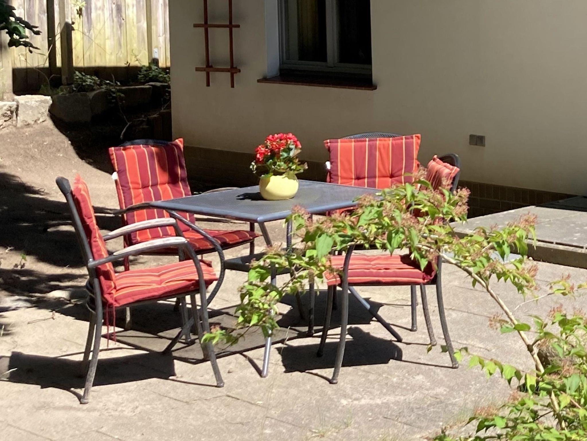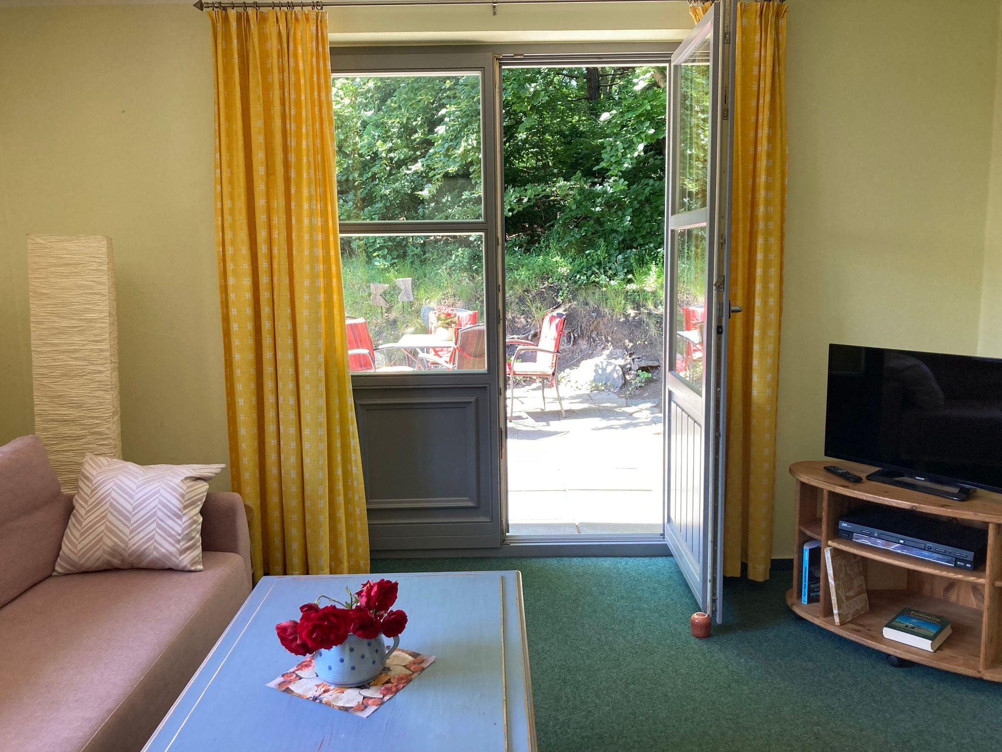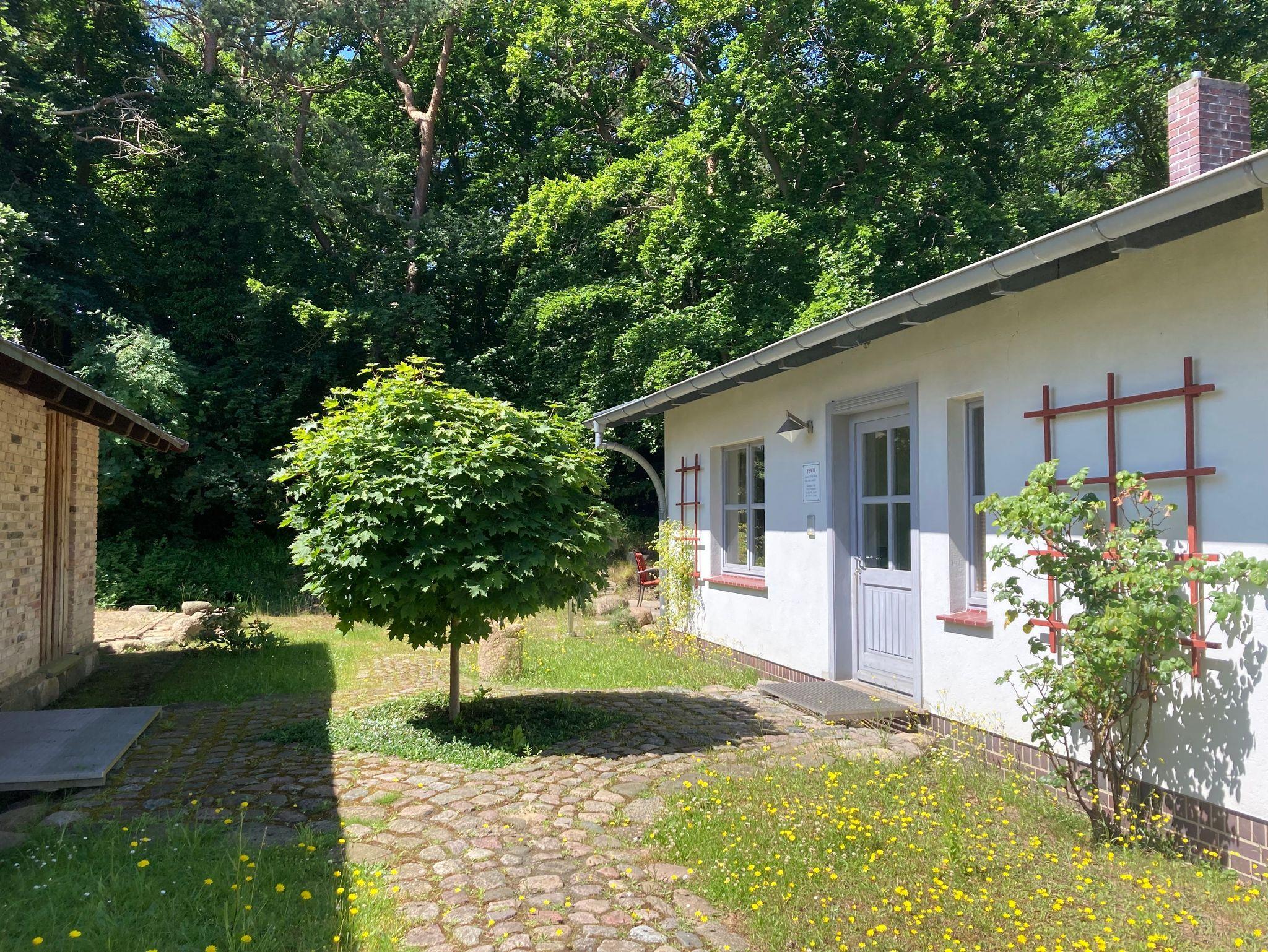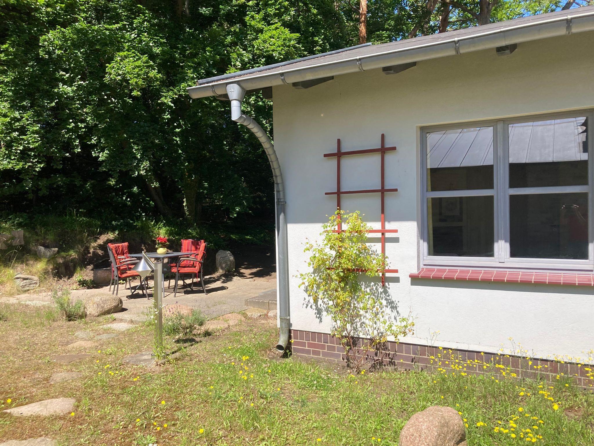 Guten Tag und herzlich Willkommen- ausspannen, abschalten und RUHE finden-dann sind Sie bei uns richtig in der historischen Delbrückstraße. Wohnen zur ebenen Erde auf einem Naturgrundstück-um dann in 3 Minuten am Ostseestrand zu sein und auf der schönen Promenade zu flanieren.Wir bieten nur dieses eine Ferienhaus z.Zt. auf unserem Grundstück mit dieser einen Ferienwohnung an-der andere Teil des Gebäudes ist eine kleine Tierarztpraxis der Vermieterin. Es bietet Platz für 5 Personen-auf 56m² Wohnfläche. Der schöne Mischwald am Grundstück versprüht zu allen Jahreszeiten seine Reize.Zwischen Ferienhausgiebel und dem Wald liegt idyllisch die Terrasse. Die Haushälfte(56m² Wohnfläche + 16m² Terrasse) liegt sehr ruhig -so stellt man sich Urlaub vor! Das FH enthält folgende Räume: 1Sz 16m² mit großem Doppelbett(2x2.1m) gr.2 tür. Kleiderschrank,Sidebord mit Schubfächer, hier ist auch der Platz für eine Metallklappliege 90x2,00m als Kinderaufbettung , 1 Wz 16m² mit Schlafsofa für 2 Personen 1,50x2.00m,kl.Tisch ,Sessel und Flachbildfernseher, ( die eine Metallklappliege für das Sz. als zusätzliche Kinderaufbettung kann auch hier im Wz. Platz finden und auch ein Erwachsener liegt hier gut drauf) 1 Küchenwohnraum 12m² mit Miniküche mit Kühlschrank und 17l Frostfach und Spüler daneben +Eßtisch -ausziehbar- mit 5 Schwingern+ Vitrine für ausreichend Geschirr u.Gläser+2 Hochregale für notwendiges Zubehör,wie:Kaffeemaschine,Toaster,Wasserkocher und Eierkocher, solider Kleinbackofen mit Grillfunktion (Rommelsbacher BG 1805/E, eine andere Eingabe als 'Backofen' war im Buchungssystem nicht möglich!) ; 1 Flur 6m² mit Garderobe; 1Bad 6m² mit Dusche 90x90 Eckeinstieg und Lüftungsfenster. Unser FH ist eingebettet in eine natürliche Umgebung mit niedriger Wohnbebaung (keiner guckt auf die Terrasse) und liegt ca. 40m ab von der Straße- so wird Ihr Urlaub zum Erlebnis.