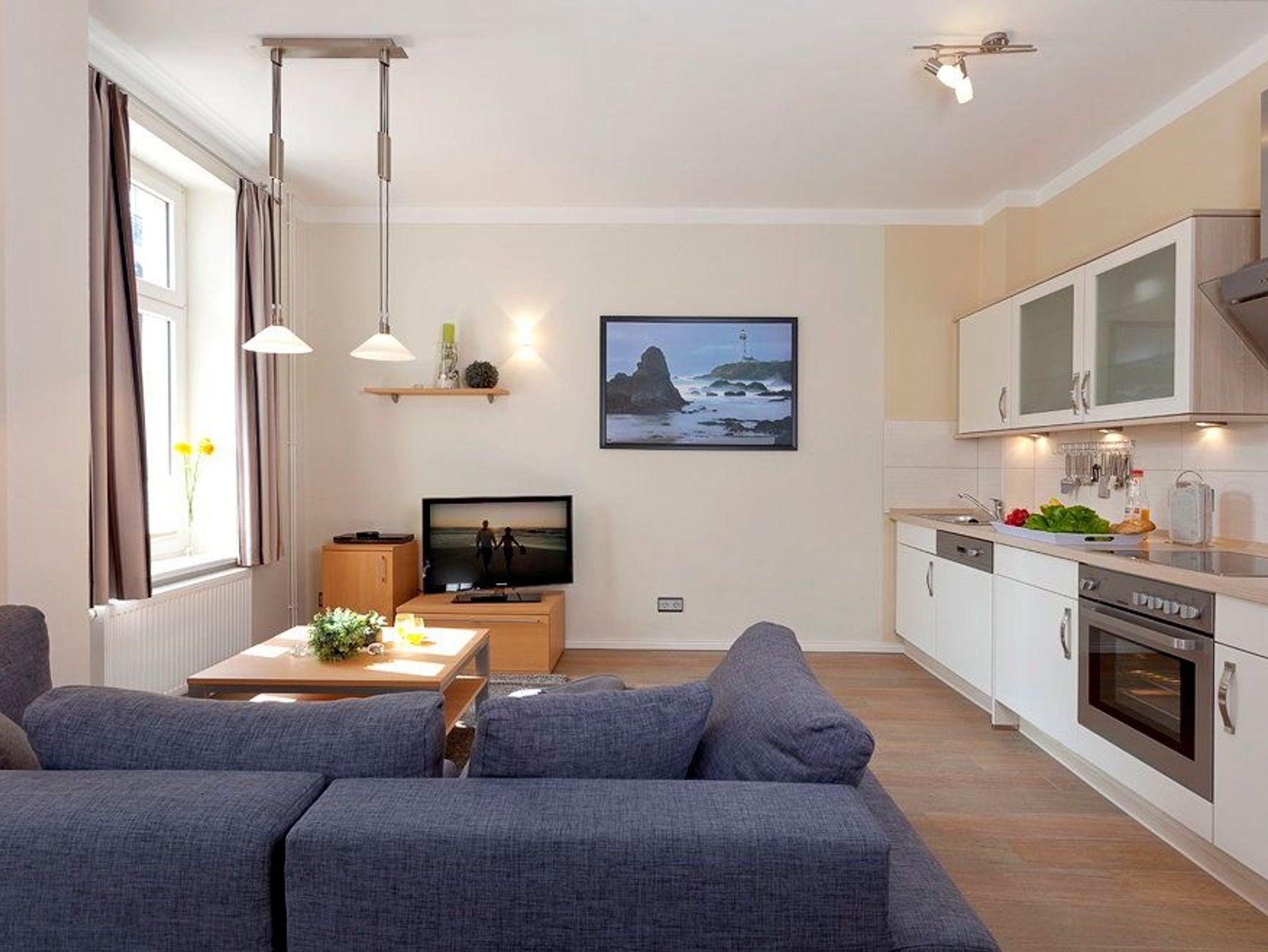 Im großzügigen Wohnbereich erwartet Sie eine bequeme Sofalandschaft sowie Flachbild TV und ein DVD Player die für unterhaltsame Stunden für Sie bereitstehen. Die im Wohnbereich integrierte Küchenzeile mit Essecke für bis zu 4 Personen lässt keine Wünsche offen: Kühlschrank mit Gefrierfach, 4fach Ceran-Kochfeld, Backofen, Mikrowelle, Geschirrspülmaschine, Kaffeemaschine, Toaster und Wasserkocher, u.v.m. Ein gemütliches Doppelbett (160 x 200cm / zwei getrennte Matratzen) im Schlafzimmer sorgt für einen erholsamen Schlaf, damit Sie ausgeruht in den neuen Urlaubstag starten können.