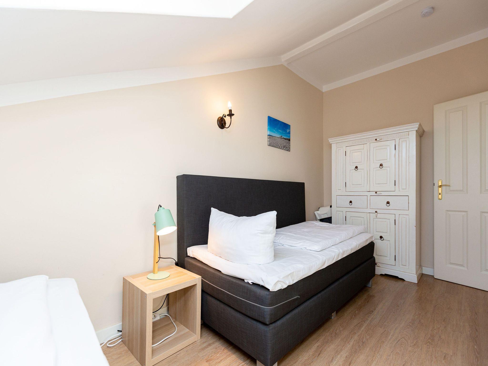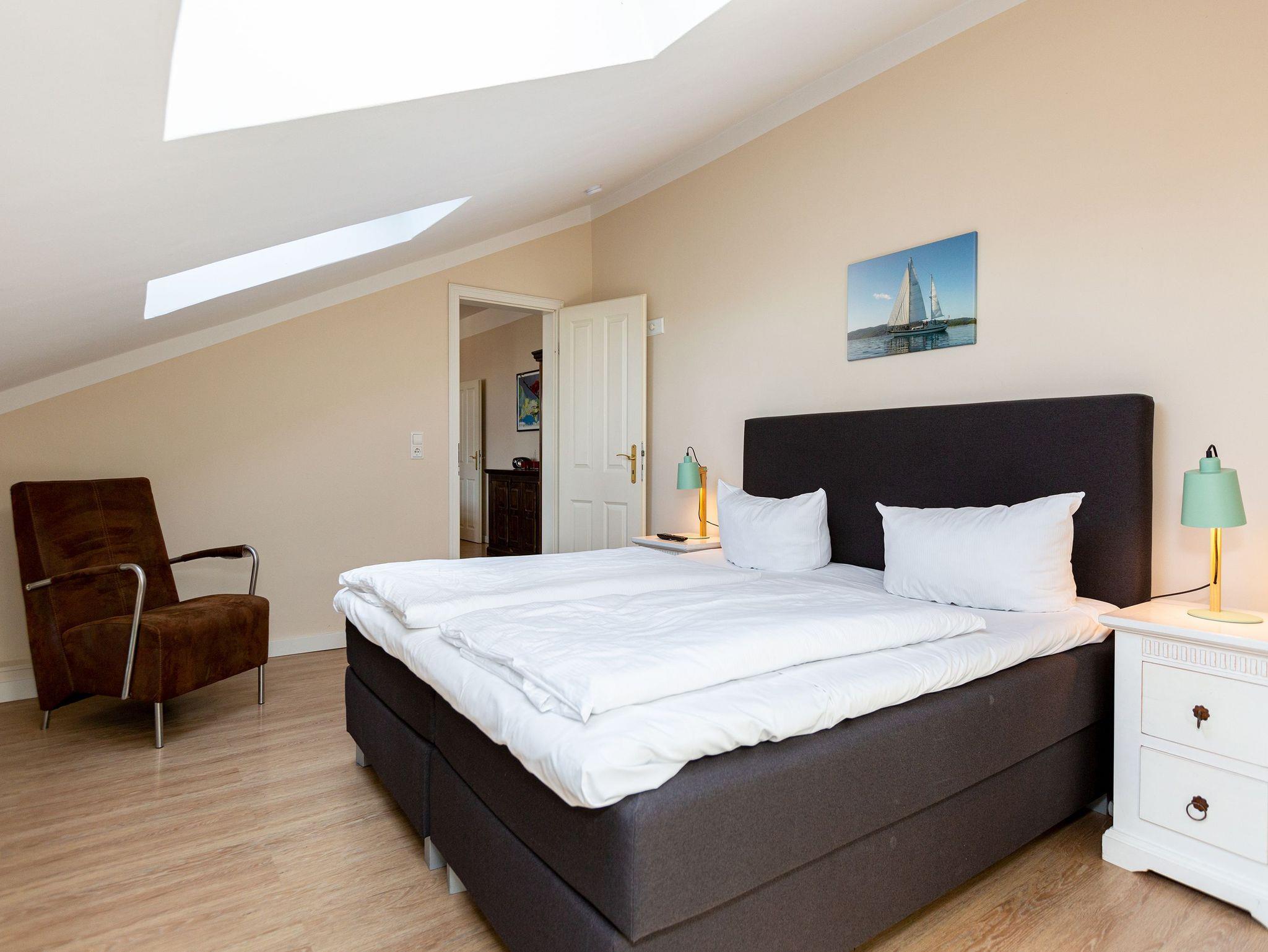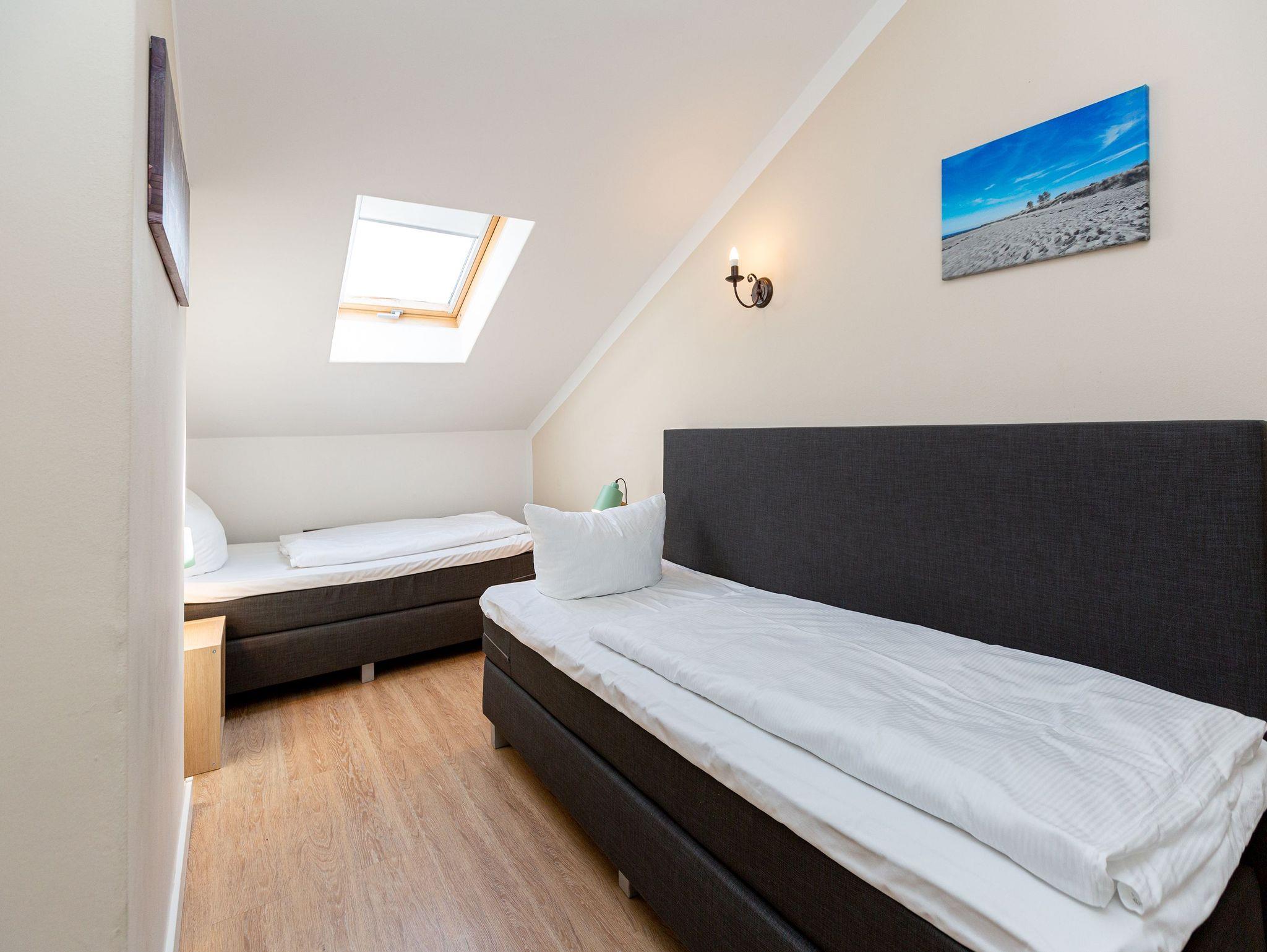 Diese gemütliche 3-Raum-Ferienwohnung im Dachgeschoss bietet auf 70?m² Platz für bis zu 4 Personen sowie ein Kleinkind bis 3 Jahre. Der helle Wohnbereich mit bequemer Sitzgruppe und TV lädt zum Entspannen ein. Direkt angrenzend befindet sich der Wintergarten, von dem aus Sie den Meerblick genießen können. Die Küchenzeile mit Essplatz ist komplett ausgestattet und perfekt für gemeinsame Mahlzeiten. Zwei Schlafzimmer ? eines mit Doppelbett und eines mit zwei Einzelbetten ? sorgen für erholsame Nächte. Das Badezimmer verfügt über Dusche und WC. Für unsere kleinen Gäste stehen auf Wunsch ein Kinderreisebett (ohne Matratze und Bettzeug) sowie ein Hochstuhl gegen Aufpreis bereit. WLAN ist im Haus kostenfrei verfügbar. Ein PKW-Stellplatz befindet sich direkt am Haus. Bei Anreise sind die Betten bereits bezogen und eine Erstausstattung an Handtüchern liegt für Sie bereit ? so beginnt der Urlaub ganz entspannt.