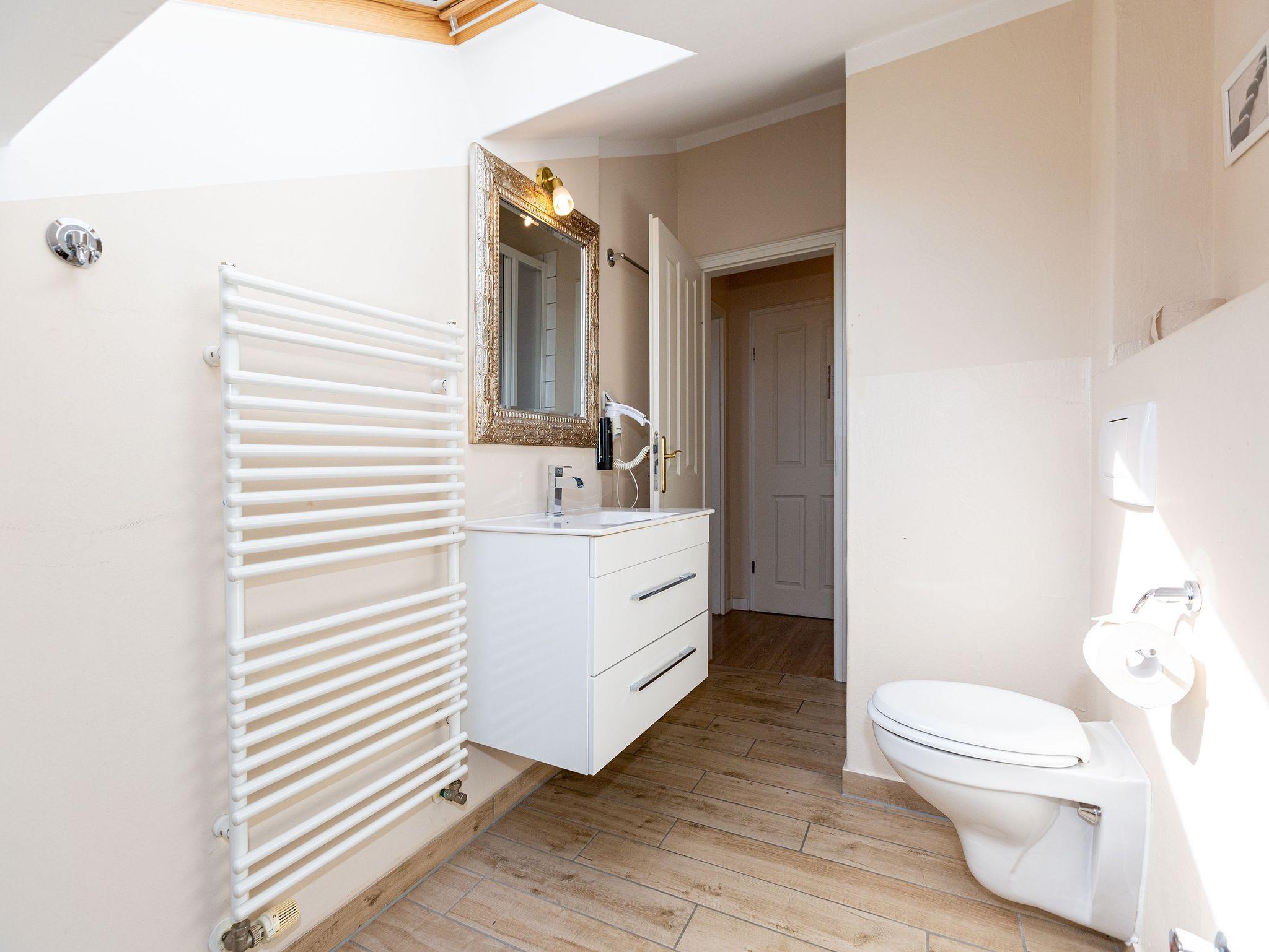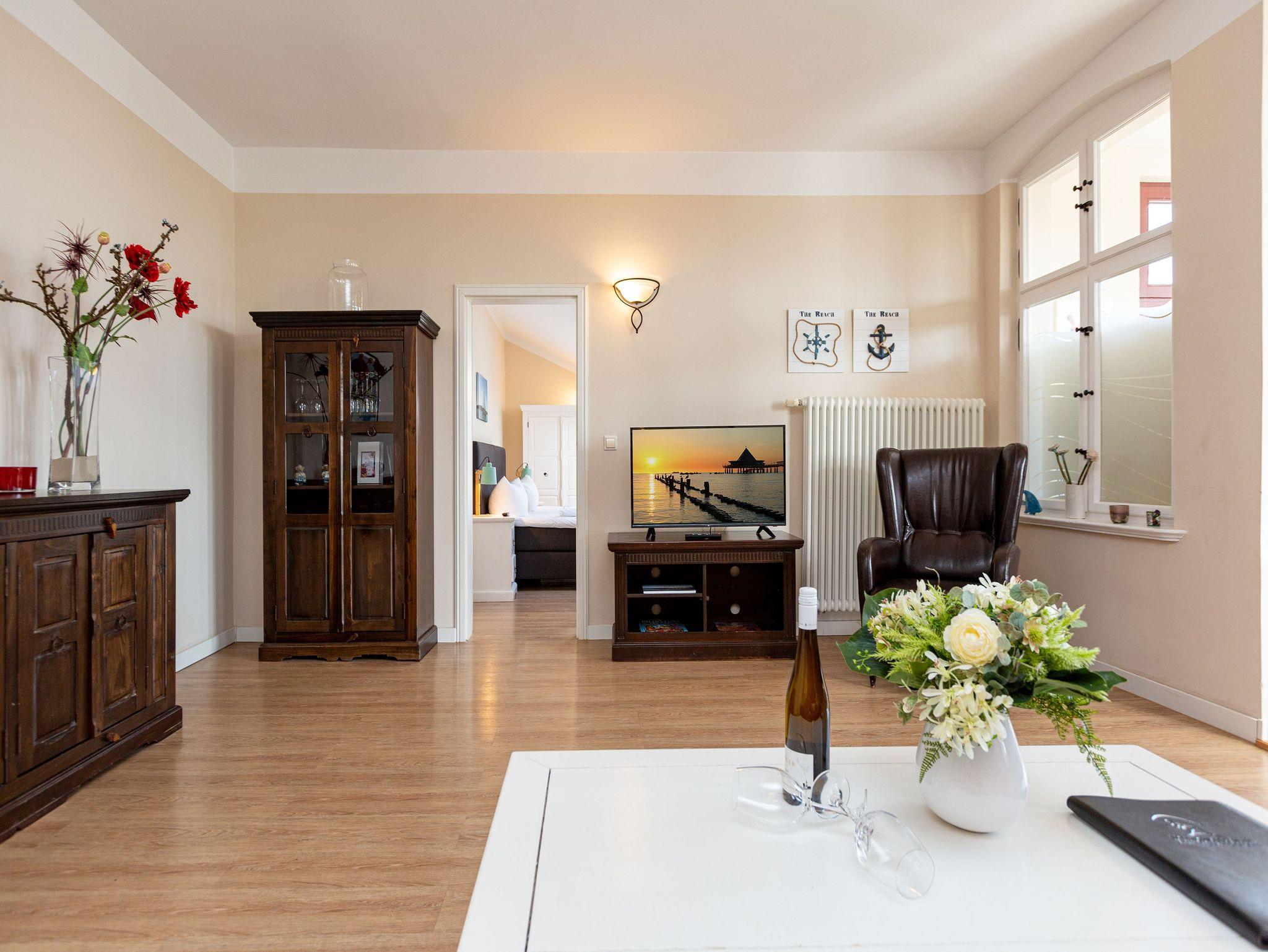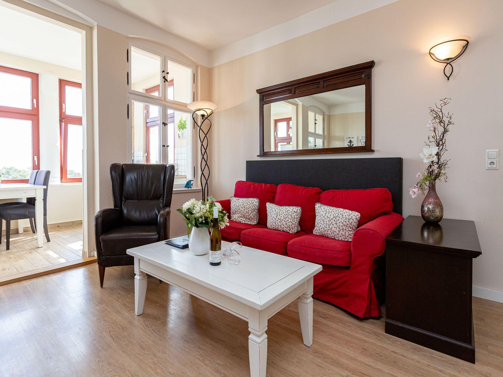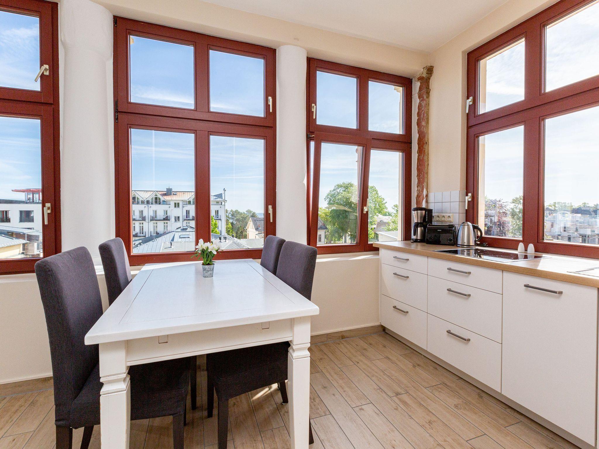Diese gemütliche 3-Raum-Ferienwohnung im Dachgeschoss bietet auf 70?m² Platz für bis zu 4 Personen sowie ein Kleinkind bis 3 Jahre. Der helle Wohnbereich mit bequemer Sitzgruppe und TV lädt zum Entspannen ein. Direkt angrenzend befindet sich der Wintergarten, von dem aus Sie den Meerblick genießen können. Die Küchenzeile mit Essplatz ist komplett ausgestattet und perfekt für gemeinsame Mahlzeiten. Zwei Schlafzimmer ? eines mit Doppelbett und eines mit zwei Einzelbetten ? sorgen für erholsame Nächte. Das Badezimmer verfügt über Dusche und WC. Für unsere kleinen Gäste stehen auf Wunsch ein Kinderreisebett (ohne Matratze und Bettzeug) sowie ein Hochstuhl gegen Aufpreis bereit. WLAN ist im Haus kostenfrei verfügbar. Ein PKW-Stellplatz befindet sich direkt am Haus. Bei Anreise sind die Betten bereits bezogen und eine Erstausstattung an Handtüchern liegt für Sie bereit ? so beginnt der Urlaub ganz entspannt.