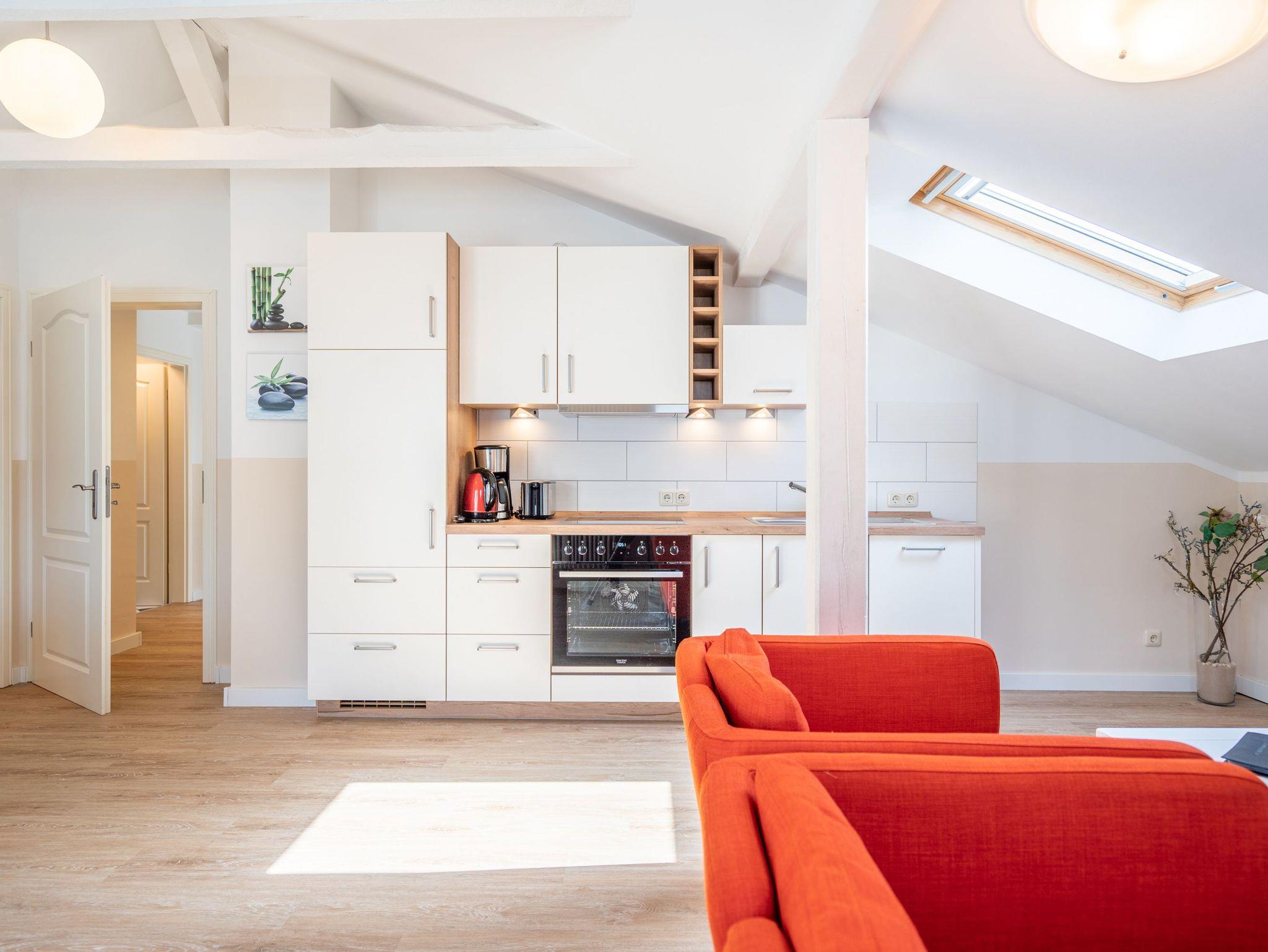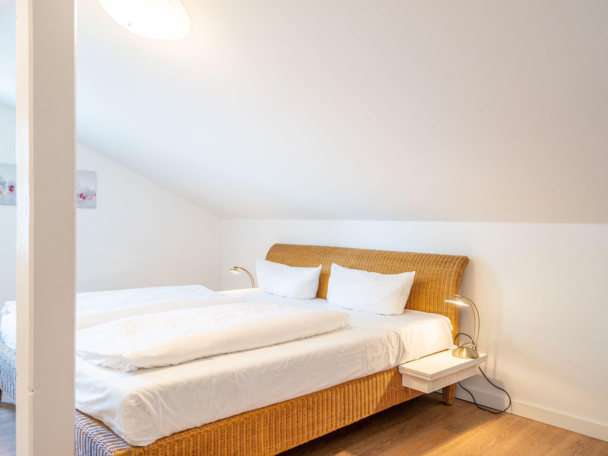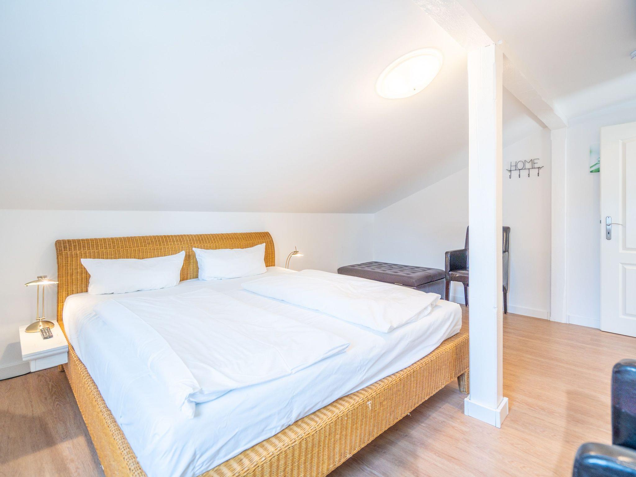 Mit 78 m² bietet diese Dachgeschosswohnung reichlich Platz für einen entspannten Urlaub mit Familie oder Freunden. Zwei Schlafzimmer mit Doppelbetten garantieren erholsame Nächte. Im Wohnbereich mit Sitzgruppe, TV, Küchenzeile und Essplatz lässt es sich gemütlich verweilen. Der 6 m² große Westbalkon lädt dazu ein, den Abend bei Sonnenuntergang ausklingen zu lassen. Bad mit Dusche und WC sowie ein Pkw-Stellplatz am Haus runden das Angebot ab.