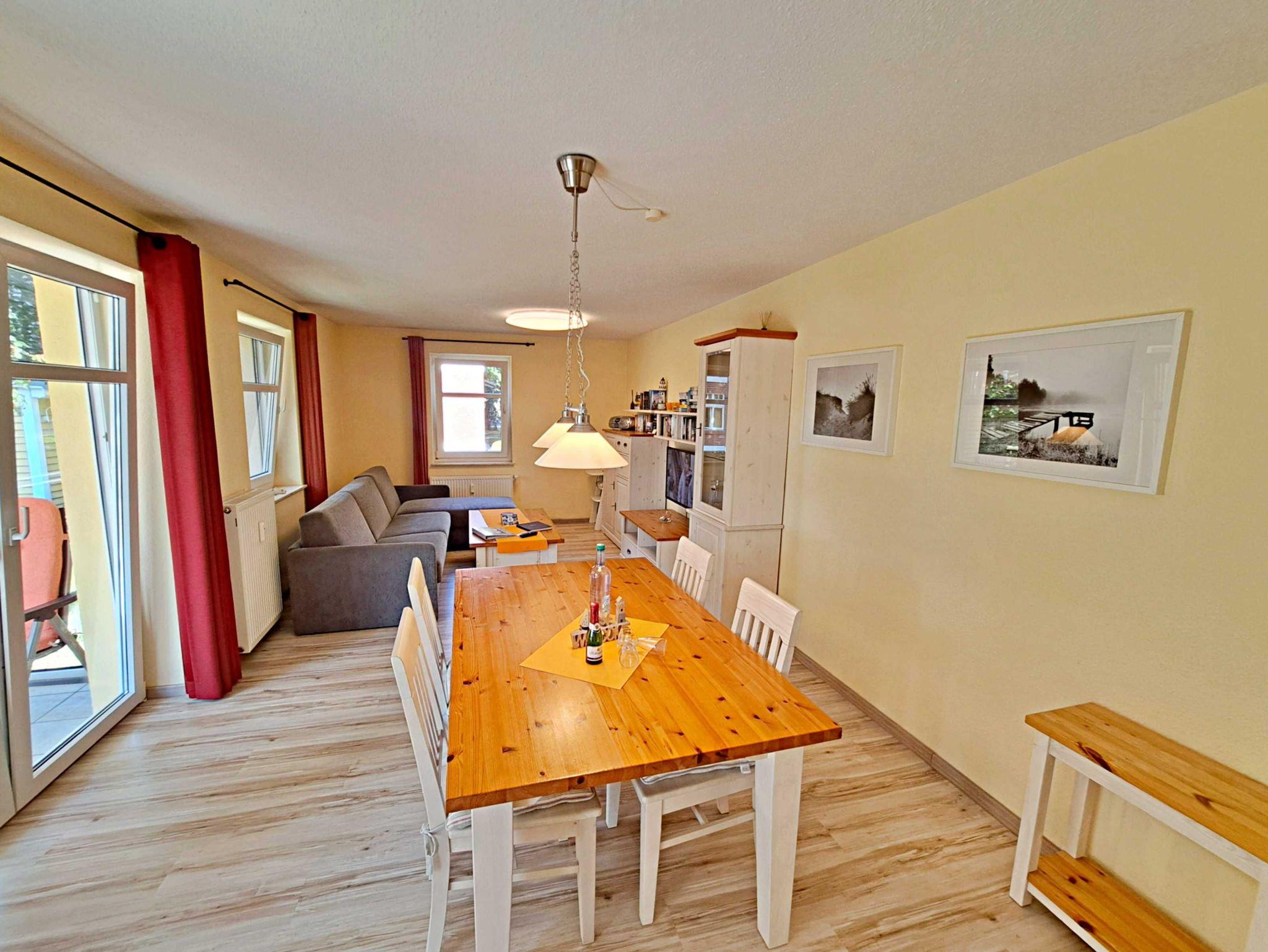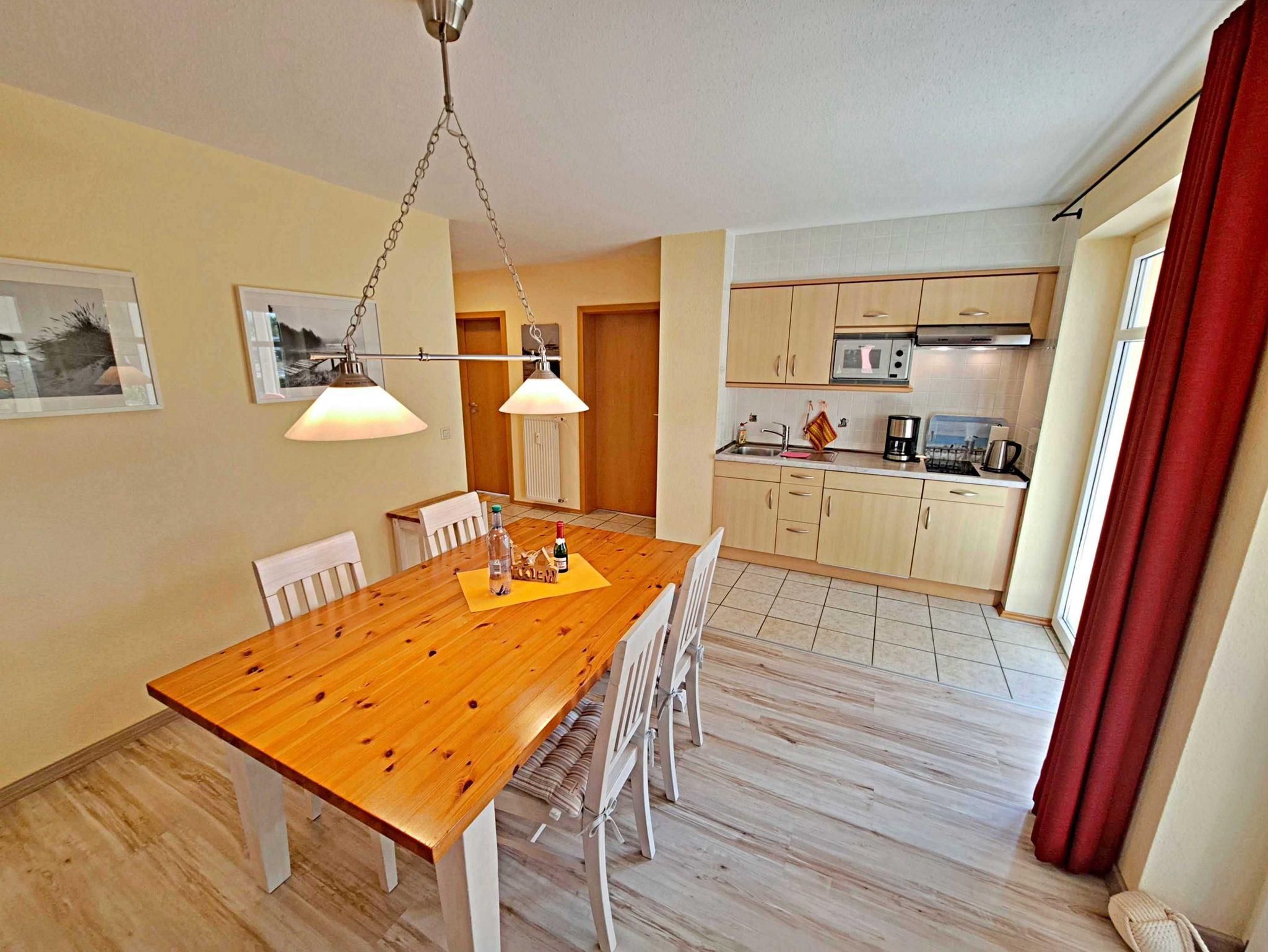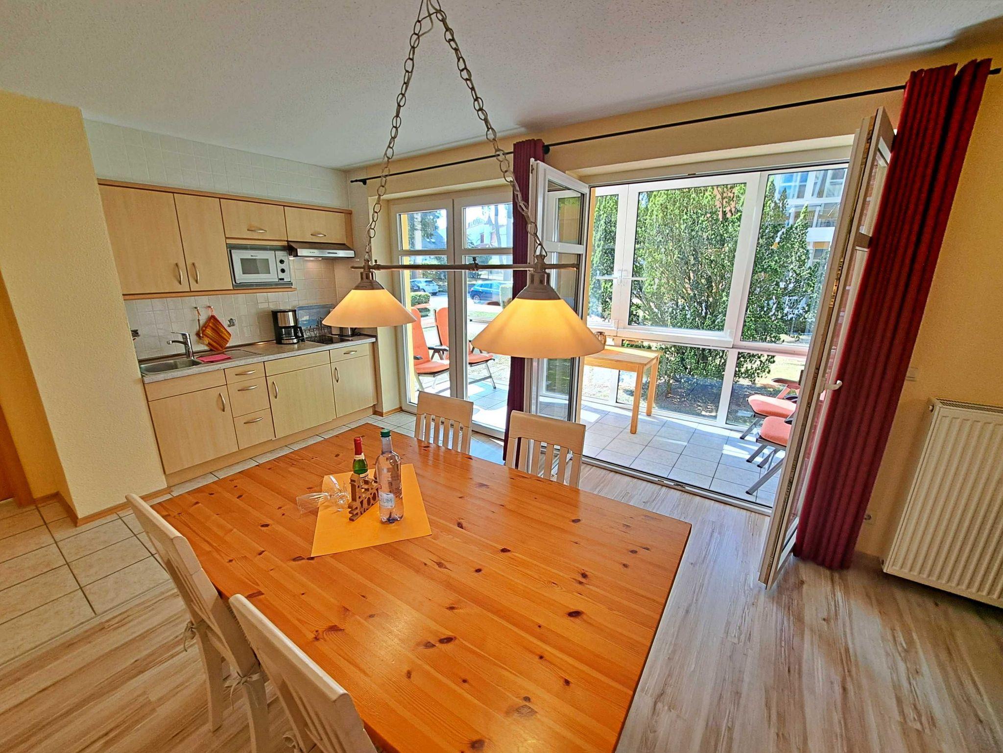 Diese freundliche und einladende Unterkunft im Erdgeschoss im Haus Karavelle bietet Platz für 2-4 Personen und ist ideal für Ihren nächsten Urlaub. Dank der südlichen Ausrichtung genießen Sie im angrenzenden Wintergarten ganztägig die warmen Sonnenstrahlen. In den Sommermonaten sorgen die hohen Laubbäume für angenehmen Schatten und eine erfrischende Kühle. Von der Diele aus gelangen Sie in den großzügigen Wohnbereich, der mit einer modernen Küchenzeile und einem Esstisch für vier Personen ausgestattet ist. Die Küche bietet alles, was Sie benötigen, darunter ein 2-Platten-Herd, Kühlschrank, Mikrowelle, Spüle und Geschirr. Im hellen Wohnzimmer finden Sie eine gemütliche Eckcouch, Flat-TV und CD-Player, die zum Entspannen einladen. Ein separates Schlafzimmer mit einem komfortablen Doppelbett und ein Tageslicht-Bad mit Dusche/WC runden das Angebot ab. Für die kleinen Gäste werden gerne ein Kinderreisebett und einen Hochstuhl kostenfrei zur Verfügung gestellt. Ein Pkw-Stellplatz auf dem umzäunten Grundstück steht Ihnen ebenfalls zur Verfügung. Zudem können Sie gegen Entgelt eine Waschmaschine und einen Wäschetrockner im Objekt nutzen. Die Erstausstattung Bettwäsche und Handtücher kann bei der Buchung der Ferienwohnung für nur 17,50 € pro Person hinzugebucht werden. WLAN-Zugang ist für ein Gerät kostenfrei, für jedes weitere Gerät werden 10 € pro Woche berechnet.