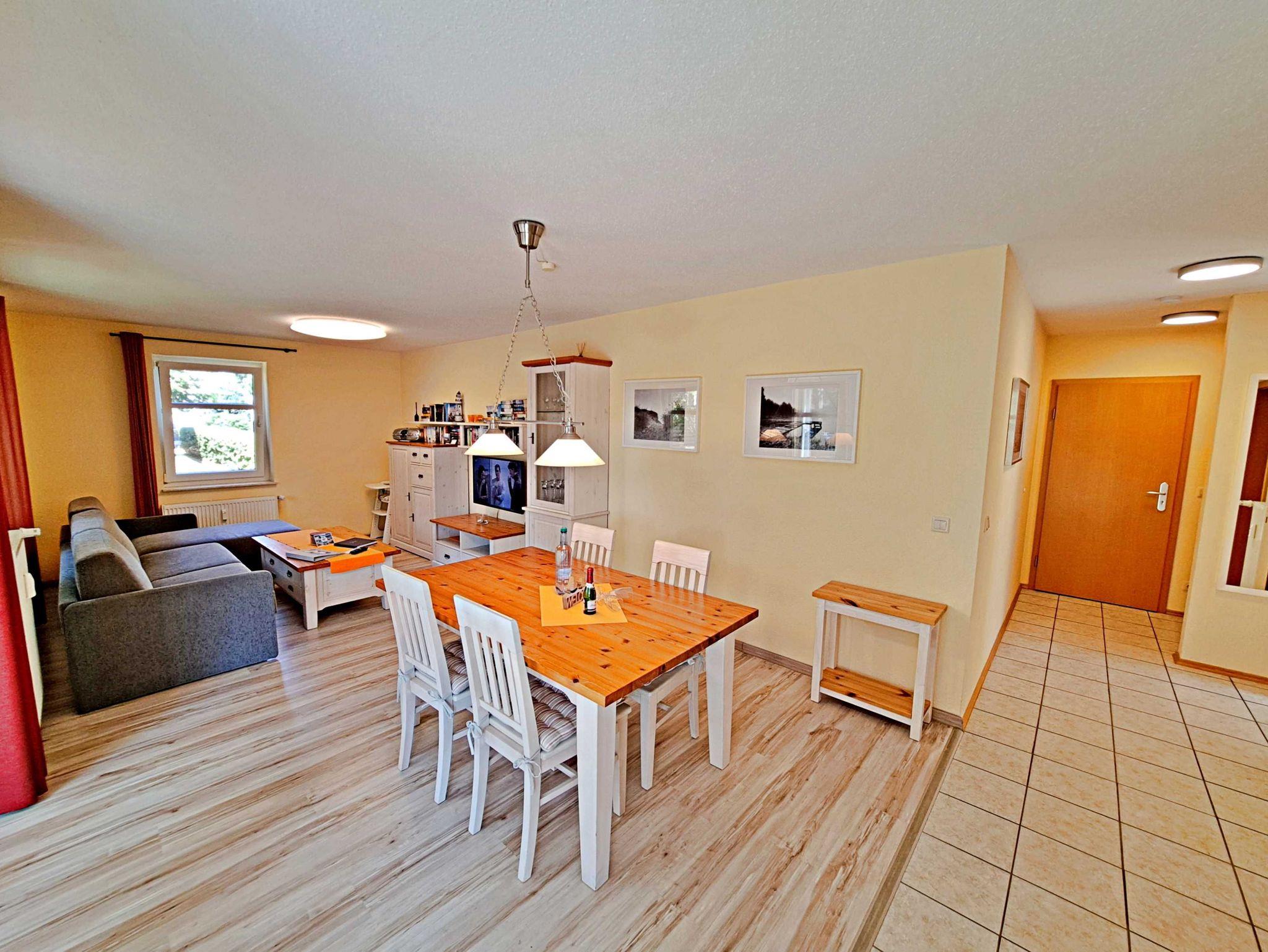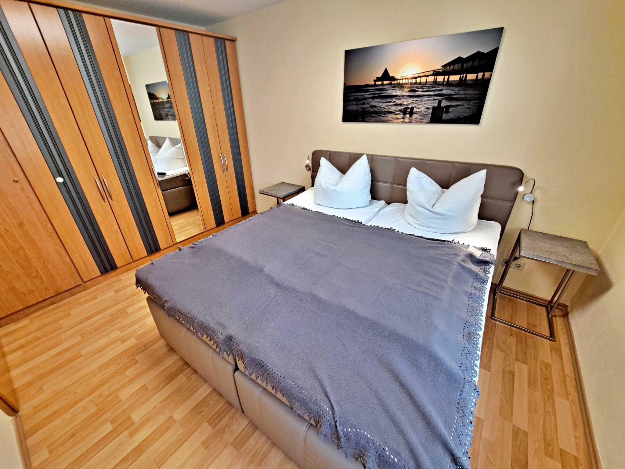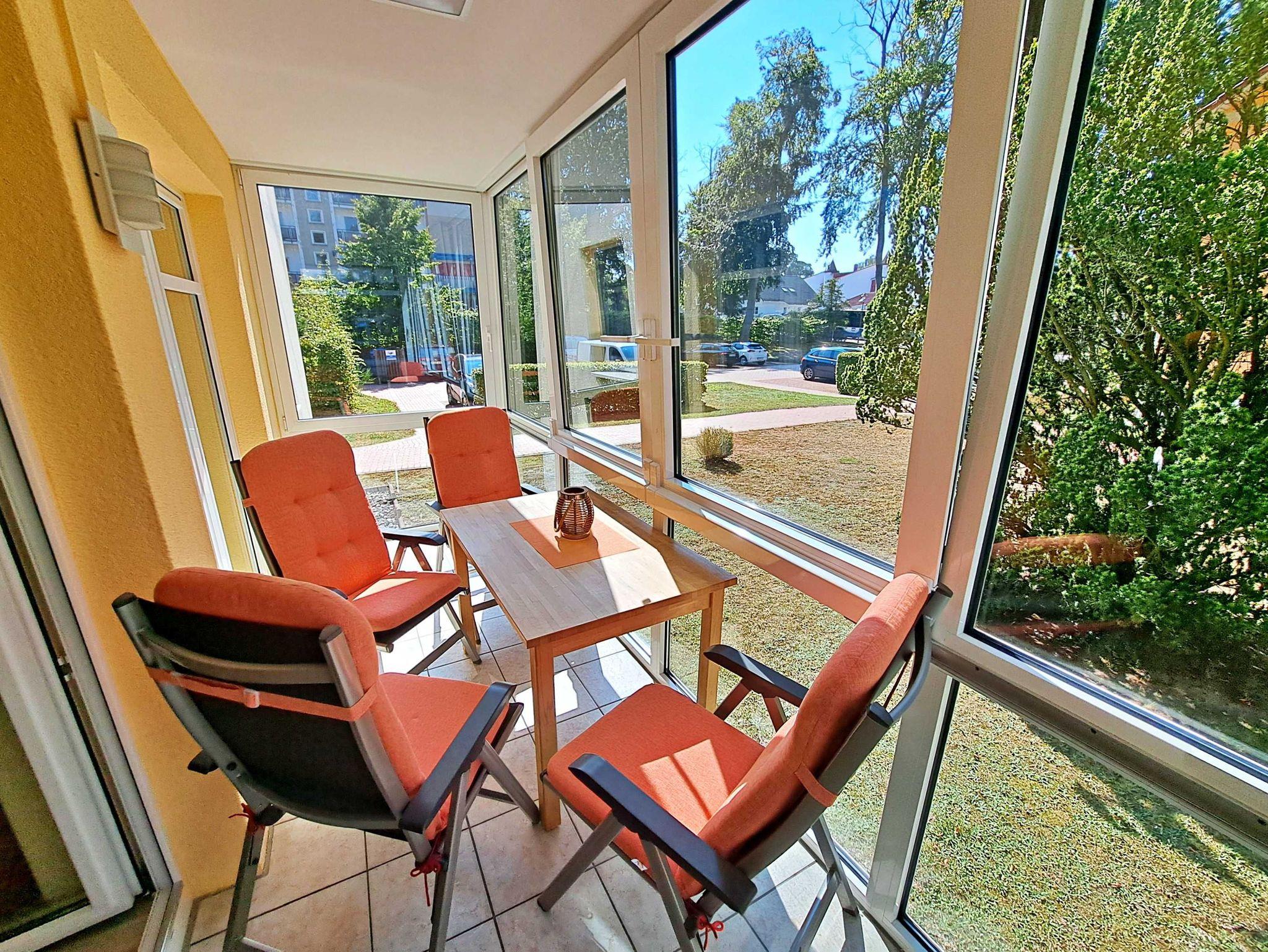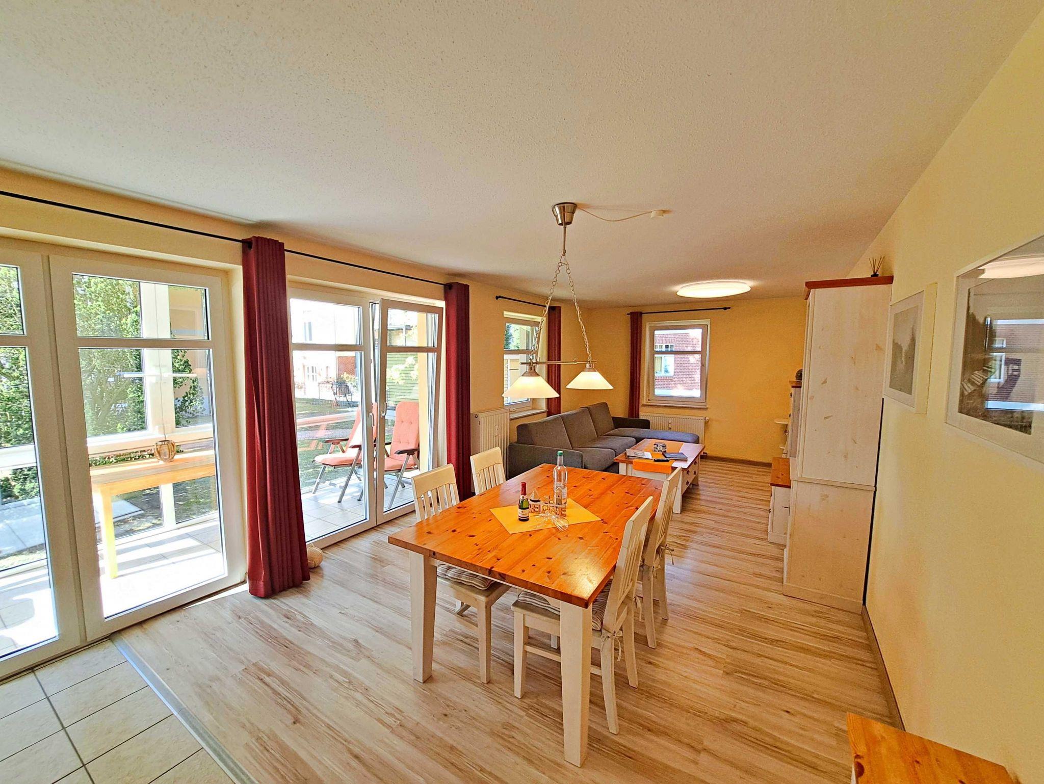 Diese freundliche und einladende Unterkunft im Erdgeschoss im Haus Karavelle bietet Platz für 2-4 Personen und ist ideal für Ihren nächsten Urlaub. Dank der südlichen Ausrichtung genießen Sie im angrenzenden Wintergarten ganztägig die warmen Sonnenstrahlen. In den Sommermonaten sorgen die hohen Laubbäume für angenehmen Schatten und eine erfrischende Kühle. Von der Diele aus gelangen Sie in den großzügigen Wohnbereich, der mit einer modernen Küchenzeile und einem Esstisch für vier Personen ausgestattet ist. Die Küche bietet alles, was Sie benötigen, darunter ein 2-Platten-Herd, Kühlschrank, Mikrowelle, Spüle und Geschirr. Im hellen Wohnzimmer finden Sie eine gemütliche Eckcouch, Flat-TV und CD-Player, die zum Entspannen einladen. Ein separates Schlafzimmer mit einem komfortablen Doppelbett und ein Tageslicht-Bad mit Dusche/WC runden das Angebot ab. Für die kleinen Gäste werden gerne ein Kinderreisebett und einen Hochstuhl kostenfrei zur Verfügung gestellt. Ein Pkw-Stellplatz auf dem umzäunten Grundstück steht Ihnen ebenfalls zur Verfügung. Zudem können Sie gegen Entgelt eine Waschmaschine und einen Wäschetrockner im Objekt nutzen. Die Erstausstattung Bettwäsche und Handtücher kann bei der Buchung der Ferienwohnung für nur 17,50 € pro Person hinzugebucht werden. WLAN-Zugang ist für ein Gerät kostenfrei, für jedes weitere Gerät werden 10 € pro Woche berechnet.