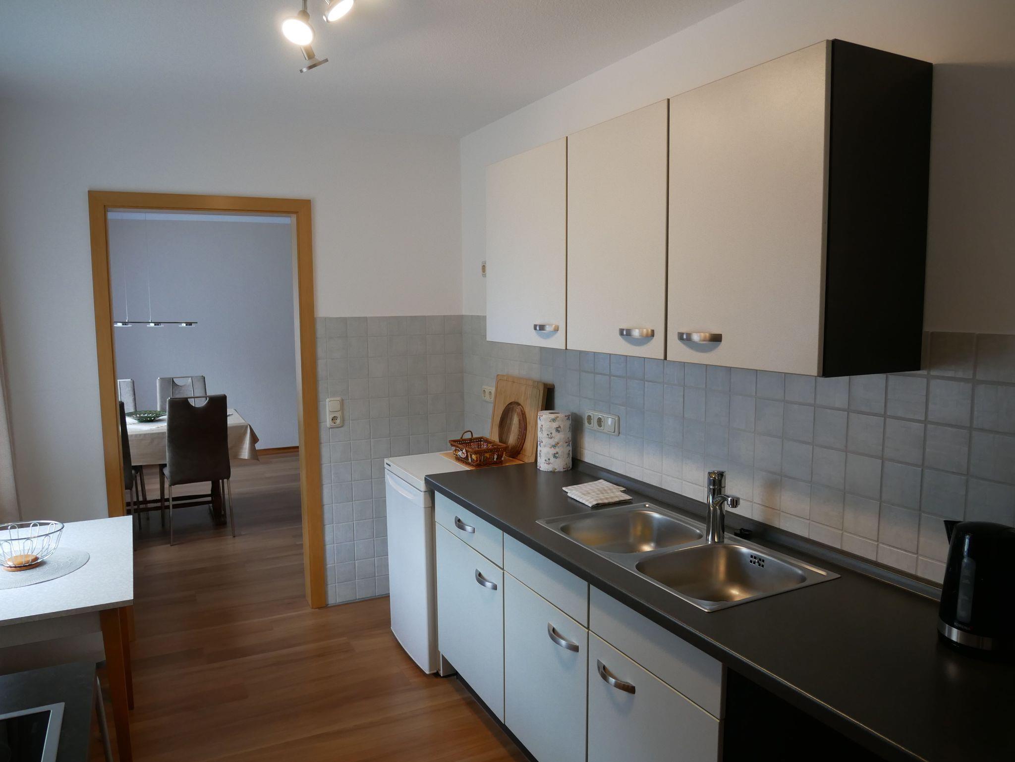 Die modern ausgestattete Küche verfügt über ein Cerankochfeld, Backofen, Dunstabzugshaube sowie einem kleinen Kühlschrank ohne Eisfach.