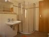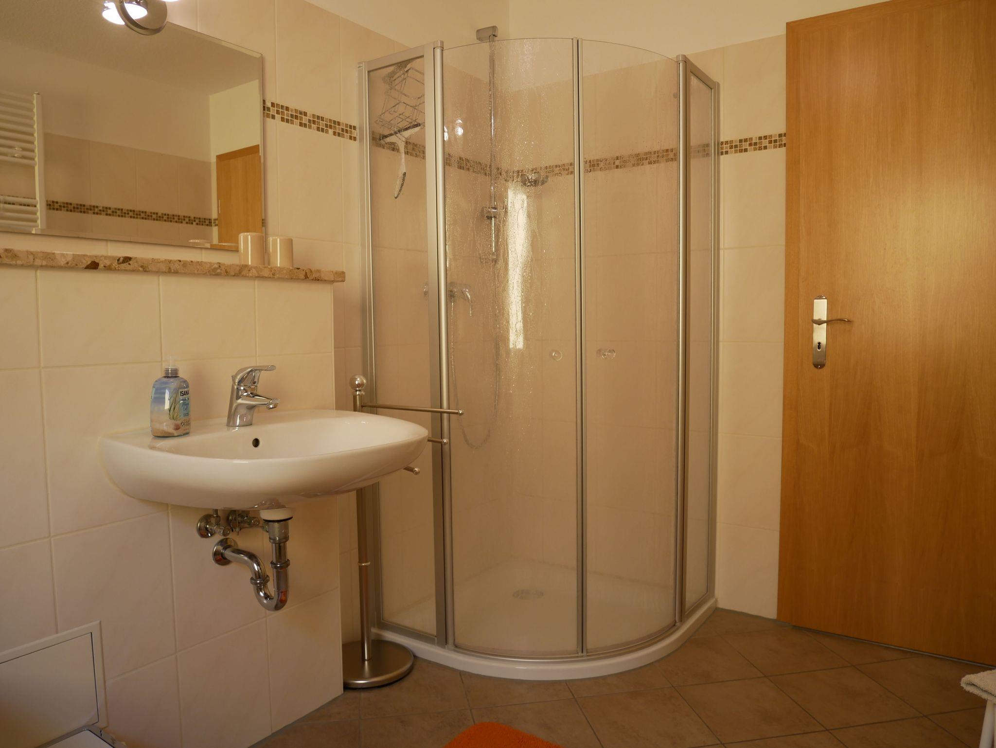Das Tageslicht-Badezimmer ist mit einer Dusche und einem Handtuchwärmer ausgestattet.