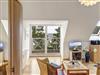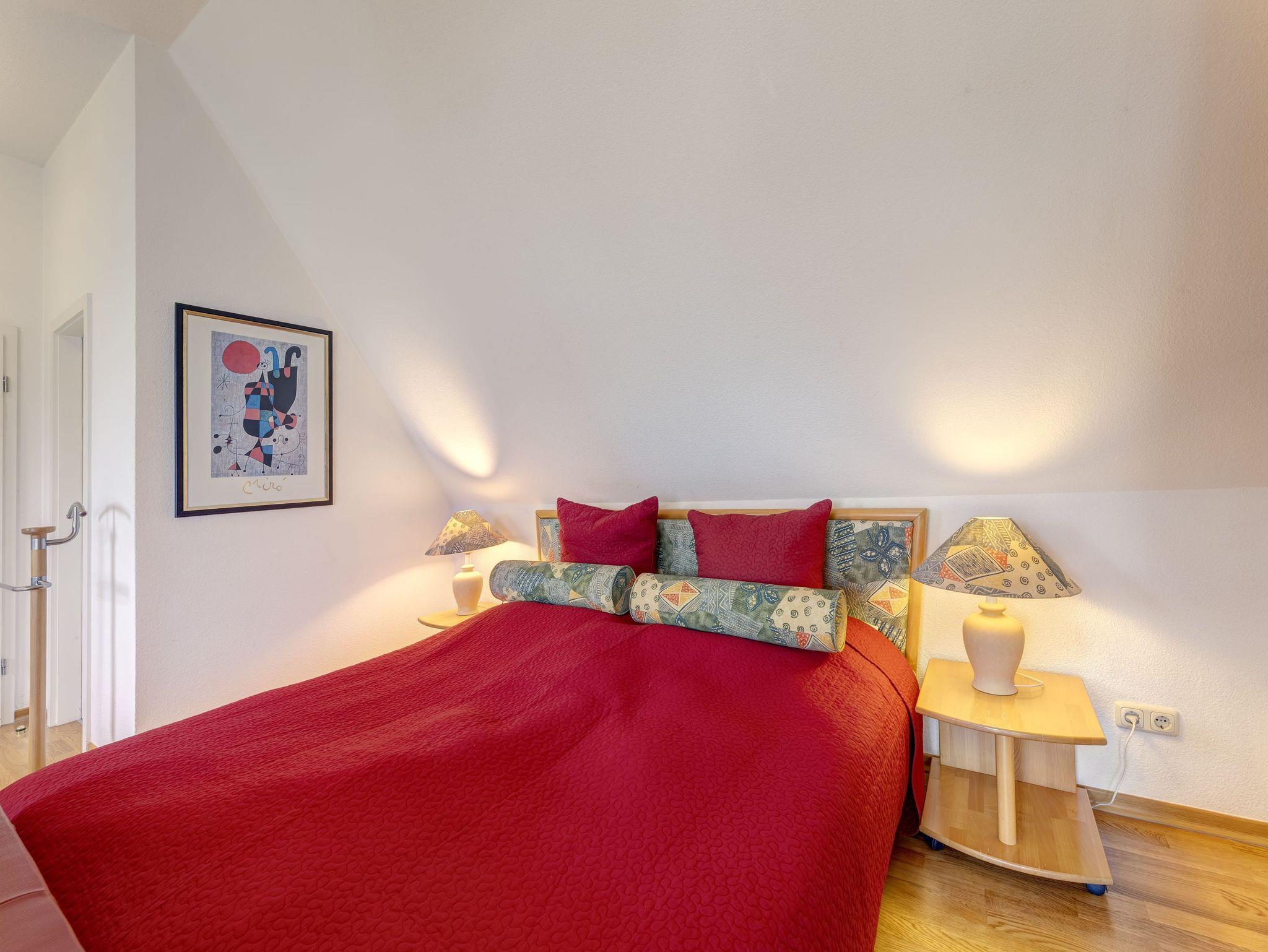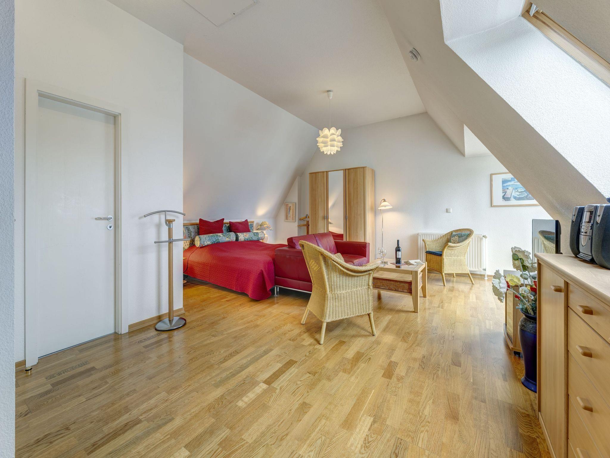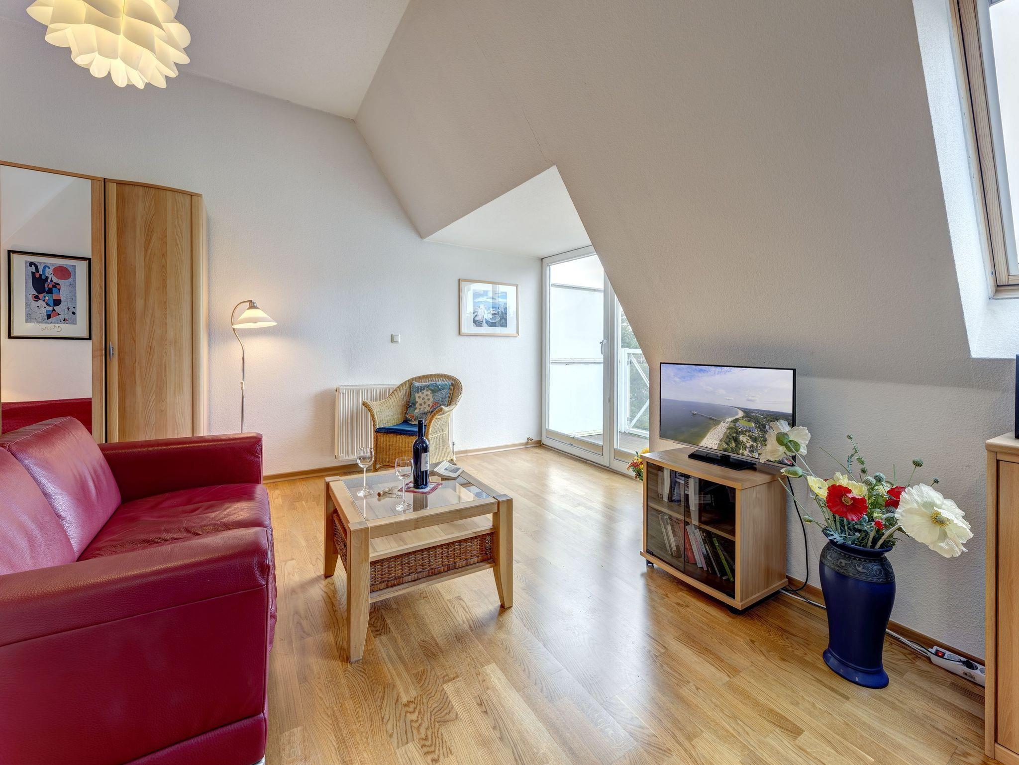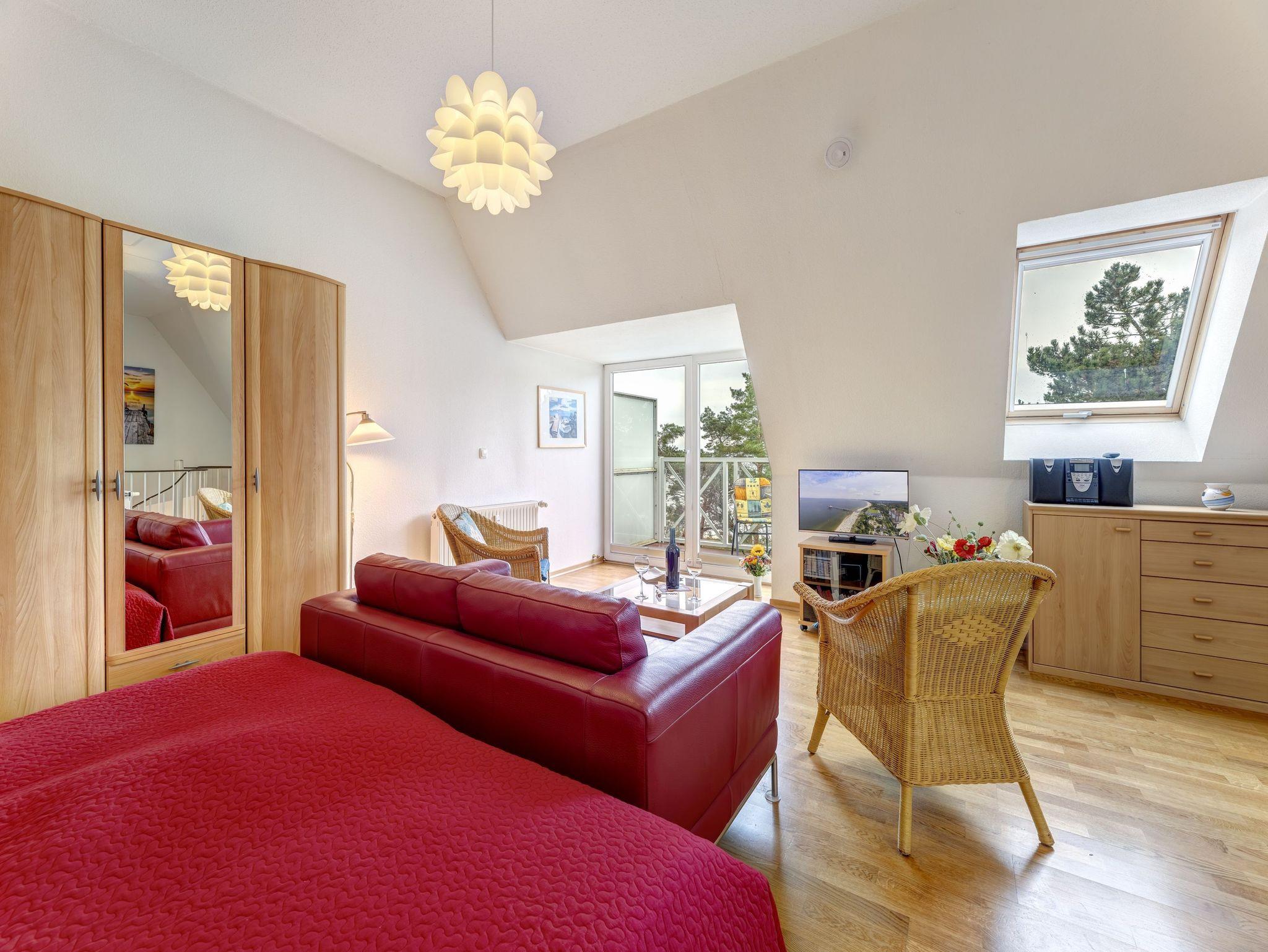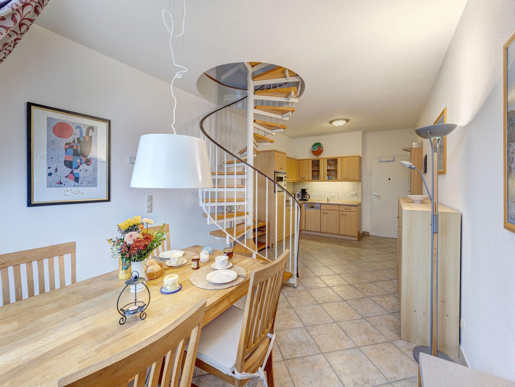 Im unteren Bereich befindet sich der Küchen- und Wohnbereich mit Blick aufs Meer. Den mit Eichen-Echtholzparkett ausgestatteten oberen Bereich der Maisonette-Wohnung erreichen Sie über eine stabile Wendeltreppe. Dort finden sich neben einem geräumigen Duschbad eine gemütliche Sitzecke mit Flat-TV sowie ein Doppelbett. Auch hier können Sie das Frühstück mit Meerblick genießen: setzen Sie sich dazu auf Ihren Sonnen-Balkon. Neben dem Bad befindet sich außerdem ein Abstellraum.