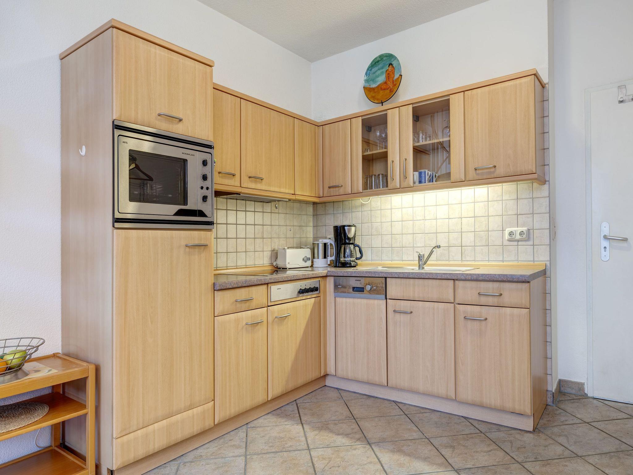 Die Küchenzeile mit großem Esstisch verfügt über einen Elektroherd, Kühl-Gefrierschrank, Geschirrspüler, Mikrowelle, Toaster, Wasserkocher sowie Kaffeemaschine.